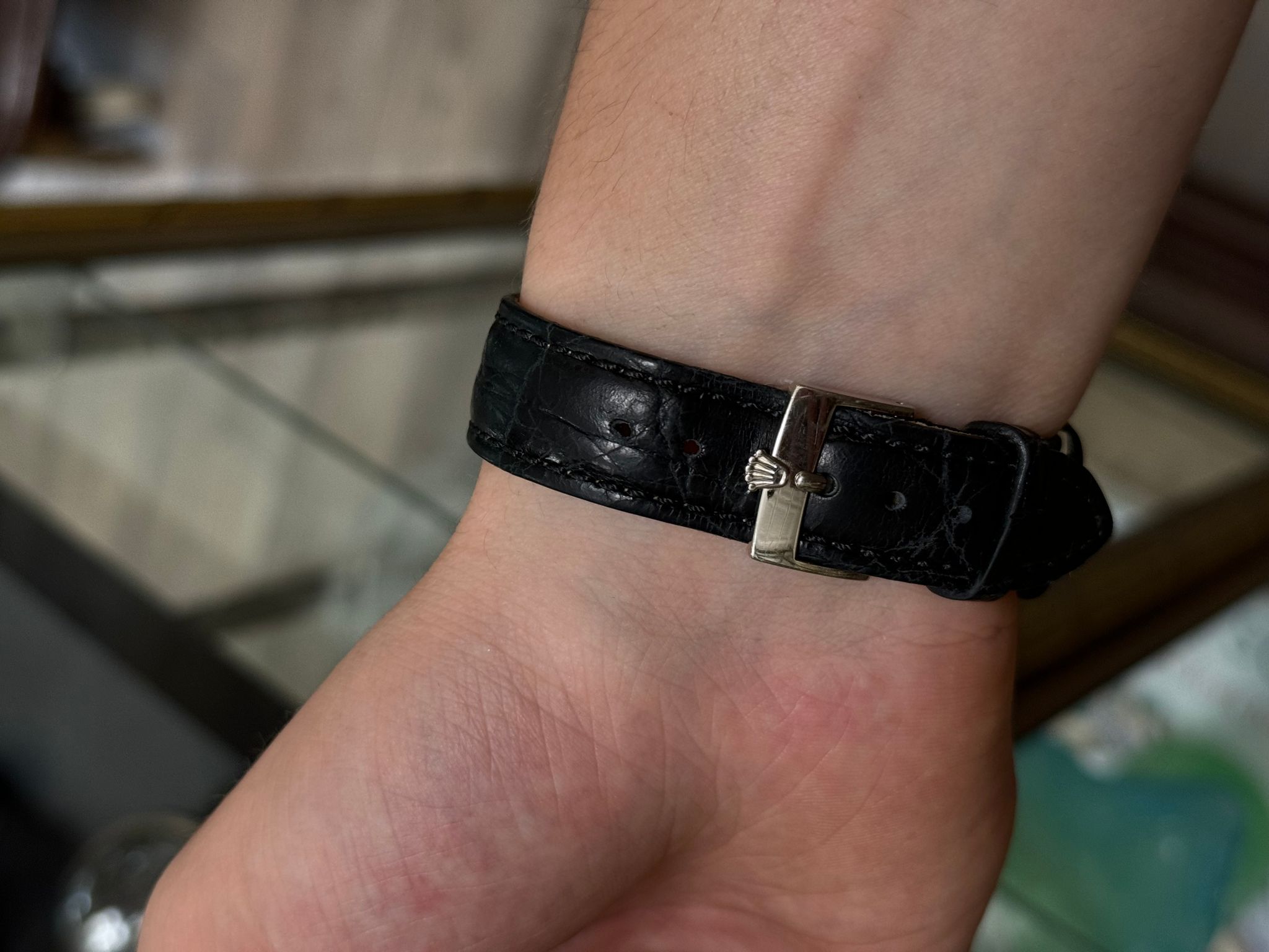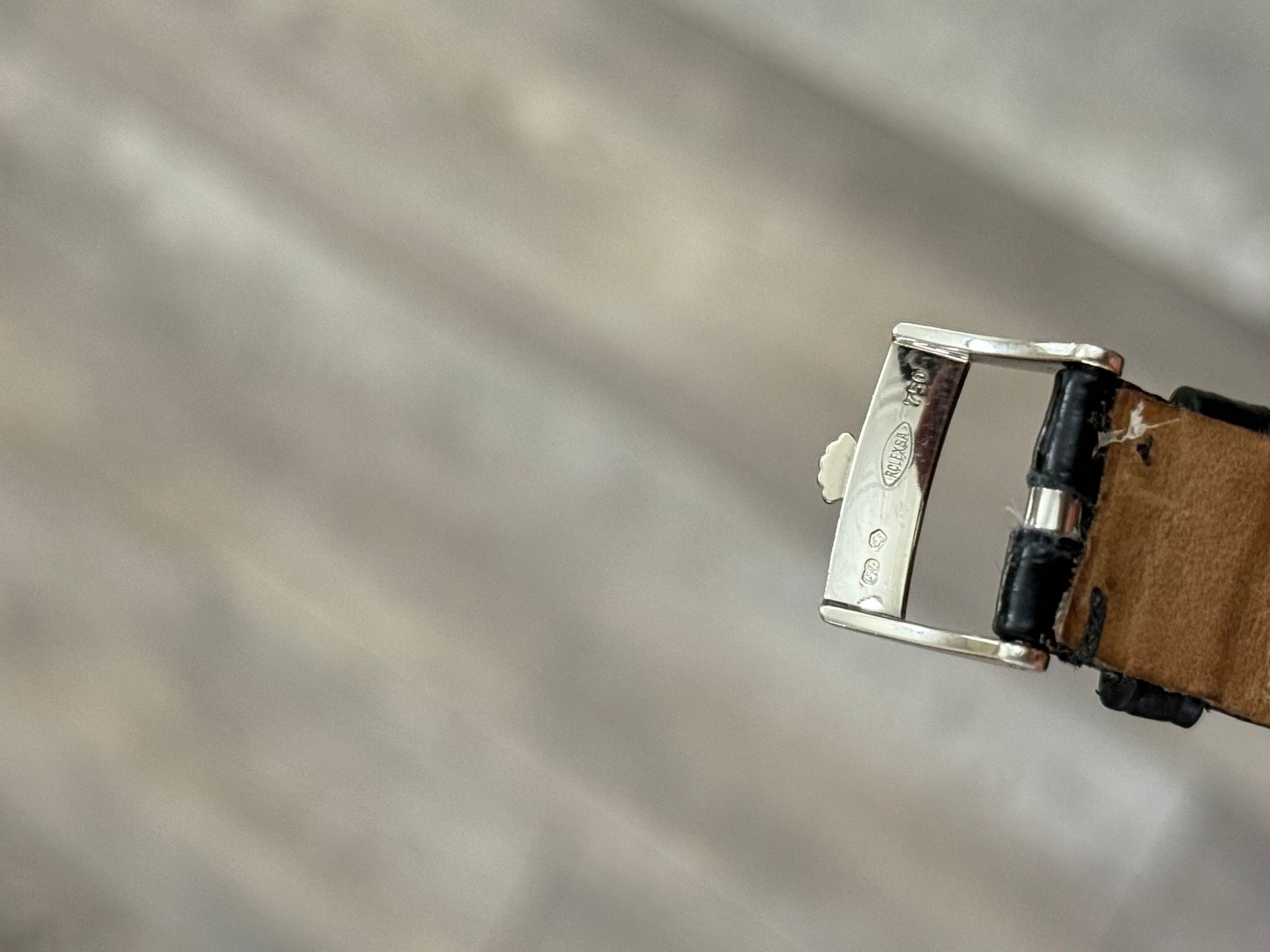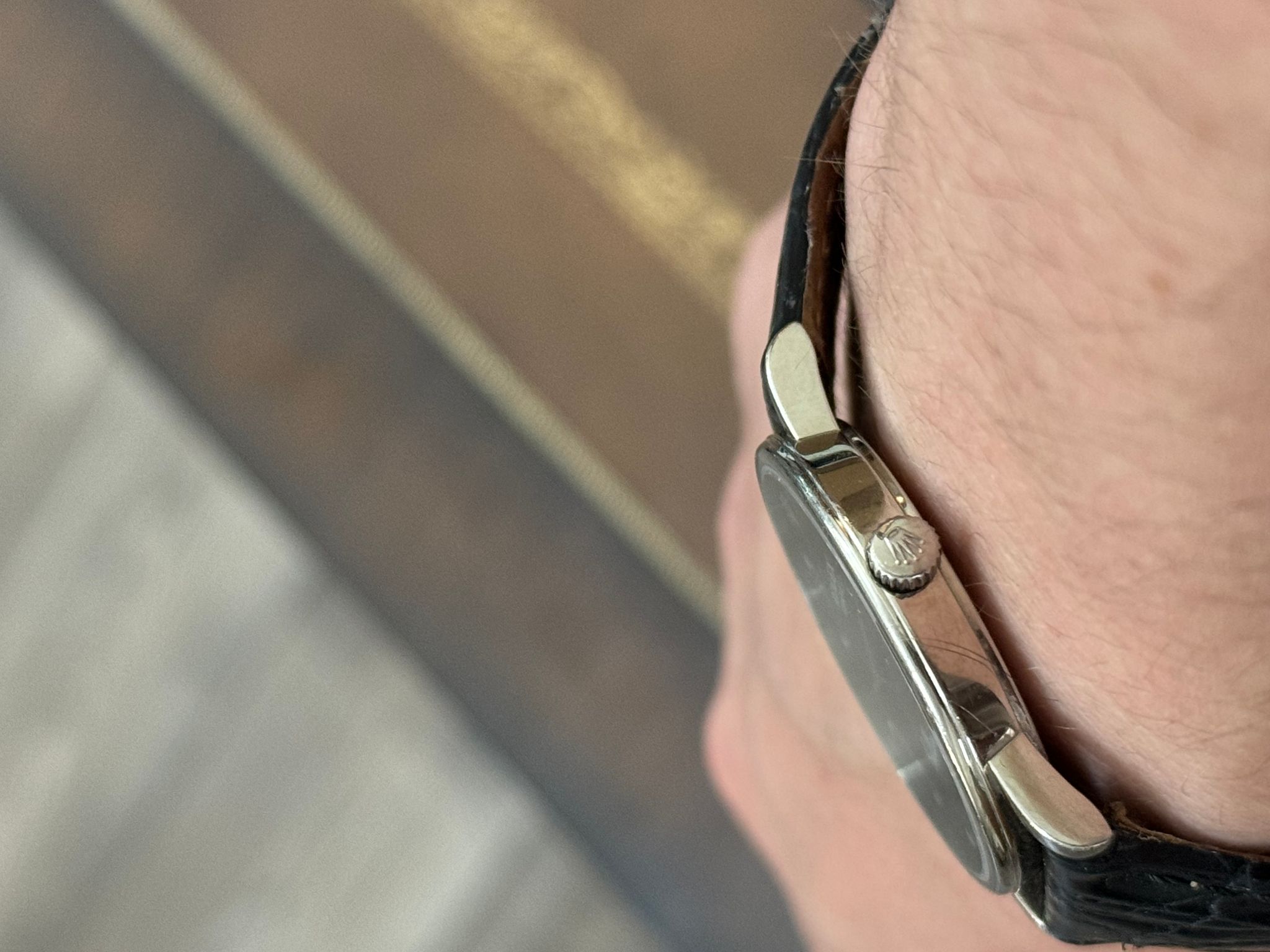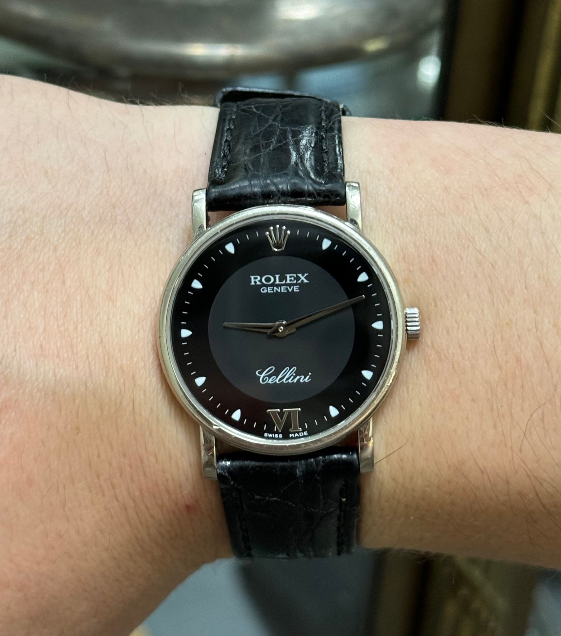 Rolex Cellini 18k Gold 5115. Watch is in great pre-owned condition, D serial dates the watch to 2005/2006, on aftermarket leather strap, original 18k White Gold Rolex buckle. Minor knick on case near 7 o'clock and on bottom left lug.