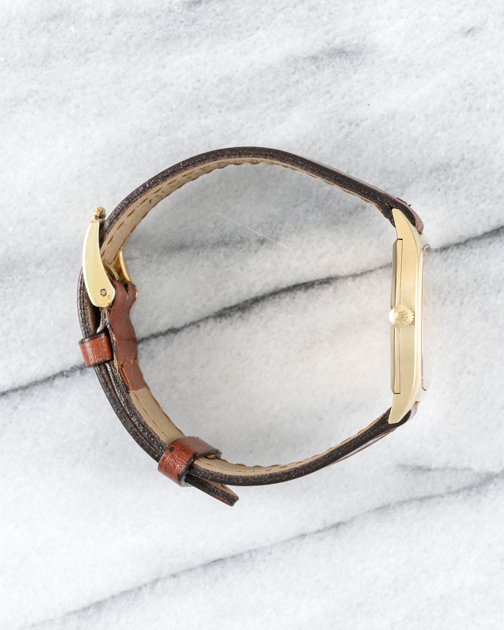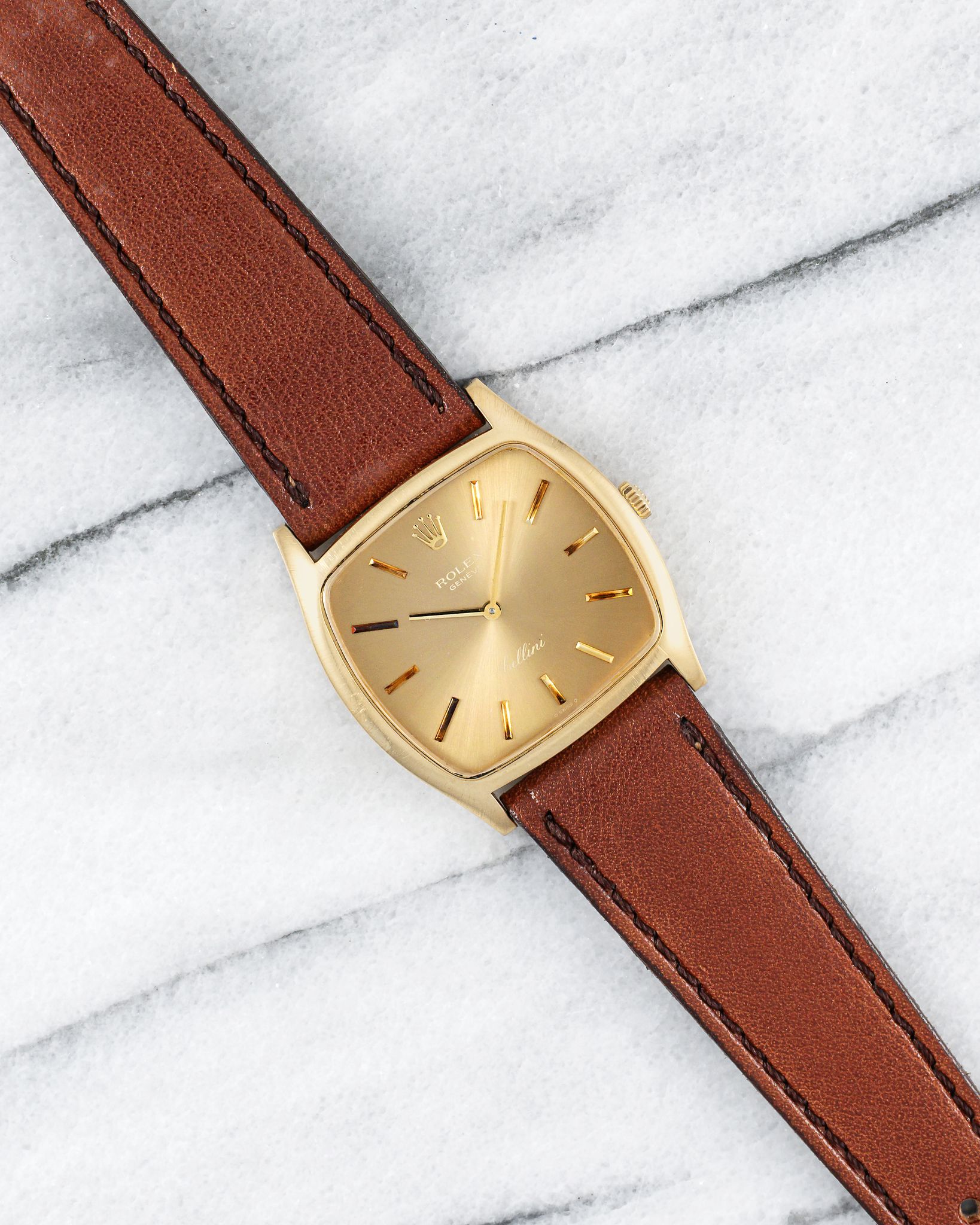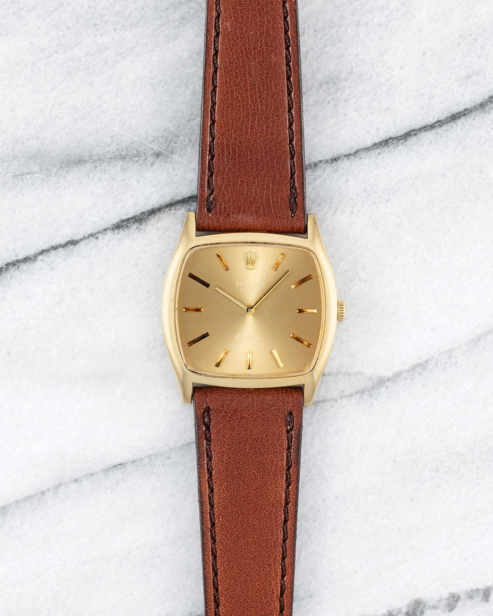 Here's a vintage Rolex Cellini Ref number 3805 in 18K yellow gold with a cappuccino/ mocha dial from the 1980s. Keeps great time and is fully functional. Measurements include a 31mm case size and 20mm lug width. On an aftermarket brown leather strap with its matching signed buckle. Time only. Tonneau case. Sunburst mocha dial. Matching stick hands and hour markers.The watch makes for a great dress watch for both men and women. Snapback caseback. 18K yellow gold and snapback caseback. signed. All parts are original including the dial, movement, and caseback.