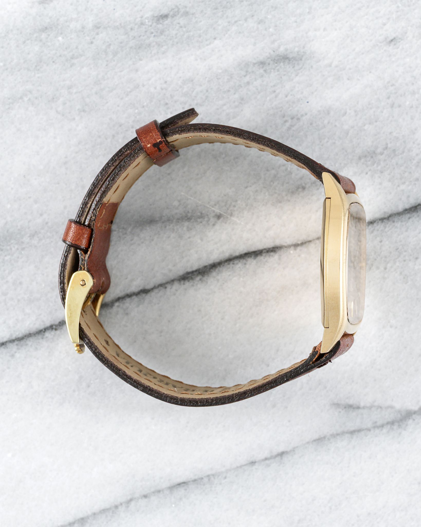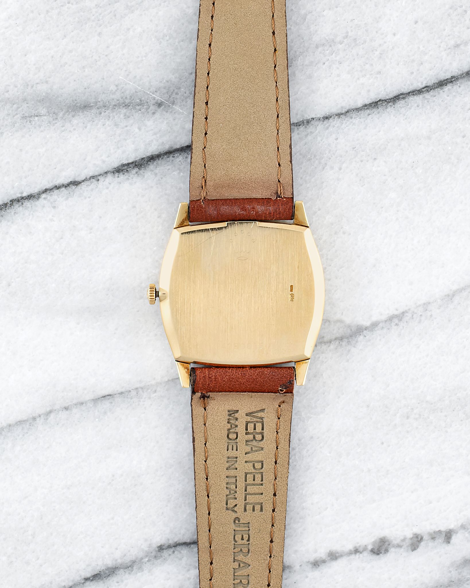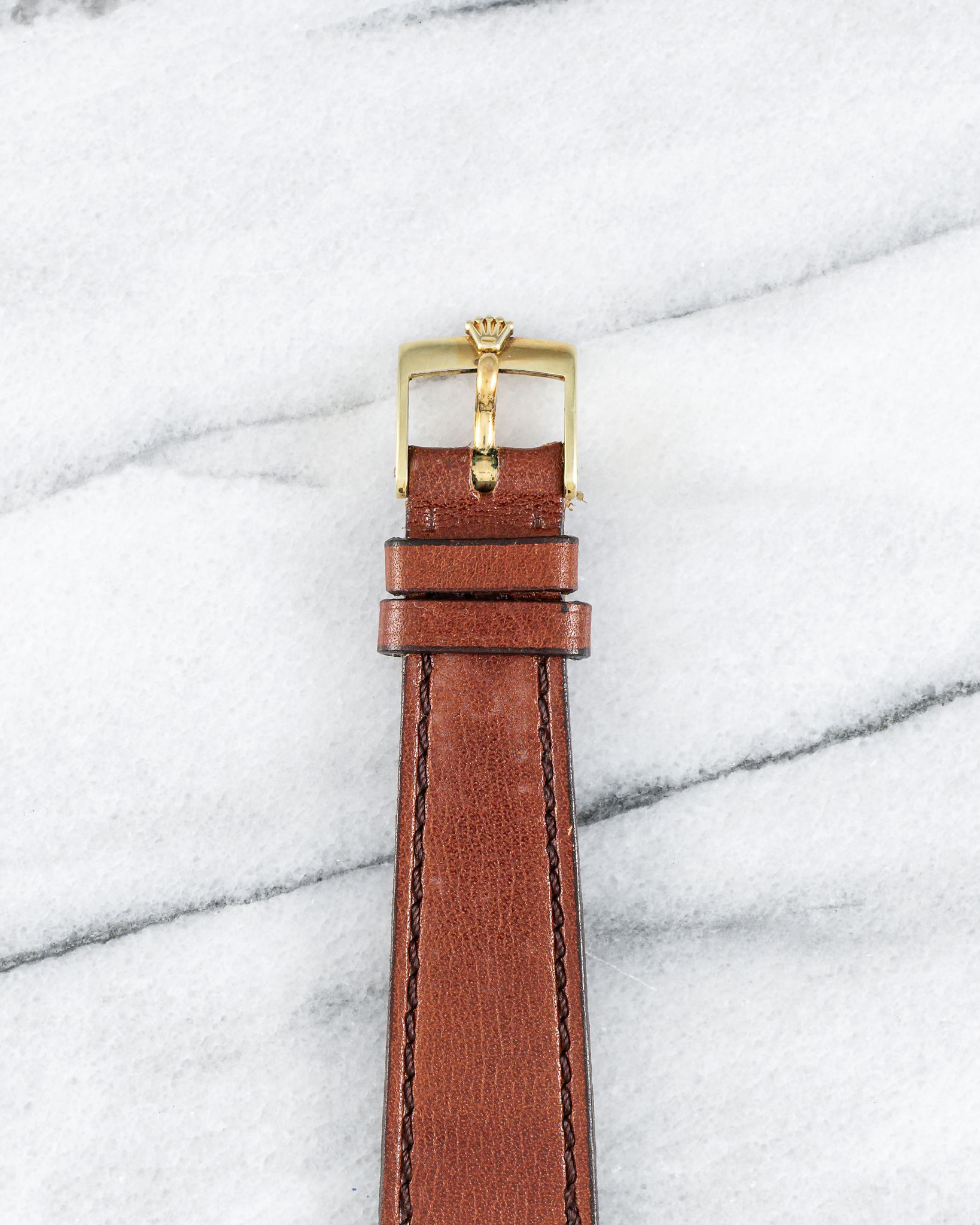 Here's a vintage Rolex Cellini Ref number 3805 in 18K yellow gold with a cappuccino/ mocha dial from the 1980s. Keeps great time and is fully functional. Measurements include a 31mm case size and 20mm lug width. On an aftermarket brown leather strap with its matching signed buckle. Time only. Tonneau case. Sunburst mocha dial. Matching stick hands and hour markers.The watch makes for a great dress watch for both men and women. Snapback caseback. 18K yellow gold and snapback caseback. signed. All parts are original including the dial, movement, and caseback.