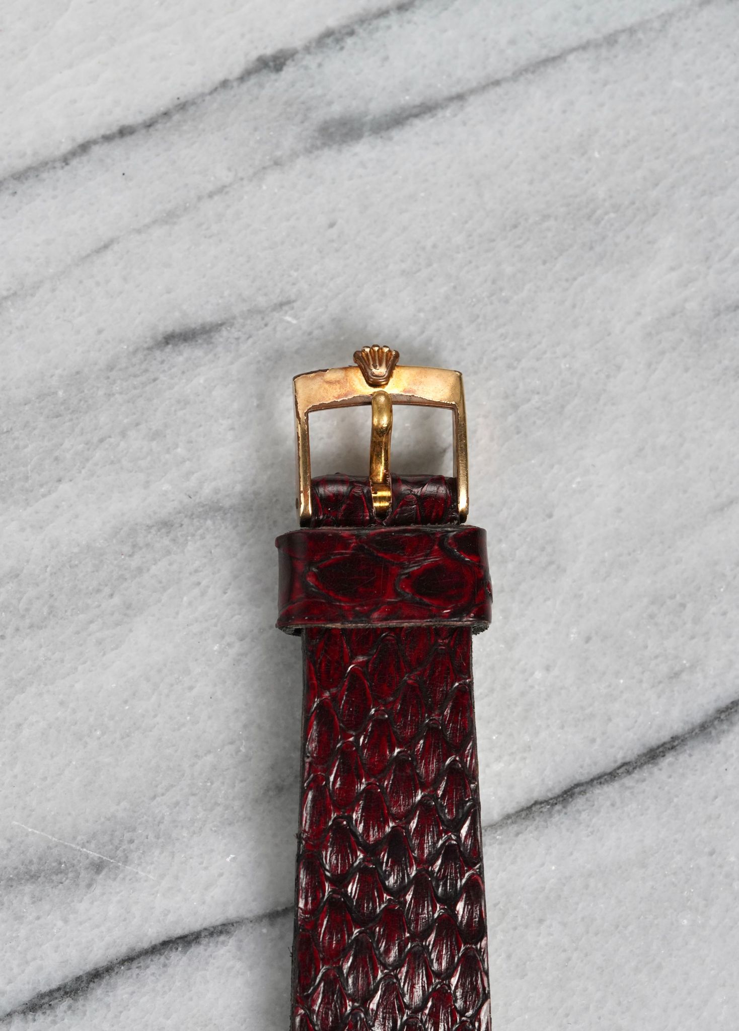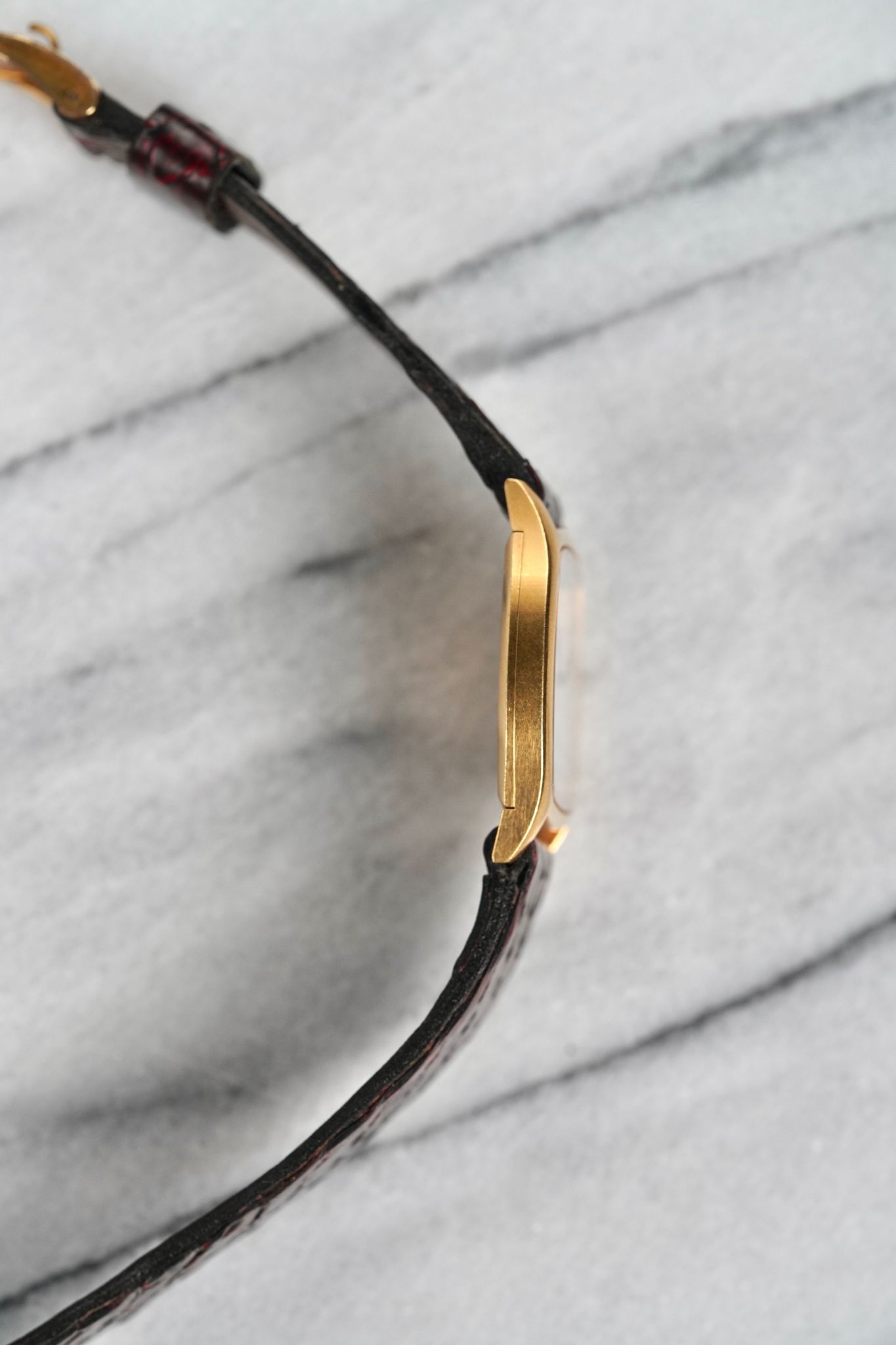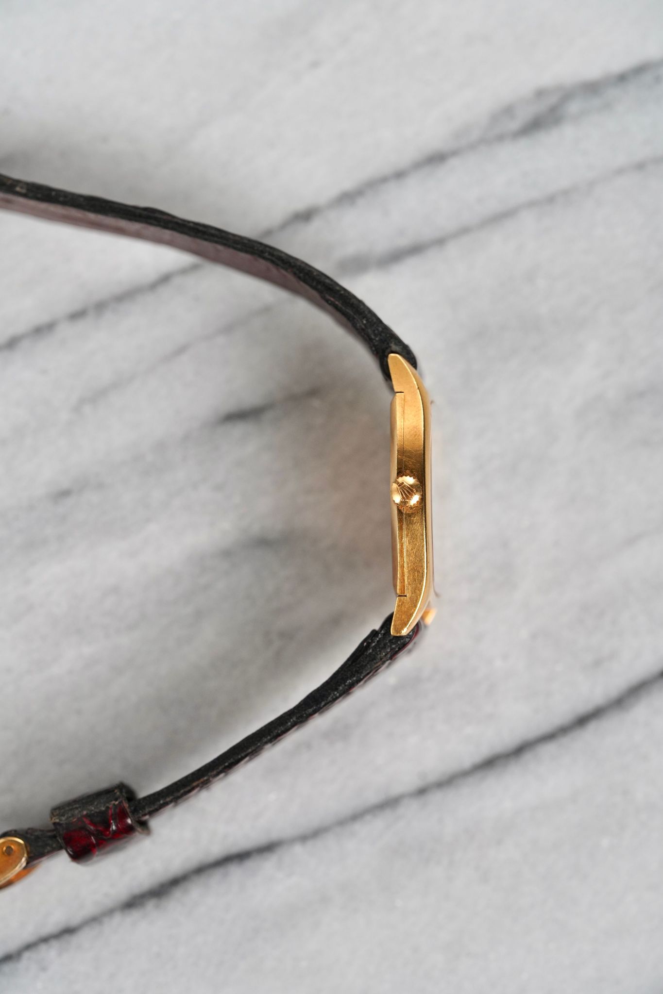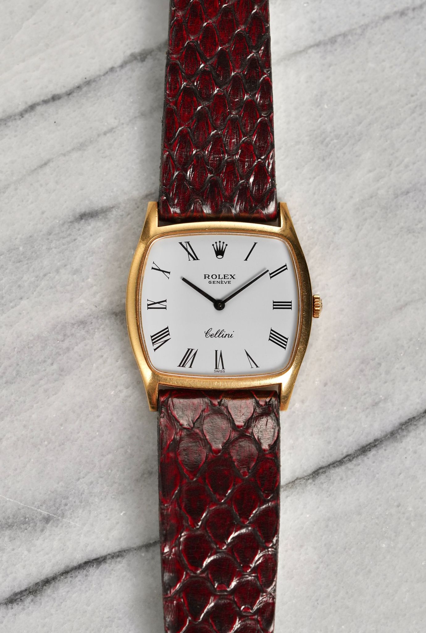 Here's a vintage Rolex Cellini Reference number 3805 manual wind in 18K yellow gold with a white roman numeral dial from the 70s. Keeps great time and is fully functional. Measurements include a 31mm case size and 20mm lug width. Matching stick hands and black roman numerals. It's on an aftermarket red leather strap and signed Rolex buckle. Time only. Tonneau case. Sunburst mocha dial. Matching stick hands and hour markers. The watch makes for a great dress watch for both men and women. Snapback caseback. 18K yellow gold and snapback caseback. The crown is likely not original as it's not signed. All other parts are original including the dial, movement, and caseback.