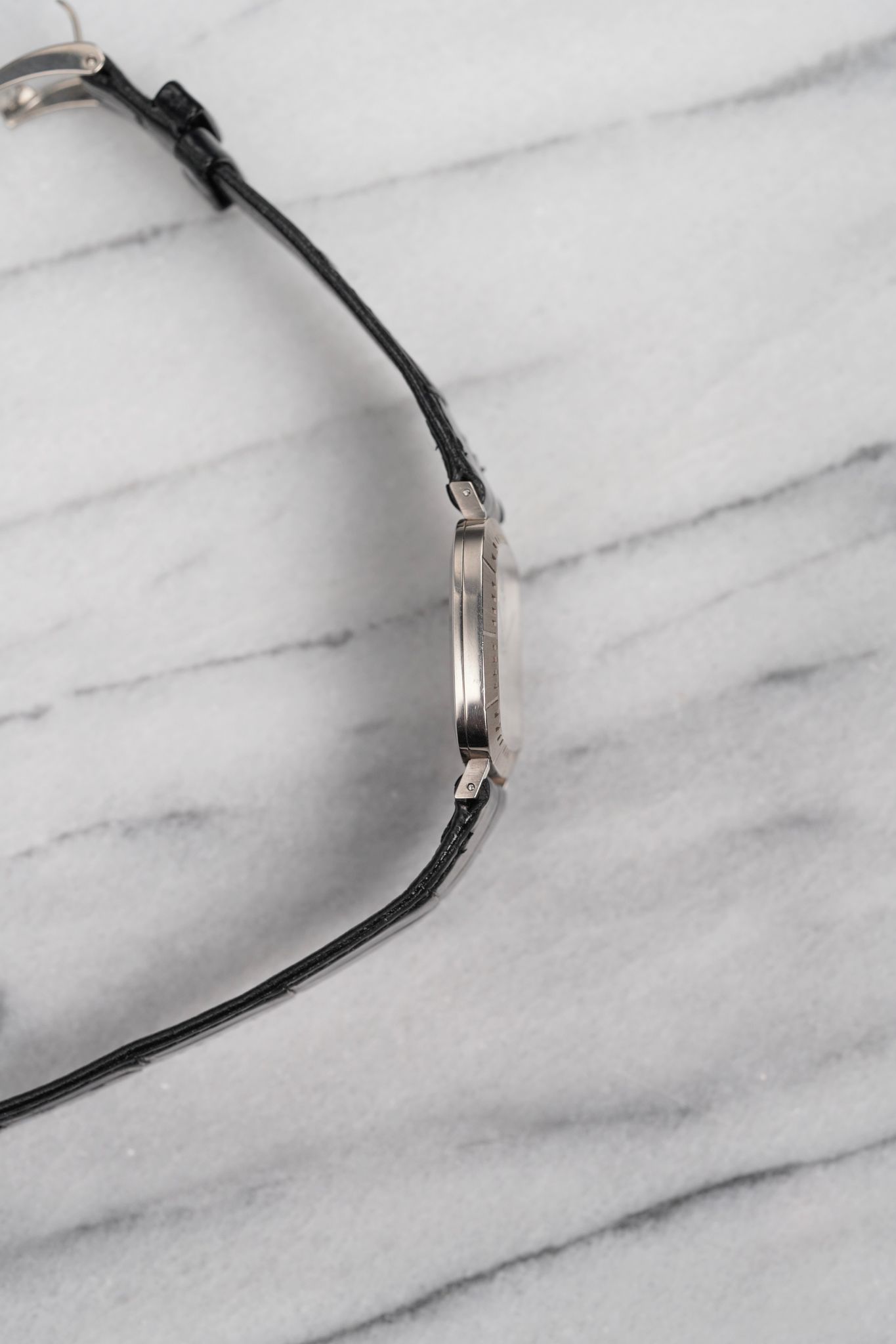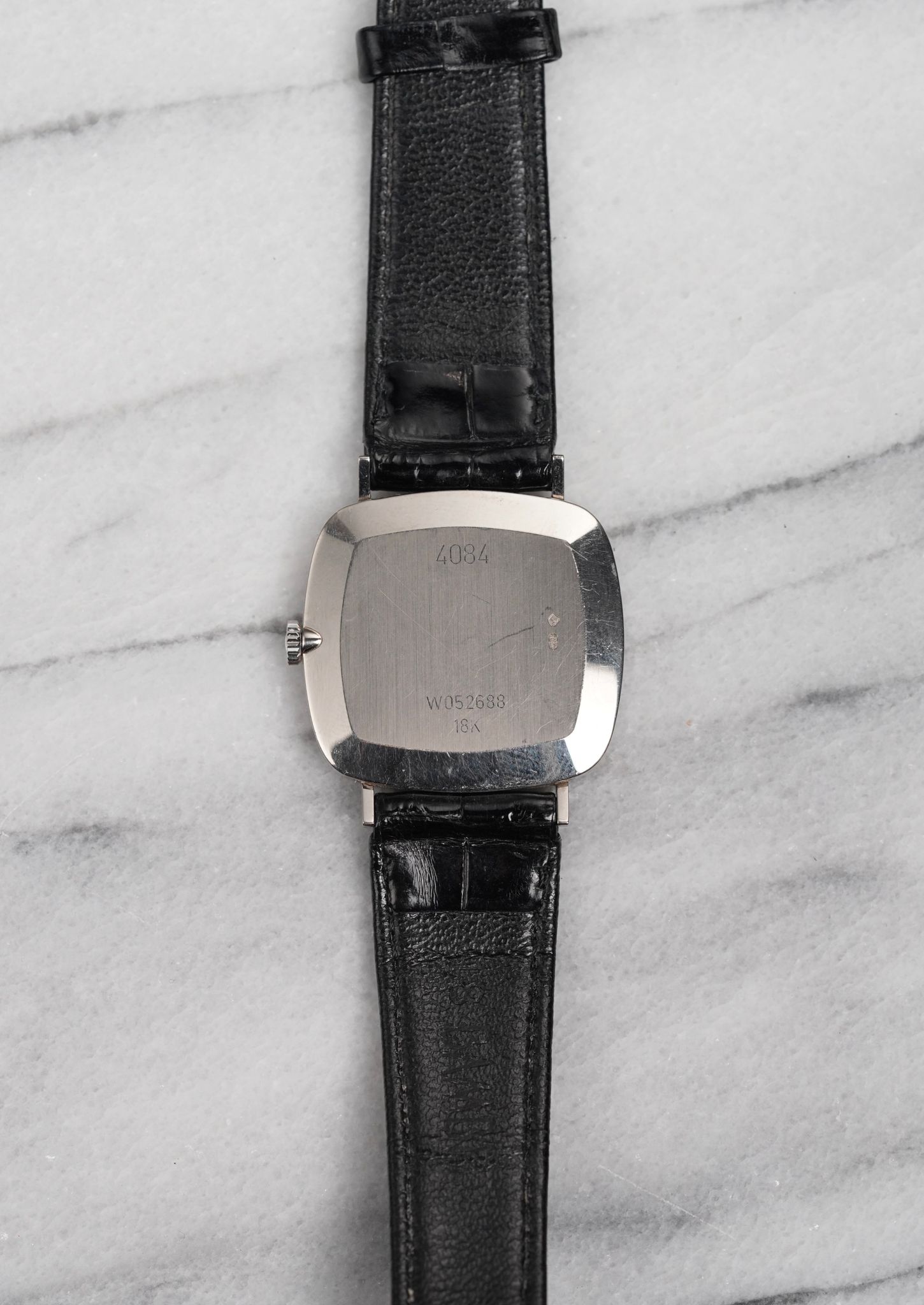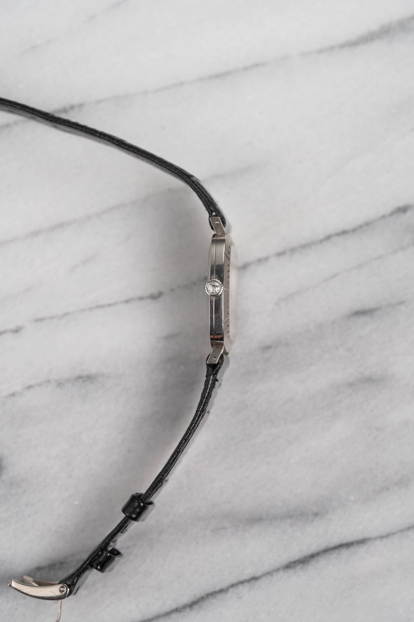 Here's a vintage Rolex Cellini reference 4084 with a silver dial in 18K yellow gold from the 80s. Keeps great time and is fully functional. Measurements include a 30mm tank case and 17mm lug width. On a black alligator leather strap with its signed gold crown. The bezel has its own Roman numeral track. Caliber 1600. Stick hands. Drilled lug holes. Unpolished case and bezel. 18k white gold case and caseback. All other parts are original including the signed caseback, dial, and movement. Both the dial and case are in great cosmetic, untouched condition.