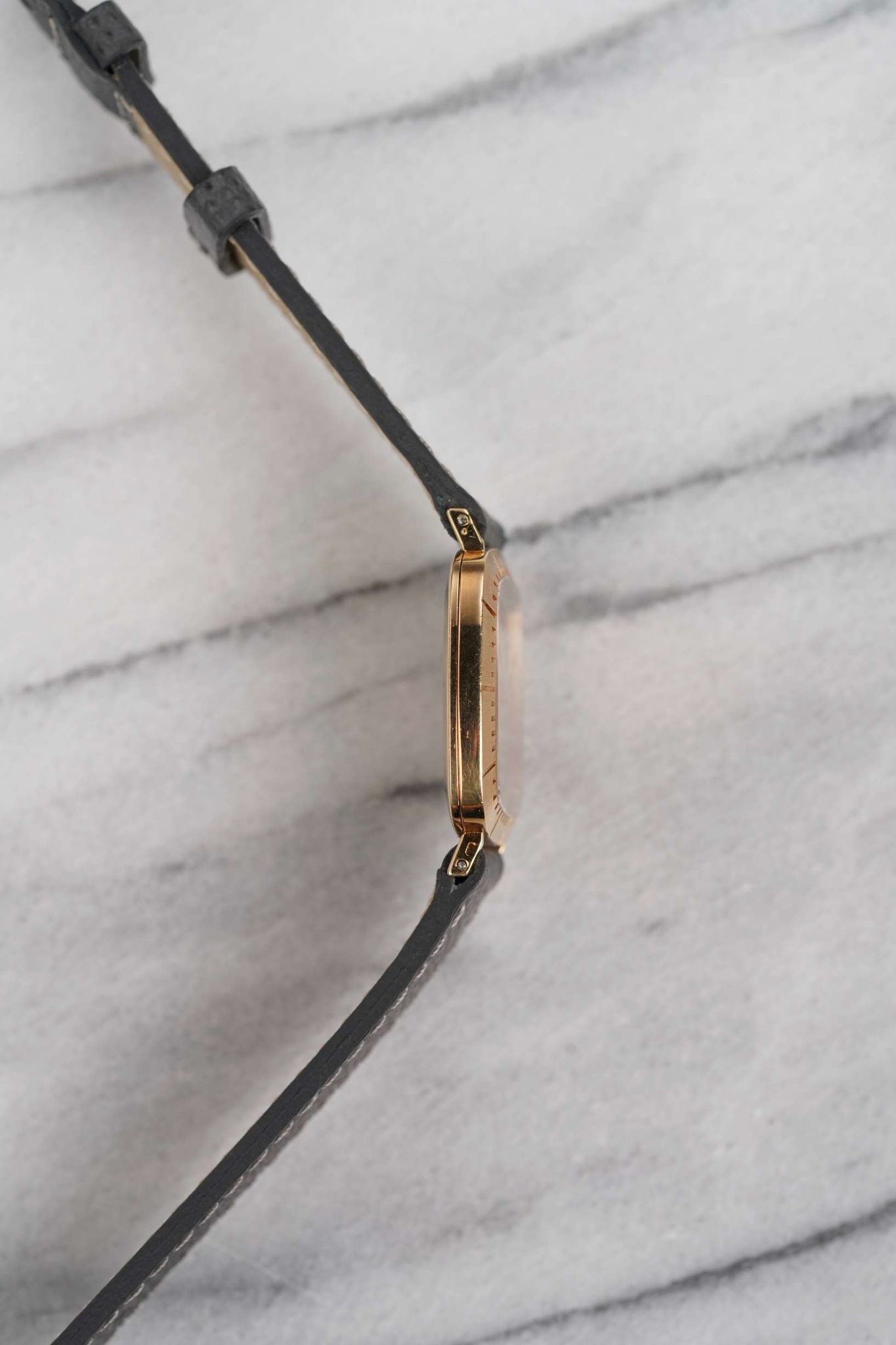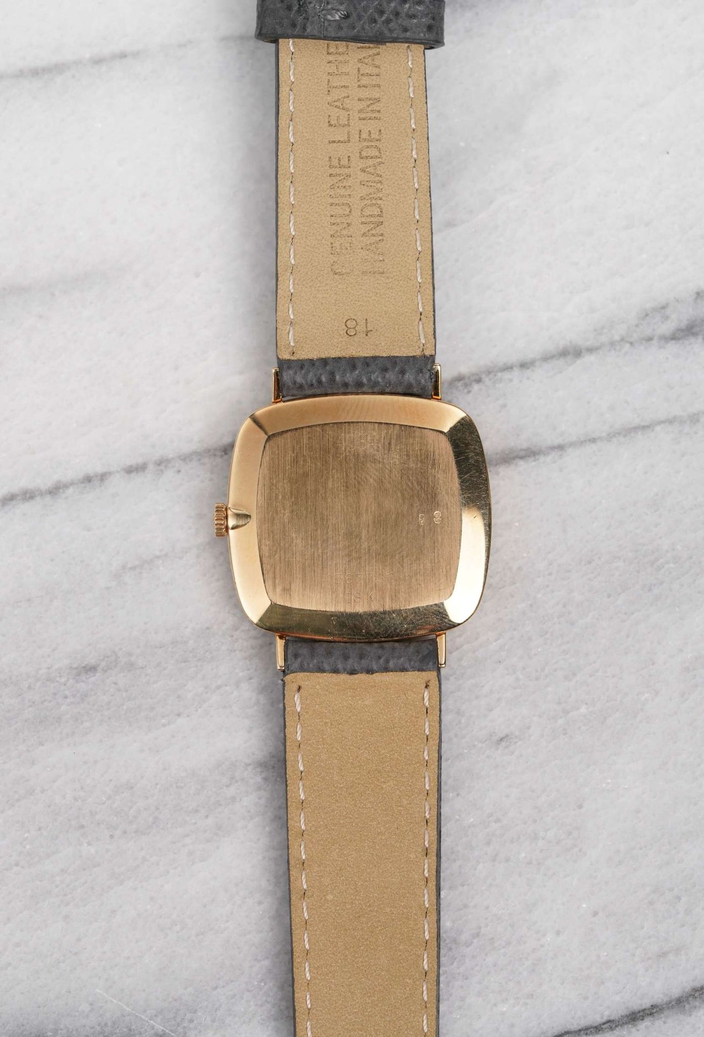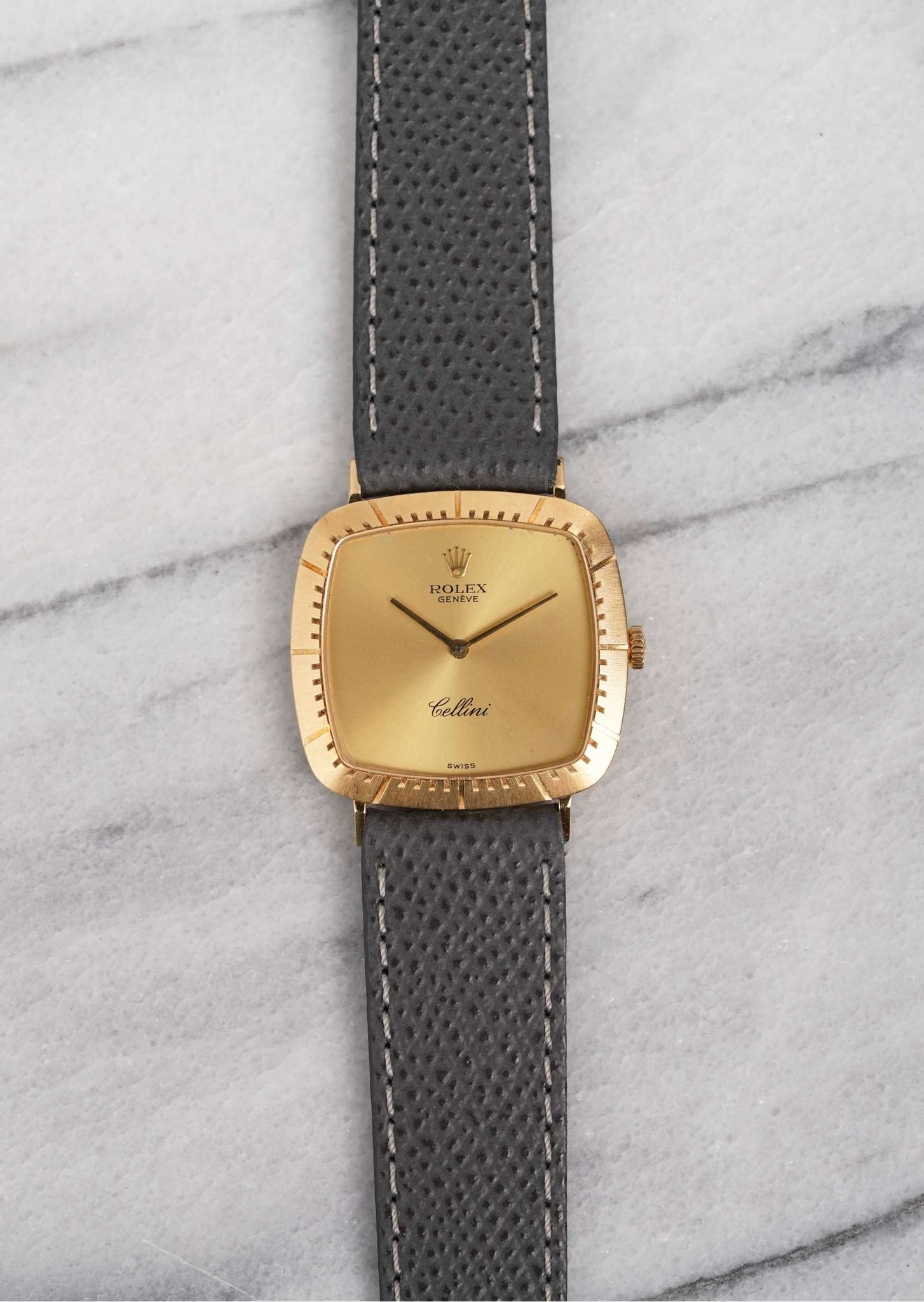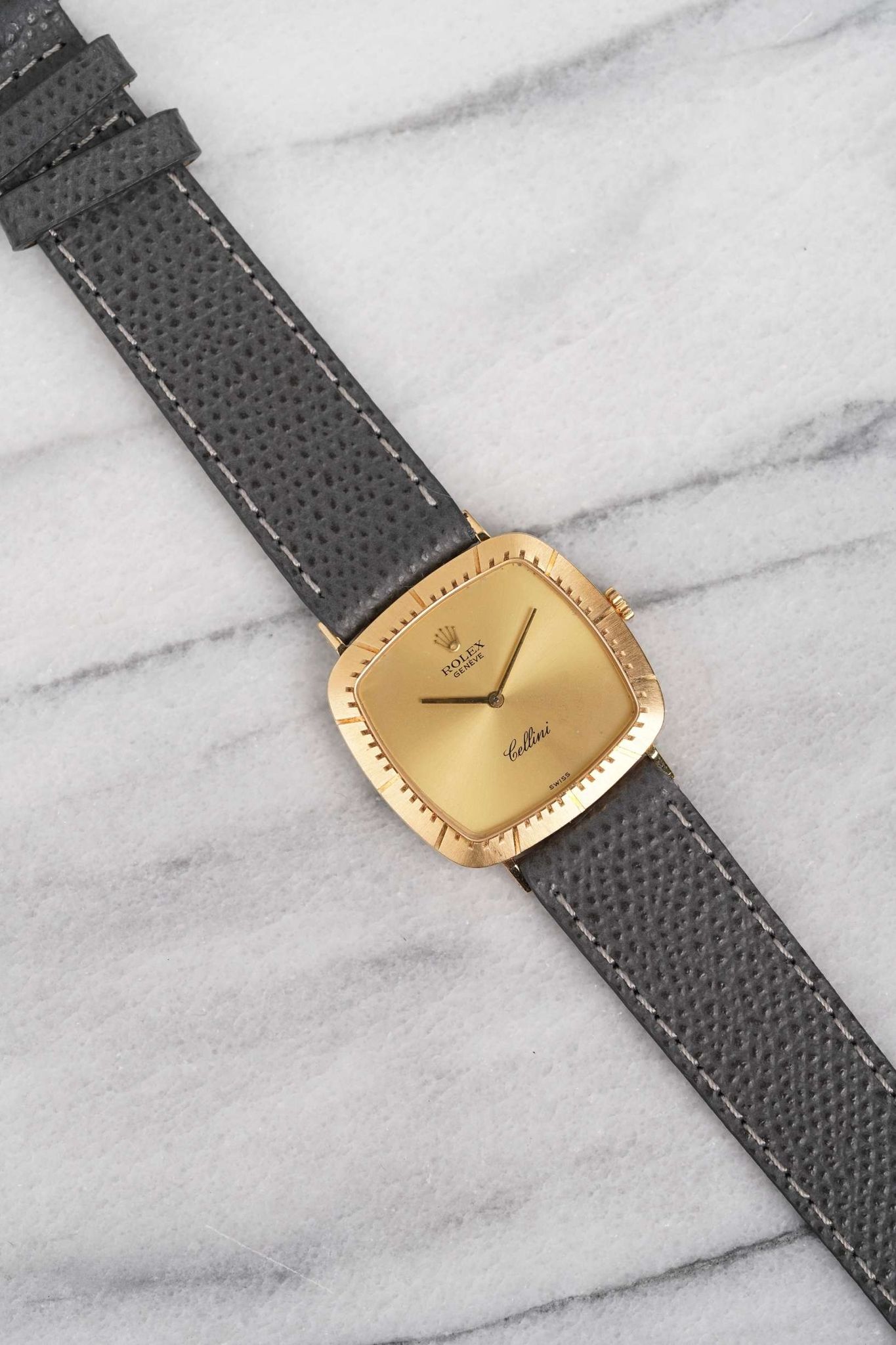 Here's a vintage Rolex Cellini reference 4084 with a champagne dial in 18K yellow gold from the 70s. Keeps great time and is fully functional. Measurements include a 30mm tank case and 17mm lug width. On a vintage pigskin tan leather strap. Sunburst champagne dial. The bezel has its own minute track. Caliber 1600. Stick hands. Drilled lug holes. 18k yellow gold case and caseback. All other parts are original including the signed caseback, dial, and movement. Both the dial and case are in great cosmetic, untouched condition.