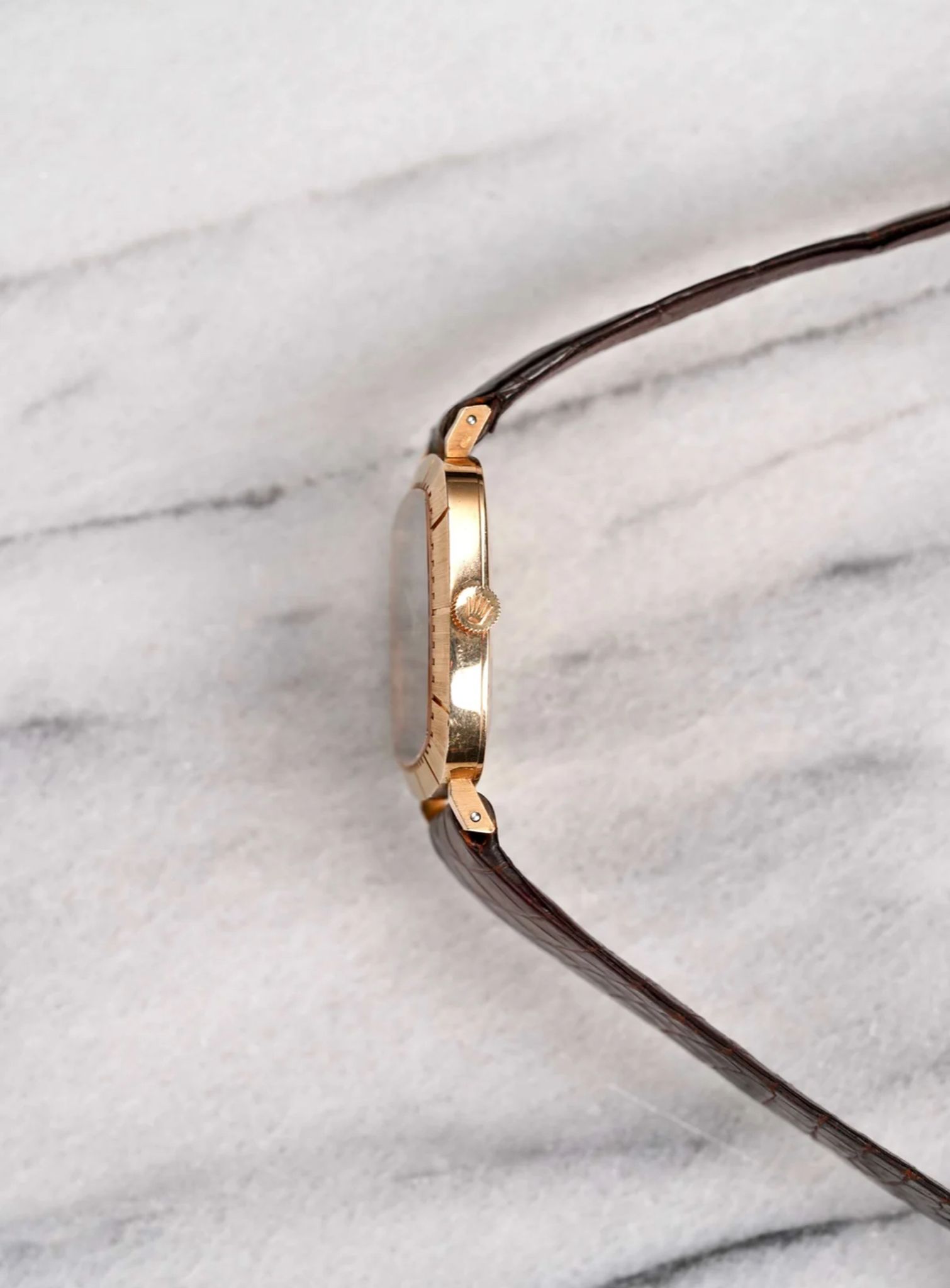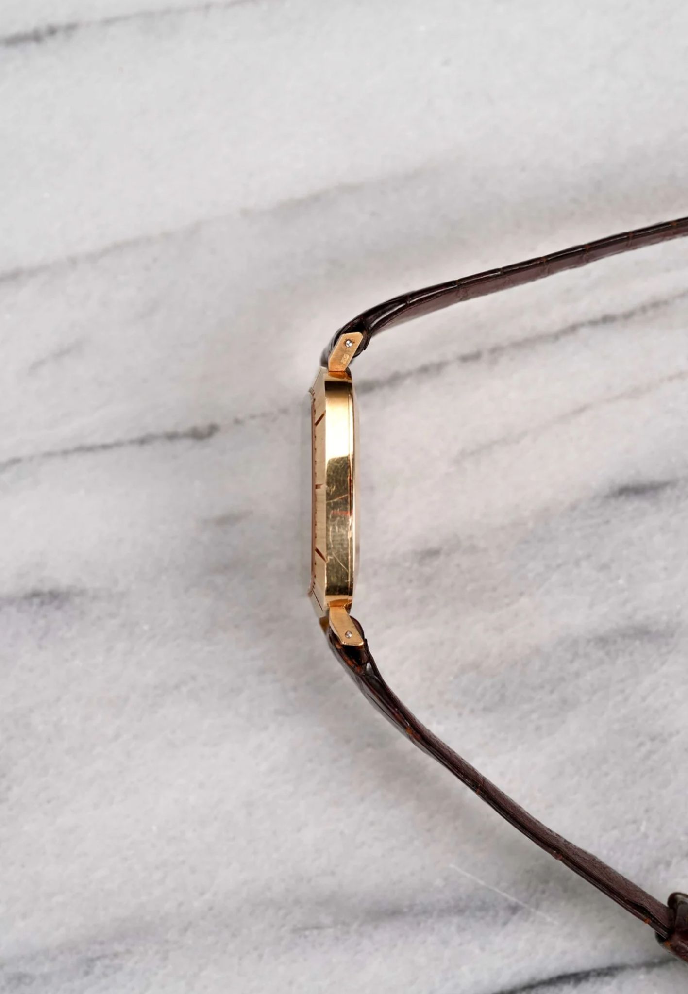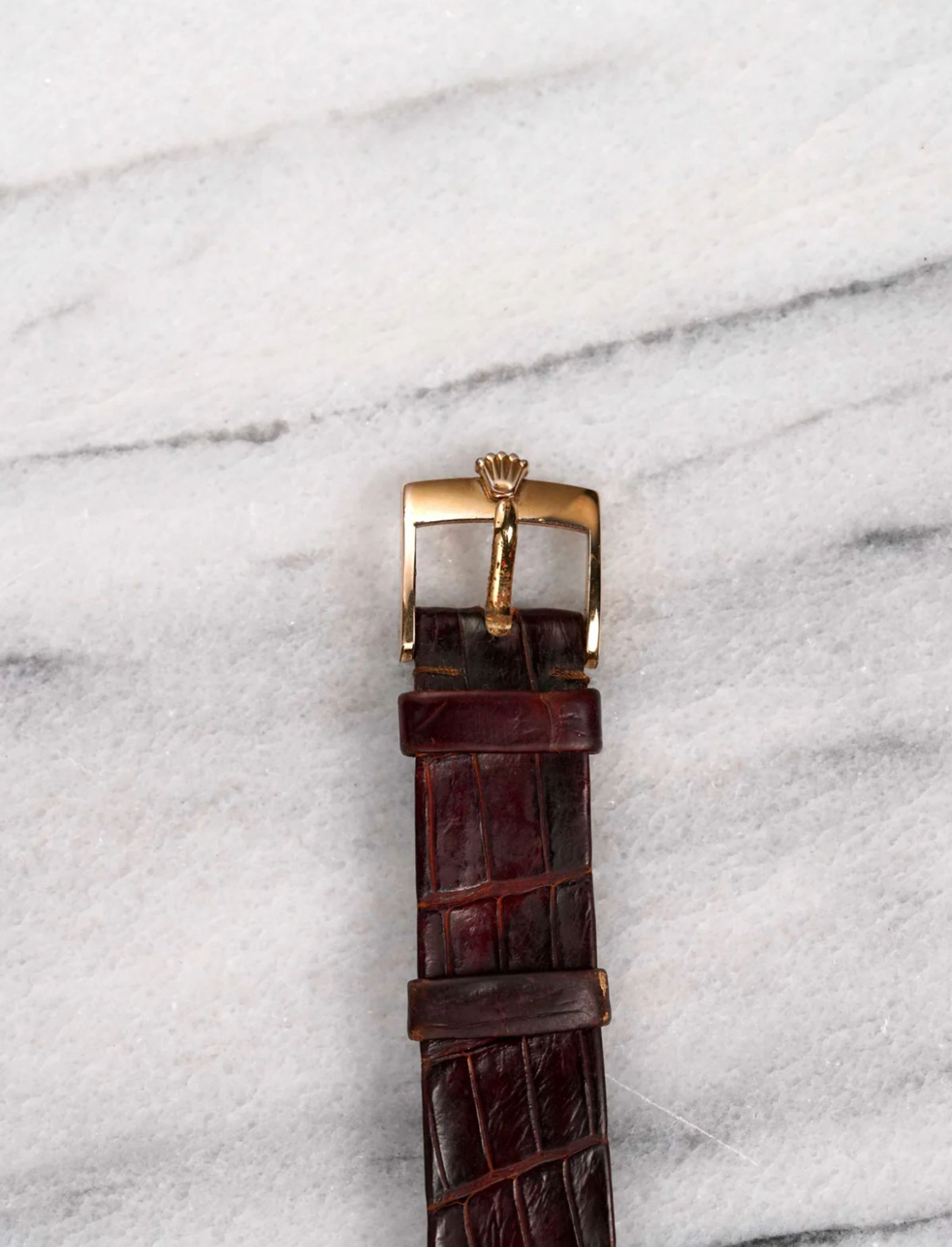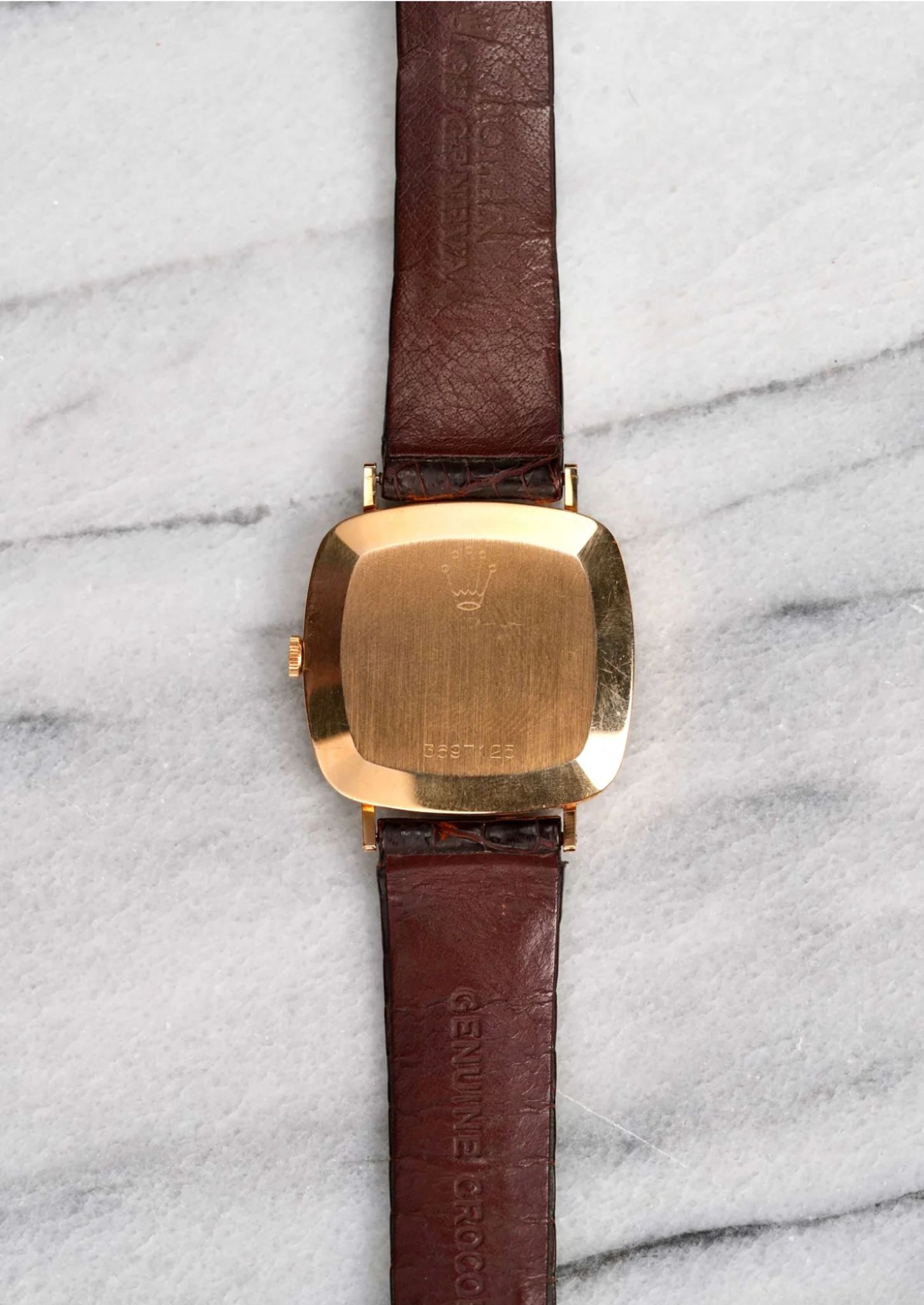 Here's a vintage Rolex Cellini reference 4084 manual wind with an original red vignette dial in 18K yellow gold from the 70s. Keeps great time and is fully functional. Measurements include a 30mm tank case and 17mm lug width. On its original brown crackle dial leather strap and signed buckle. The bezel has its own minute track. Caliber 1600. Stick hands. The serial number is: N466885 as seen in the photos. Drilled lug holes. 18k yellow gold case and caseback. All other parts are original including the signed caseback, dial, and movement. Both the dial and case are in great cosmetic, untouched condition.