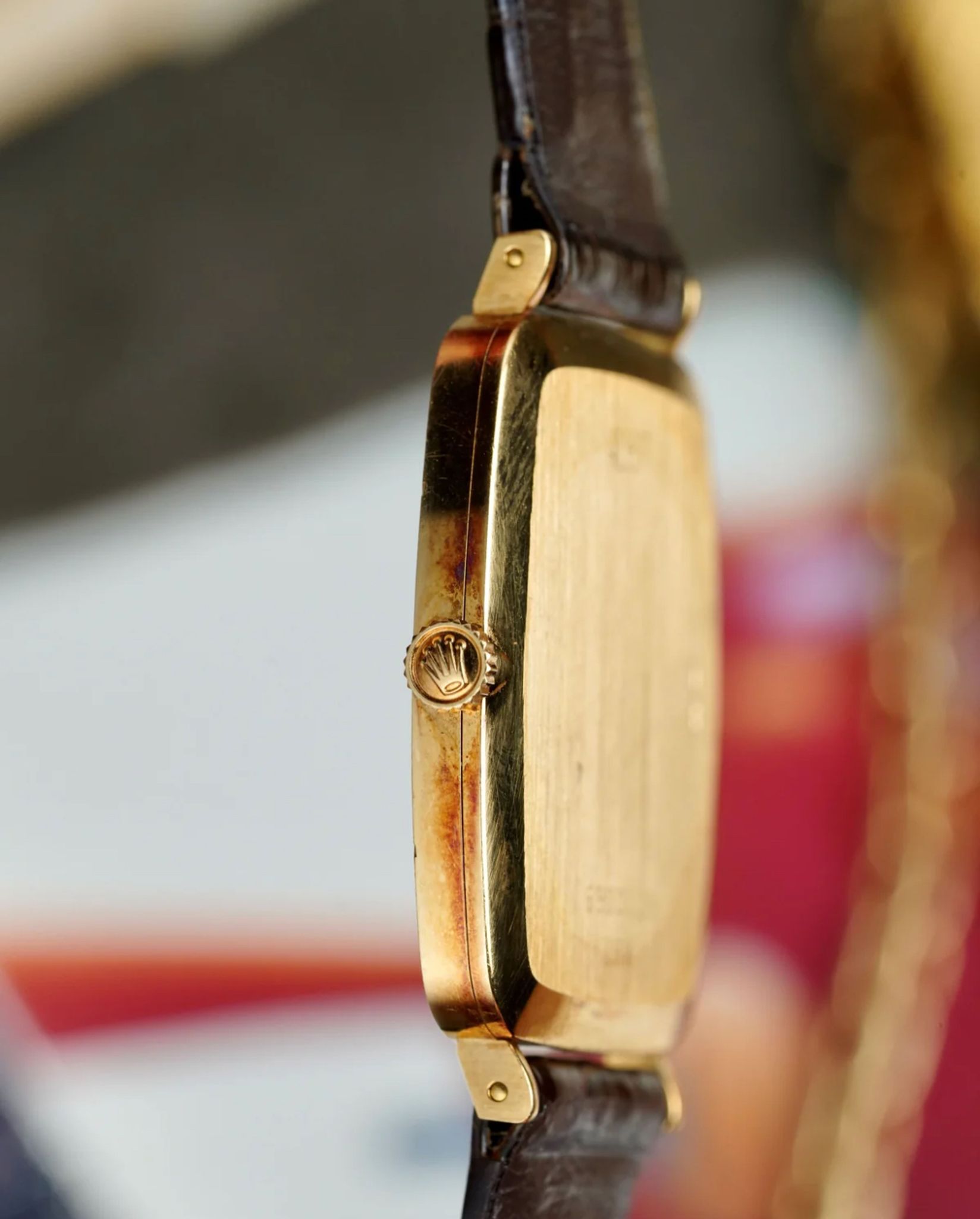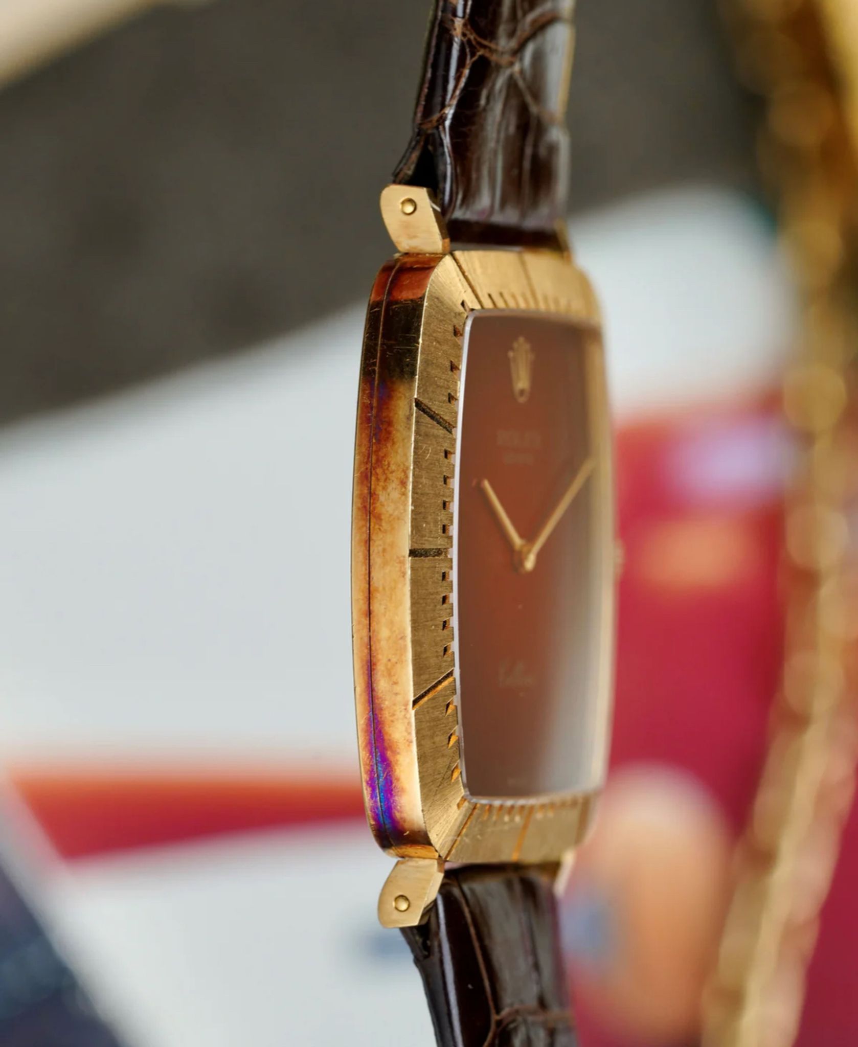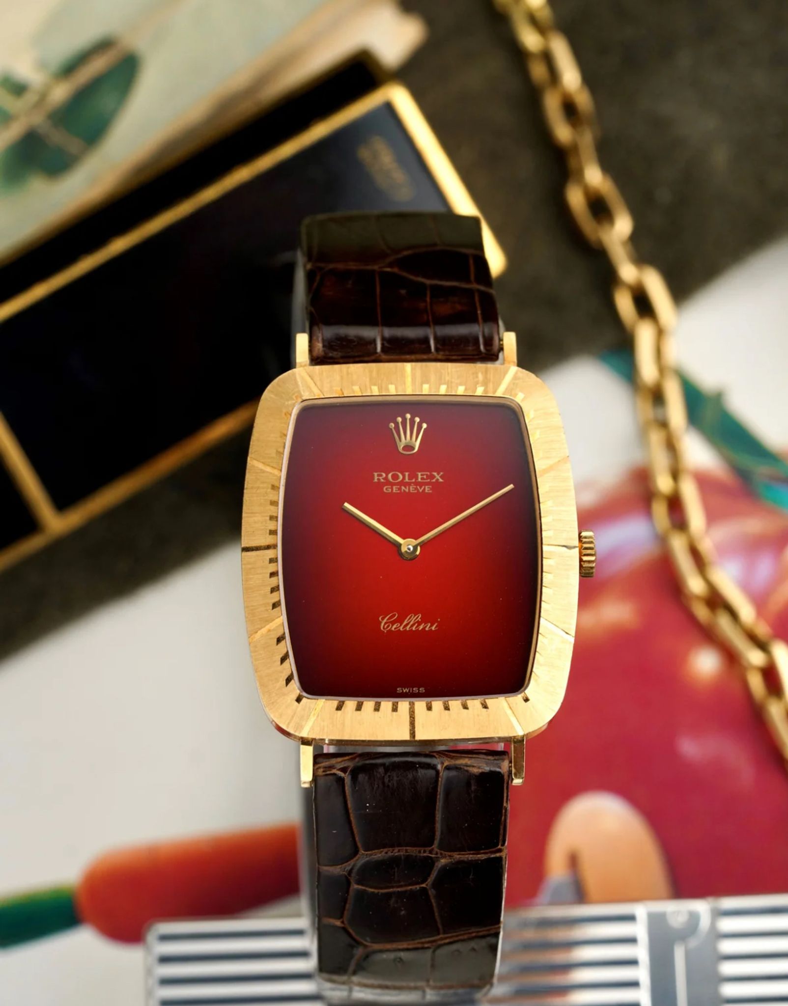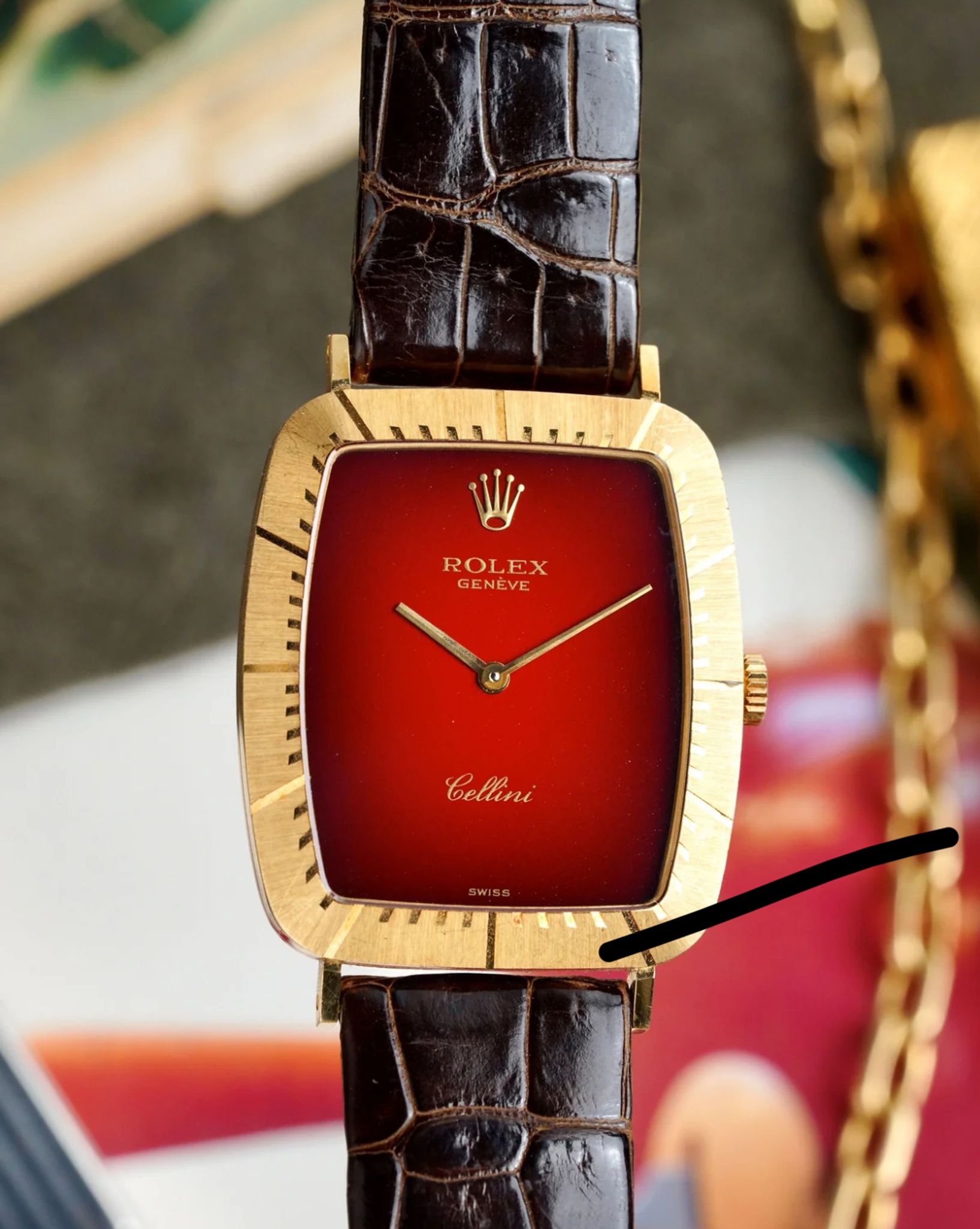 Here's a vintage Rolex Cellini reference 4087 with a red vignette dial in 18K yellow gold from the 1990s. Keeps great time and is fully functional. Tonneau case. Red vignette dial. 17mm slug width and 30mm case. On its original brown leather strap and signed gold buckle. The case seems to be unpolished as the sides have oxidized slightly to a purple color.Time only. Minute track around the bezel. Drilled lug holes. Gold hands. Ambre effect with the dial. 18k yellow gold case and caseback. All parts are original including the signed crown, caseback, dial, and movement. Both the dial and case are in great cosmetic, untouched condition.