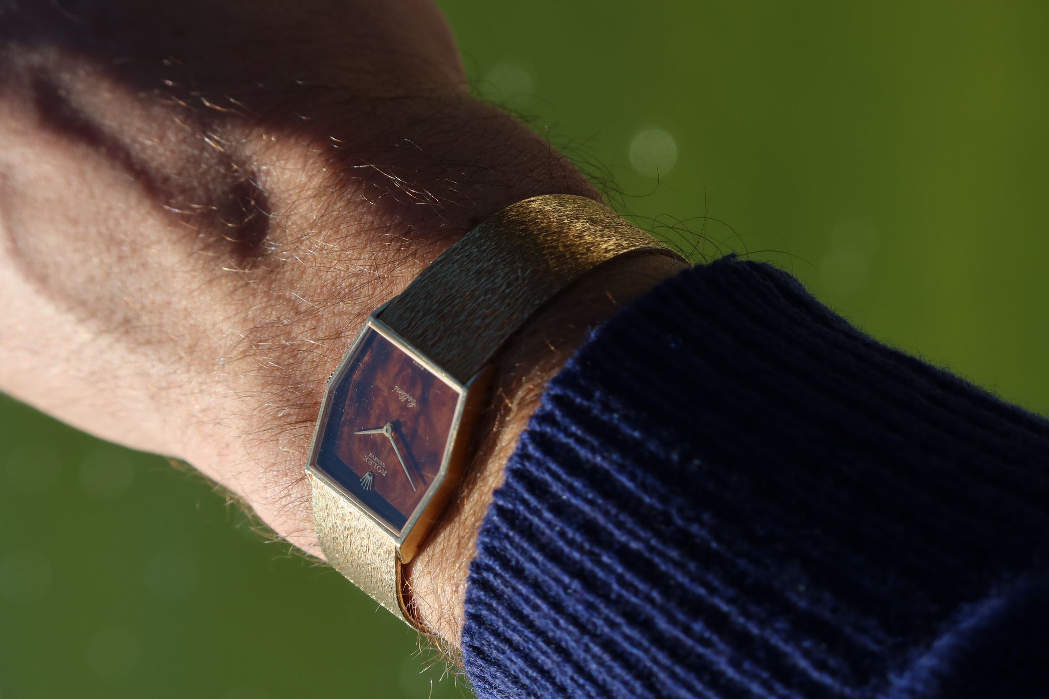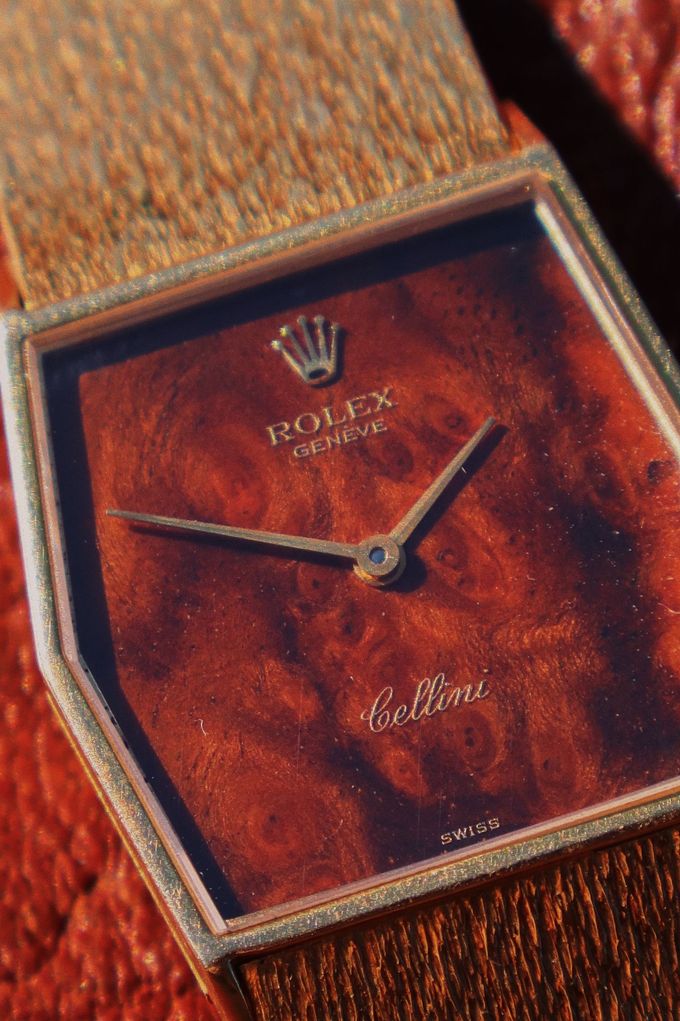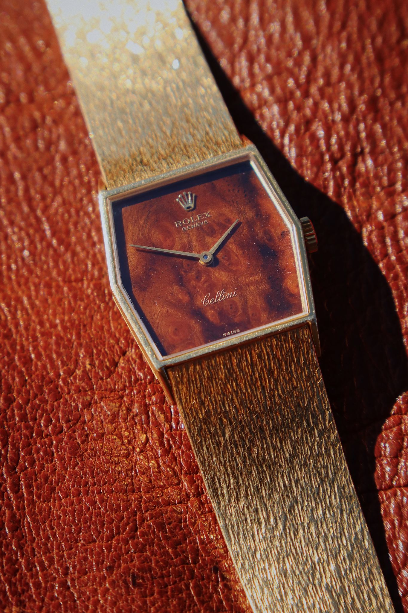This Rolex Cellini exudes elegance and sophistication. Rarely seen on integrated bracelet with wooden dial, it also stands out thanks to its impeccable condition.