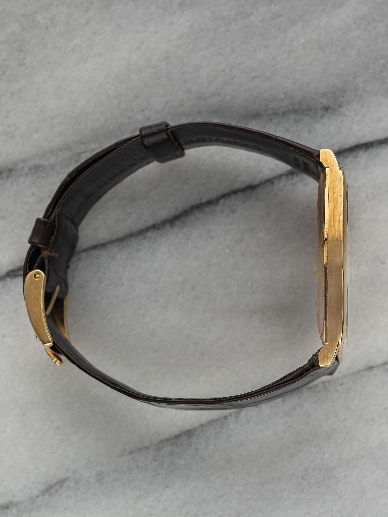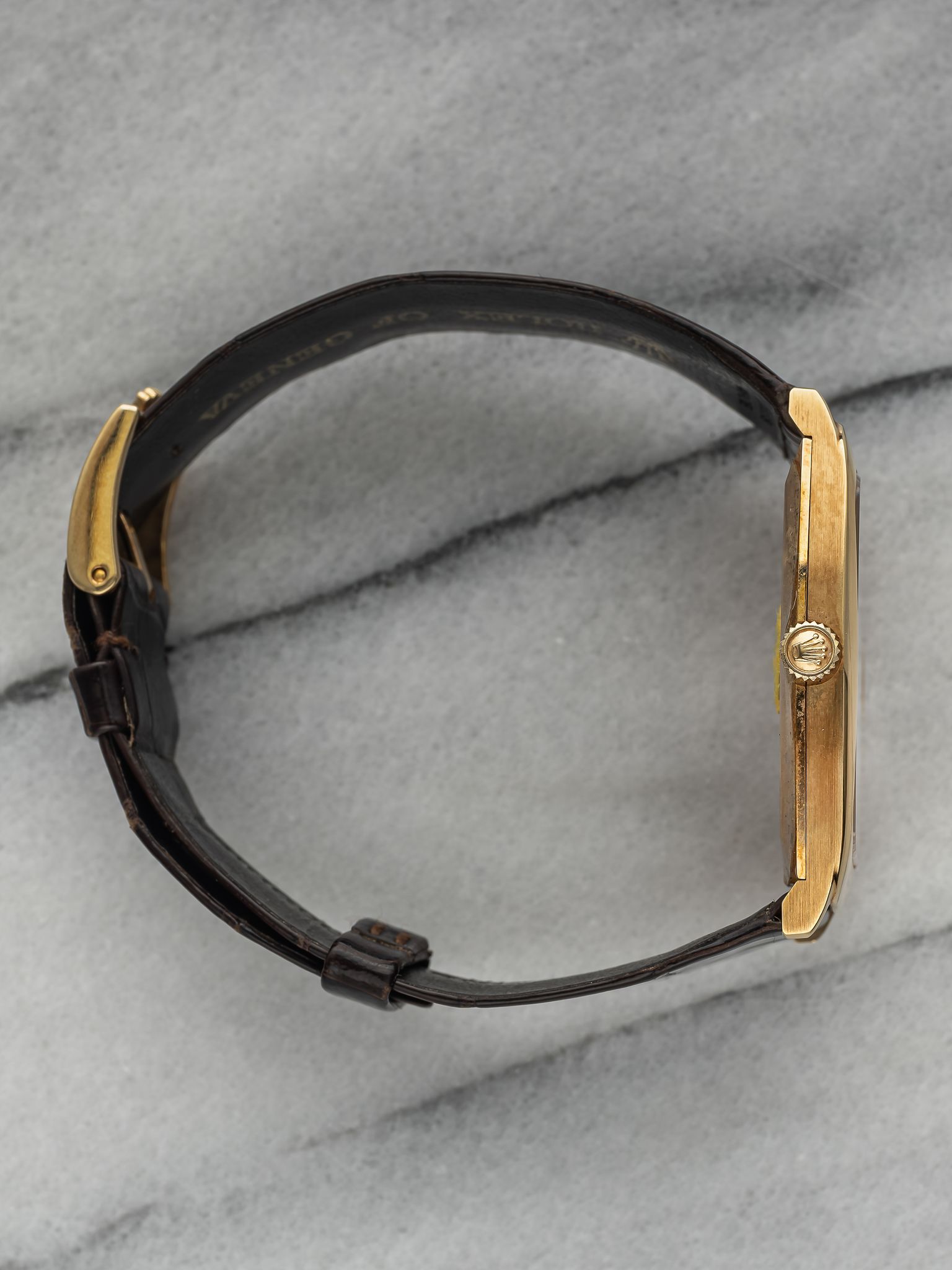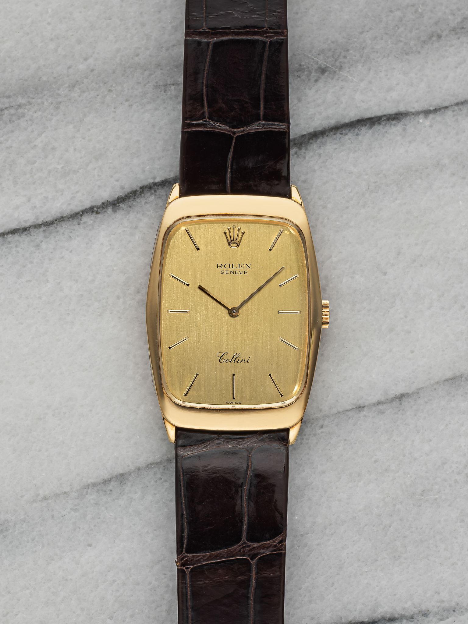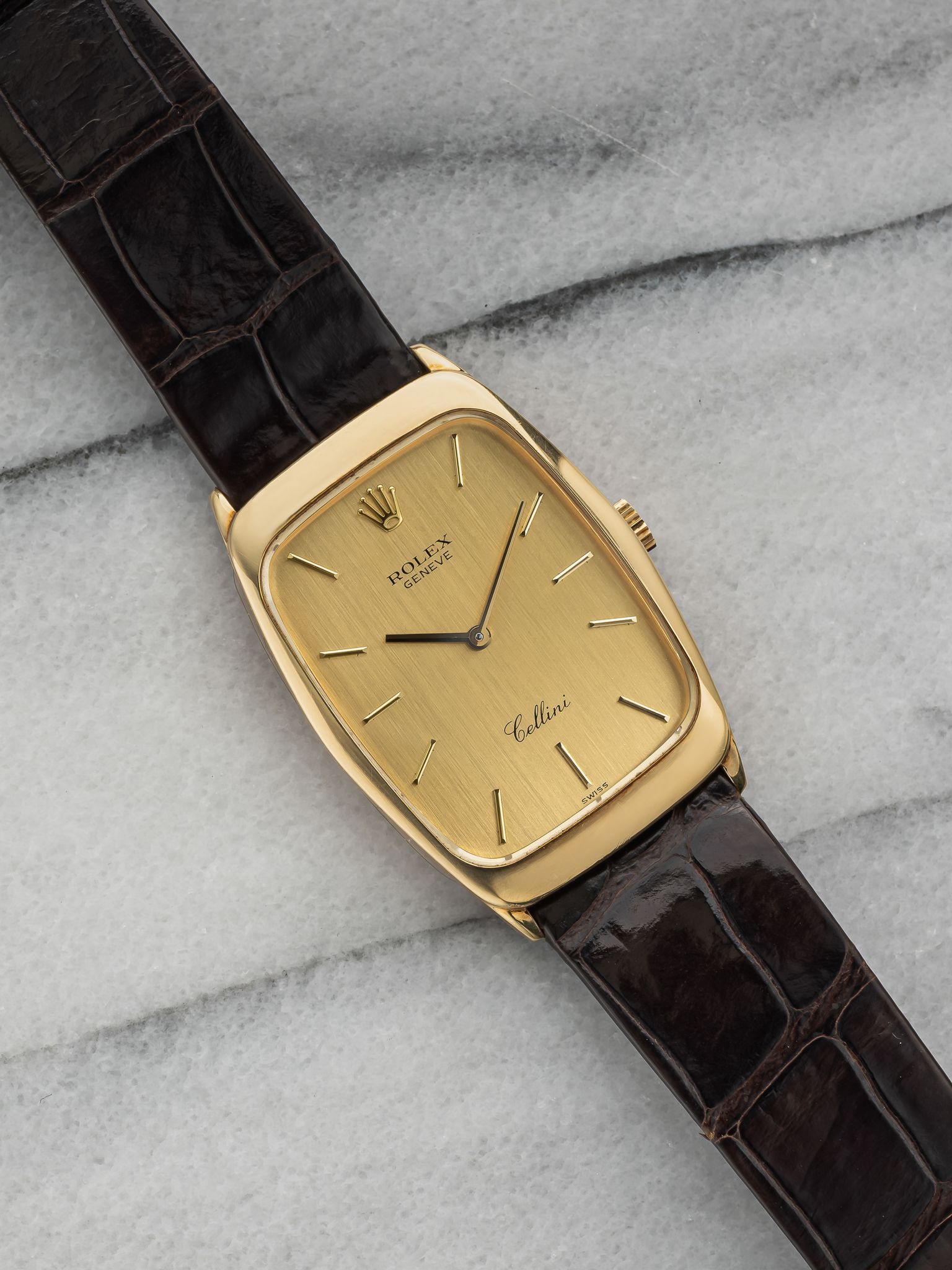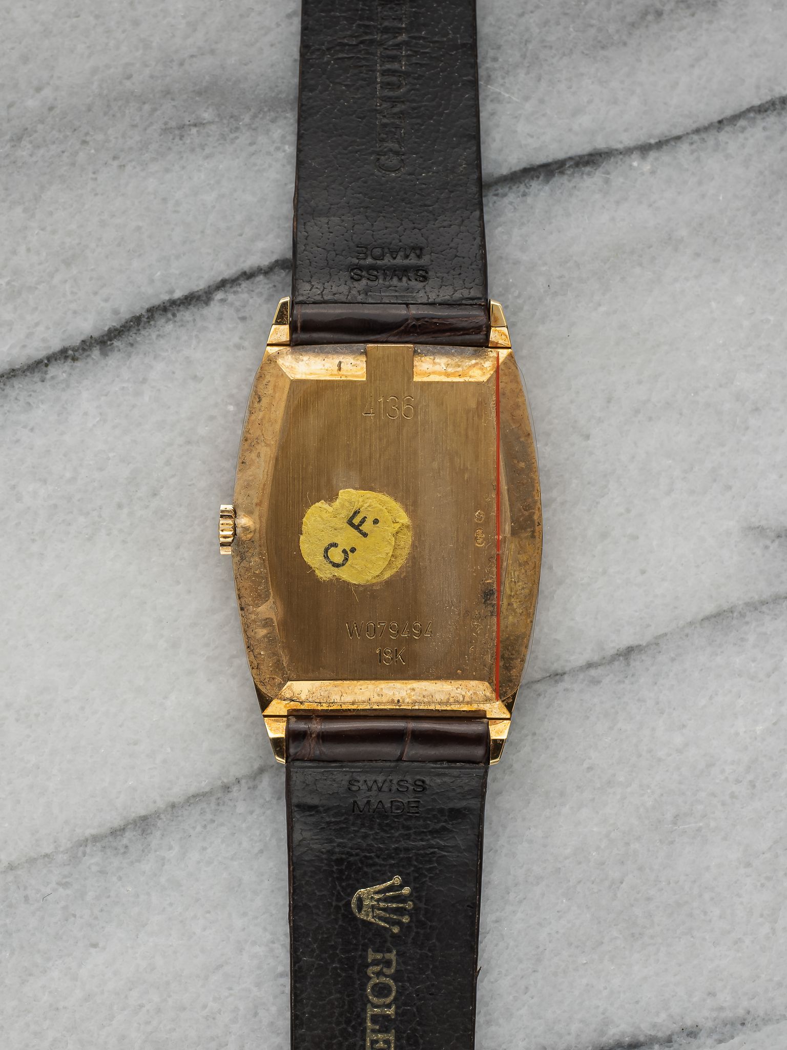 Here's a vintage Rolex Cellini tank eference 4136 with a champagne dial manual wind in 18k yellow gold from the 1990s. Measurements include a 26x35mm case and an 18mm lug width. On its original brown leather strap and signed gold buckle. All parts including the crown, dial, movement, and caseback are original.