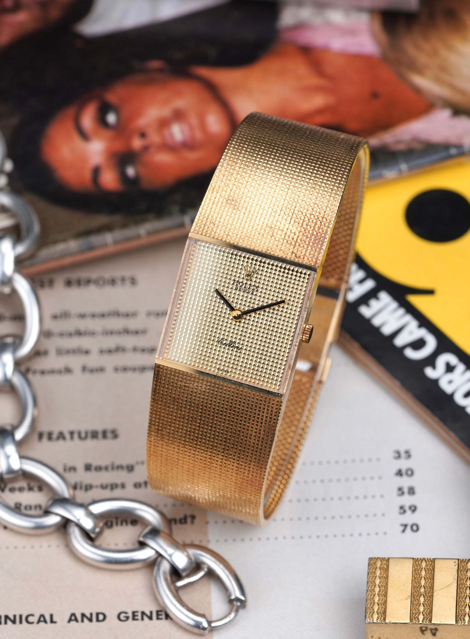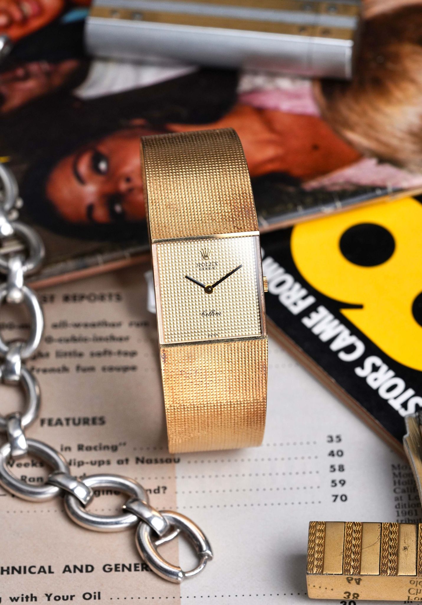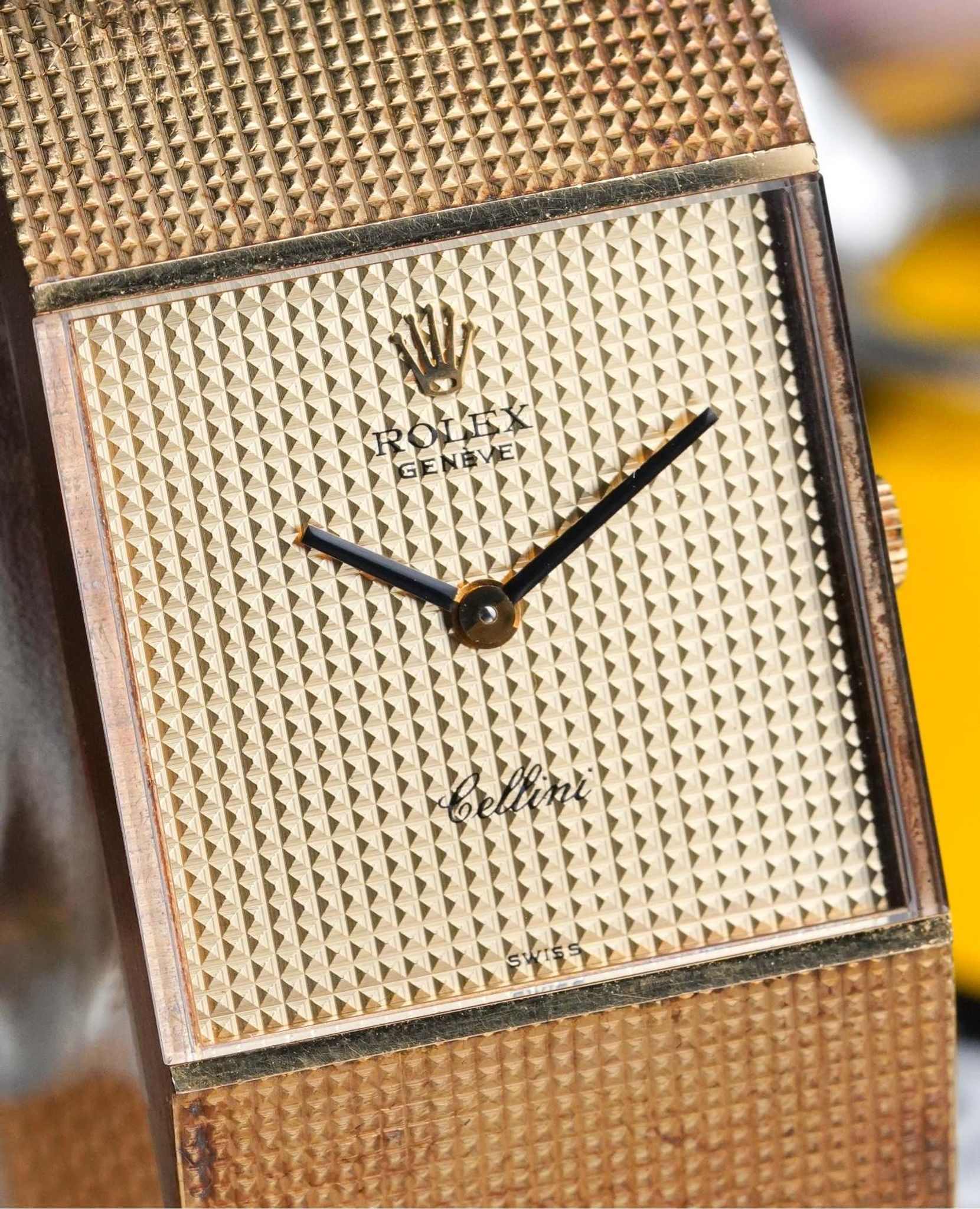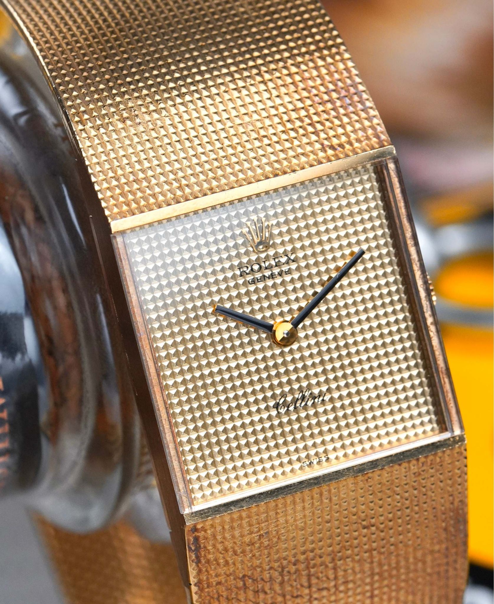 Here's a vintage Rolex Cellini Reference 4312 Manual Wind with a unique champagne hobnail finish on the dial and bracelet in 18K white gold from the 70s. Keeps great time and is fully functional. Measurements include a 33 x 24mm tank case with 6mm thickness and 22mm lug width. On its original gold mesh bracelet that fits up to an 8 inch wrist (long uncut original bracelet and clasp). This model is the oversized one, compared to the smaller ones. Stick hands. The watch wears like a cuff. This piece is very Midas-esq due to its shape and how it wears. Comes with its original box and papers from 1978. Very unusual to see an example like this. 18k yellow gold case and caseback. All parts are original including the signed Rolex crown, caseback, dial, and movement. Both the dial and case are in great cosmetic, untouched condition.