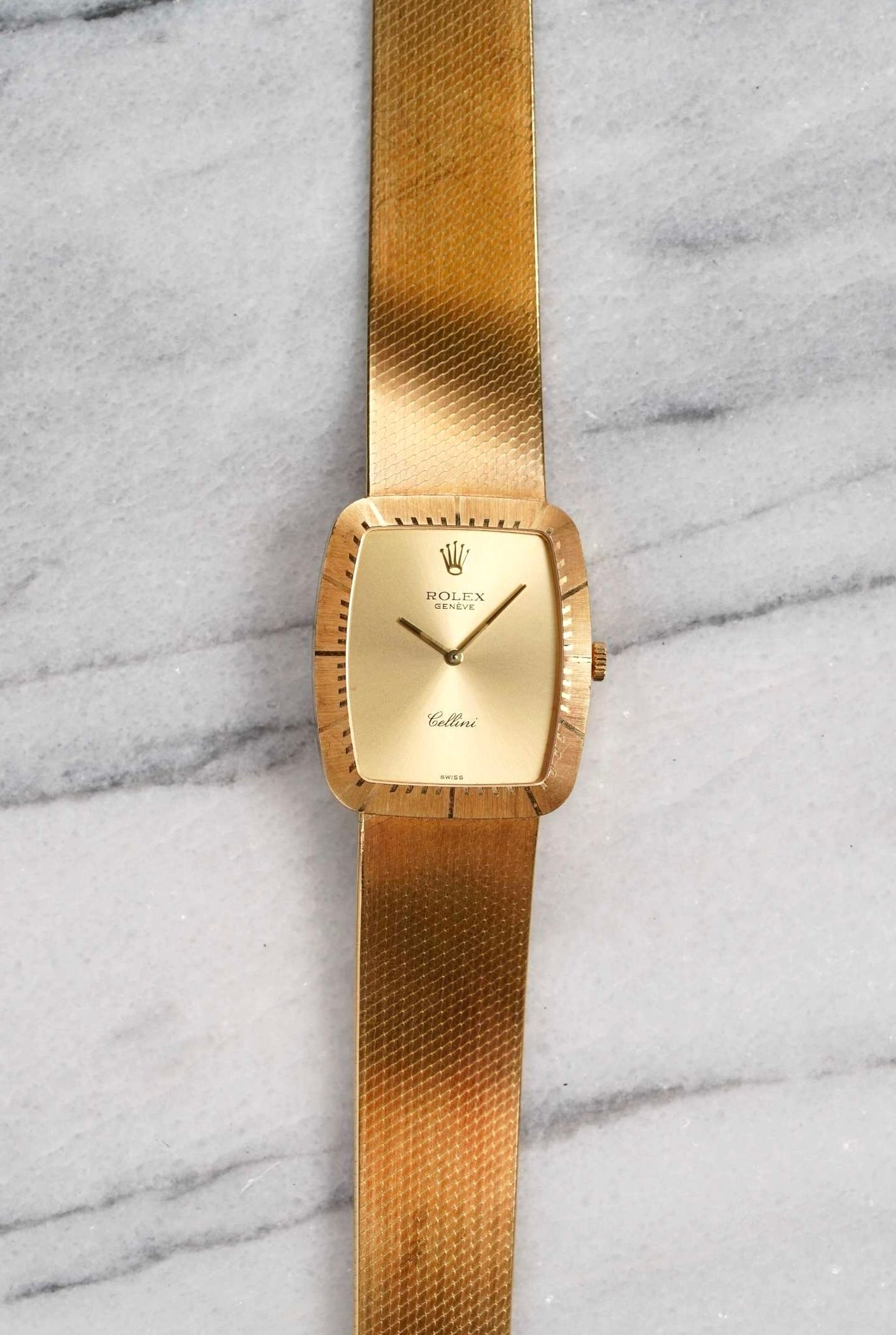 Here’s a vintage Rolex Cellini reference 4322 manual wind 18K yellow gold with a champagne dial from the 1970s. 30mm tonneau case. 18k yellow gold case on its original mesh bracelet that fits up to a 7.25 inch wrist. Unpolished condition throughout the bezel, case, and bracelet. Has a slight oxidation on the gold. Time-only function. Original dial, case, movement, and crown. Fully functional and keeping time.
