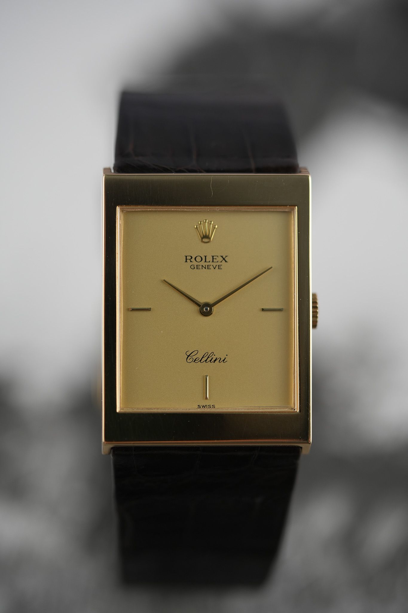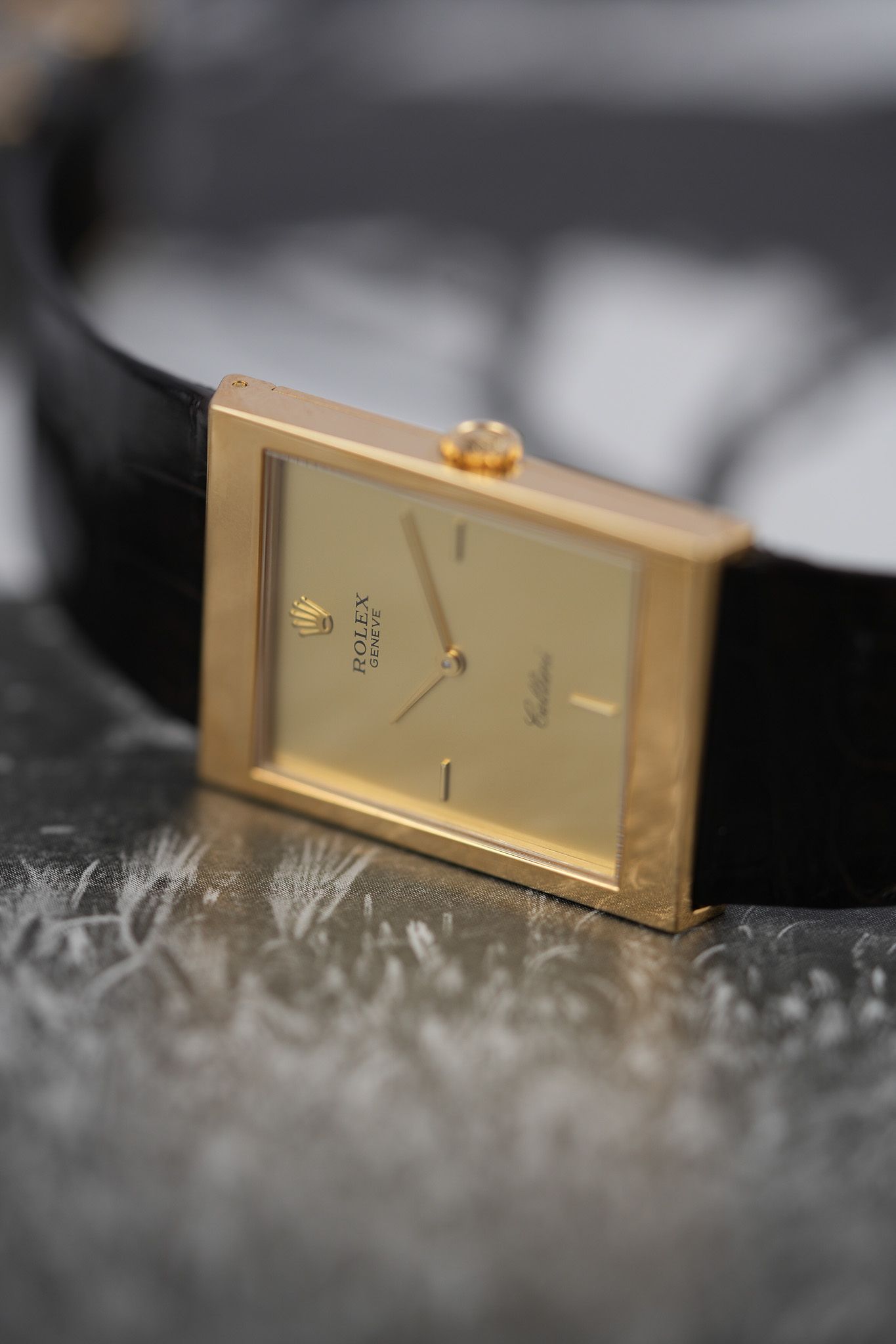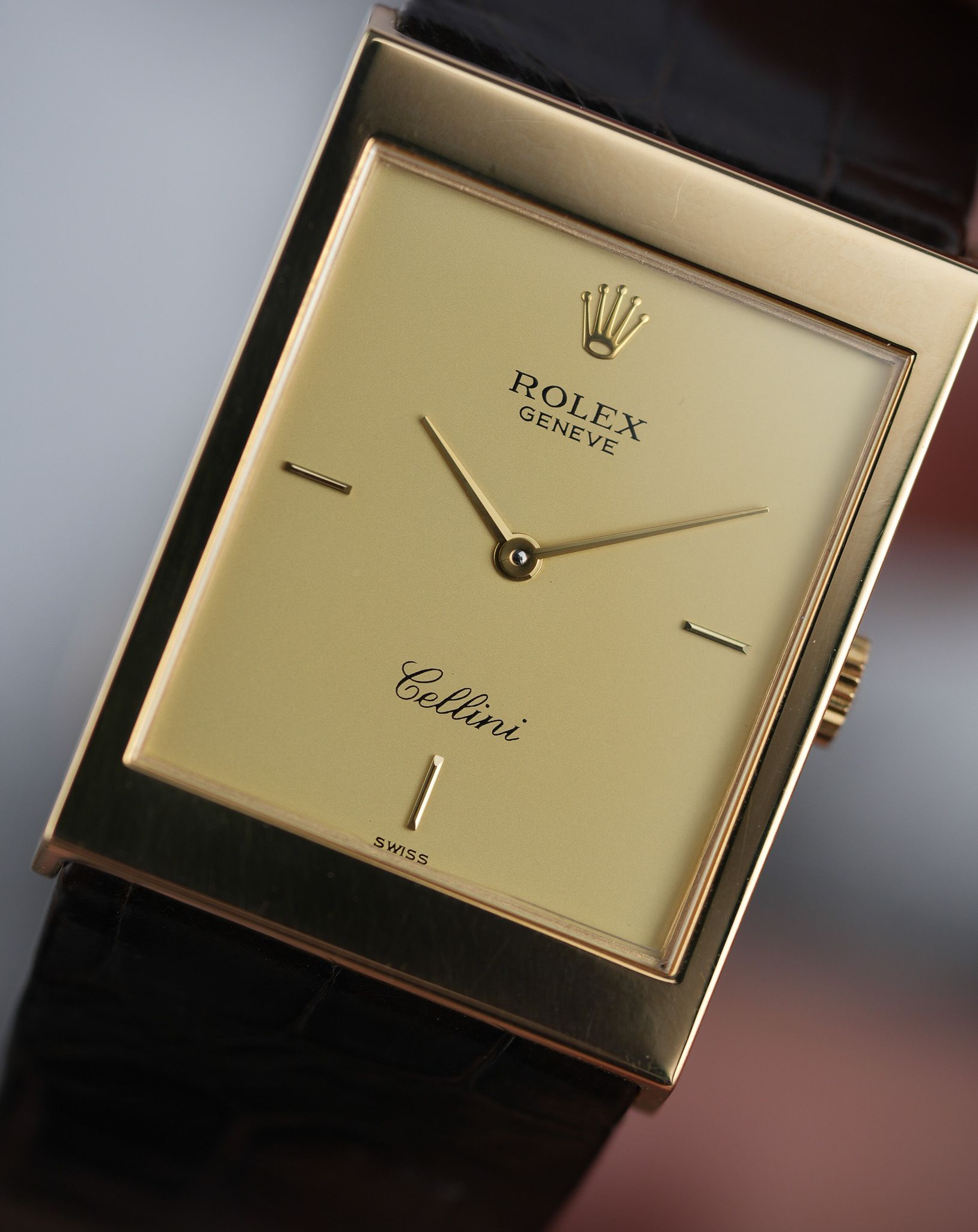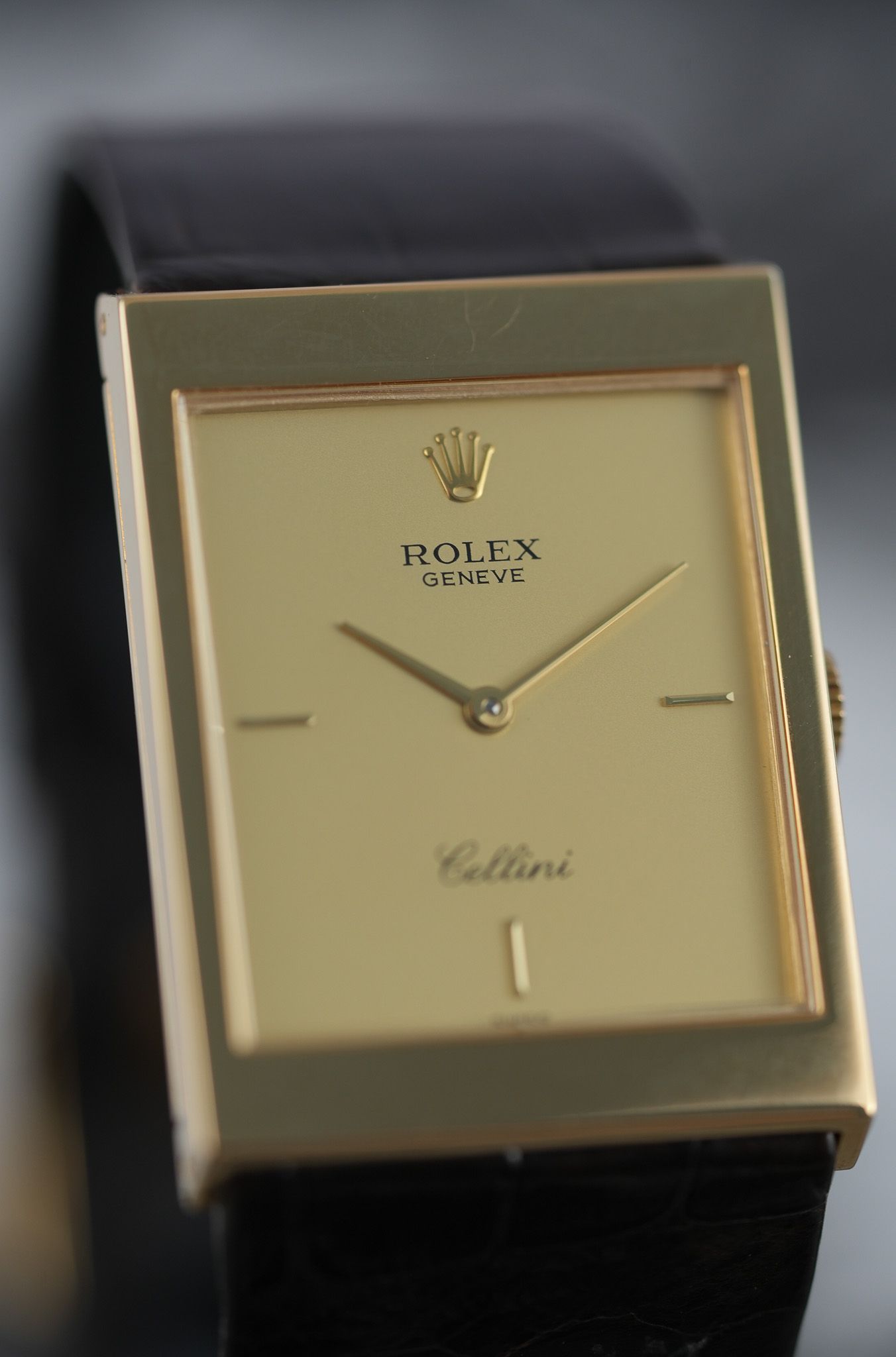 This particular example is what you’d call the purist’s Cellini. A long, rectangular 18k yellow gold case, topped with a gold champagne dial that forgoes numerals entirely. No fuss, no markers—just slender baton hands and the Rolex coronet floating at 12. It’s the horological equivalent of a well-cut suit: nothing extra, everything intentional. The lugs are short and angled downward with just the right amount of taper, keeping the silhouette slim and hugging the wrist with a certain quiet authority.