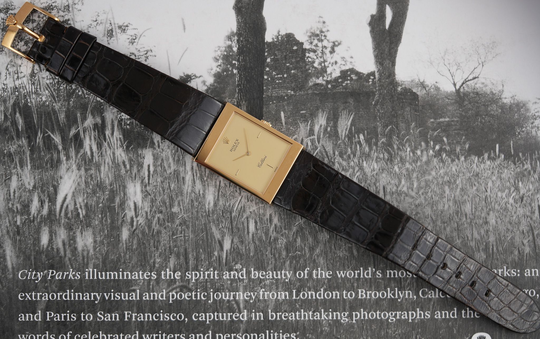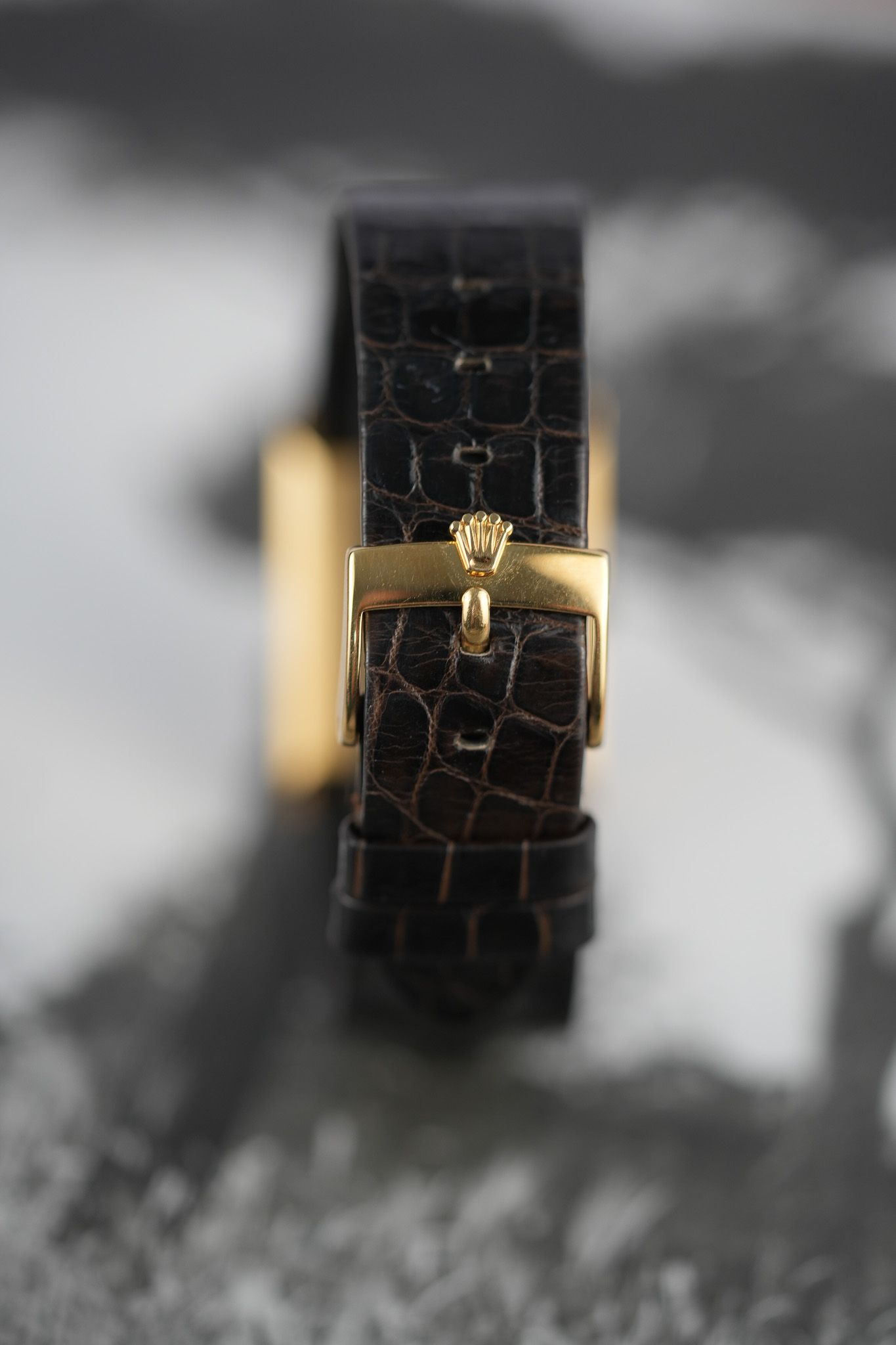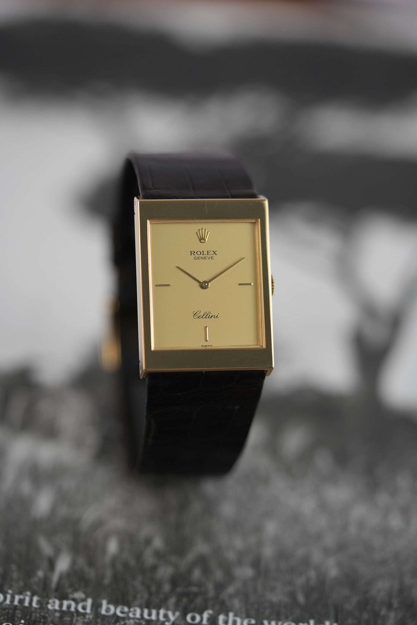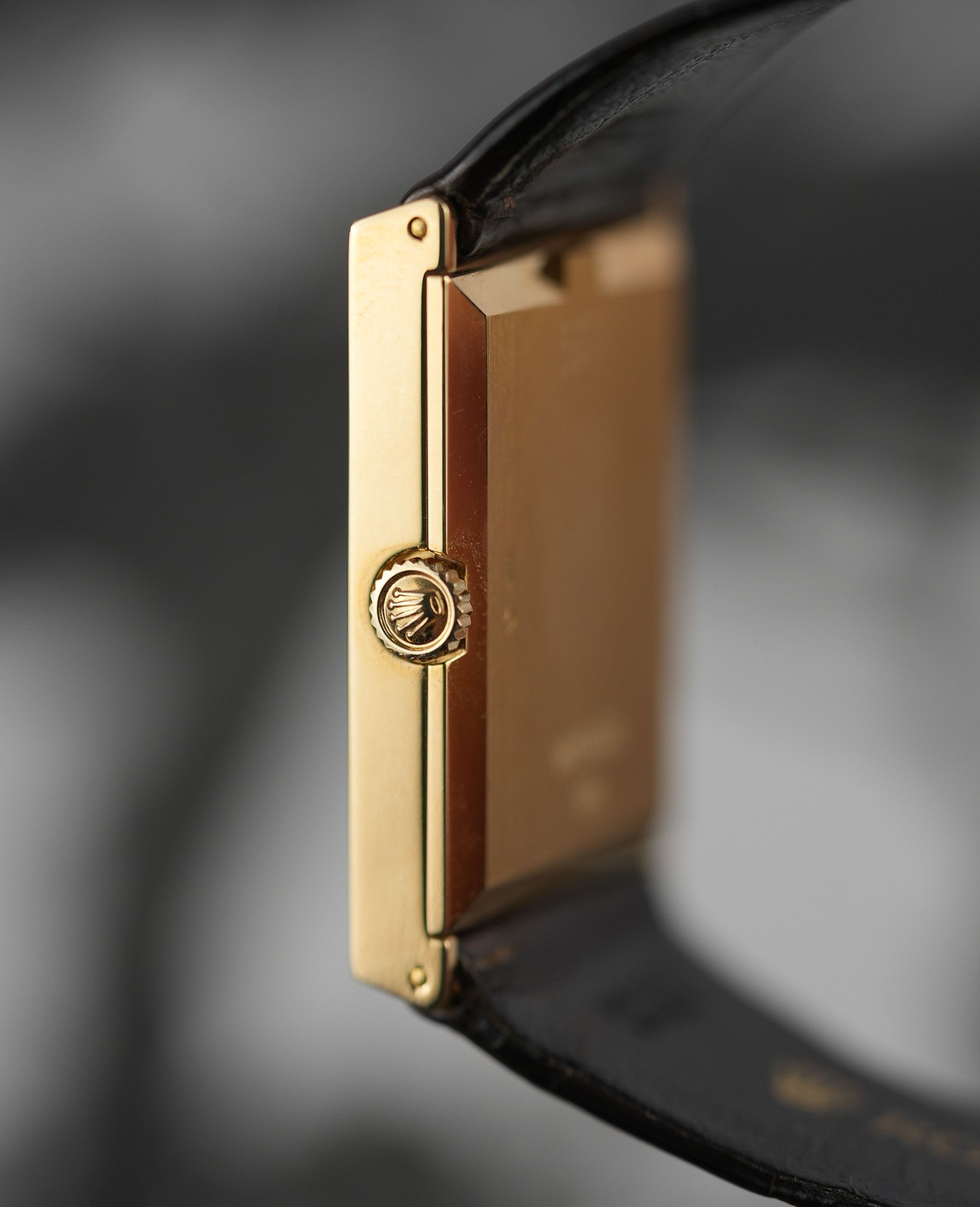 This particular example is what you’d call the purist’s Cellini. A long, rectangular 18k yellow gold case, topped with a gold champagne dial that forgoes numerals entirely. No fuss, no markers—just slender baton hands and the Rolex coronet floating at 12. It’s the horological equivalent of a well-cut suit: nothing extra, everything intentional. The lugs are short and angled downward with just the right amount of taper, keeping the silhouette slim and hugging the wrist with a certain quiet authority.