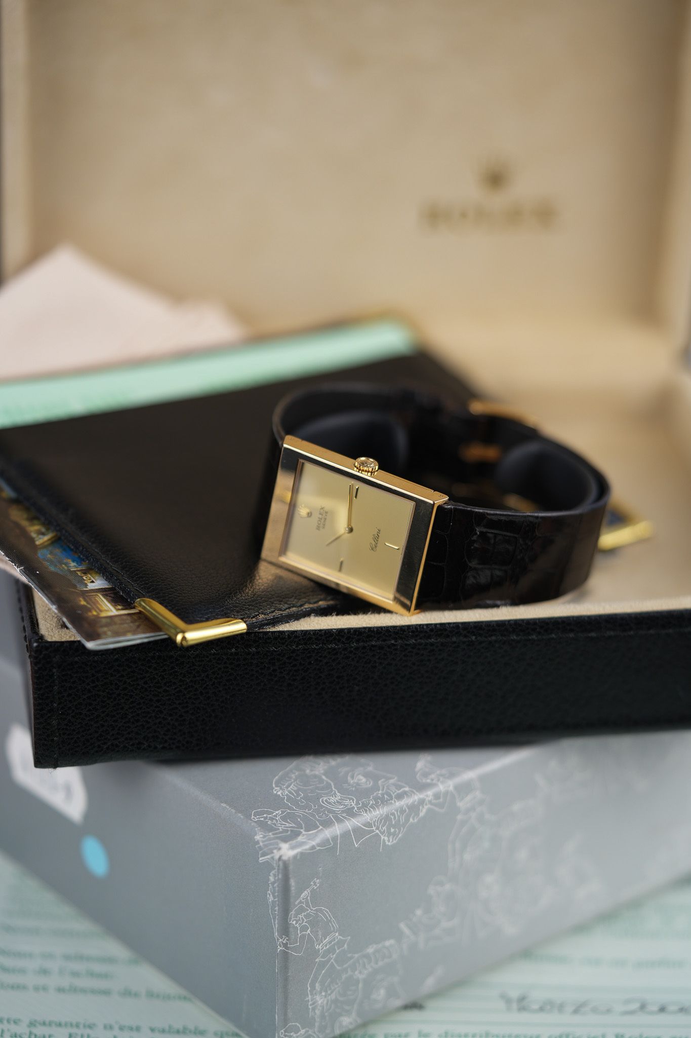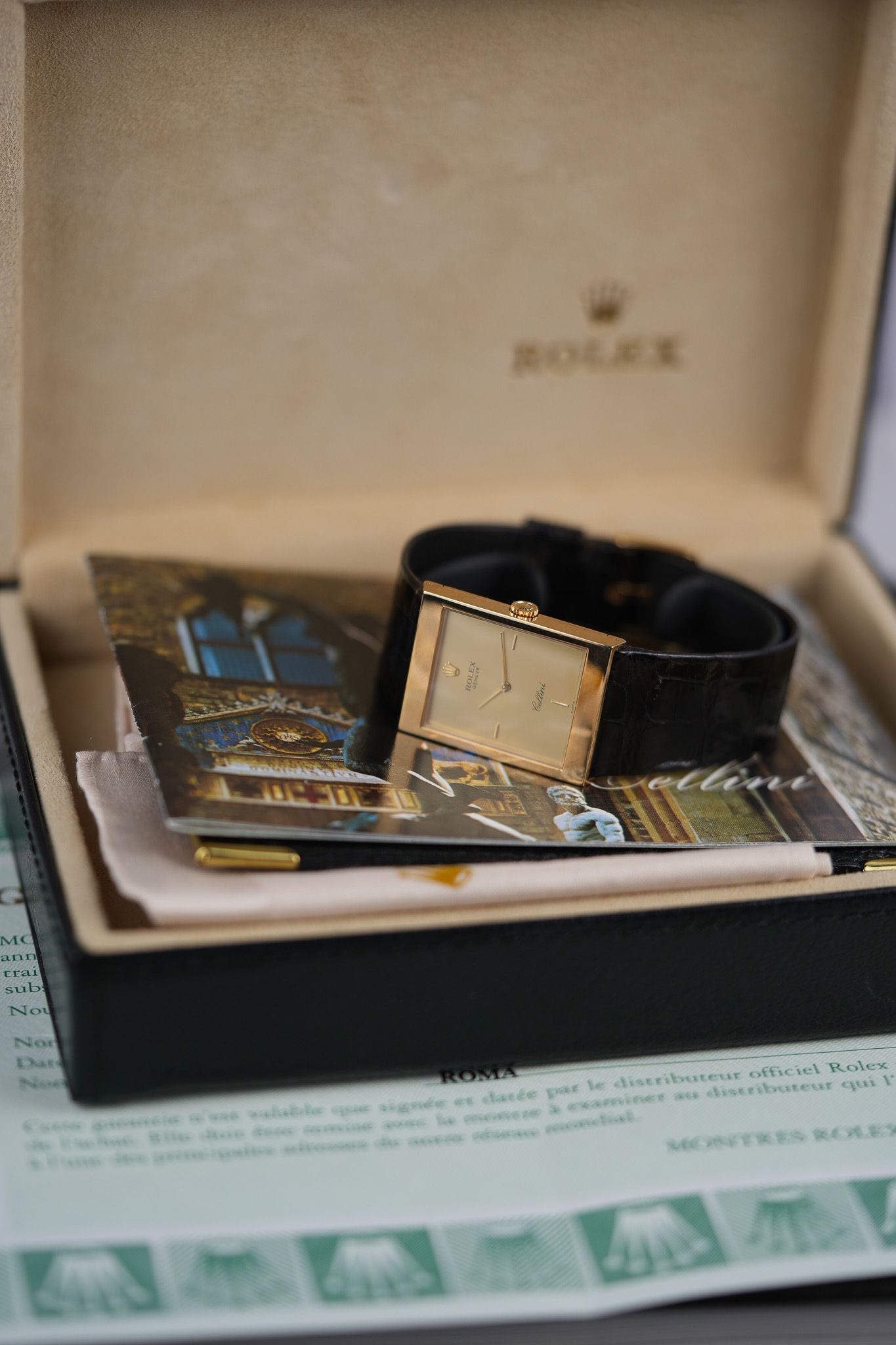 Even more rare is how complete the package is. Outer box, leather presentation box, stamped papers, leather card holder, Cellini brochure, and yes, even the pink polishing cloth. The kind of full set that feels like it was tucked into a drawer for a couple of decades and forgotten—in the best possible way.