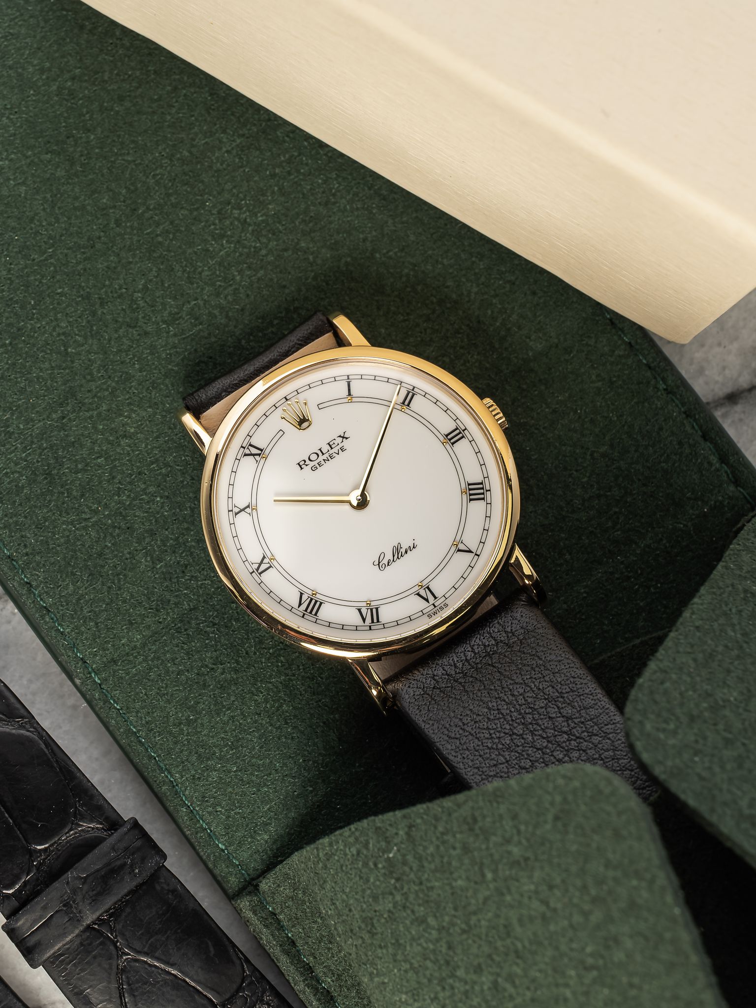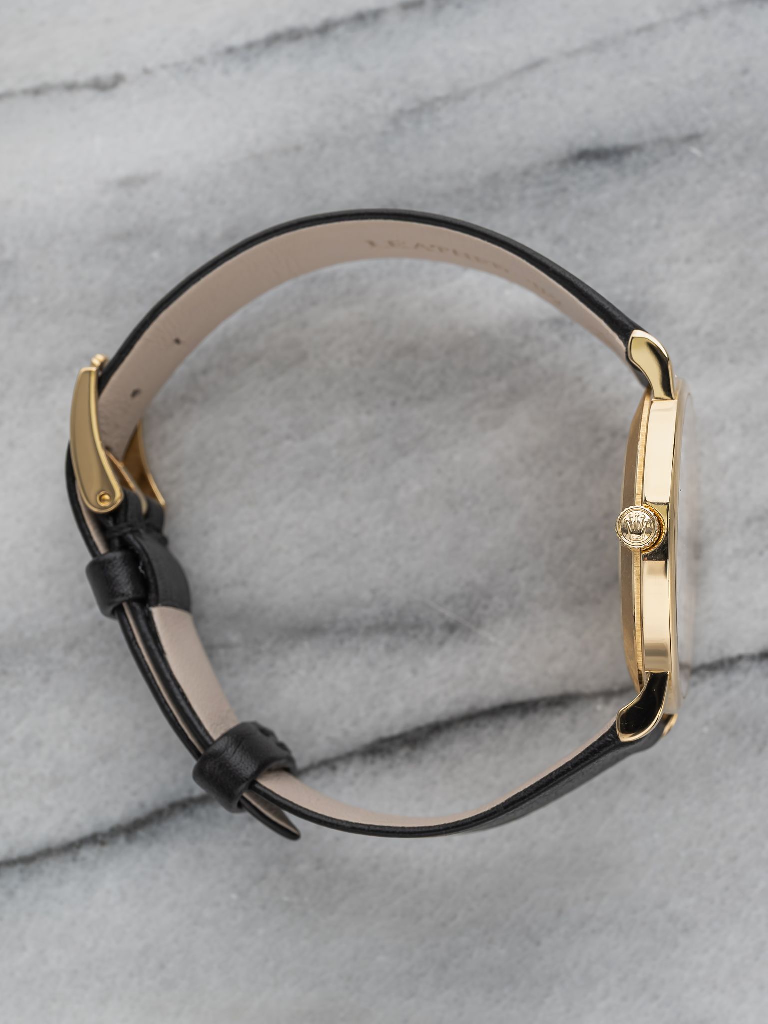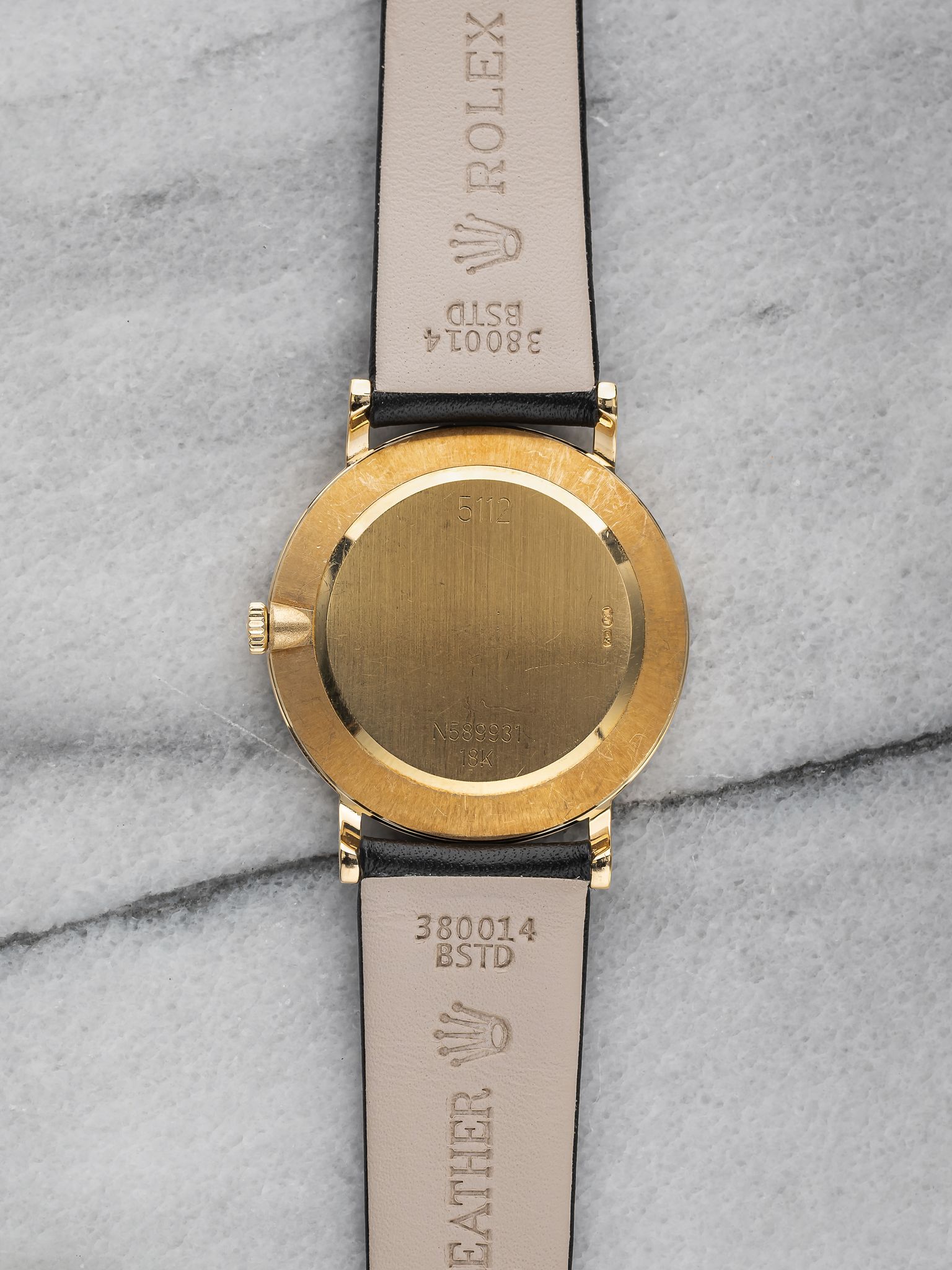 Here's a vintage Rolex Cellini reference 5112 manual wind with a clean white roman numeral dial from 1991 (N serial). Keeps great time and is fully functional. Measurements include a 34mm case and 18mm lug width. It's on a Rolex service black leather strap and gold buckle. Time only. 18K yellow gold case and caseback. Comes with its service box, card, and original black leather strap. Both the dial and crystal are free from any scratches or marks. All parts are original, including the signed Rolex crown, dial, movement, and caseback. Both the dial and case are in great cosmetic, untouched condition.