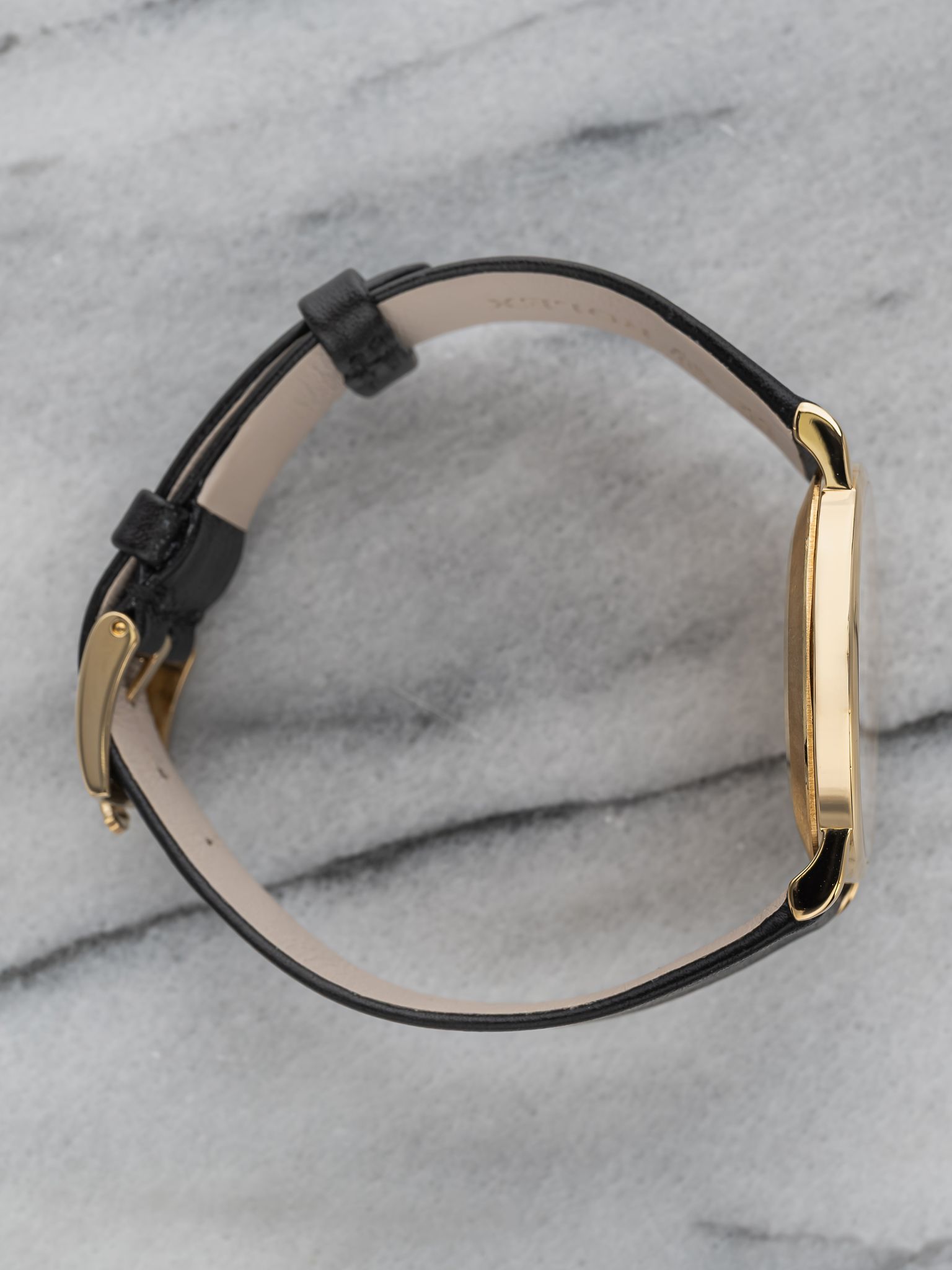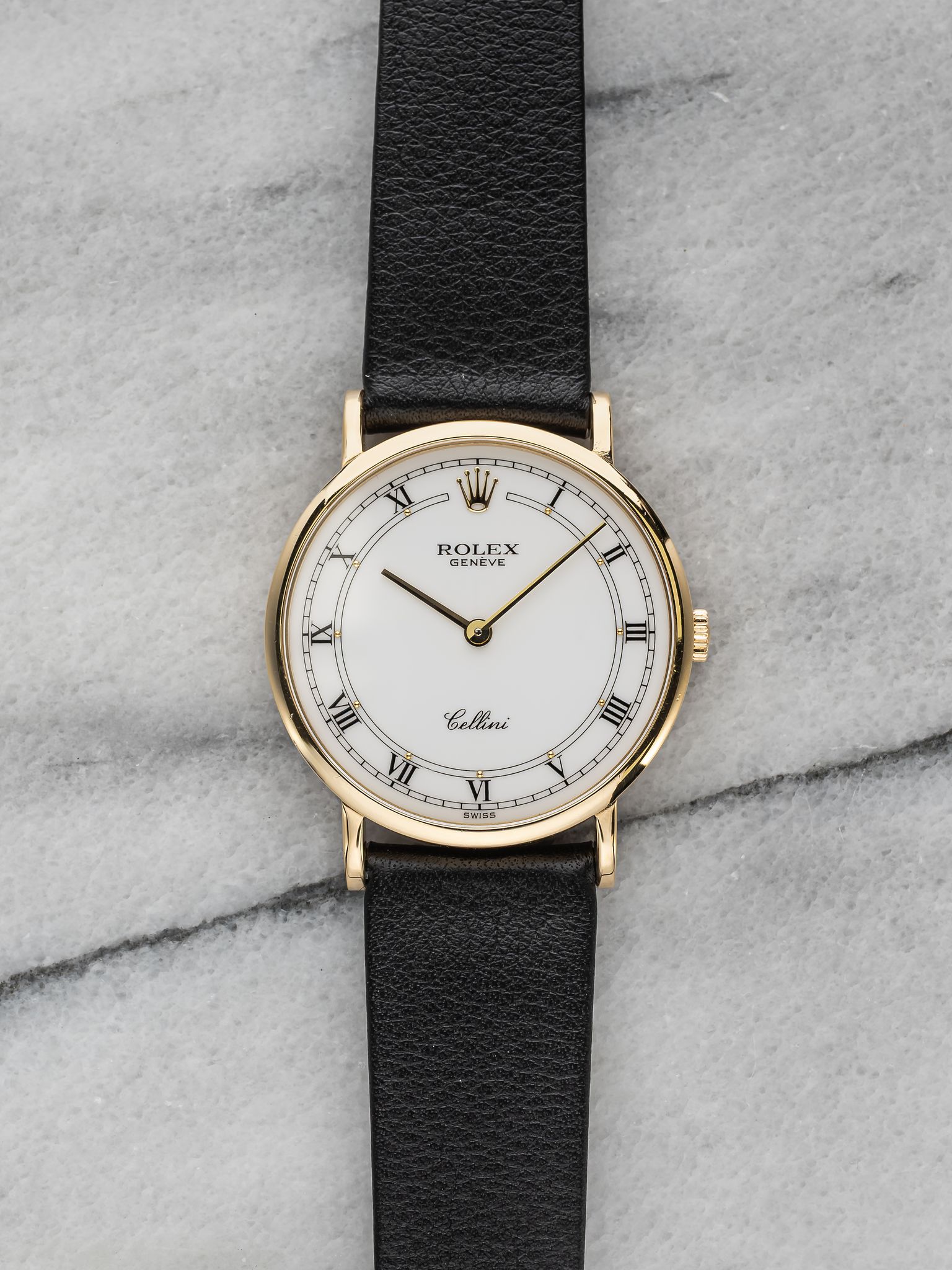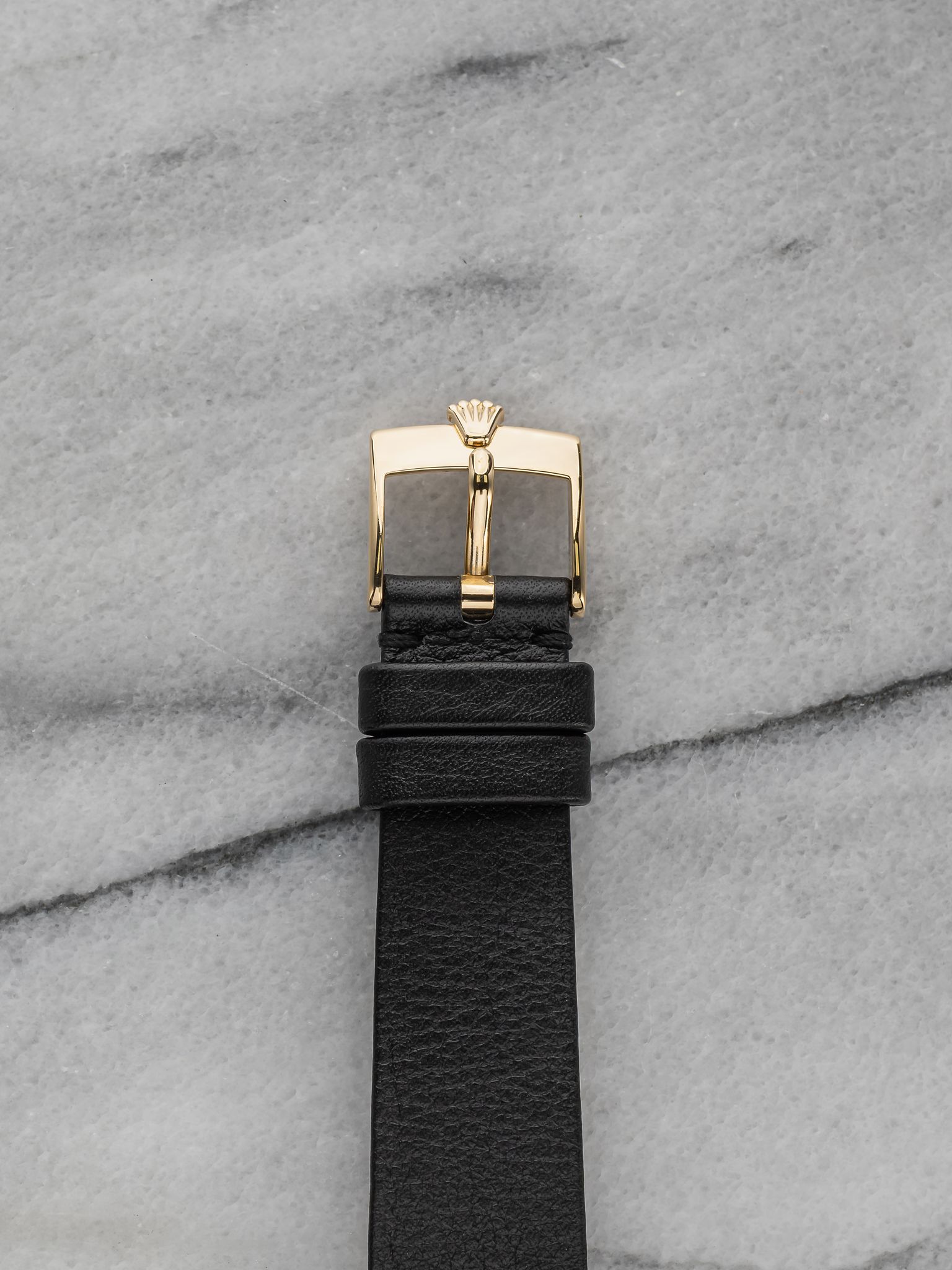 Here's a vintage Rolex Cellini reference 5112 manual wind with a clean white roman numeral dial from 1991 (N serial). Keeps great time and is fully functional. Measurements include a 34mm case and 18mm lug width. It's on a Rolex service black leather strap and gold buckle. Time only. 18K yellow gold case and caseback. Comes with its service box, card, and original black leather strap. Both the dial and crystal are free from any scratches or marks. All parts are original, including the signed Rolex crown, dial, movement, and caseback. Both the dial and case are in great cosmetic, untouched condition.