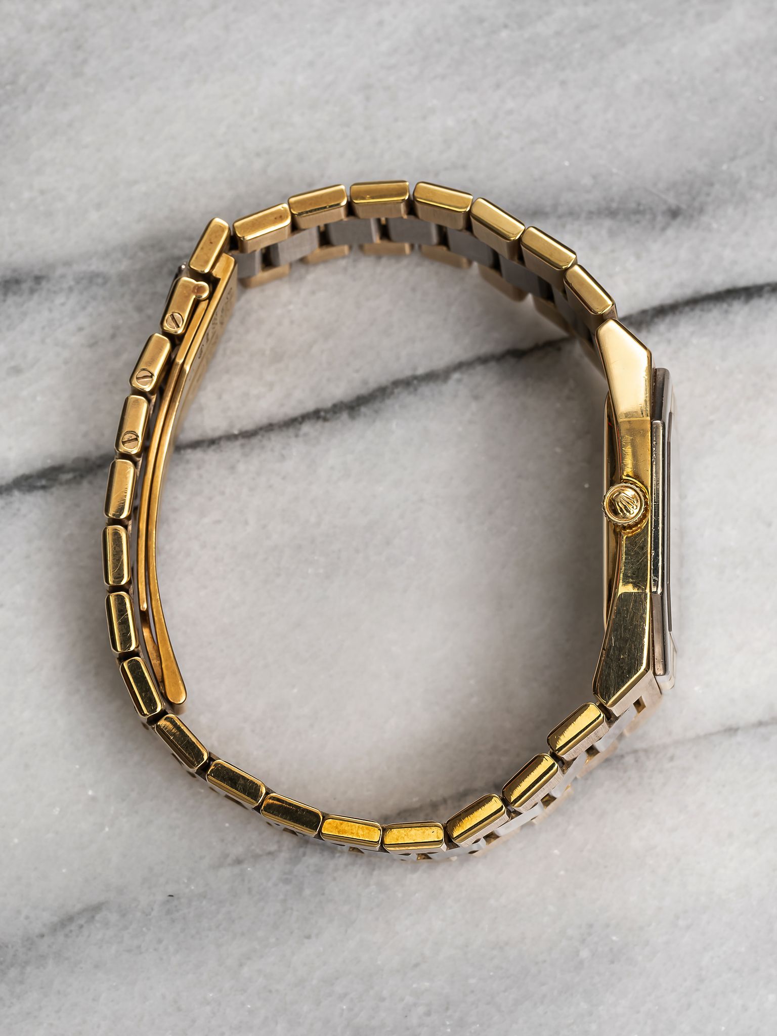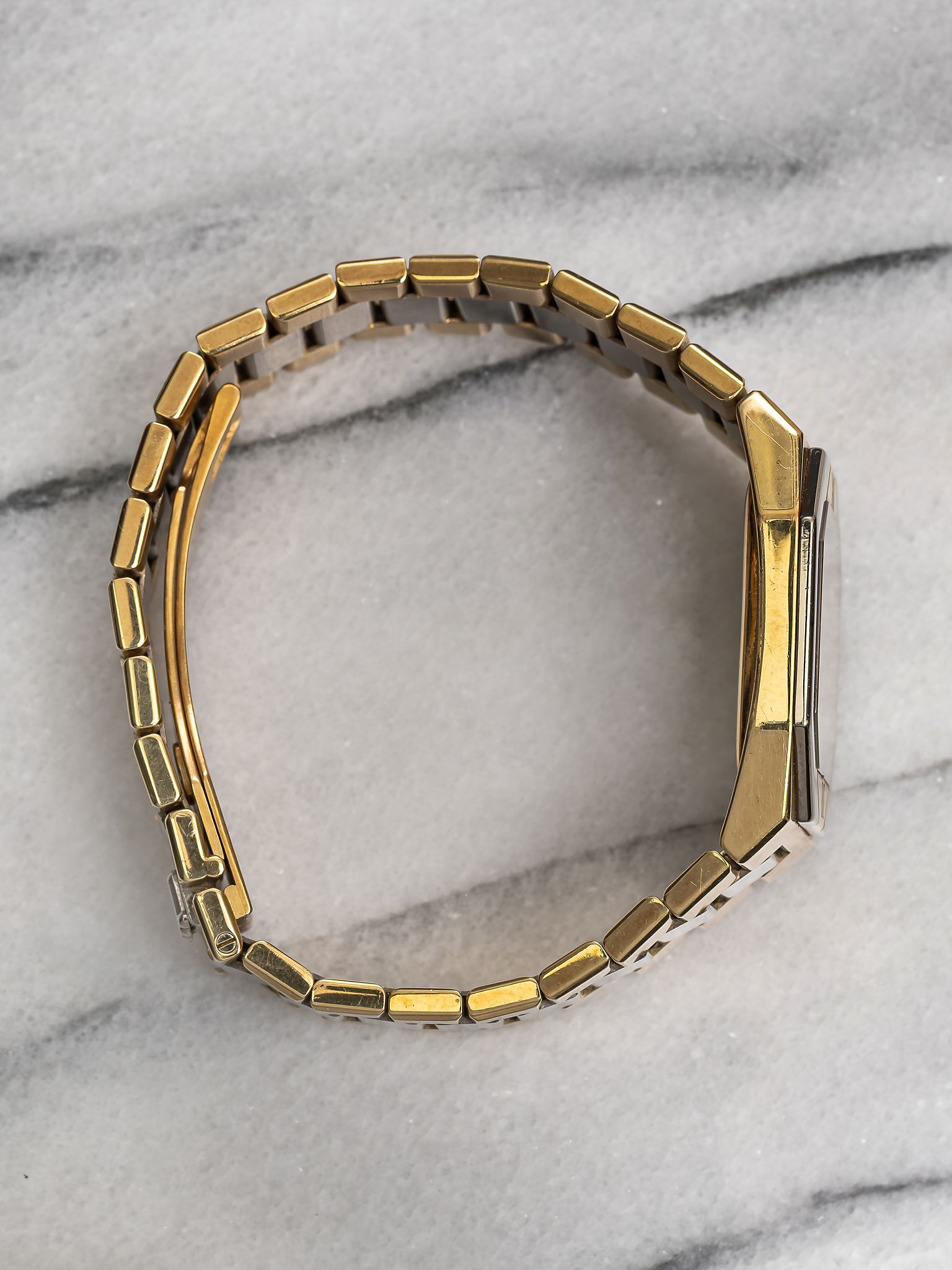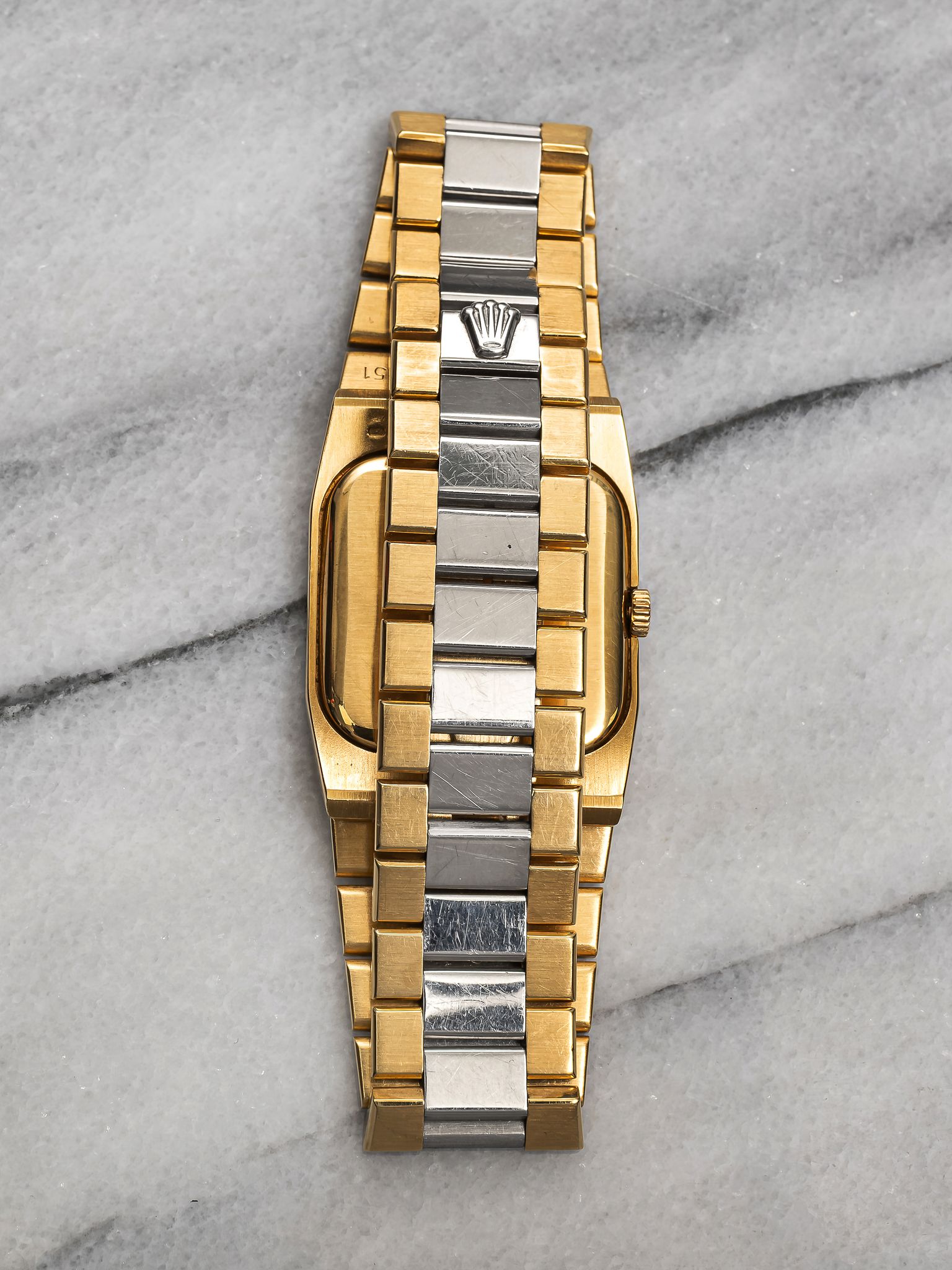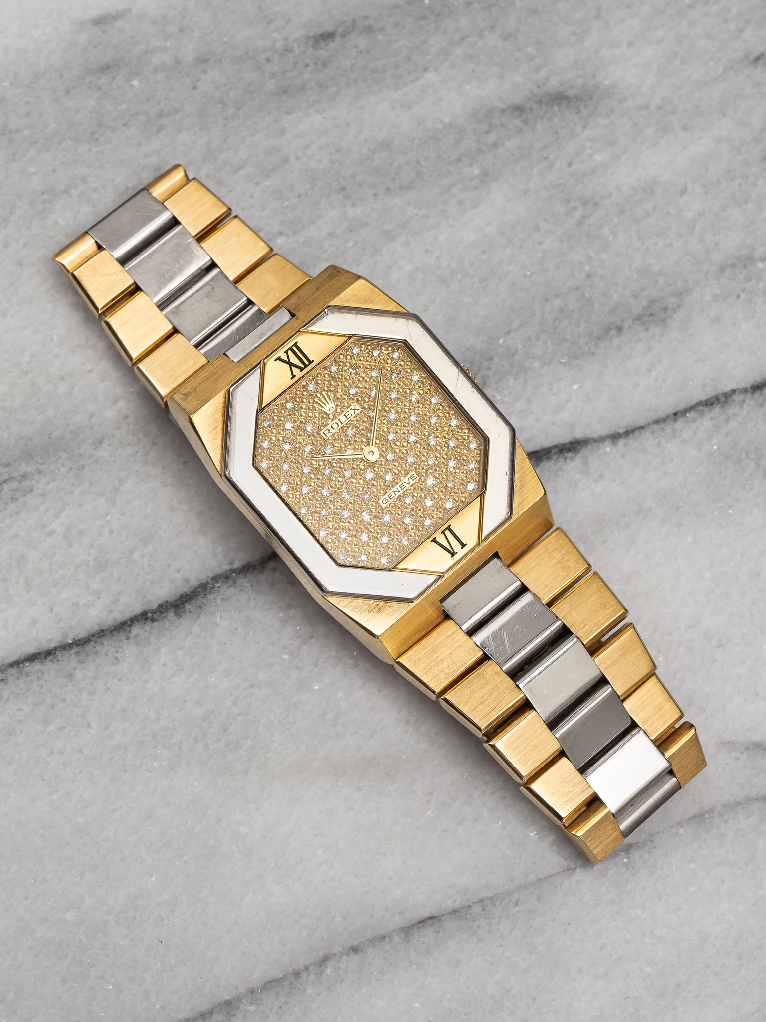 Here's a vintage Rolex Cellini reference 5151 two tone manual wind with a diamond pave dial in an 18K yellow gold from the 1980s. Measuremnts include a 28mm case and an integrated bracelet that fits up toa 6.75 inch wrist. White gold in the center links and yellow gold on the outside. A unique Cellini, we havent seen another. All parts including the crown, dial, movement, and caseback are original.