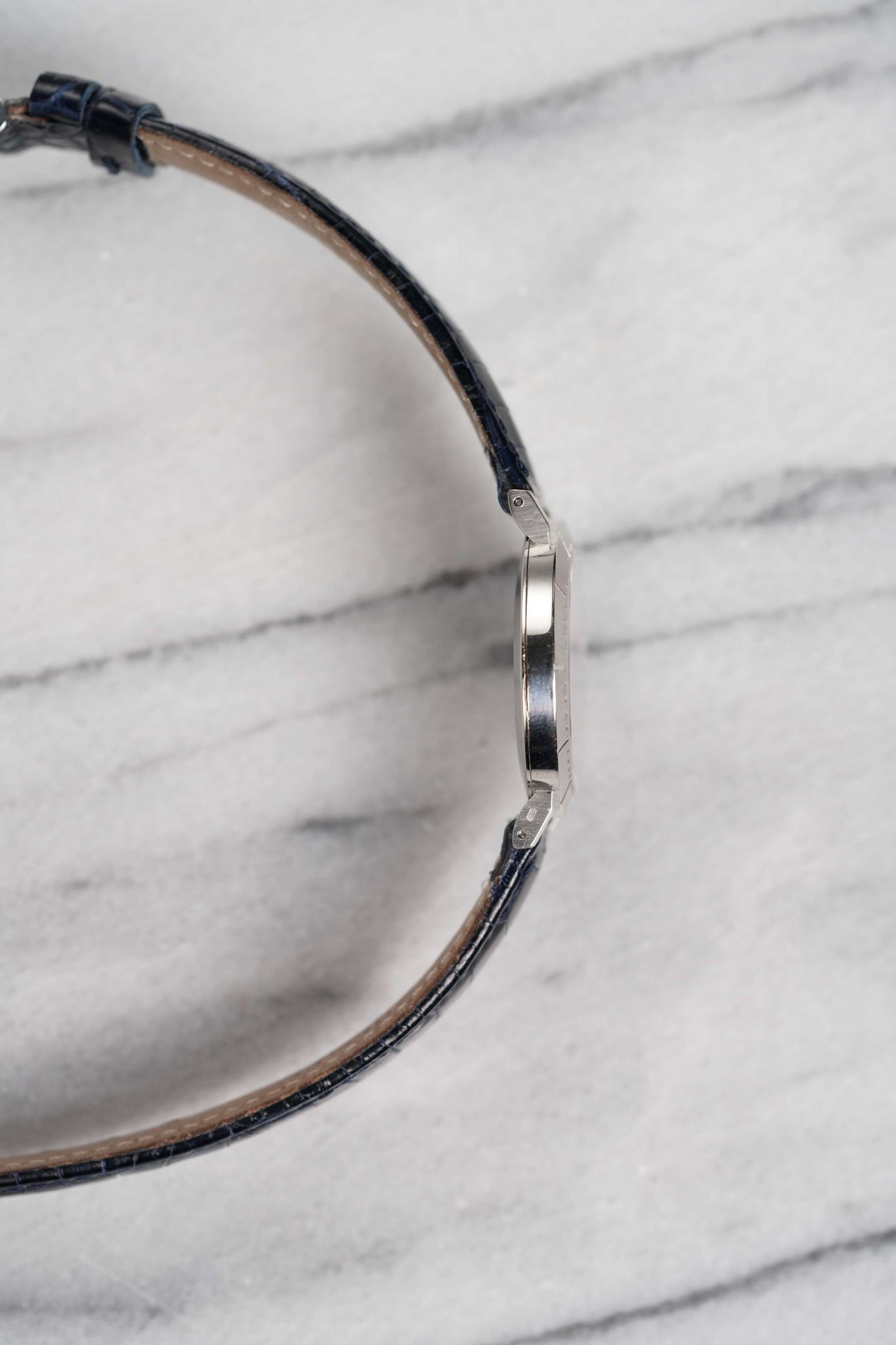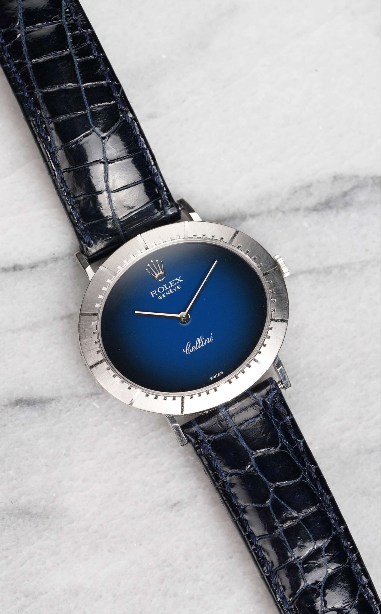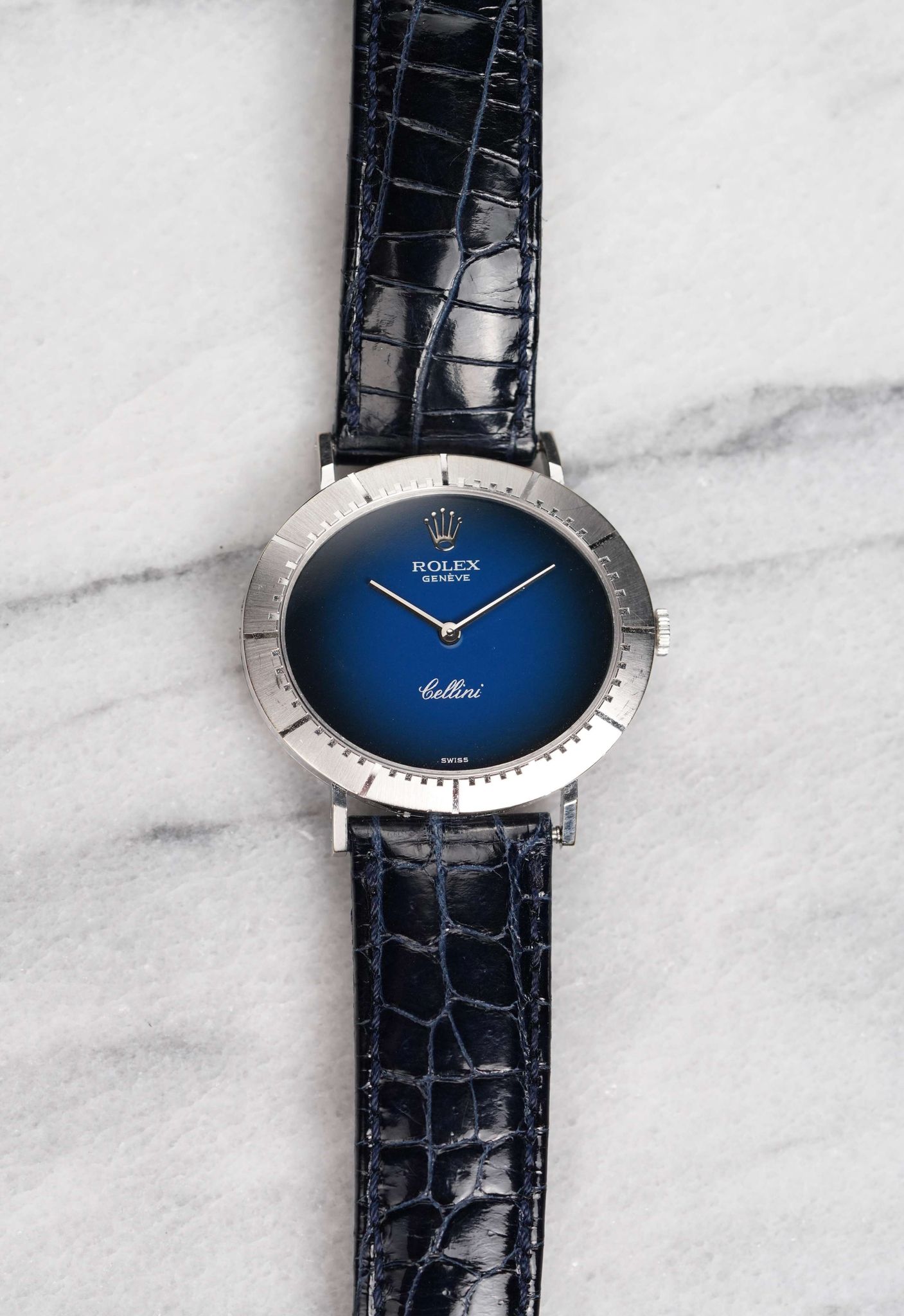 Here's a vintage Rolex Cellini manual wind in 18K white gold with a blue vignette dial from the 70s. Keeps great time and is fully functional. Measurements include a 32mm case size and 18mm lug width. On a glossy black leather strap with a matching Rolex buckle. ime only. Matching stick hands and hour markers. Dial is in great condition for it age. Unpolished case and bezel. The piece makes for a great dress watch for both men and women as its on the smaller side. All parts are original including the crown, dial, movement, and caseback. Both the dial and case are in great cosmetic, untouched condition.