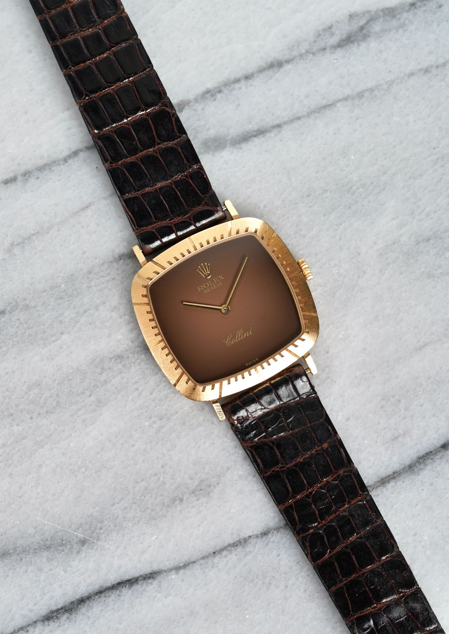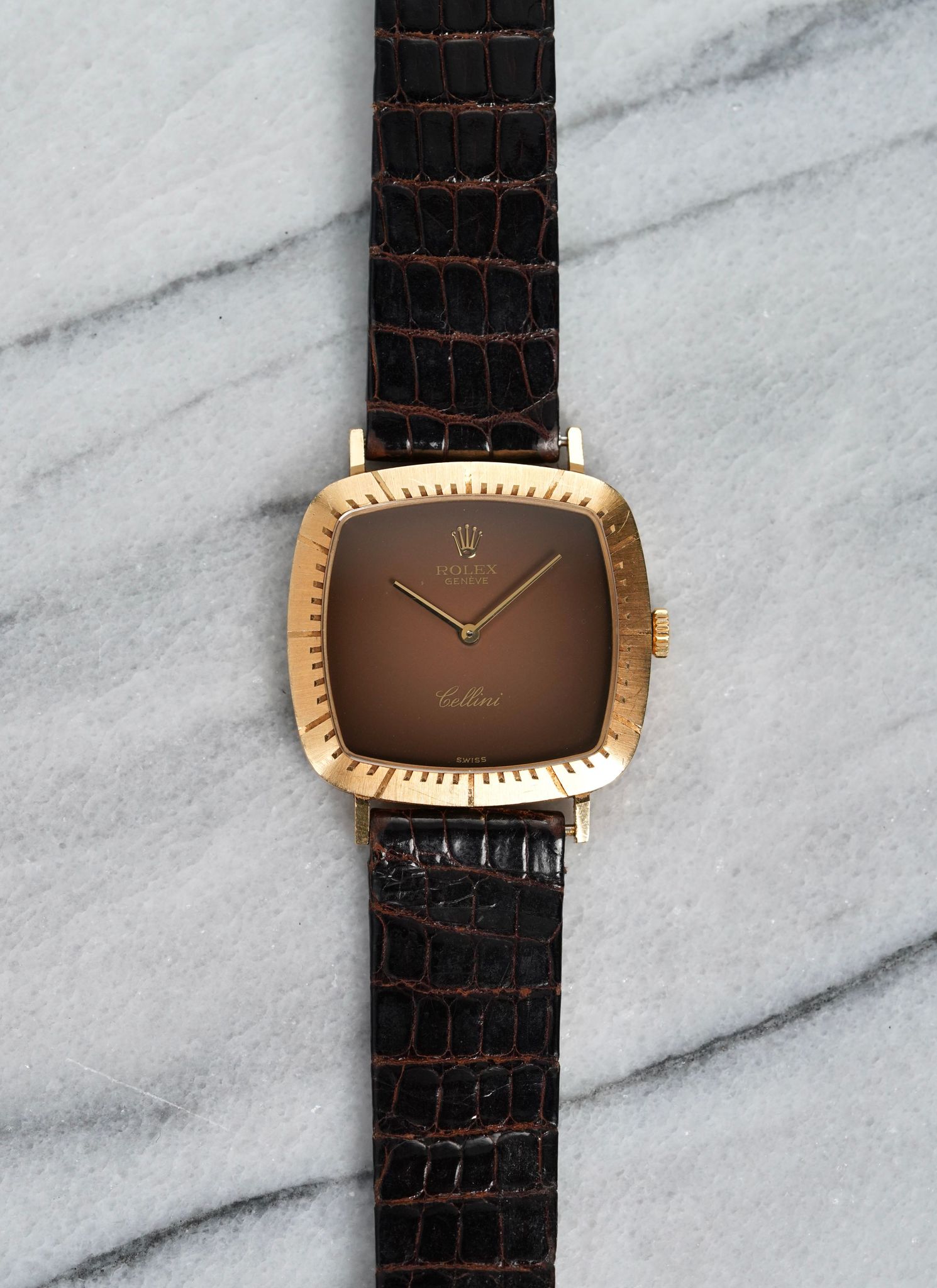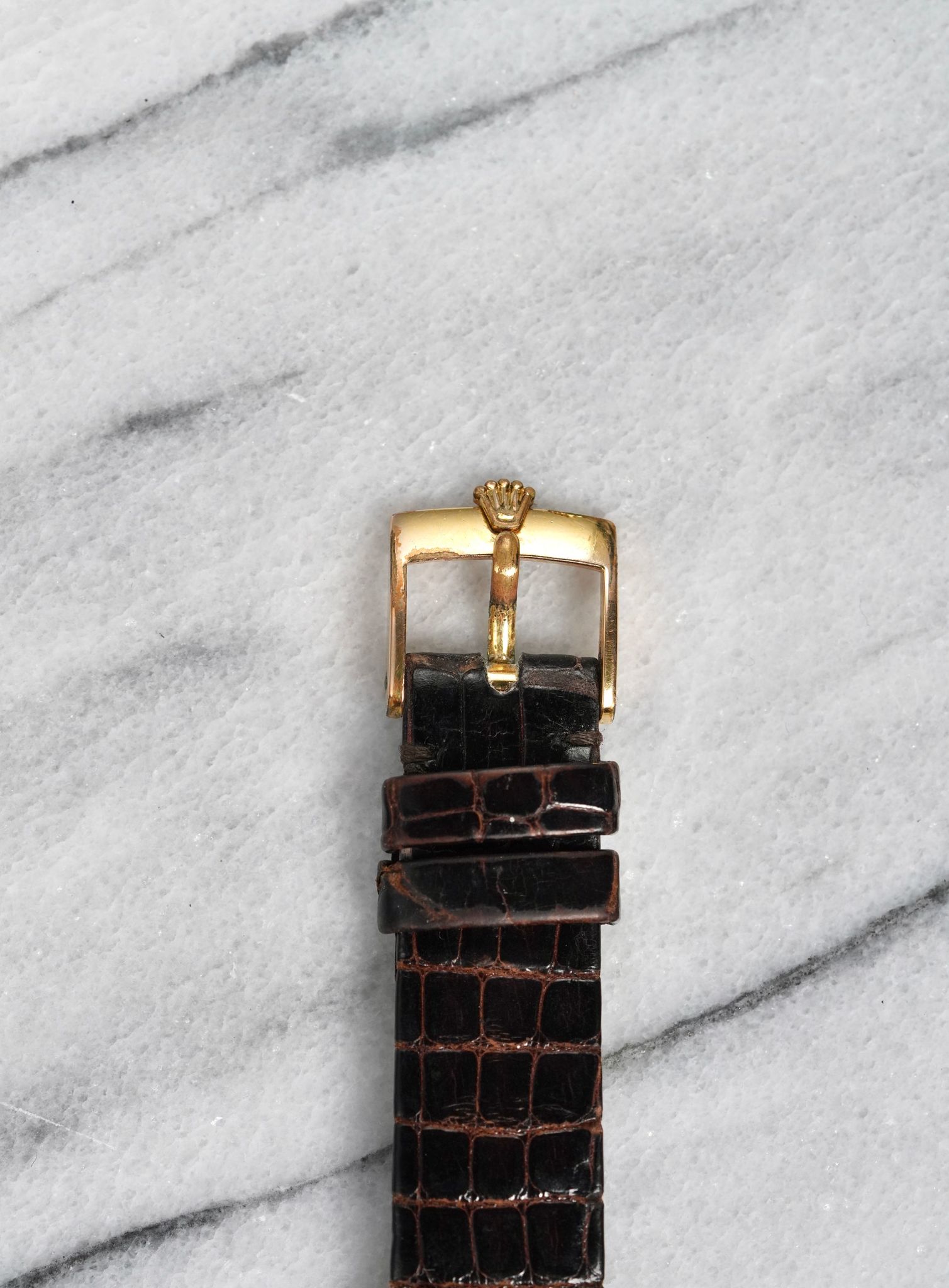 Here's a vintage Rolex Cellini reference 4084 manual wind with an original brown vignette dial in 18K yellow gold from the 70s. Keeps great time and is fully functional. Measurements include a 30mm tank case and 17mm lug width. On its original brown lizard leather strap and signed gold buckle. The bezel has its own minute track. Caliber 1600. Stick hands. Drilled lug holes. 18k yellow gold case and caseback. All other parts are original including the signed caseback, dial, and movement. Both the dial and case are in great cosmetic, untouched condition.