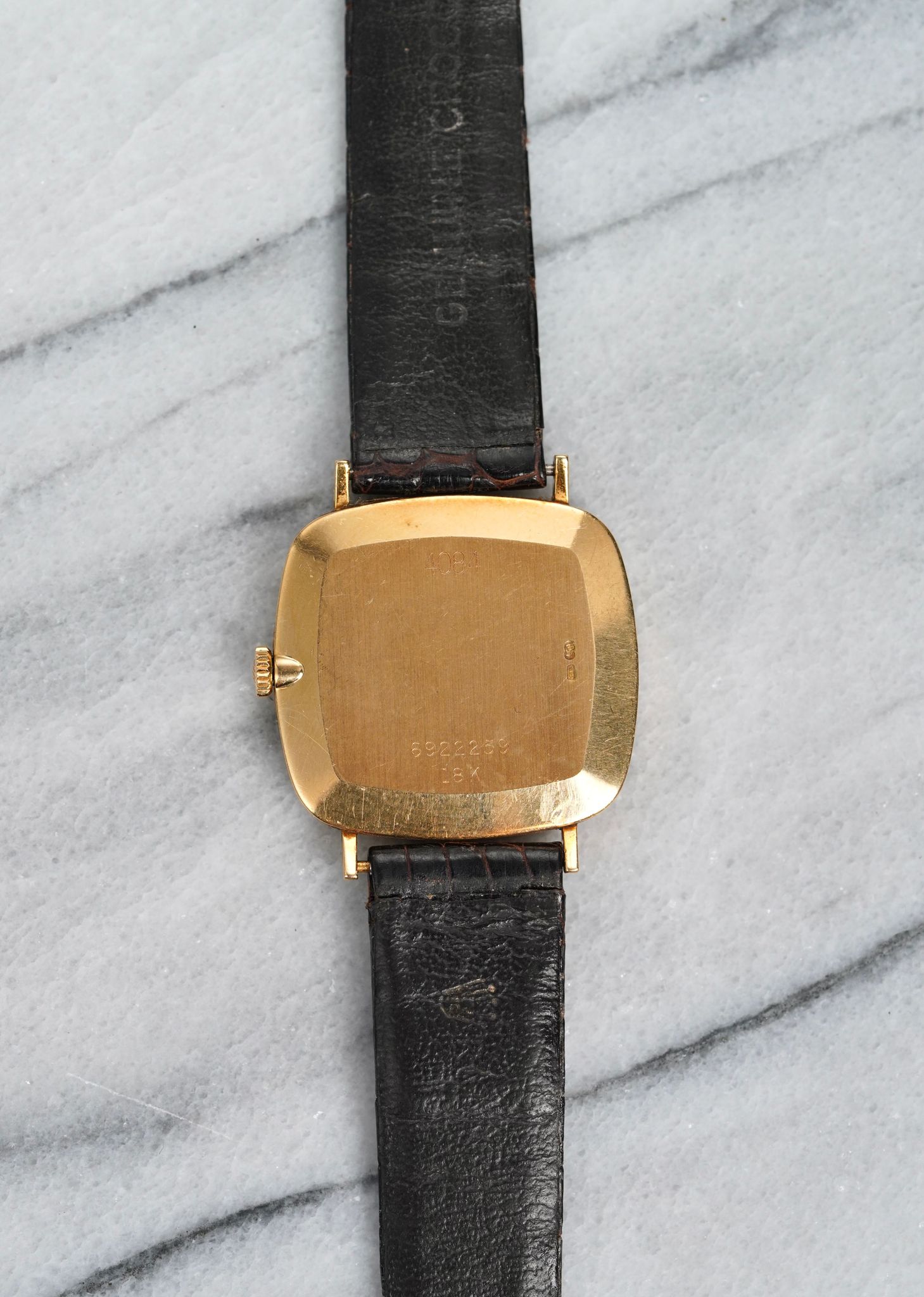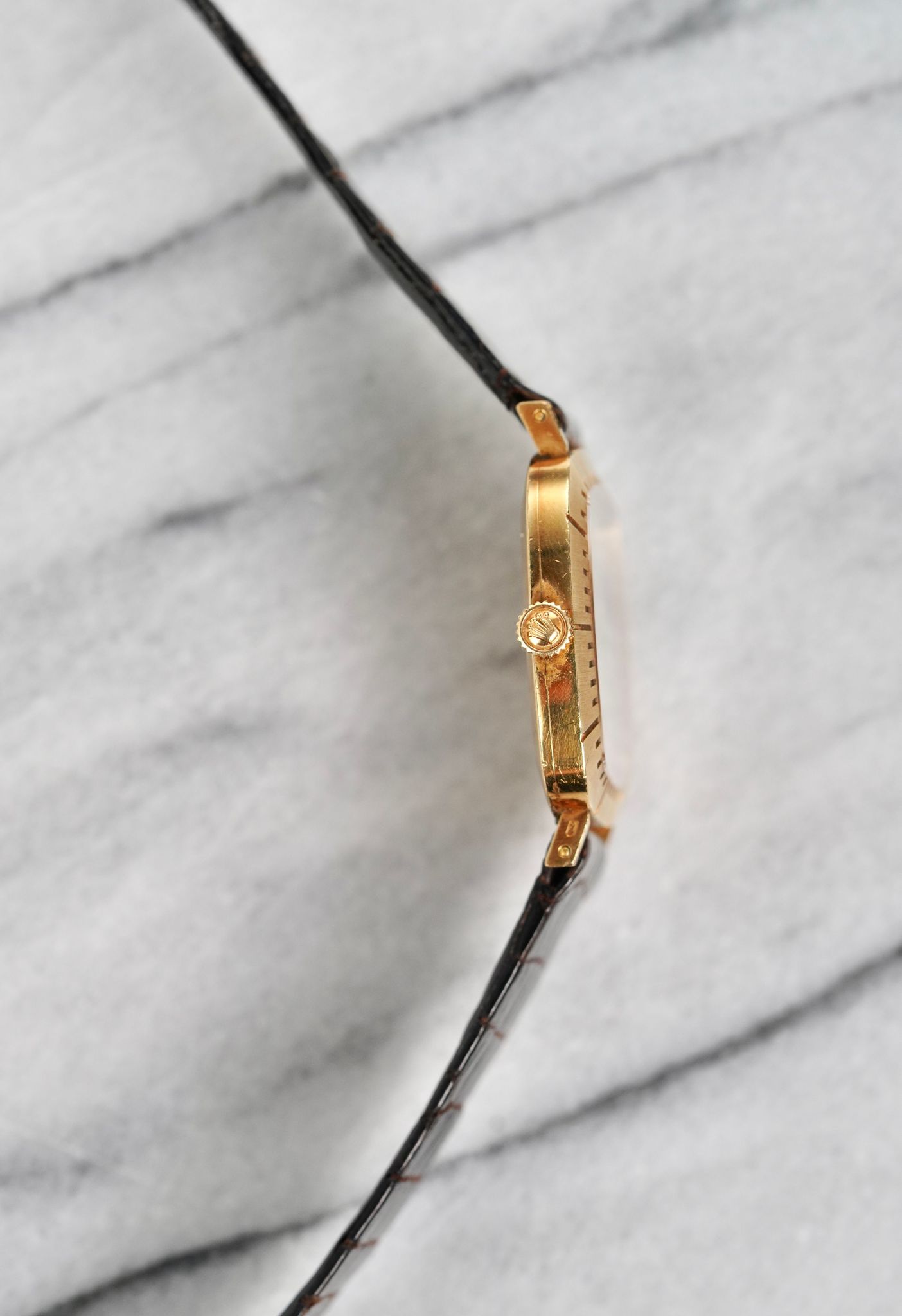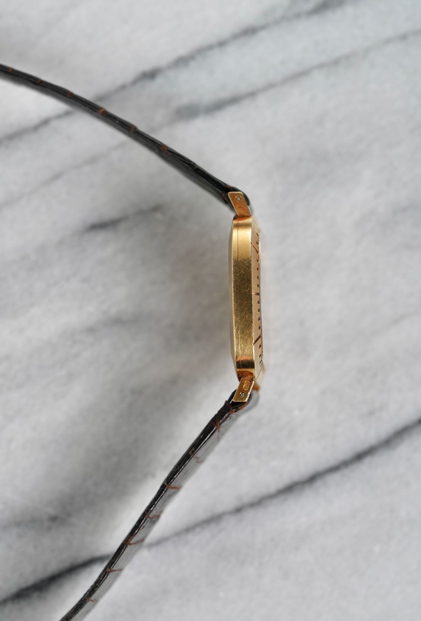 Here's a vintage Rolex Cellini reference 4084 manual wind with an original brown vignette dial in 18K yellow gold from the 70s. Keeps great time and is fully functional. Measurements include a 30mm tank case and 17mm lug width. On its original brown lizard leather strap and signed gold buckle. The bezel has its own minute track. Caliber 1600. Stick hands. Drilled lug holes. 18k yellow gold case and caseback. All other parts are original including the signed caseback, dial, and movement. Both the dial and case are in great cosmetic, untouched condition.