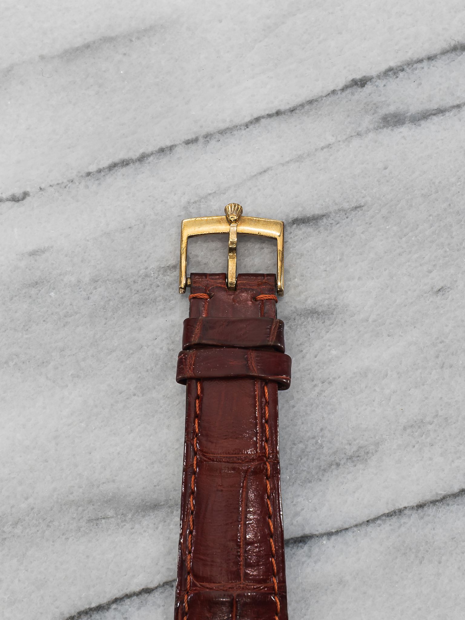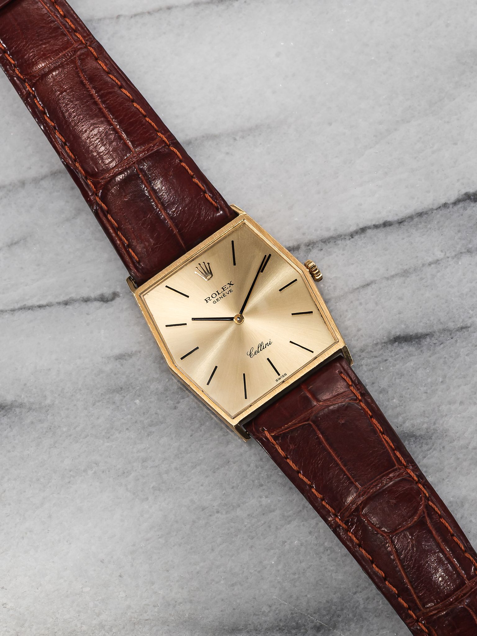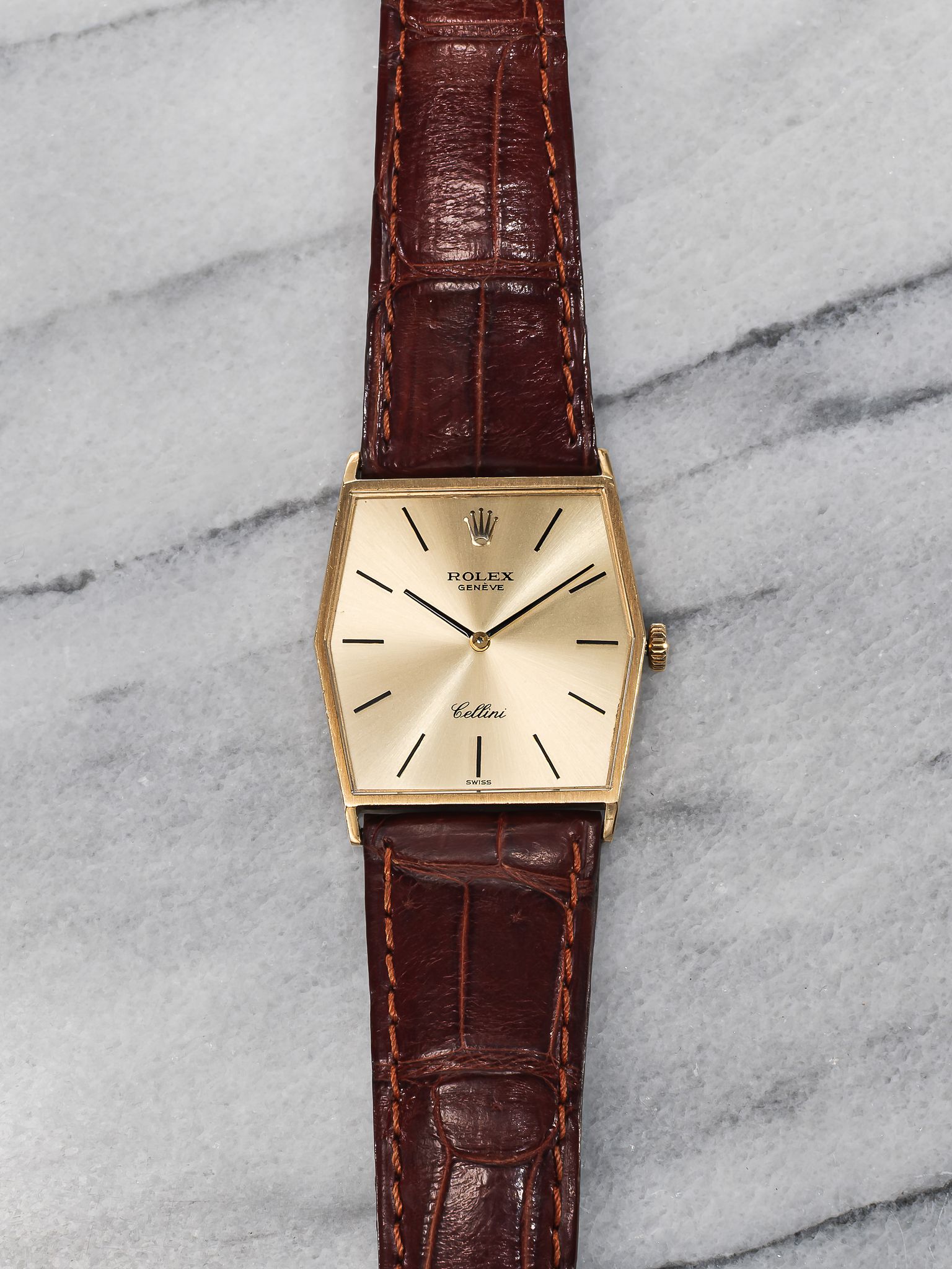 Here's a vintage Rolex Cellini in 18k yellow gold manual wind with a champagne dial from the 1980s. On its original brown alligator leather strap and signed buckle. Matchingblack stick hands and hour markers. Wears quite well with its hexagonal case, quite large. All parts including the crown, dial, movement, and caseback are original.