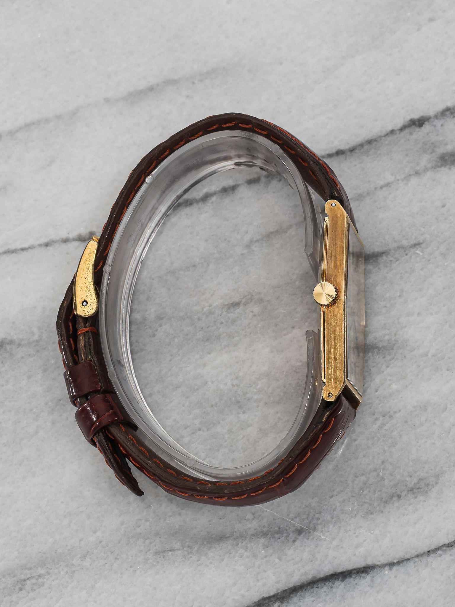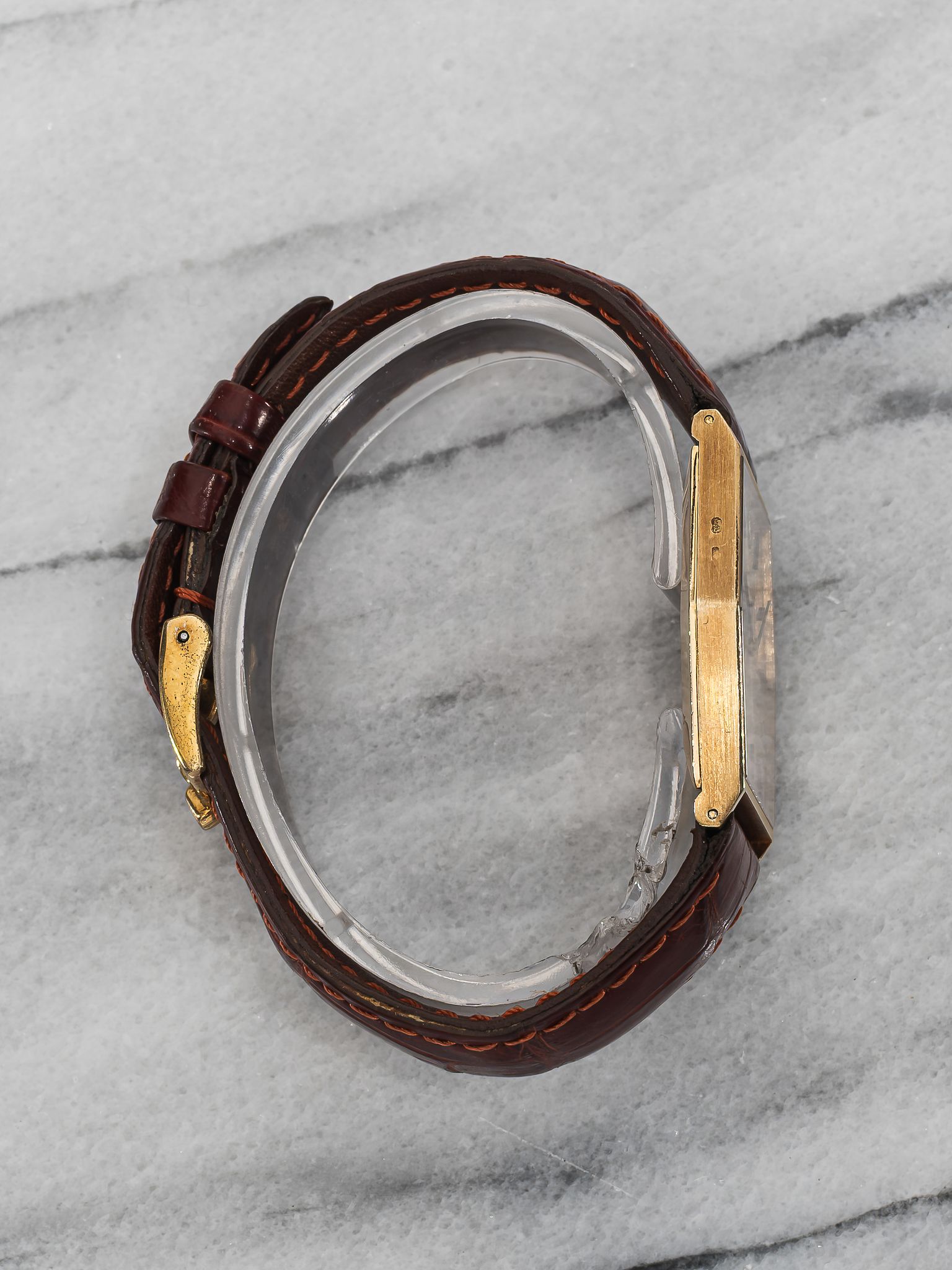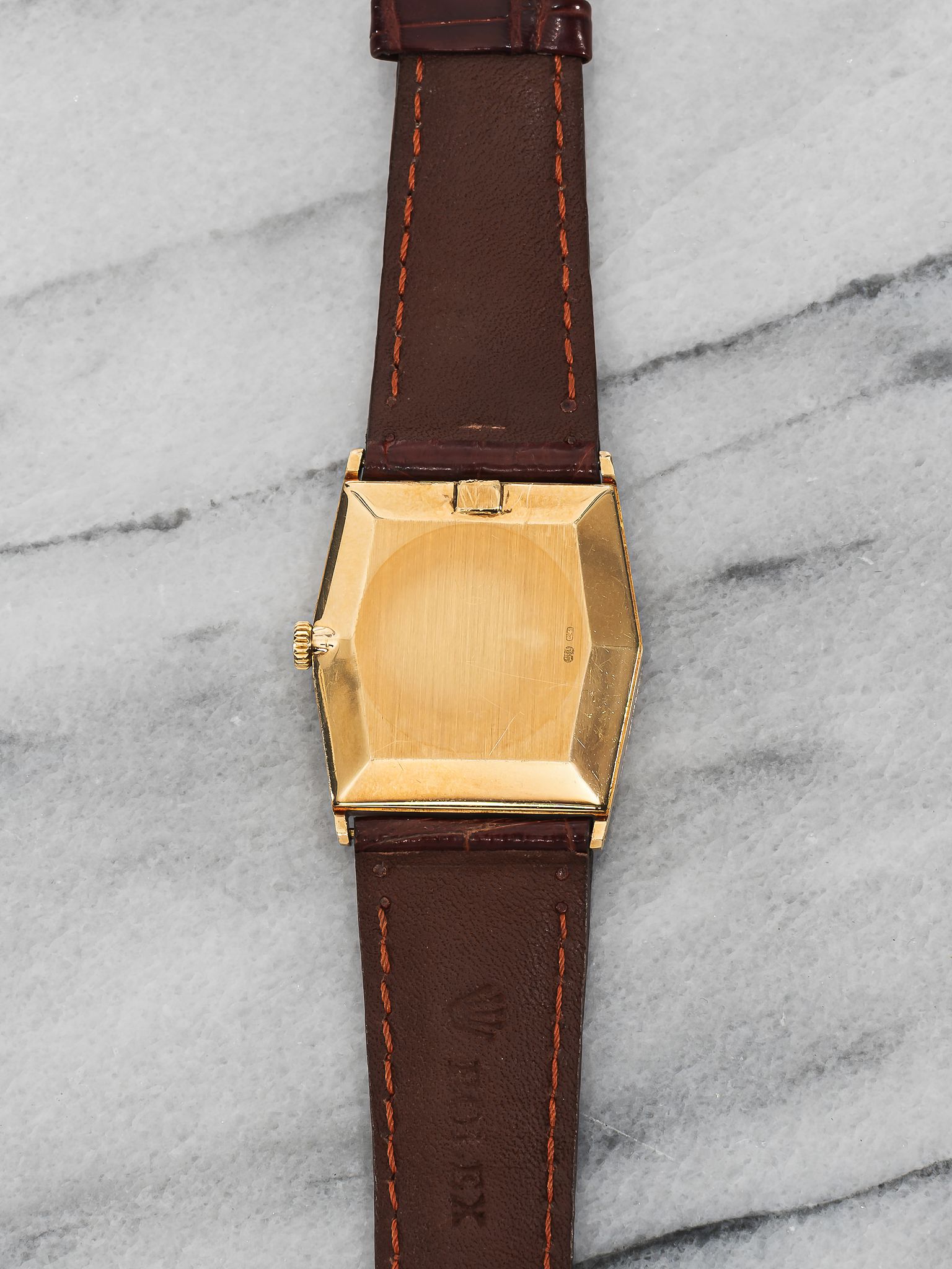 Here's a vintage Rolex Cellini in 18k yellow gold manual wind with a champagne dial from the 1980s. On its original brown alligator leather strap and signed buckle. Matchingblack stick hands and hour markers. Wears quite well with its hexagonal case, quite large. All parts including the crown, dial, movement, and caseback are original.