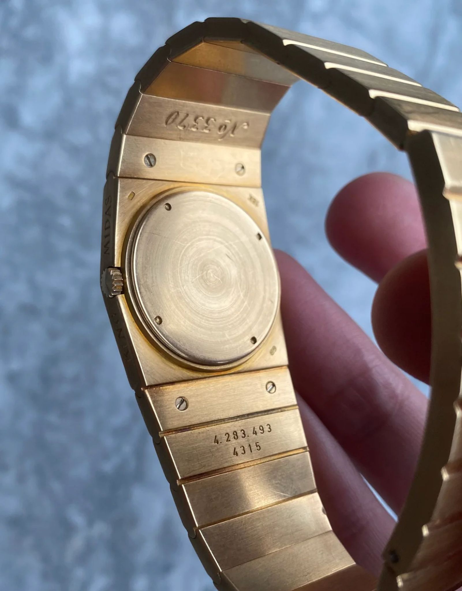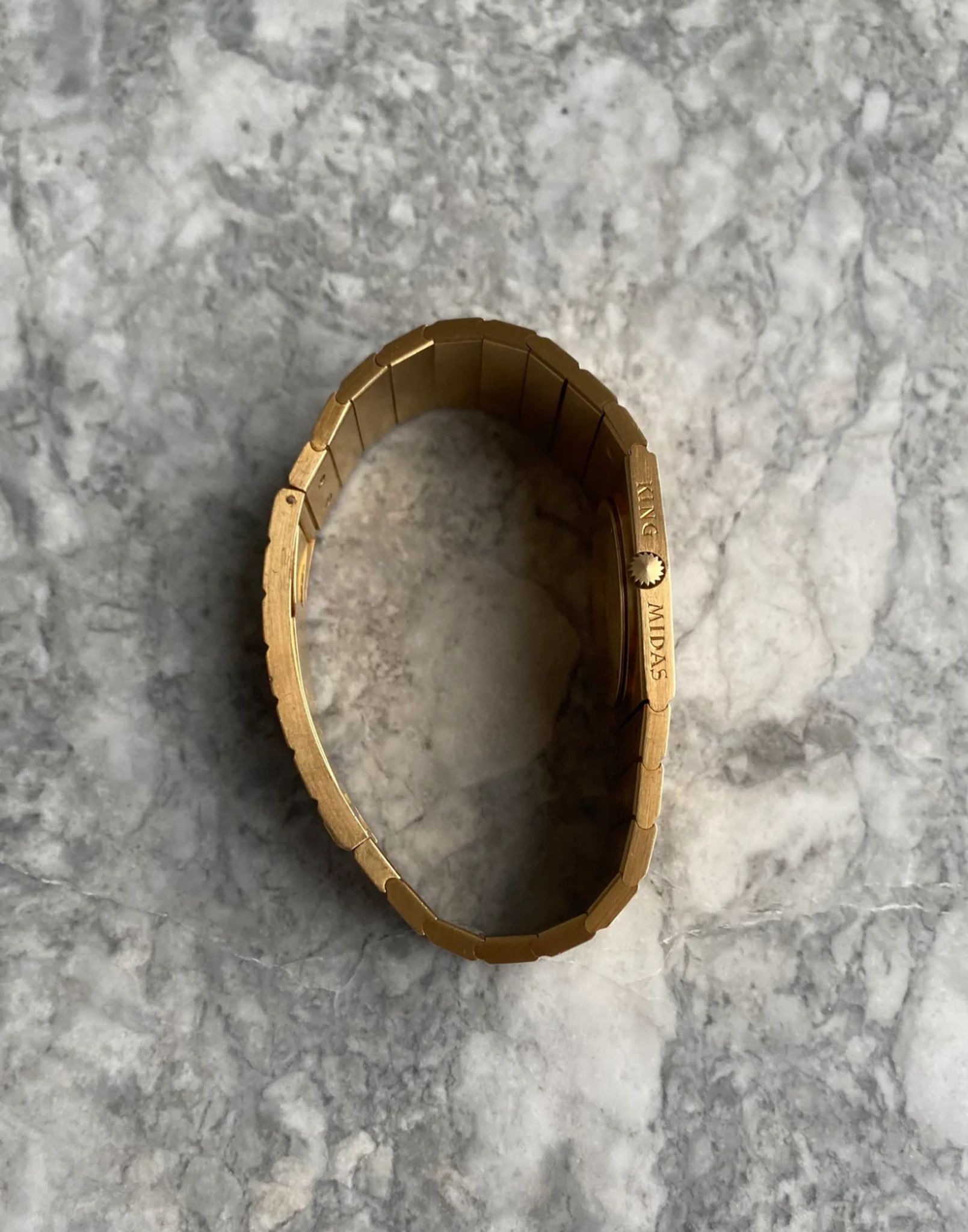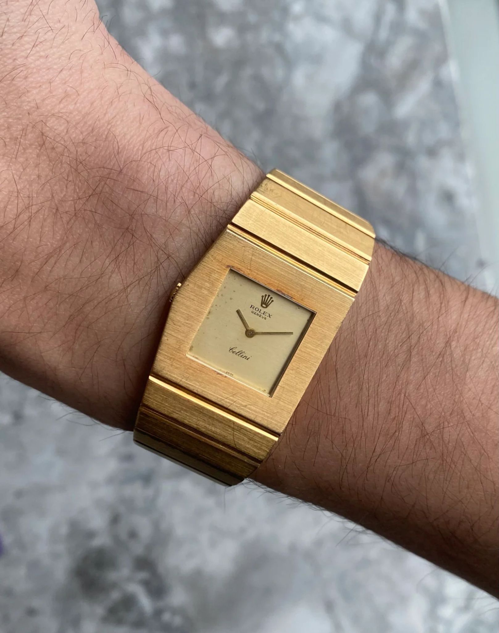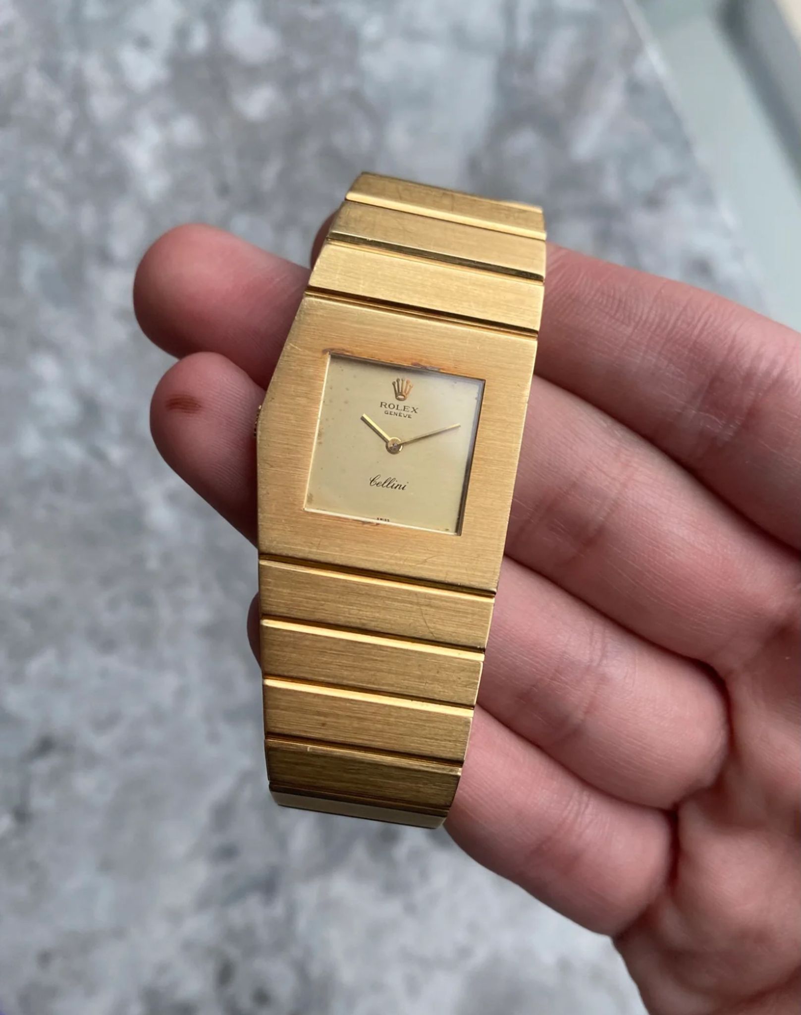 Here's a vintage Rolex Cellini Midas reference 4315 champagne dial in 18K yellow gold from the 1970s (4.2M serial, issued no. 3370) Keeps great time and is fully functional. 27mm case size across and bracelet fits up to a 7 inch wrist. Gold hands. Snap back caseback. Asymetrical case and bracelet. 18k yellow gold case and caseback. Unpolished condition. There are scratches throughout the bracelet as seen in photos. Quite rare to find these examples, especially as they are getting more popular now! All parts are original including the signed crown, caseback, dial, and movement. Both the dial and case are in great cosmetic, untouched condition.