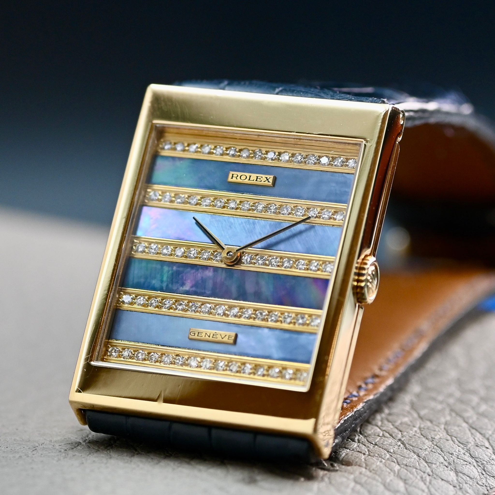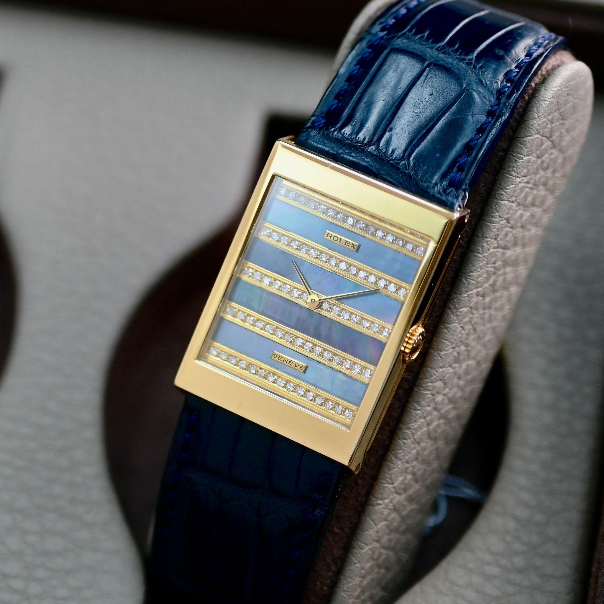 Dial: Ultra rare and magnificient dial made from stripes of mother of pearl in different blue tones and divided by diamond set bridges. The graphics, Rolex and Geneve are enemelled on gold plates and applied on the dial.