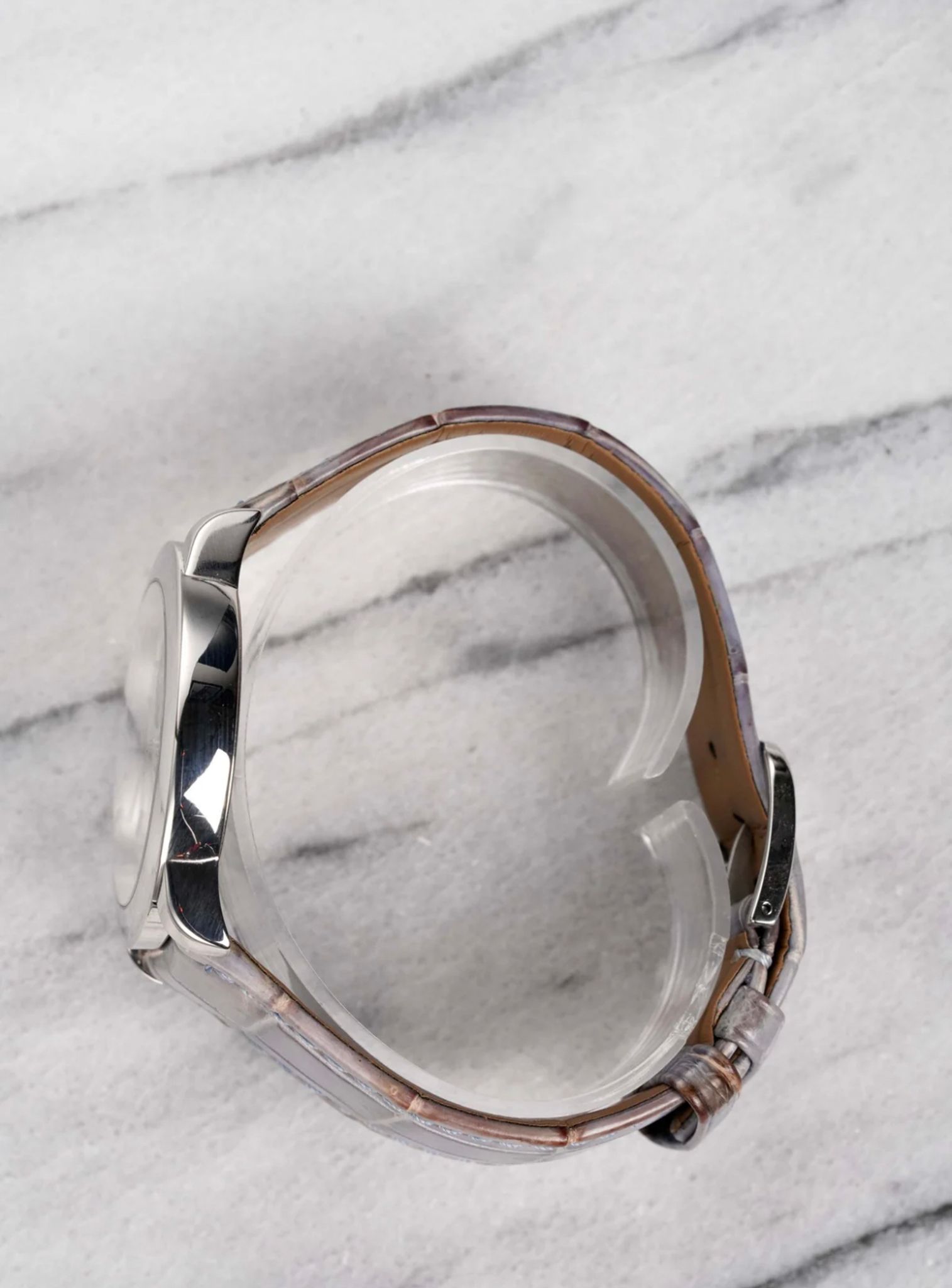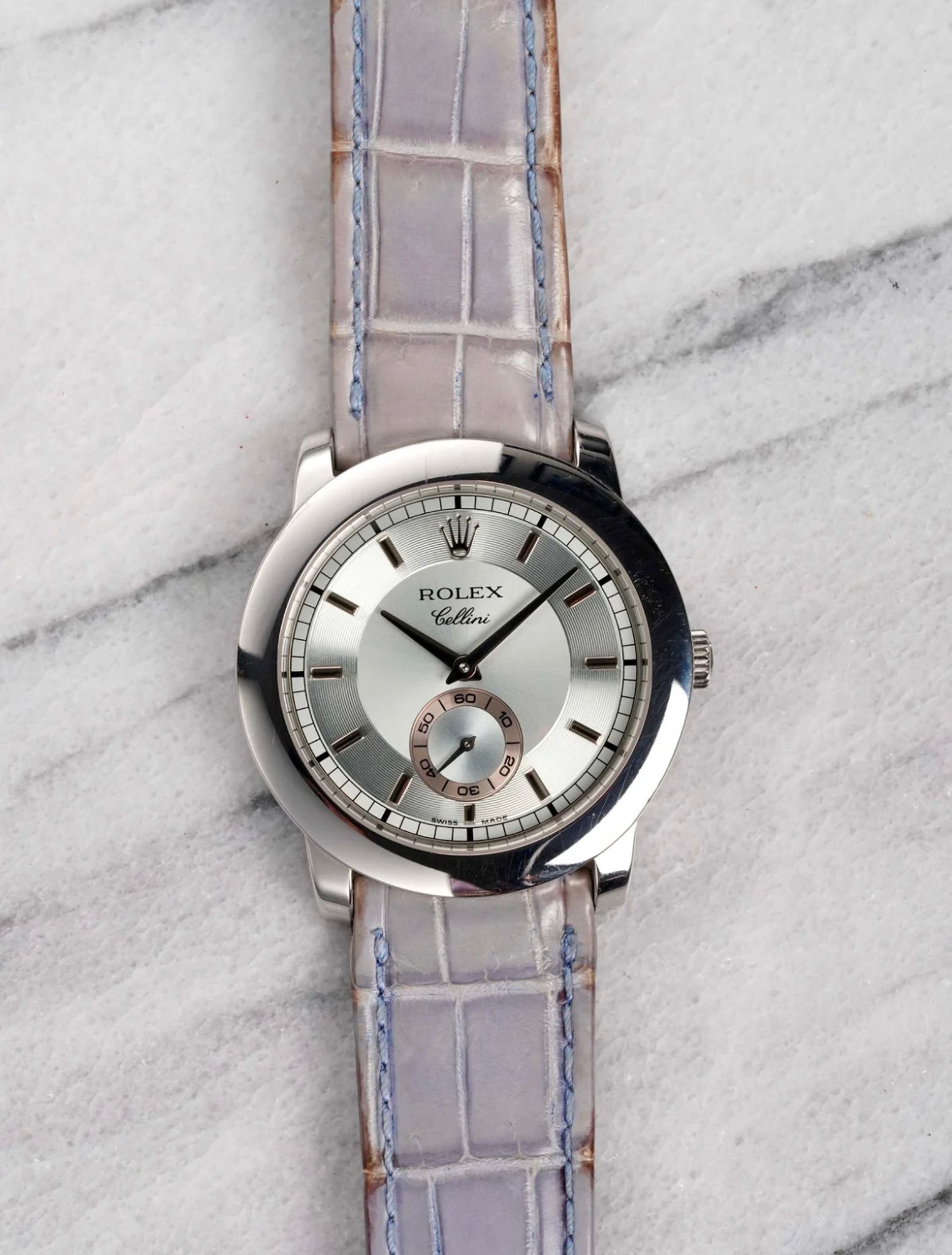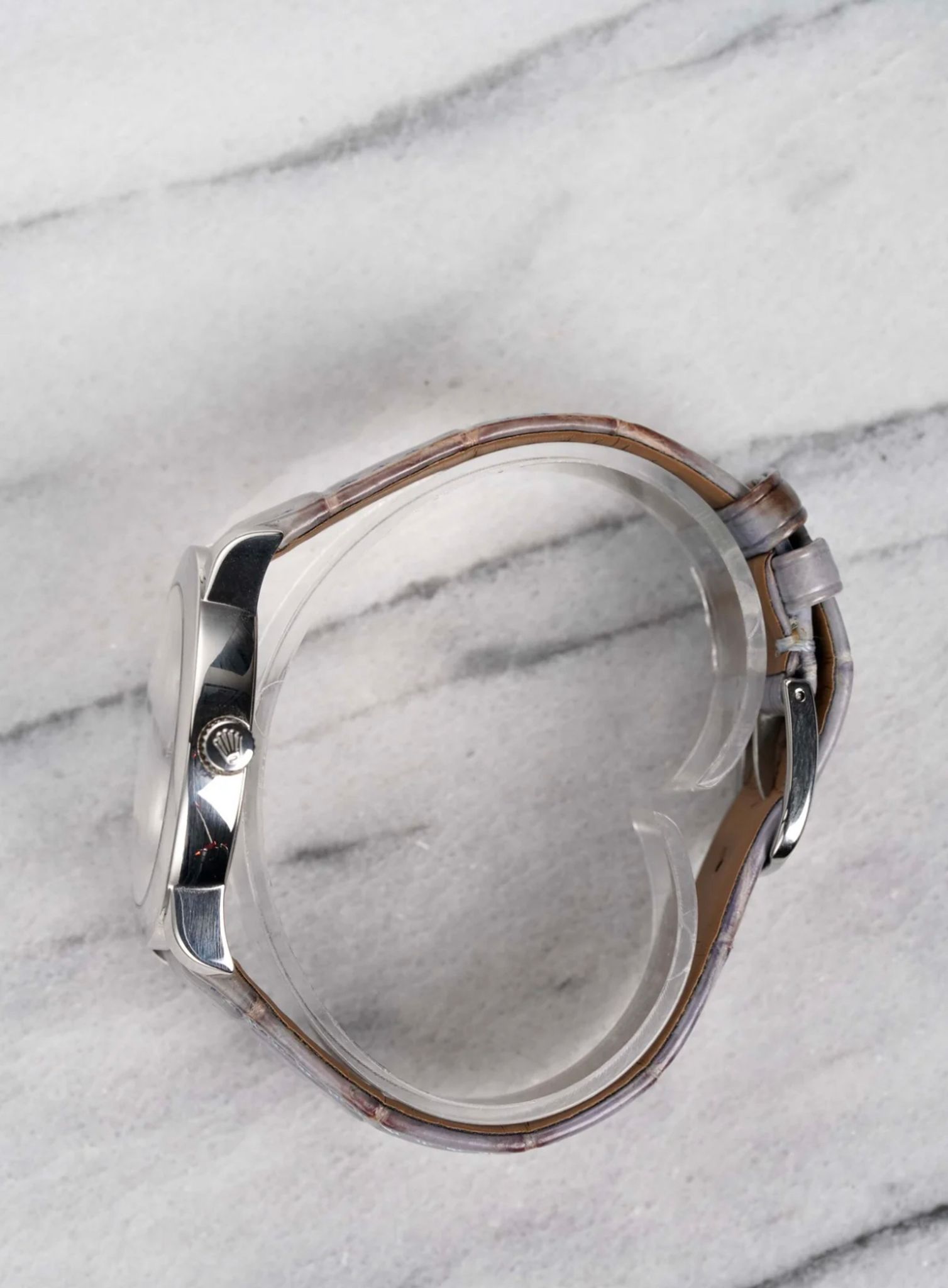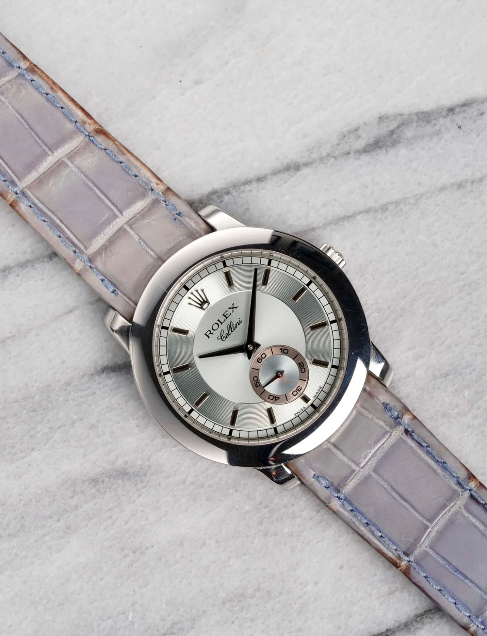 Here's a Rolex Cellini reference number 5241 manual wind in Platinum with a factory silver dial from the late 90s, early 2000s. Keeps great time and is fully functional. Measurements include a 38mm case size and 20mm lug width. On an aftermarket light purple alligator leather strap with purple stitching. Time only. Sub seconds at 6 a clock. The outer dial has a stripped texture as seen in photos. Makes for a great piece for both men and women. Thicker bezel. Matching hands and hour markers. Both the dial and crystal are free from any scratches or marks. A great alternative to a lot of dress watches. All parts are original including the signed Rolex crown, dial, movement, and caseback. Both the dial and case are in great cosmetic, untouched condition.