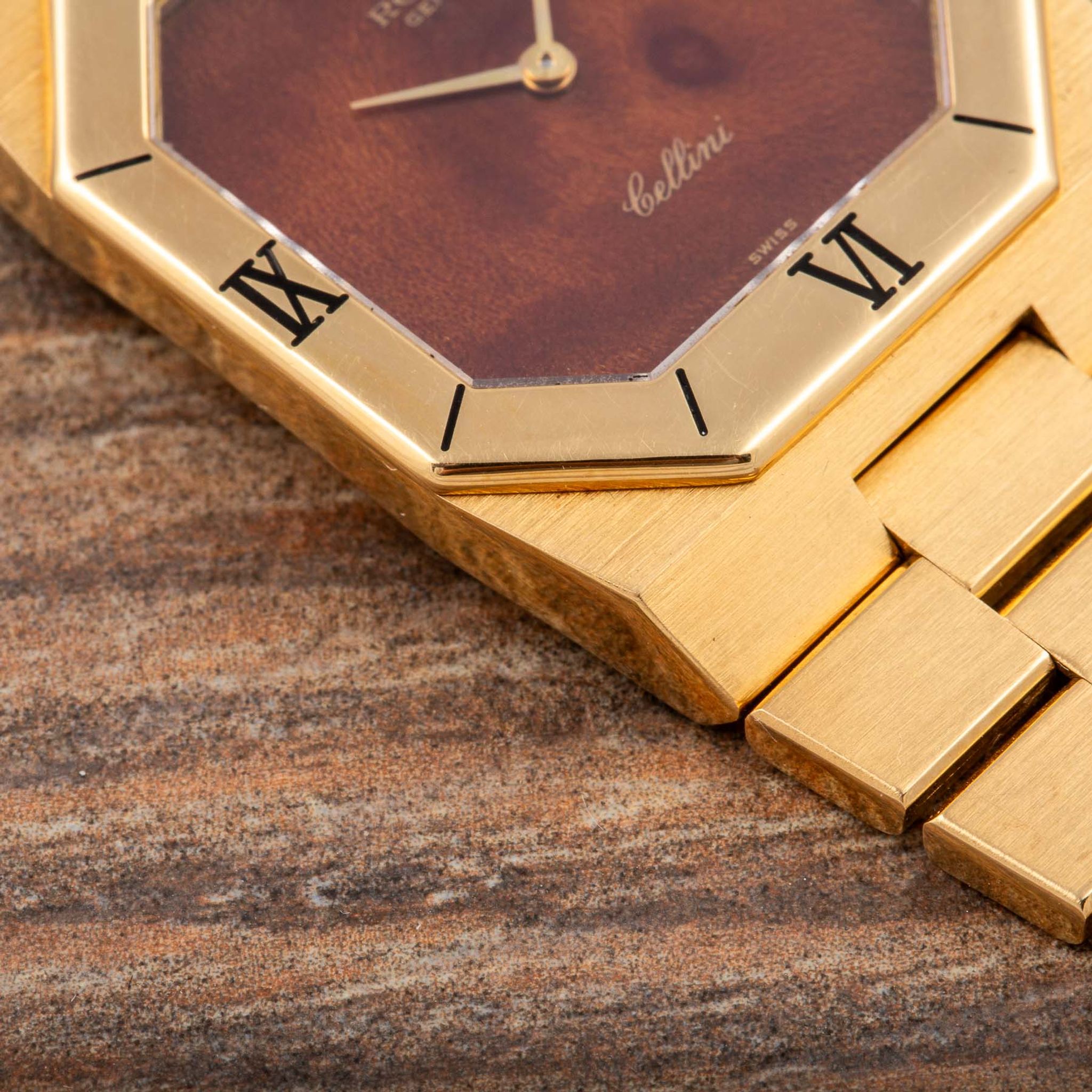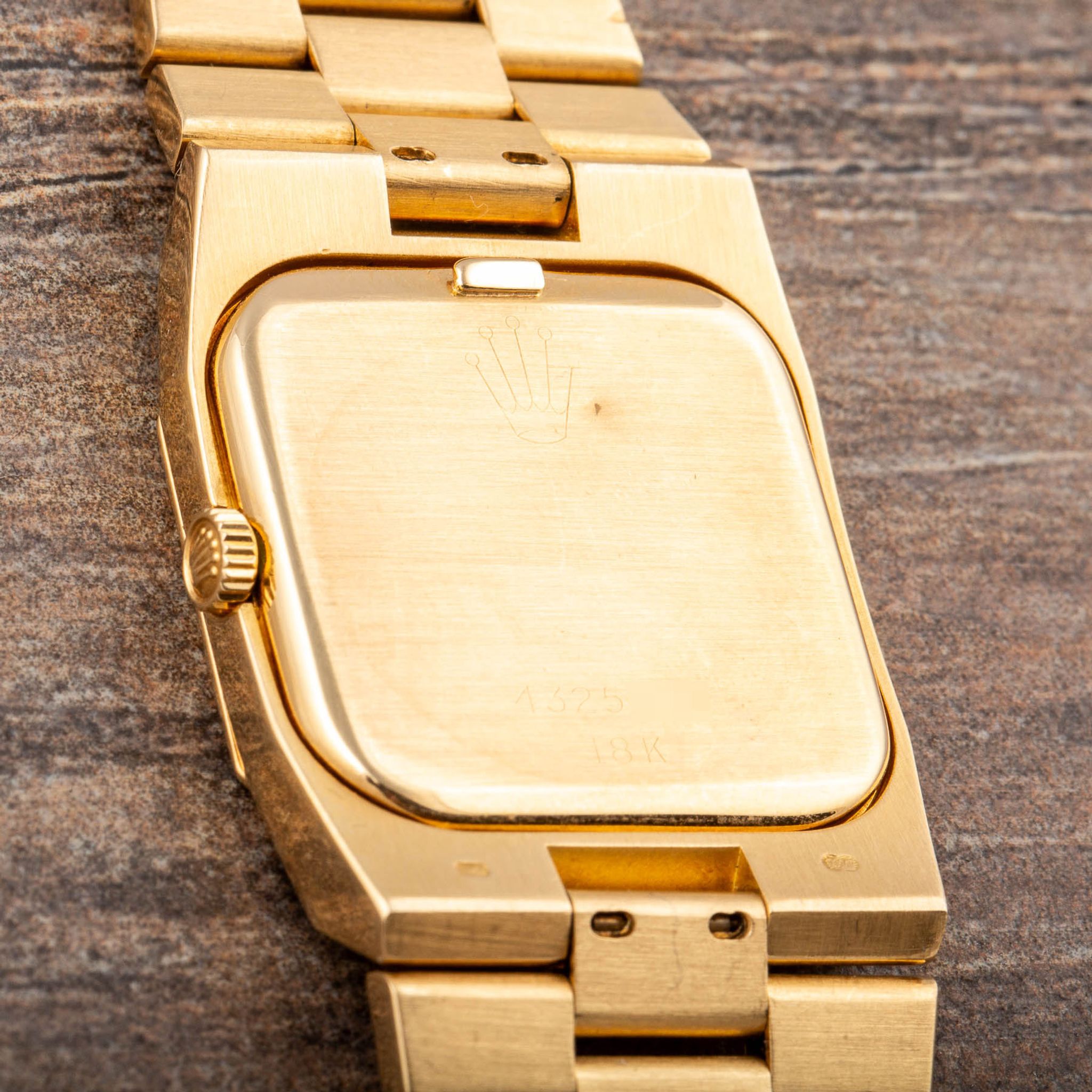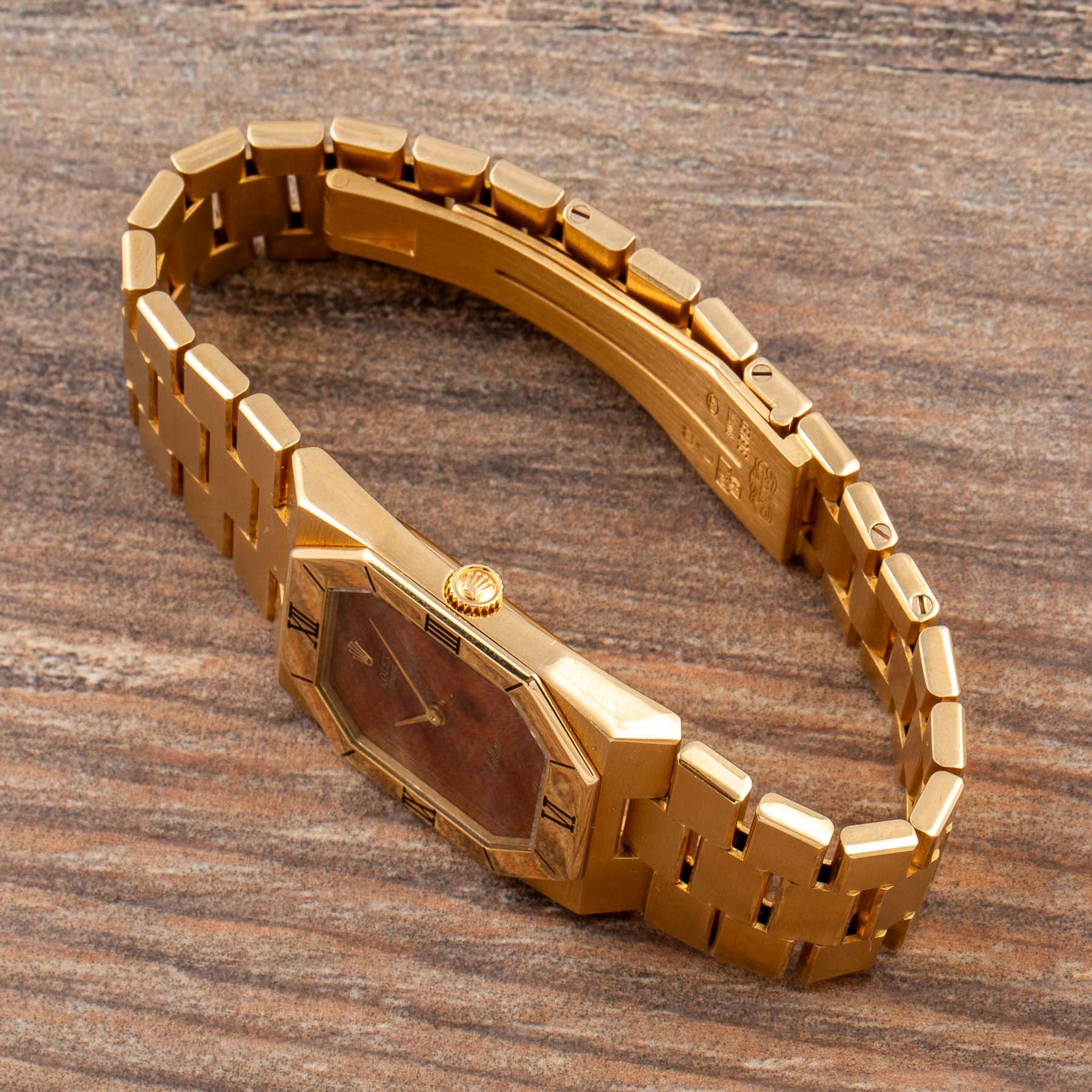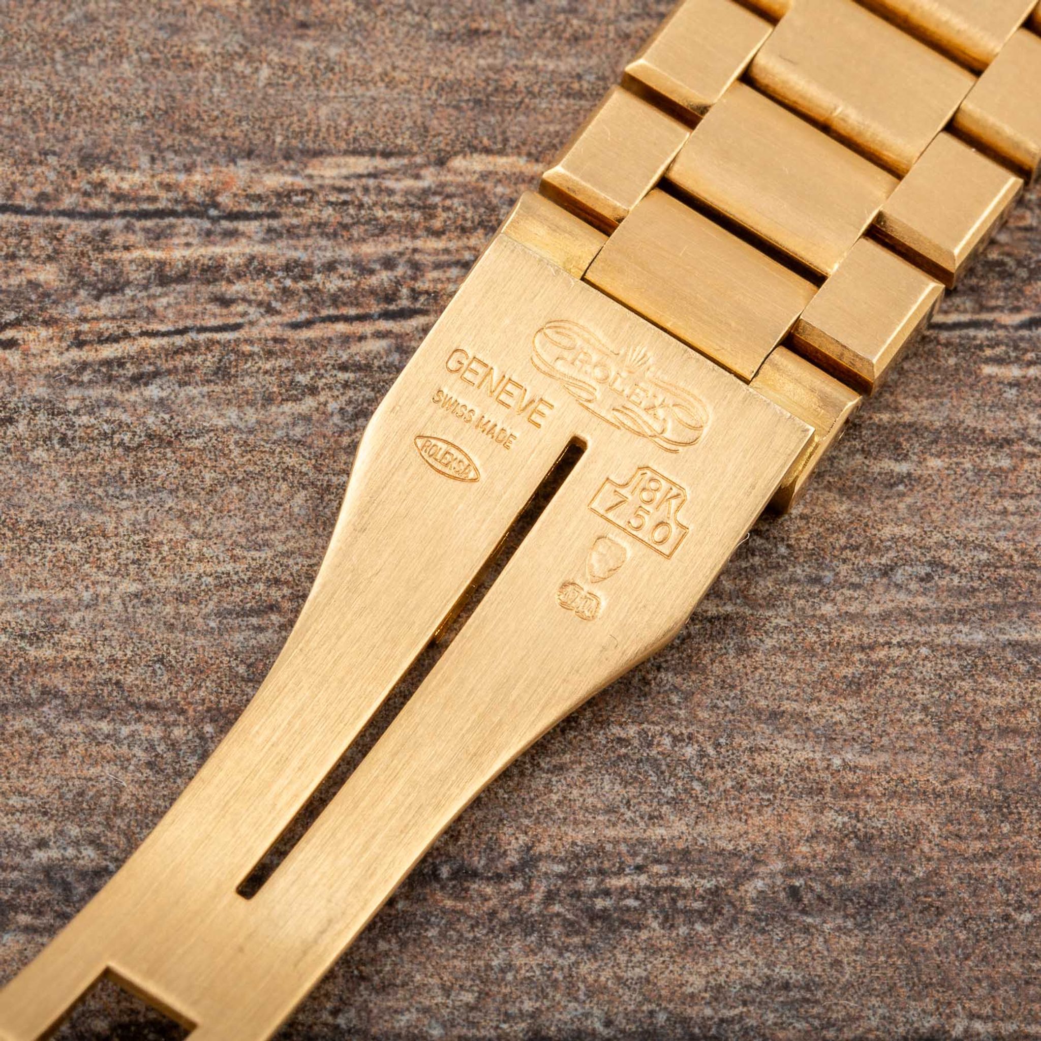The Rolex reference 4350 stands as a rare gem within the Cellini line, crafted in limited quantities, it embodies exquisite artistry and fine watchmaking. Constructed entirely in 18kt yellow gold, including the bracelet, its wood dial and Roman numerals bezel exude opulence with a subtle elegance. The watch’s exceptional craftsmanship is evident, particularly in the seamlessly integrated hidden clasp bracelet and the meticulously angled case, ensuring both beauty and comfort in wear. In impeccable condition, boasting a mint wood dial, original black enamel bezel, and maintaining its factory proportions, this timepiece is a testament to enduring luxury.