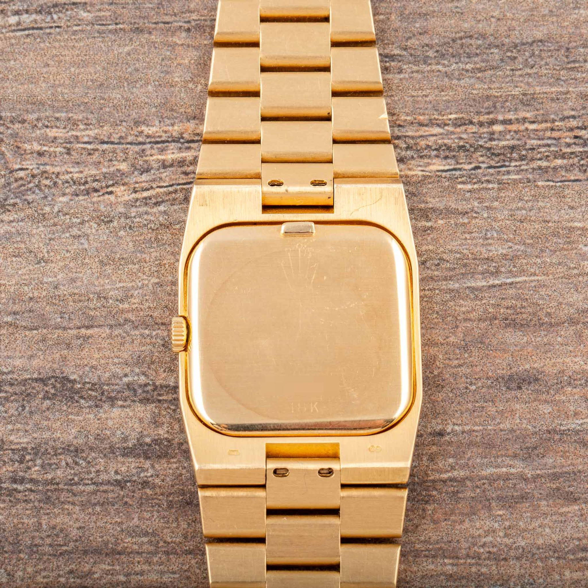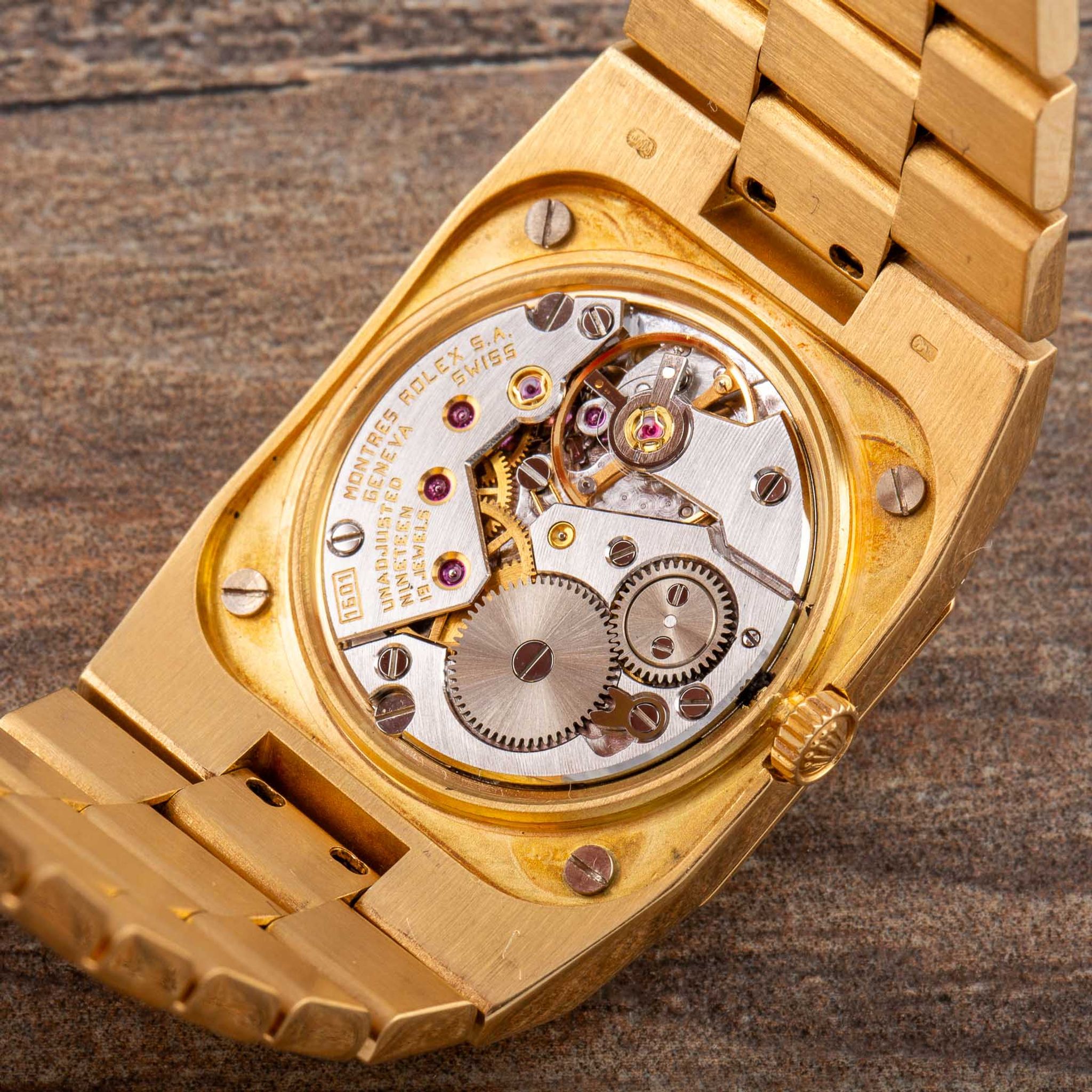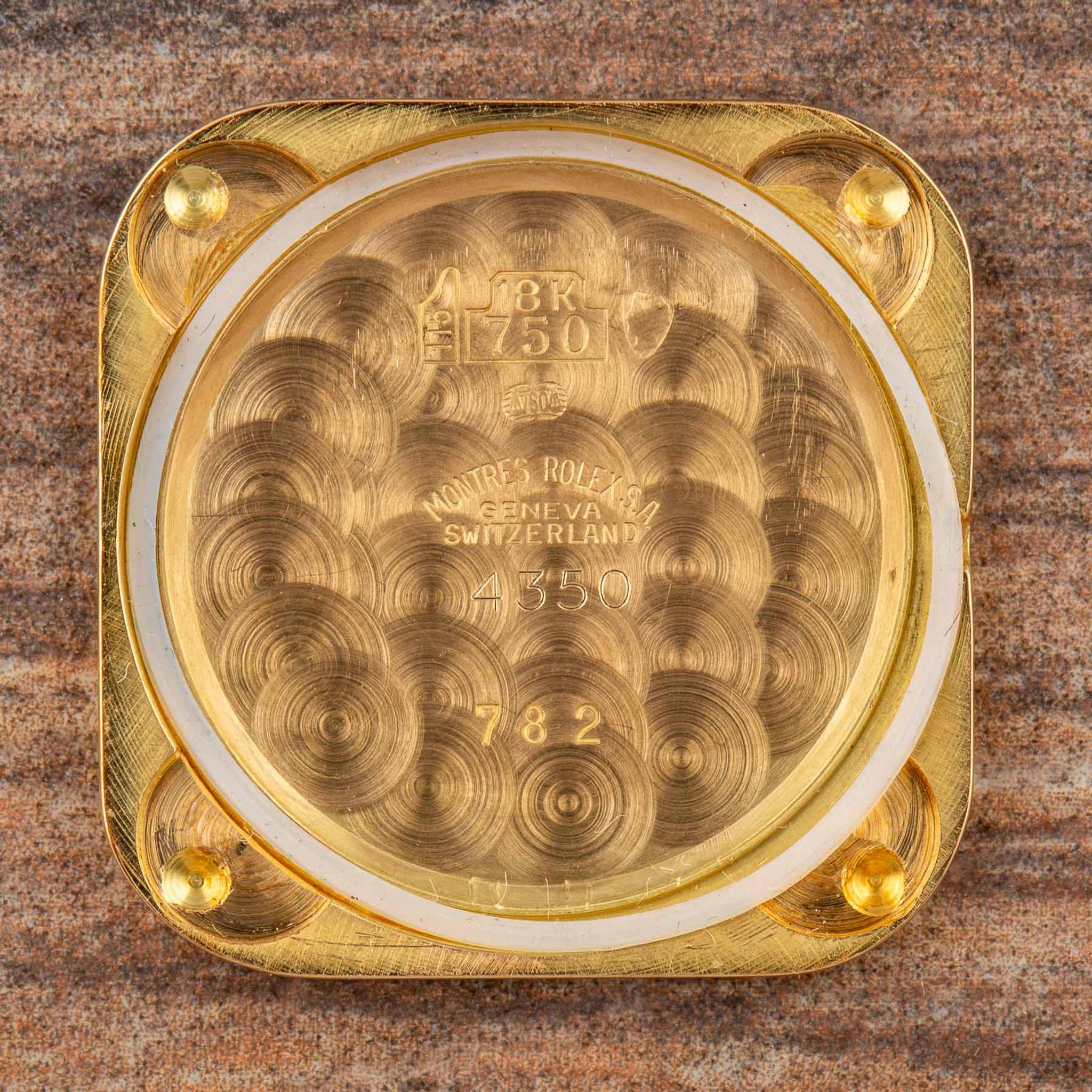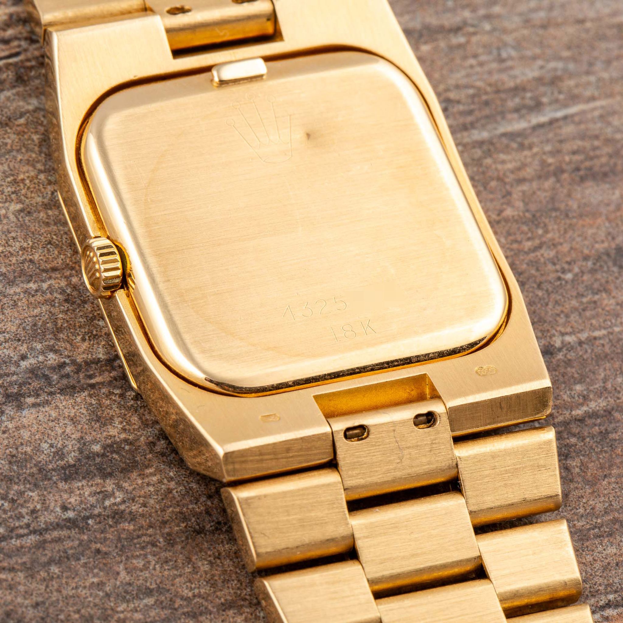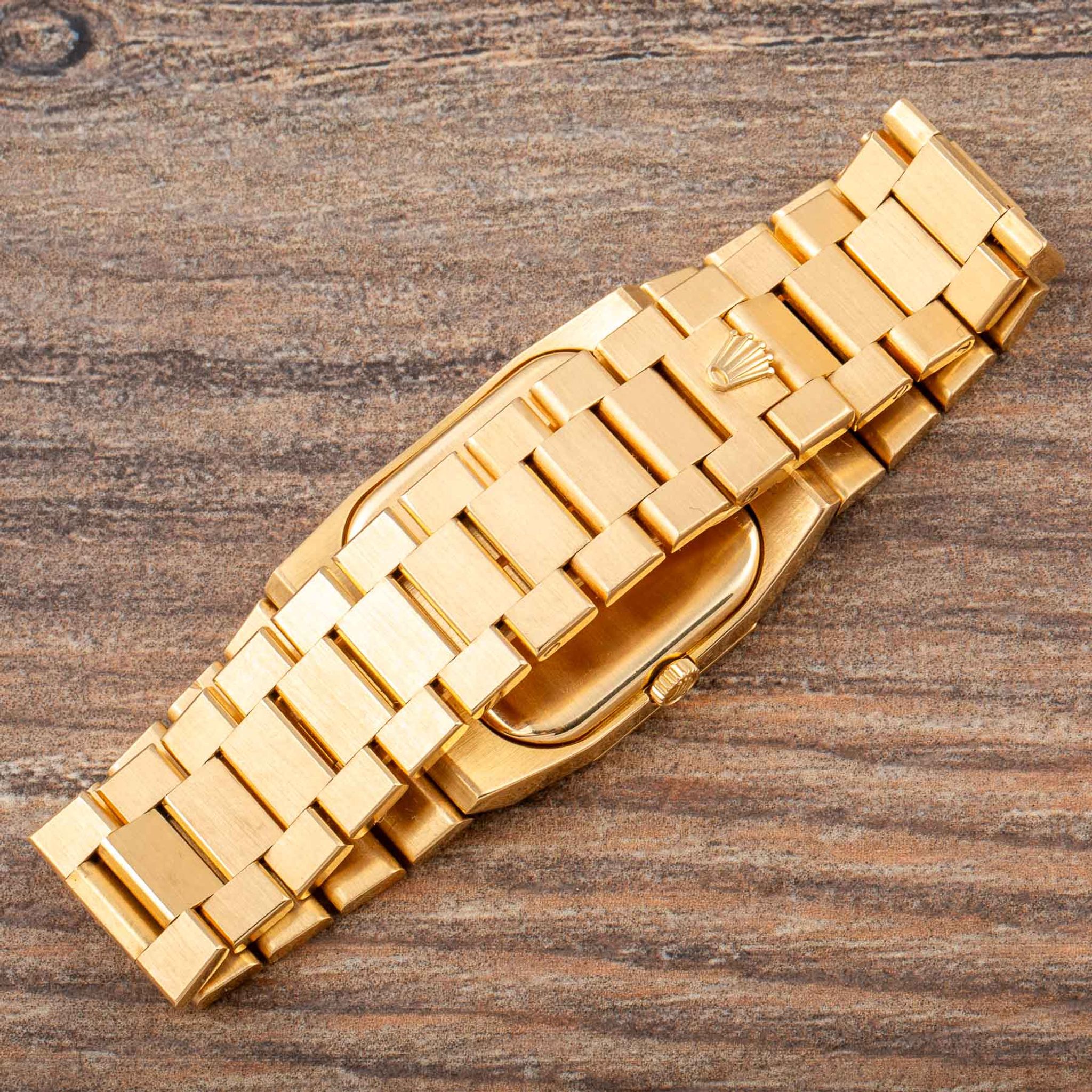 The Rolex reference 4350 stands as a rare gem within the Cellini line, crafted in limited quantities, it embodies exquisite artistry and fine watchmaking. Constructed entirely in 18kt yellow gold, including the bracelet, its wood dial and Roman numerals bezel exude opulence with a subtle elegance. The watch’s exceptional craftsmanship is evident, particularly in the seamlessly integrated hidden clasp bracelet and the meticulously angled case, ensuring both beauty and comfort in wear. In impeccable condition, boasting a mint wood dial, original black enamel bezel, and maintaining its factory proportions, this timepiece is a testament to enduring luxury.