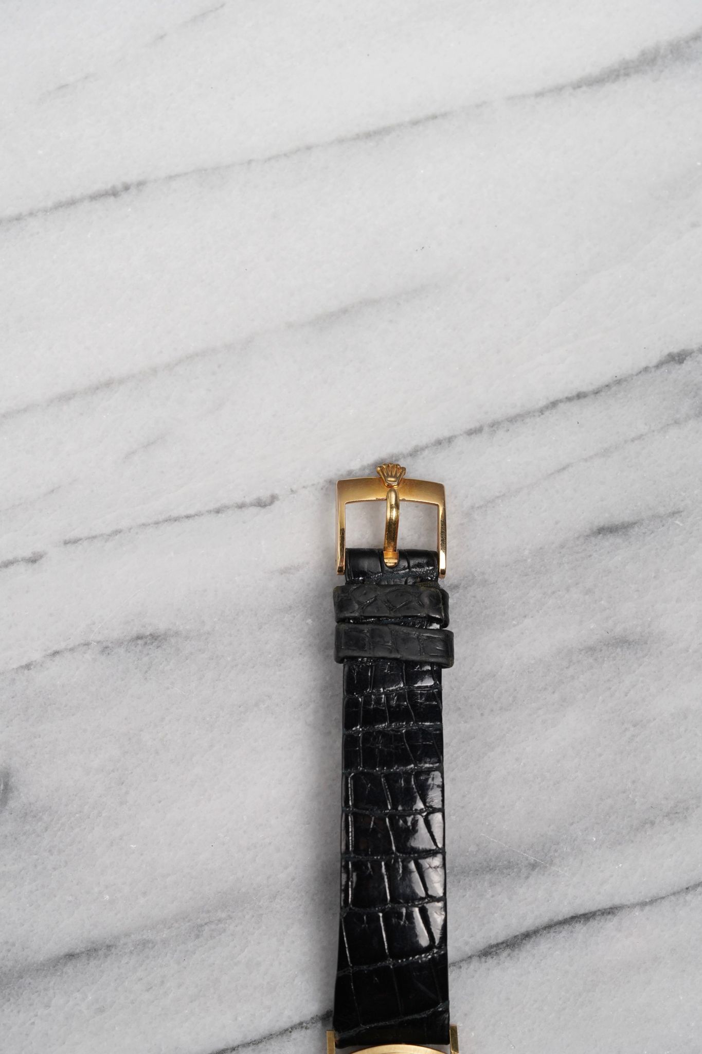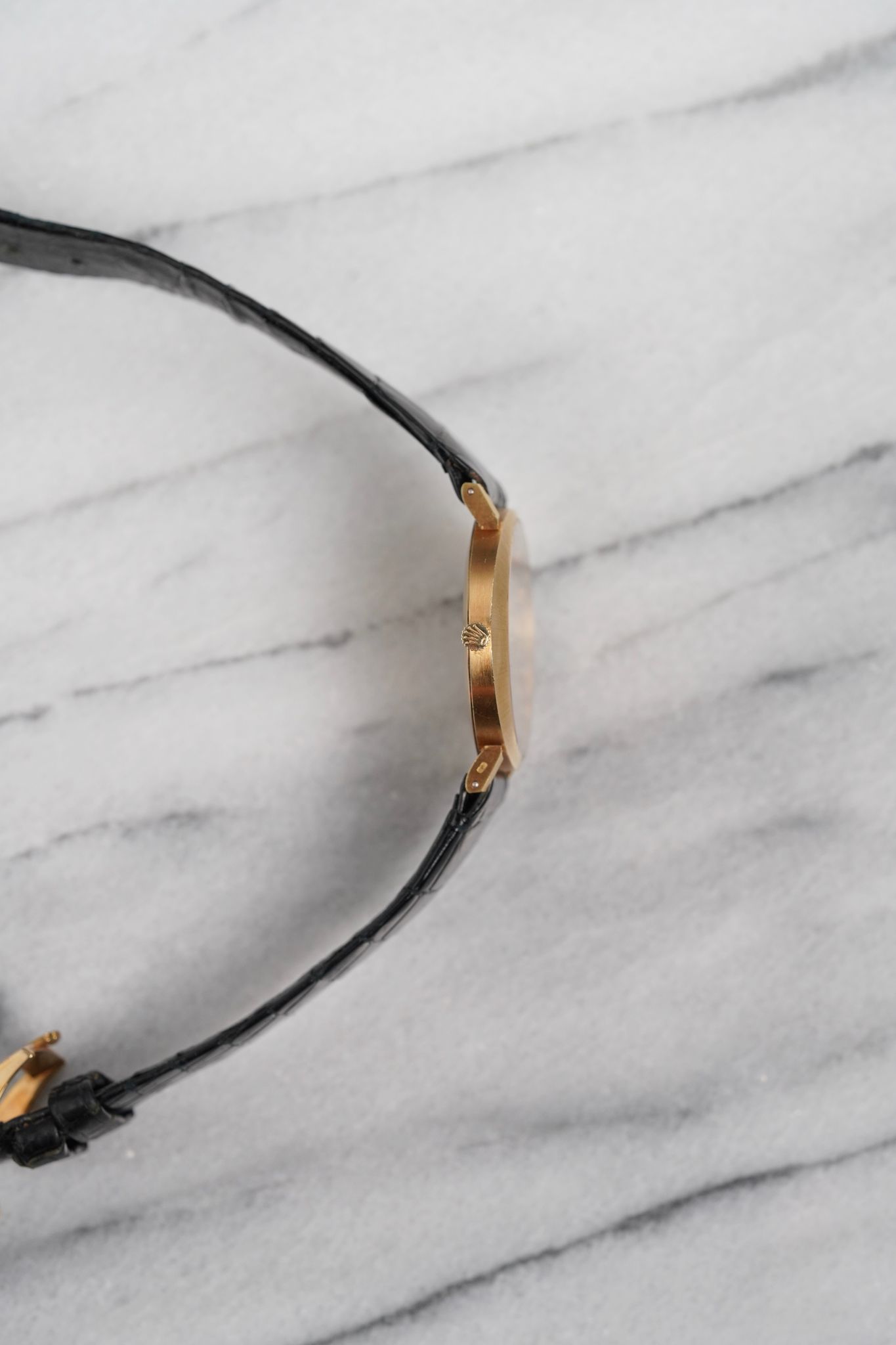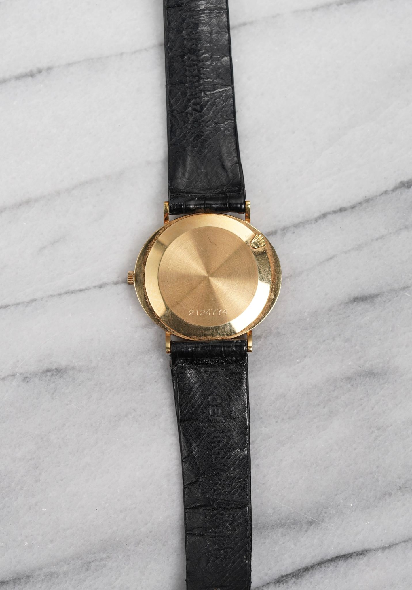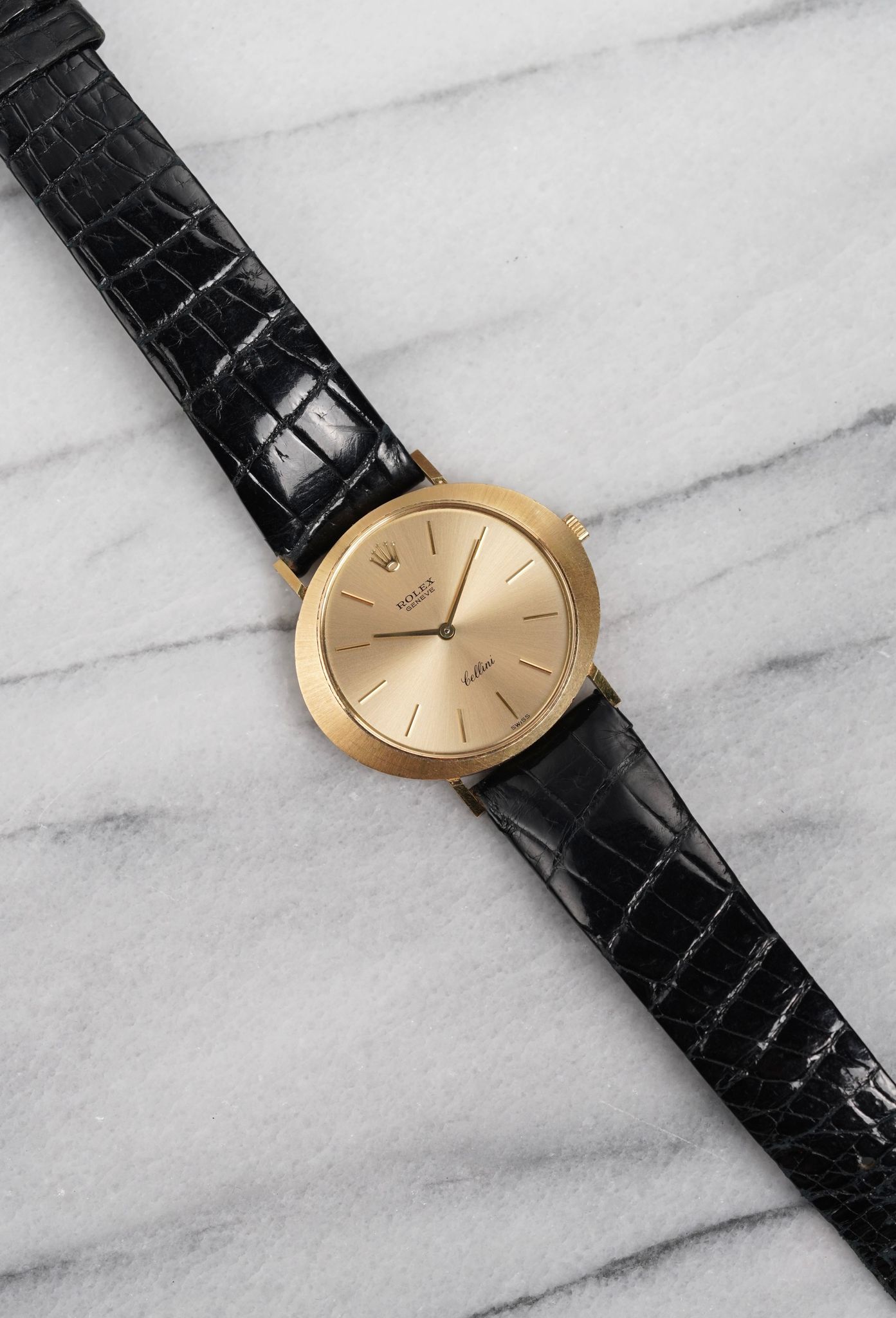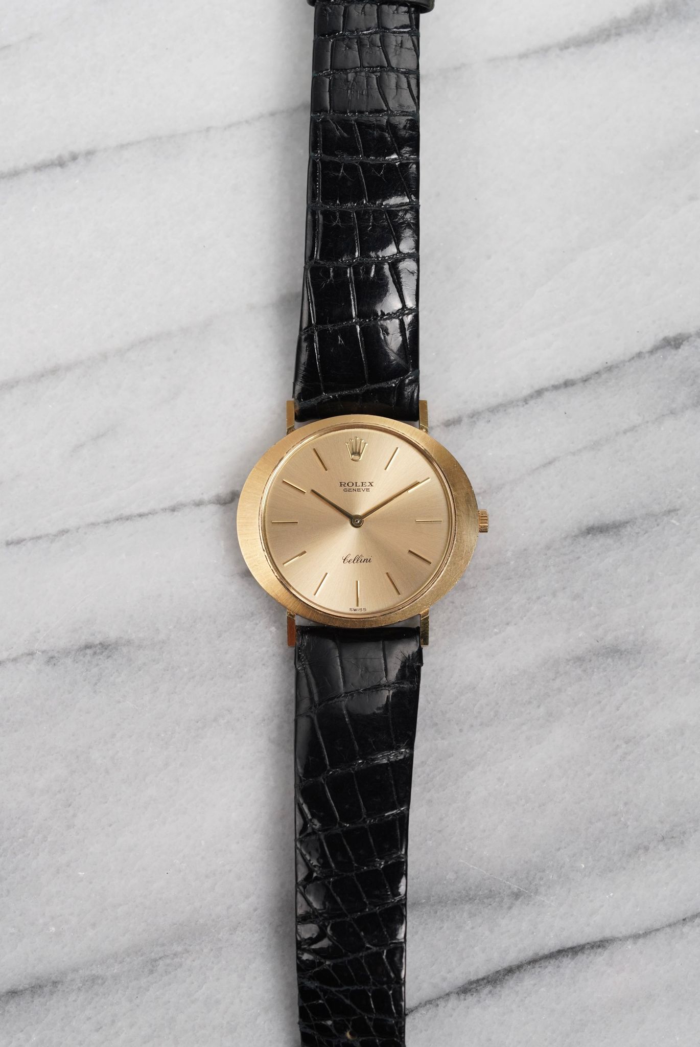 Here's a vintage Rolex Cellini manual wind in 18K yellow gold with a champagne sunburst dial from the 80s. Keeps great time and is fully functional. Measurements include a 32mm case size and 18mm lug width. On its original black leather strap and signed gold buckle. Time only. Matching gold stick hands and hour markers. Bezel and case are still sharp. Dial is in great condition for it age. The piece makes for a great dress watch for both men and women as its on the smaller side. All other parts are original including the dial, movement, and caseback. Both the dial and case are in great cosmetic, untouched condition.