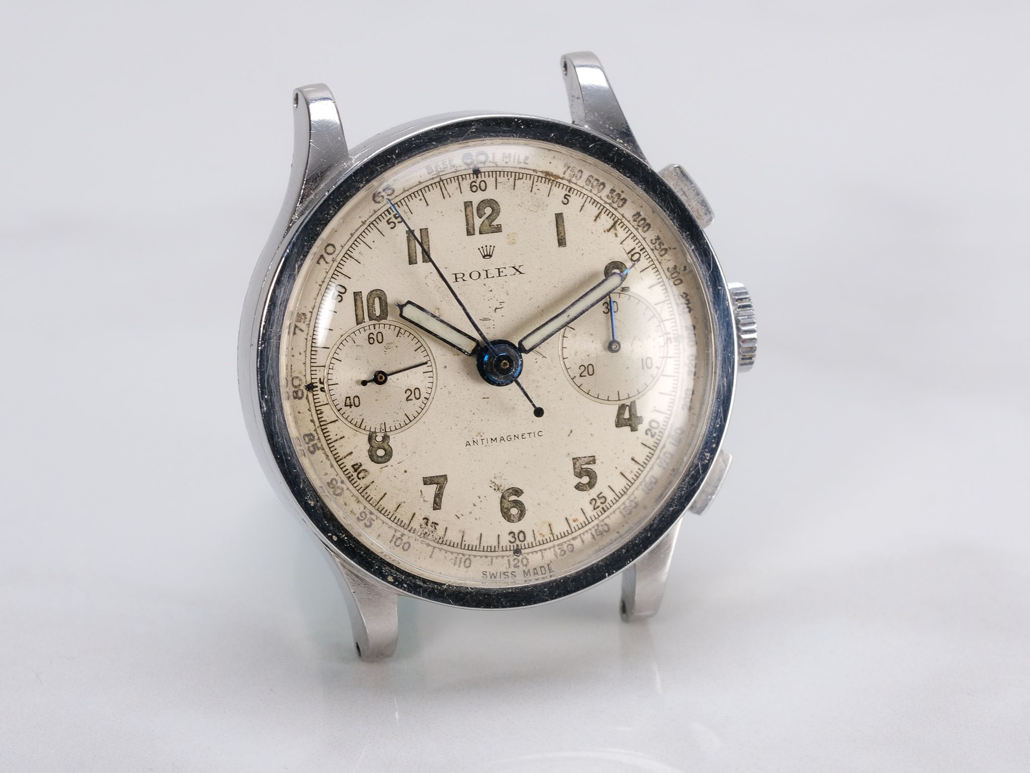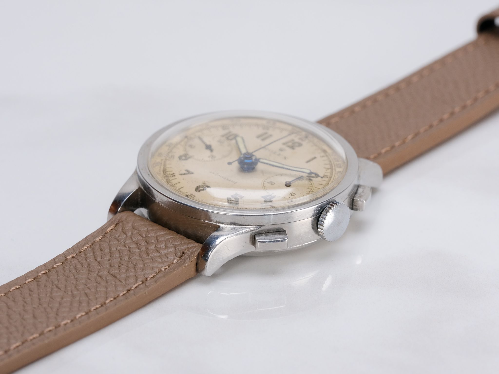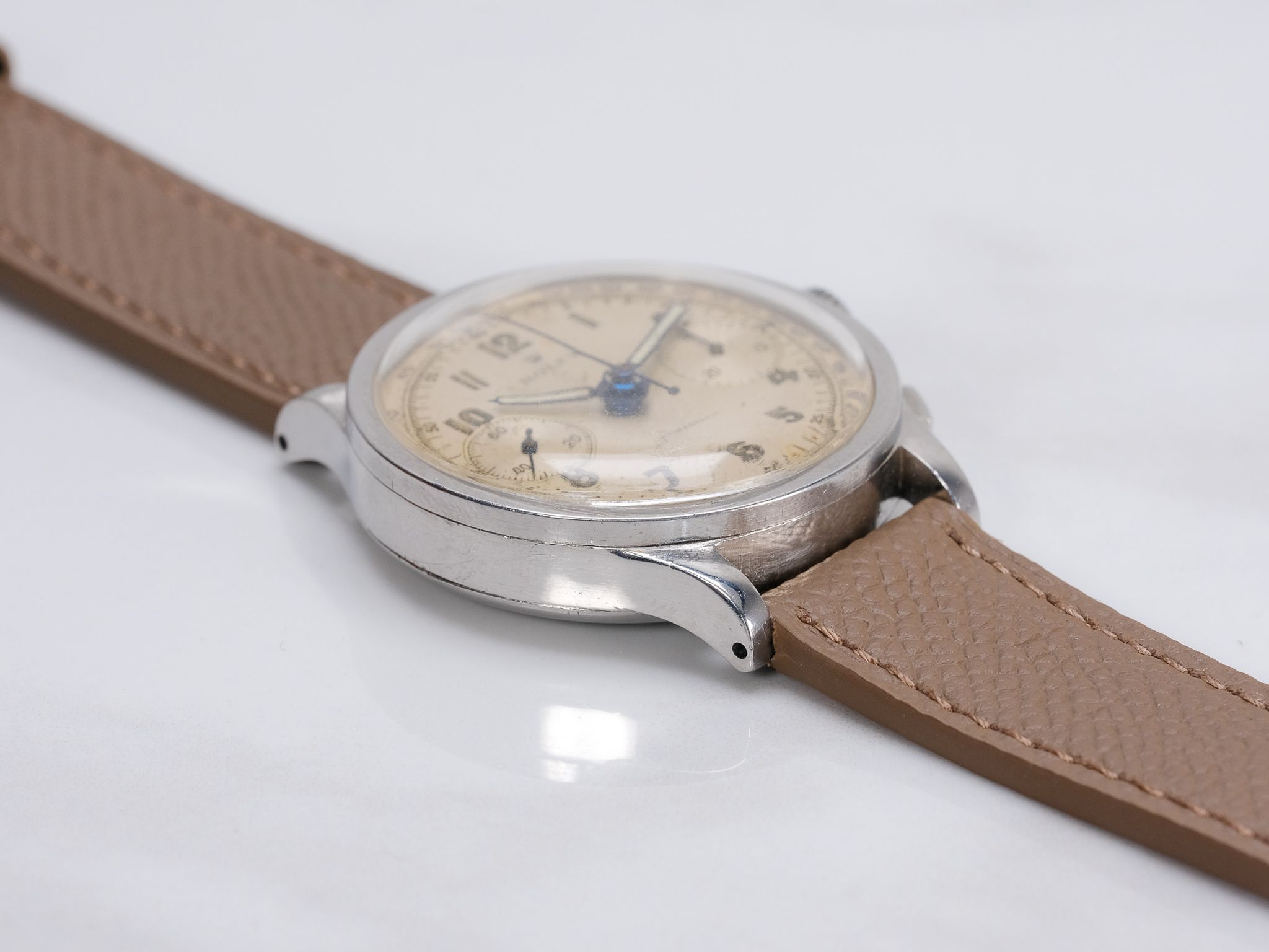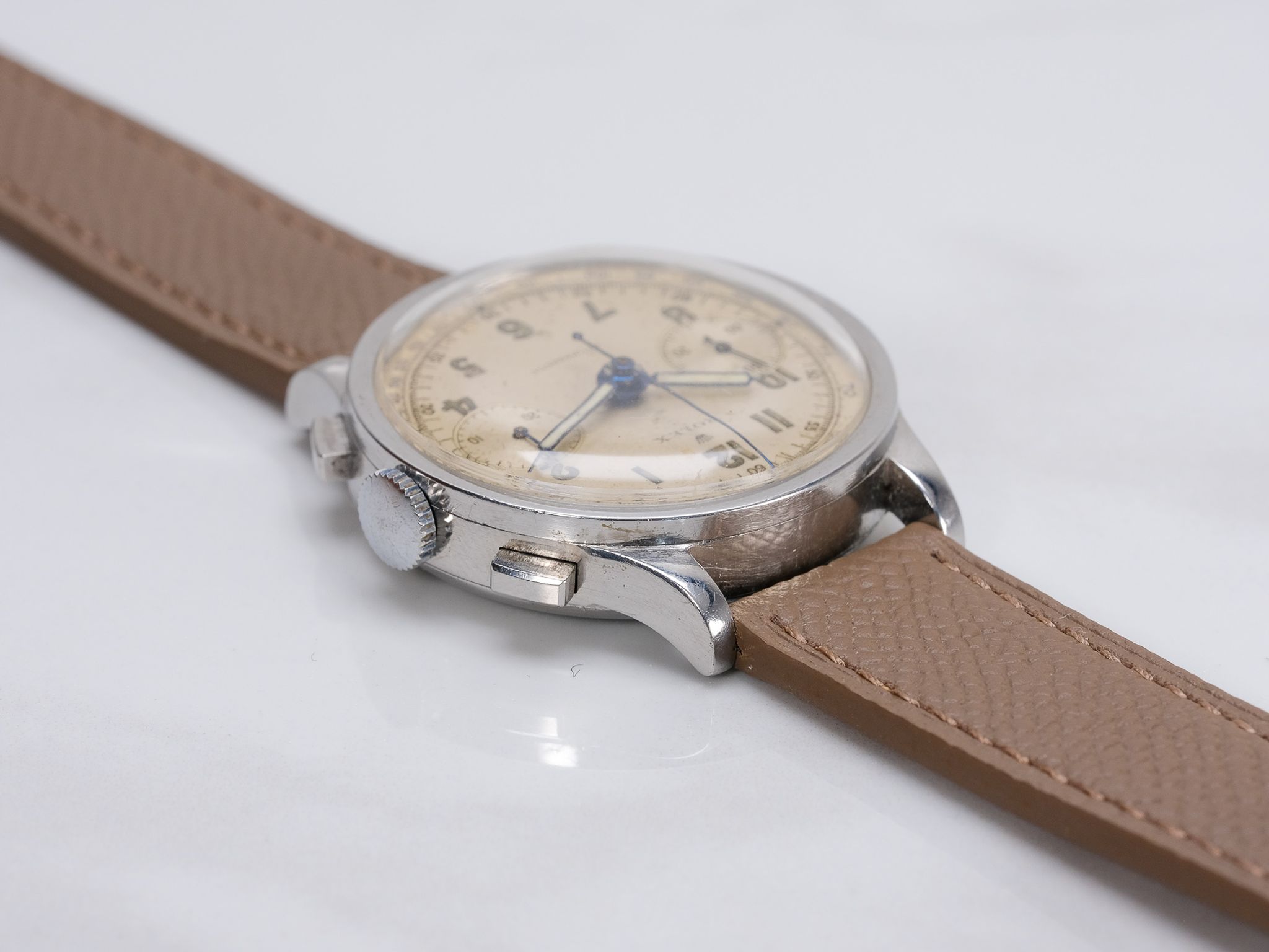 Dial: Silver Arabic dial, shows aging/wear, consistent with the aging of these dials