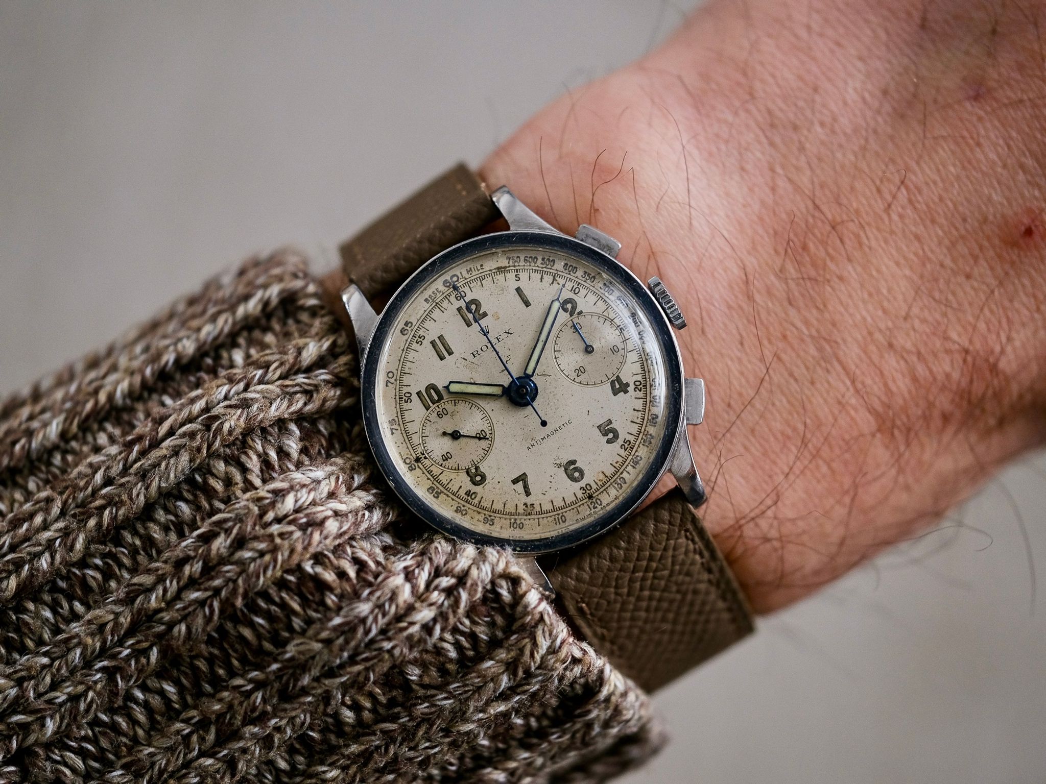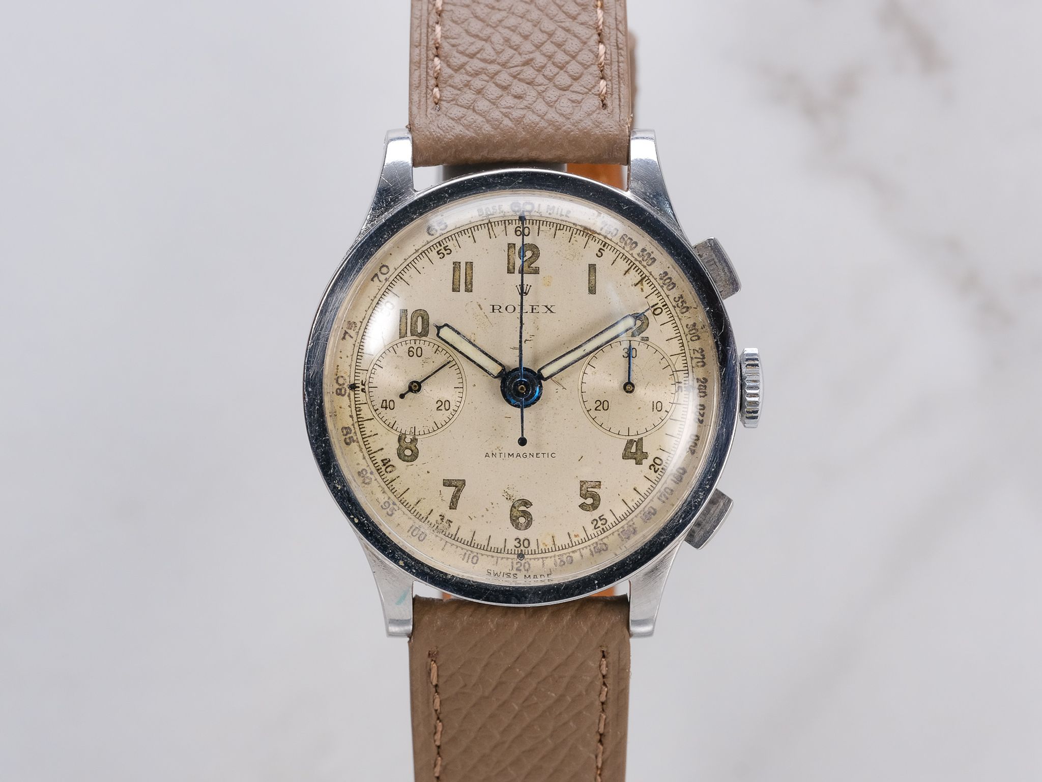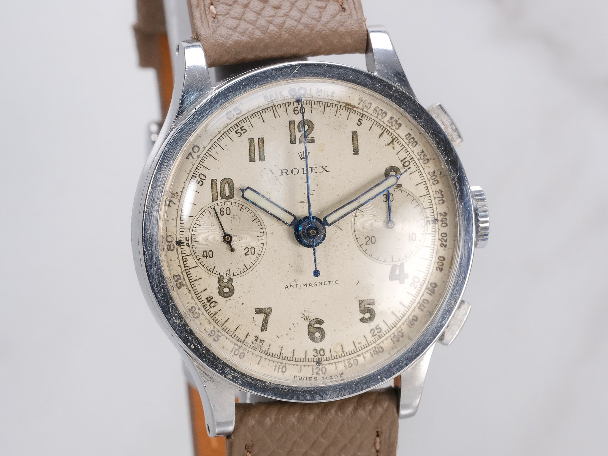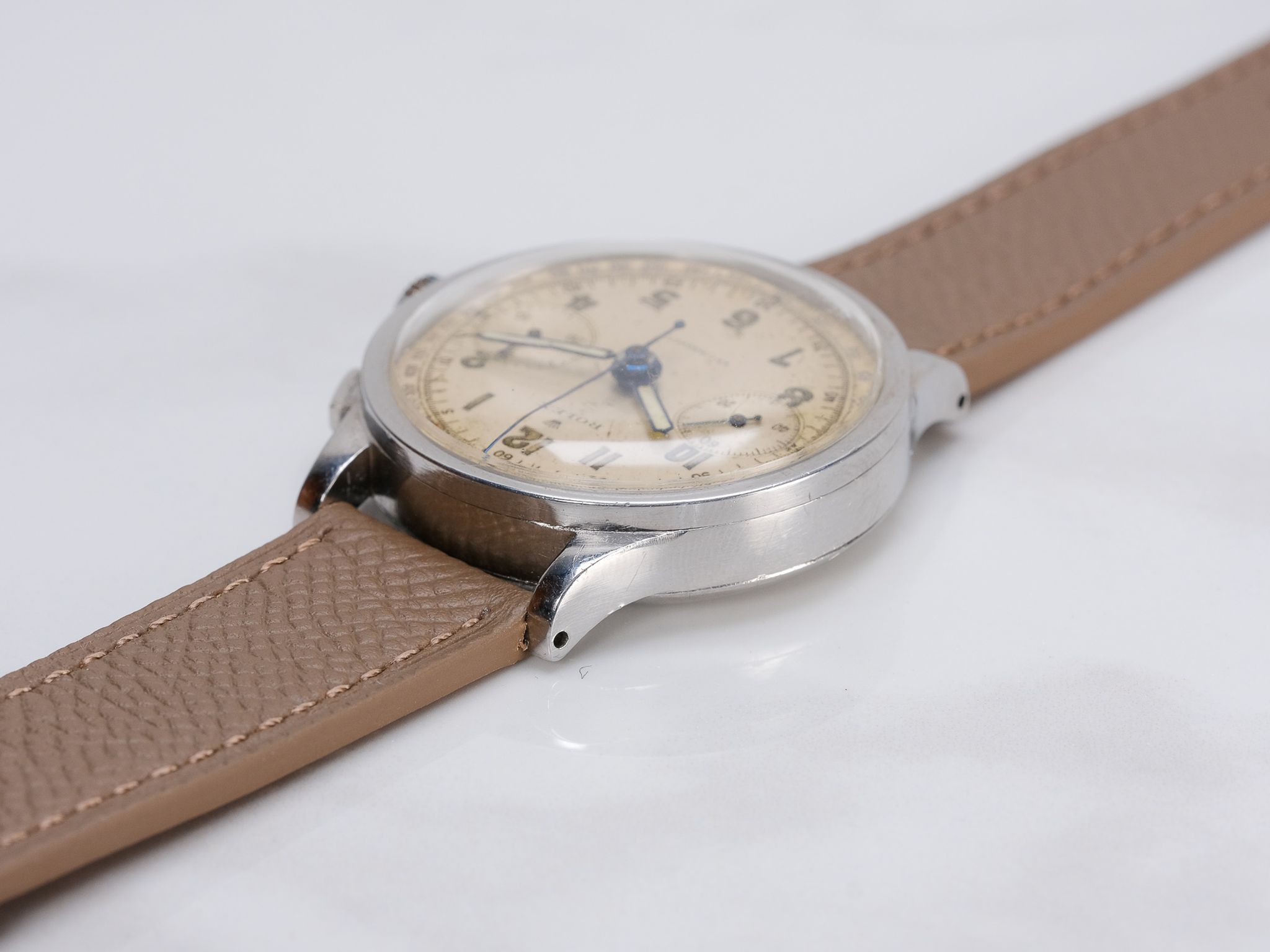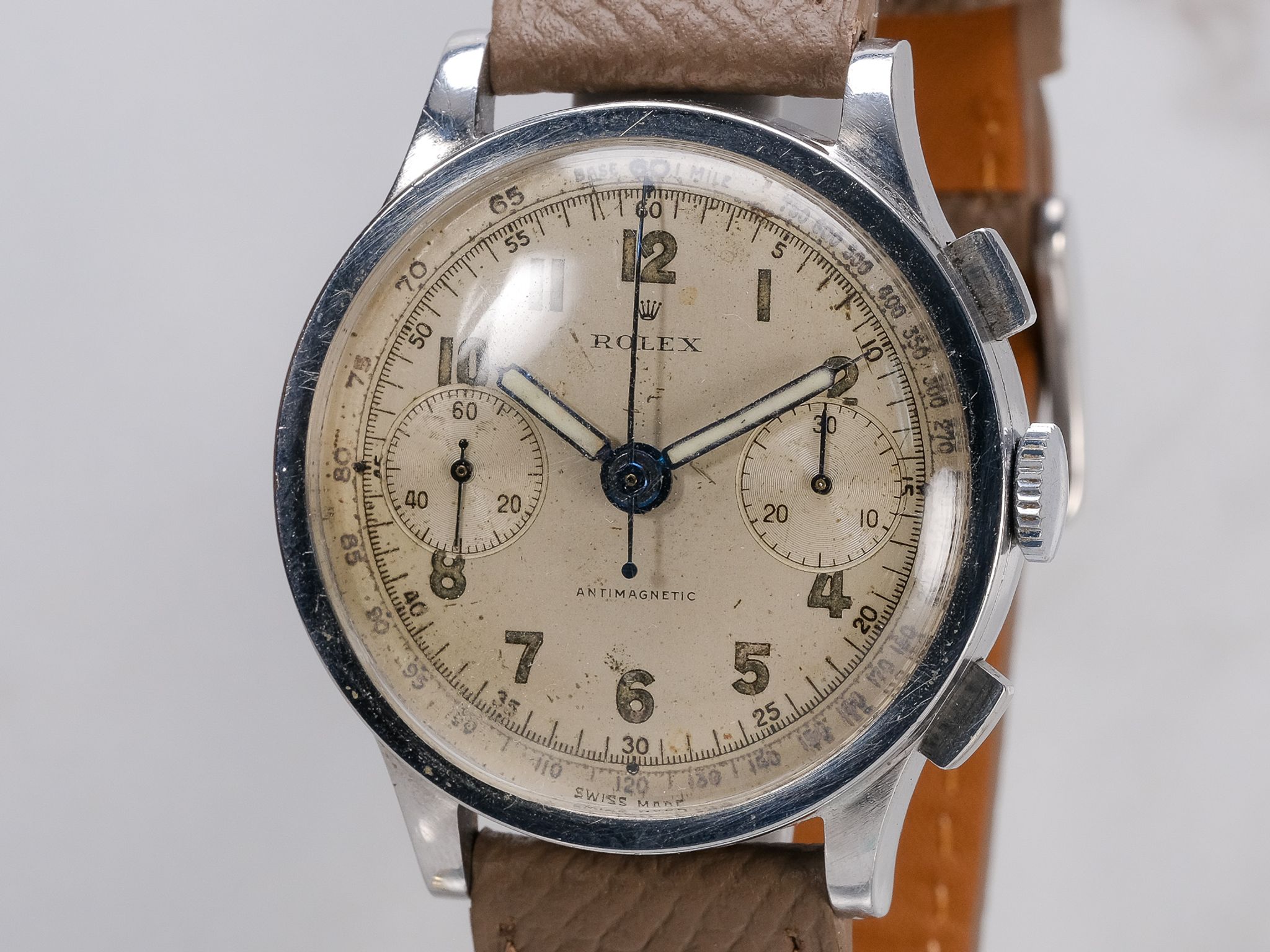 Dial: Silver Arabic dial, shows aging/wear, consistent with the aging of these dials