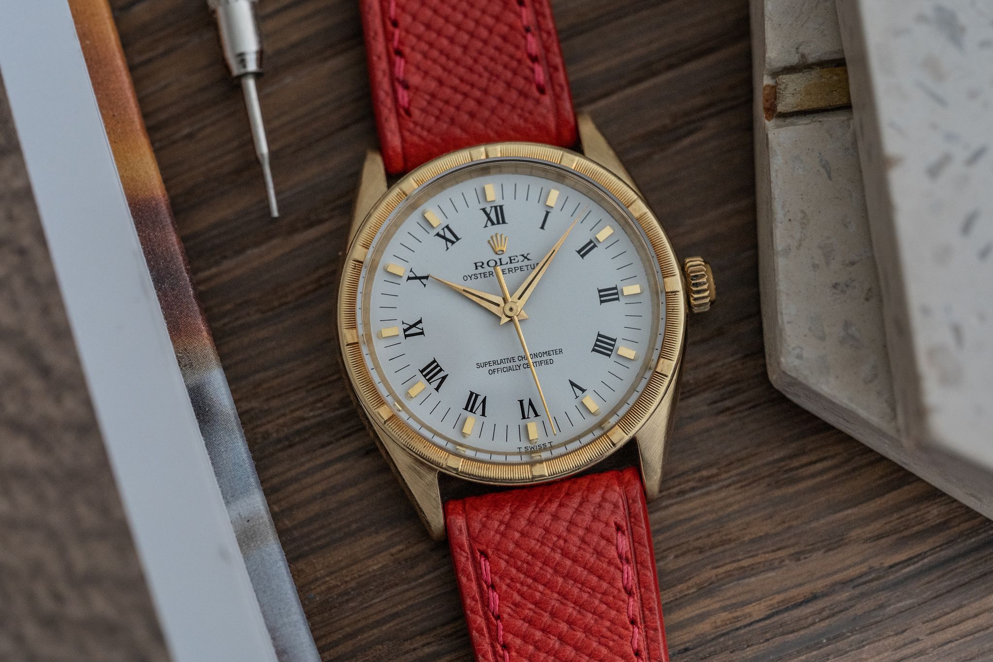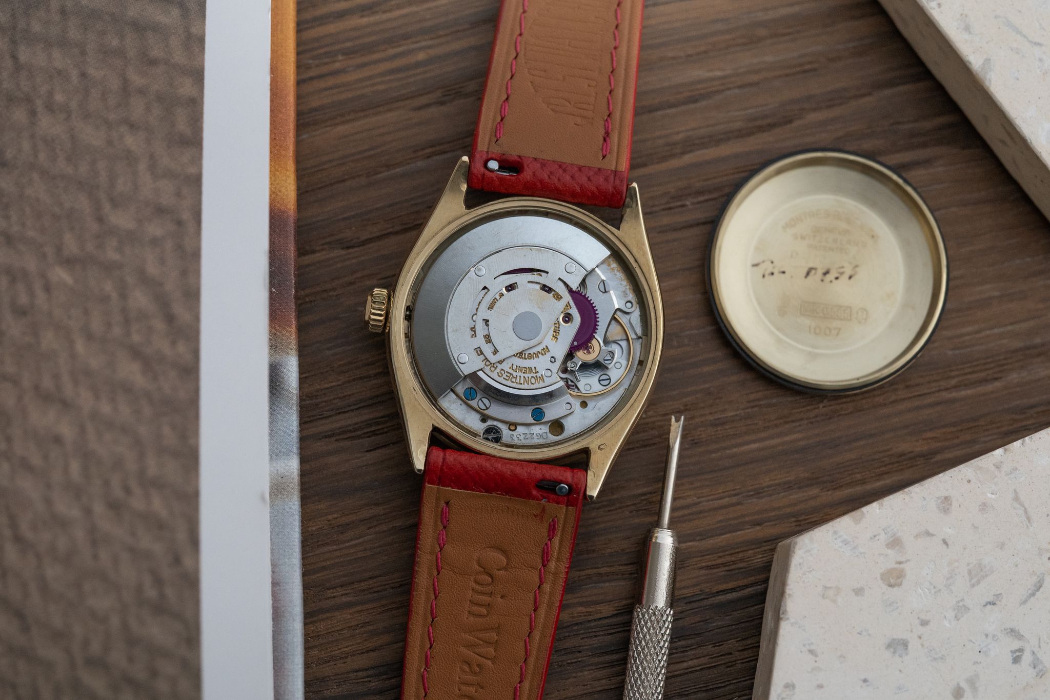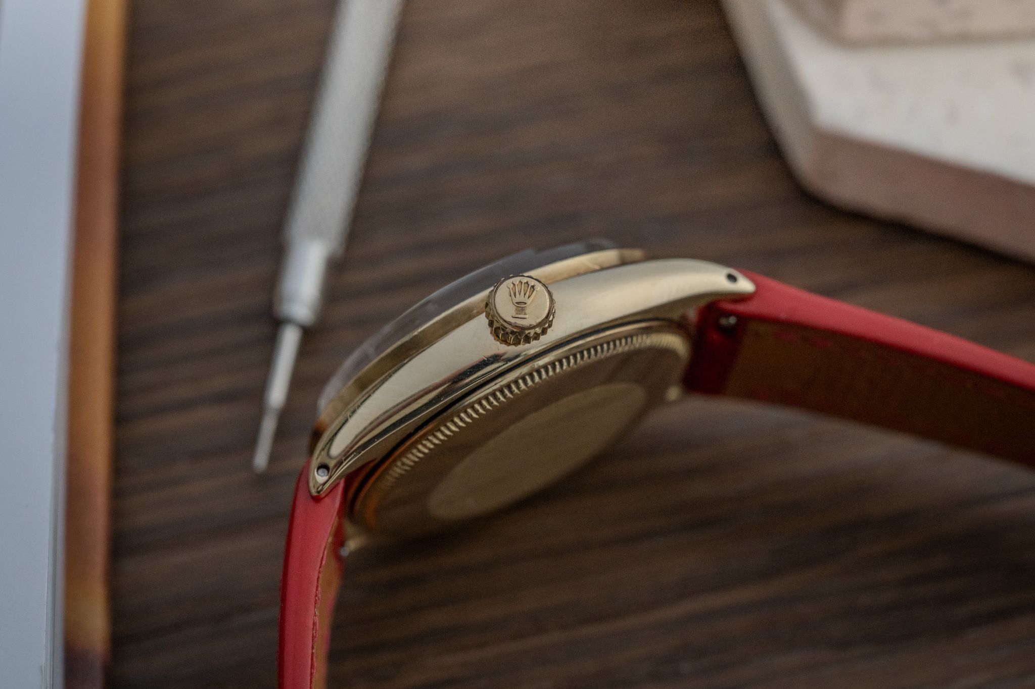 Complementing its luxurious gold construction, the bespoke red band introduces a bold and contemporary element to the design, creating a striking contrast that is guaranteed to turn heads. This unique pairing of classic refinement with modern flair ensures the Rolex Oyster Perpetual 1007 is not just a watch, but a statement piece for those who value individuality and sophistication.