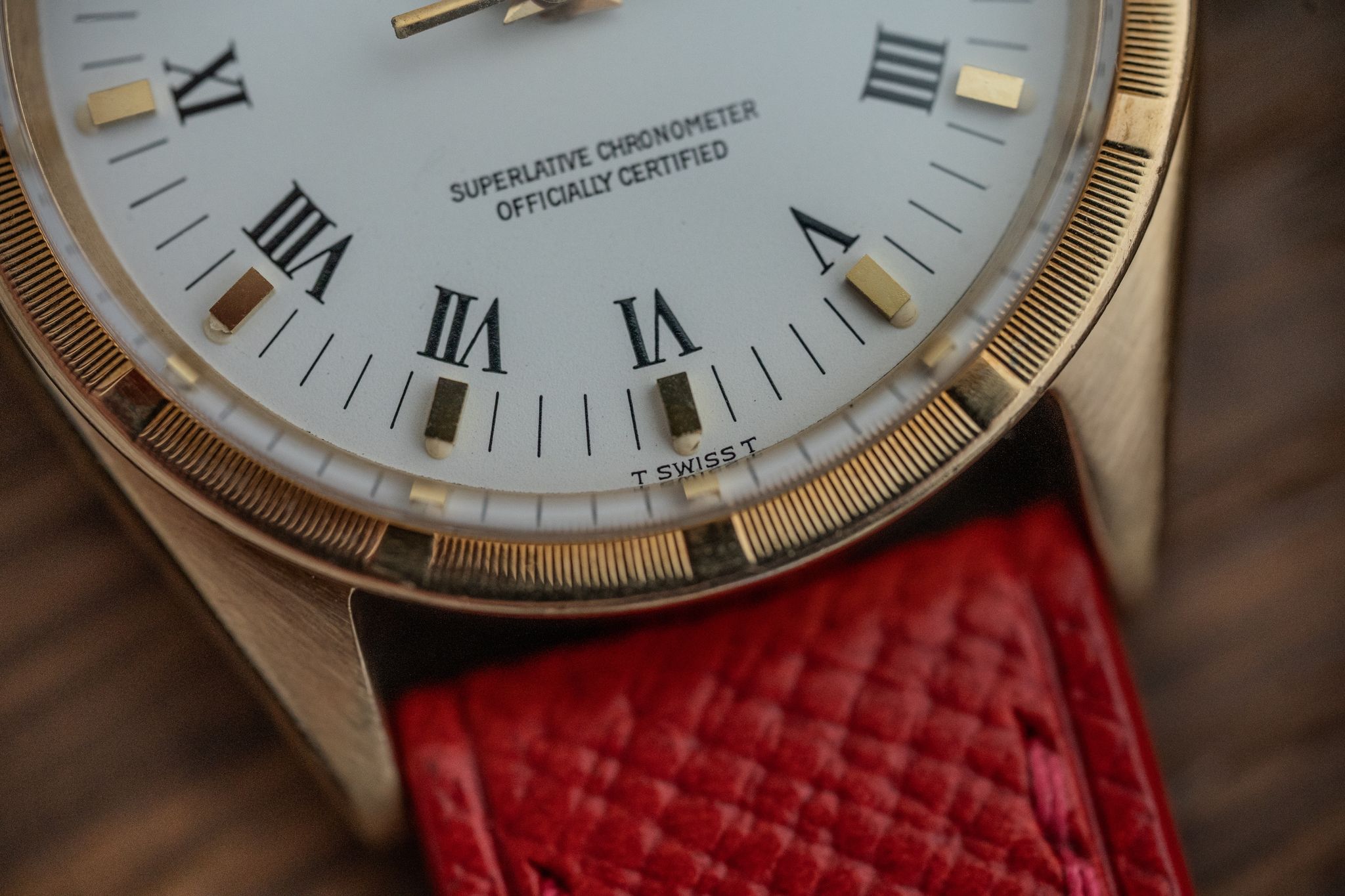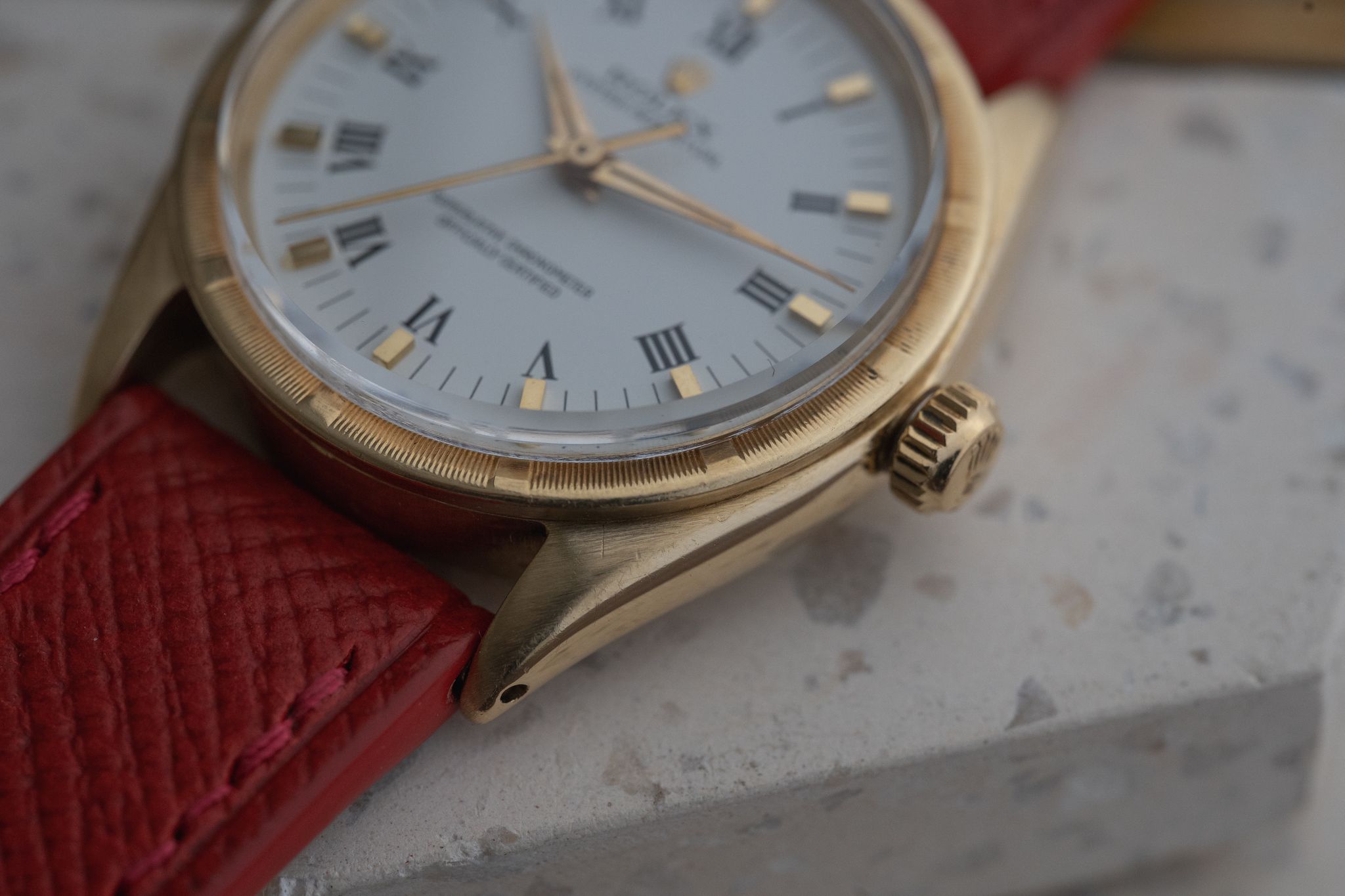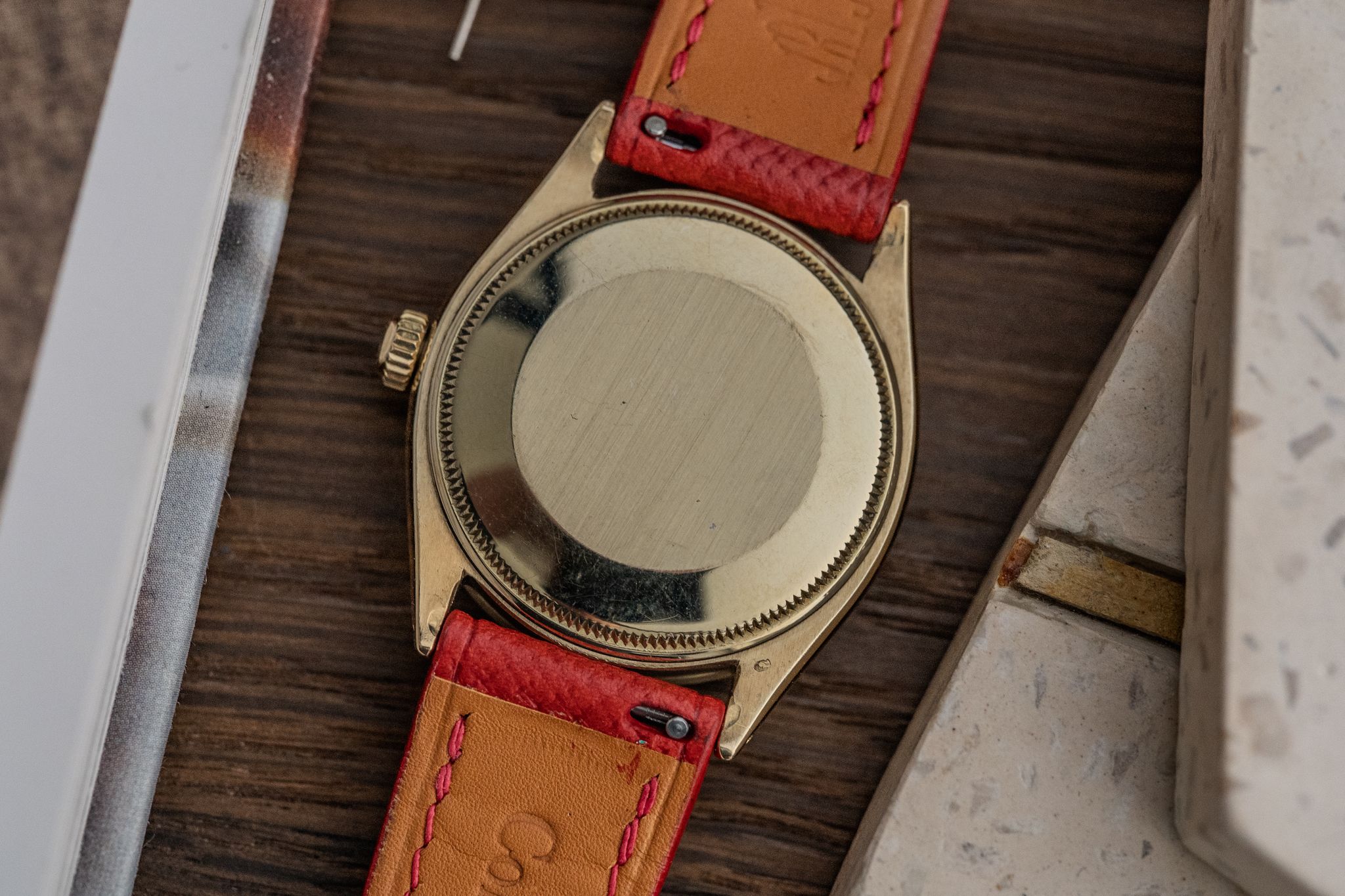 Complementing its luxurious gold construction, the bespoke red band introduces a bold and contemporary element to the design, creating a striking contrast that is guaranteed to turn heads. This unique pairing of classic refinement with modern flair ensures the Rolex Oyster Perpetual 1007 is not just a watch, but a statement piece for those who value individuality and sophistication.