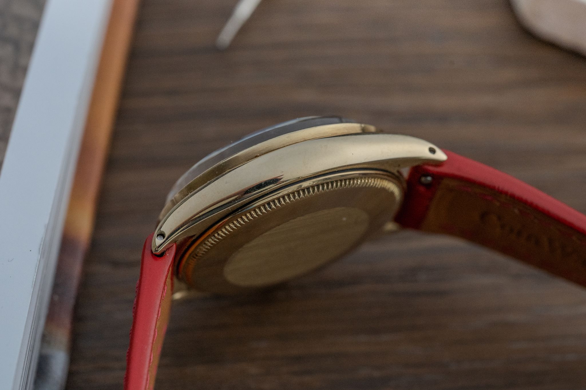 Case: 34mm solid 18 karat solid yellow gold case which shows honest signs of previous wear