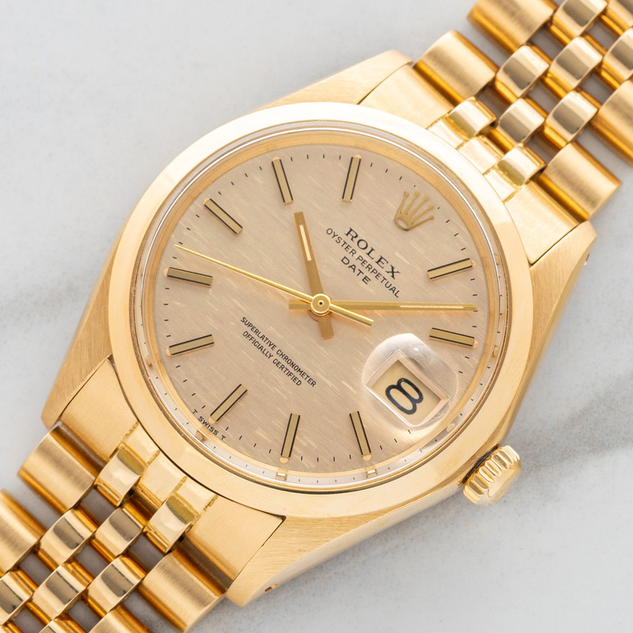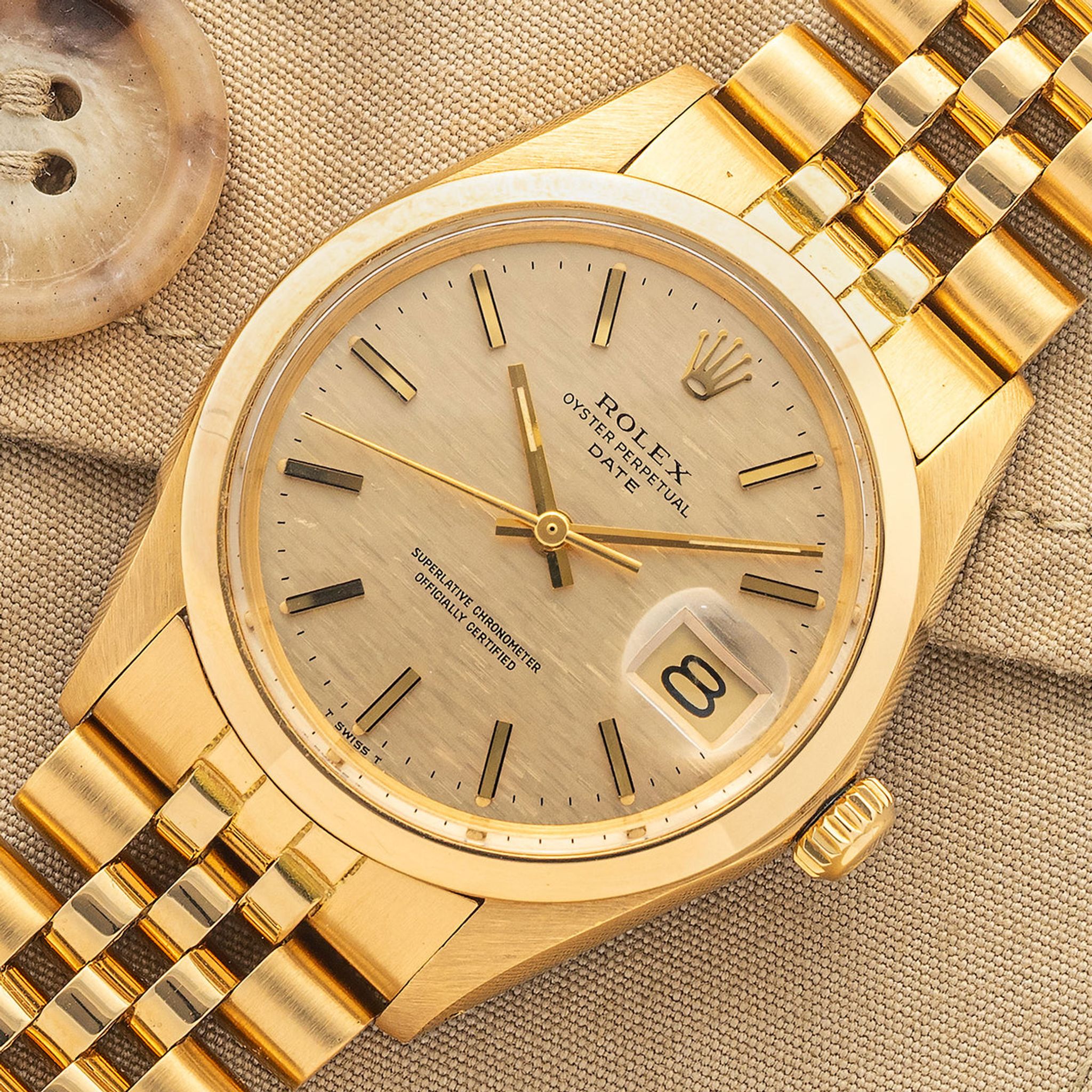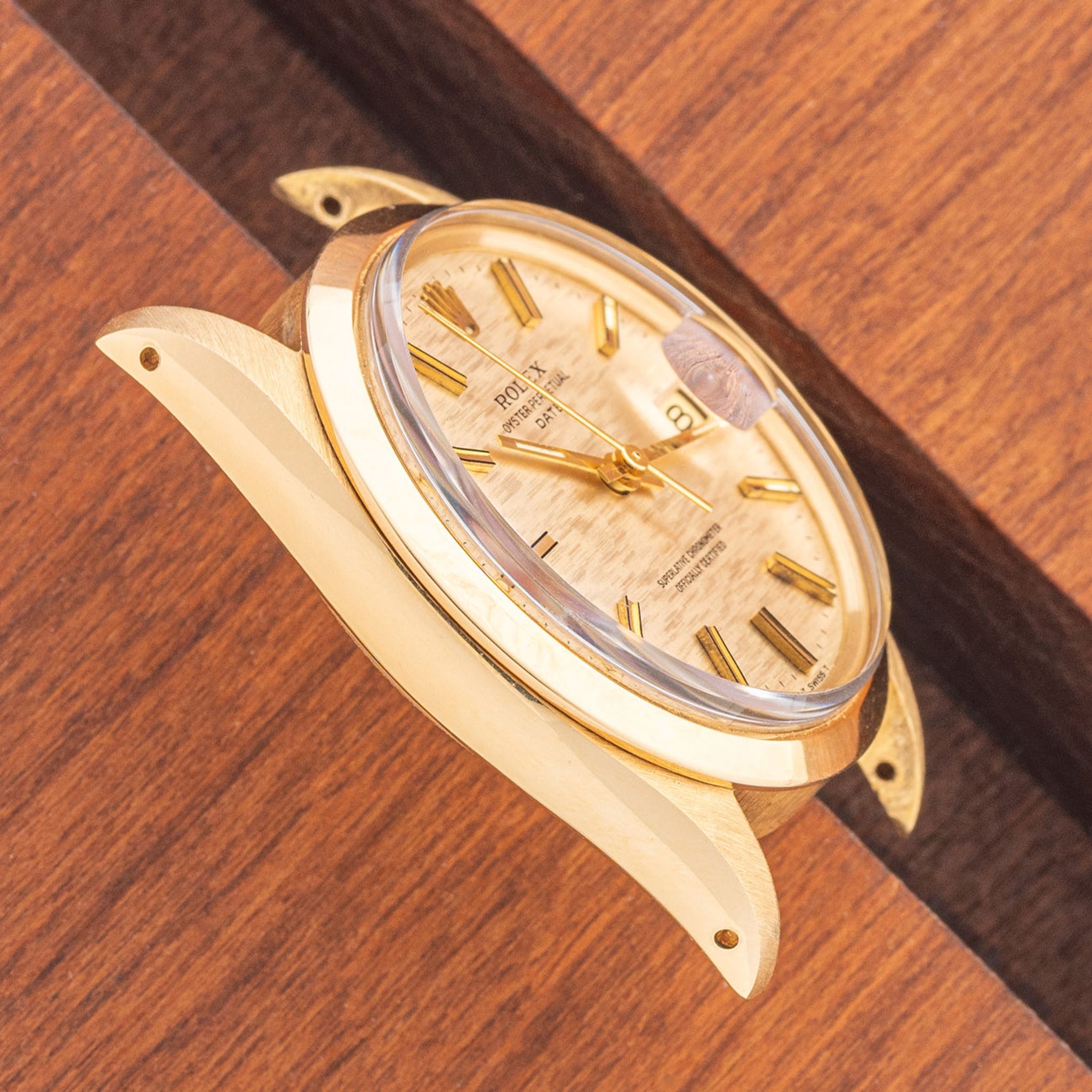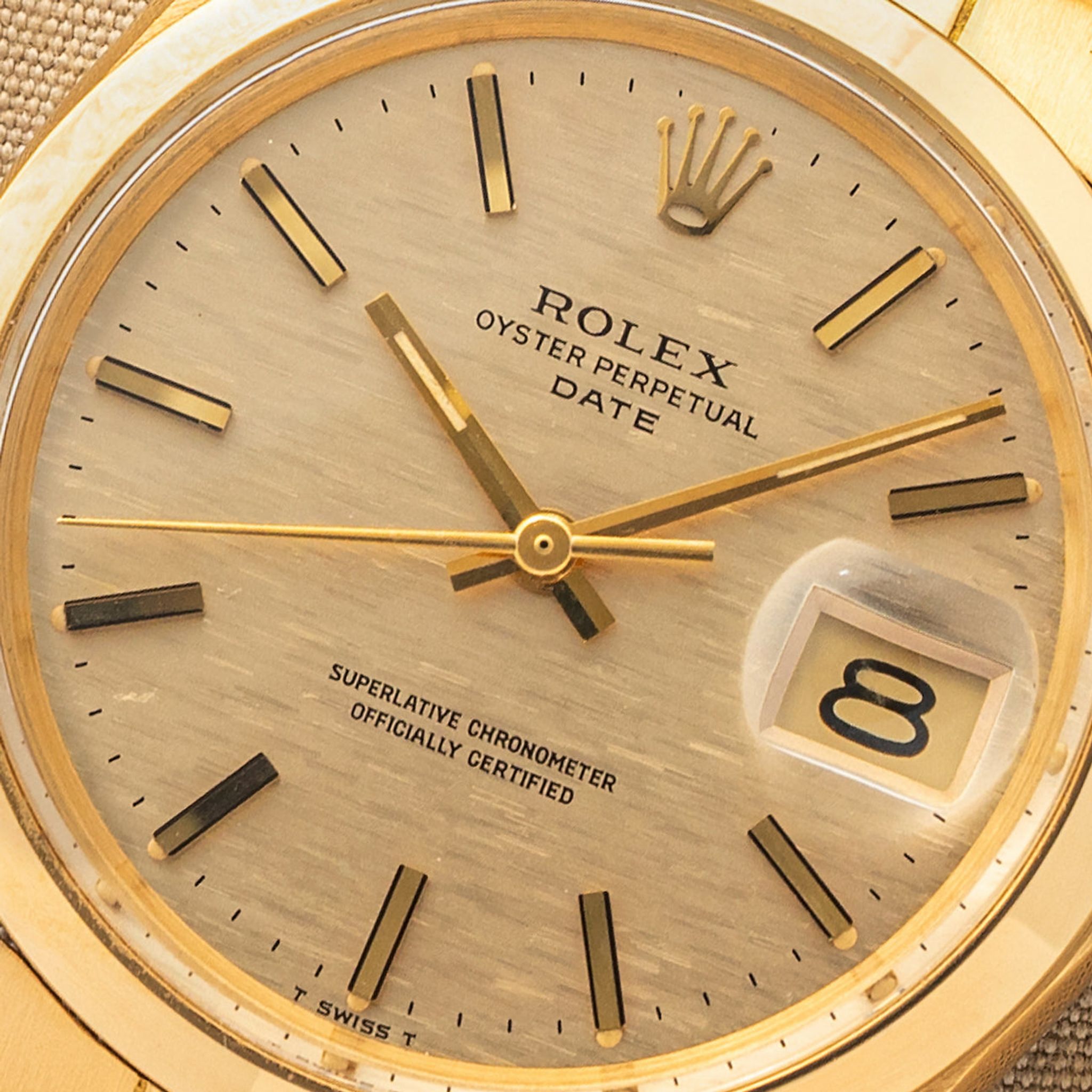 This particular 18k example, circa 1973 houses a rare "mosaic" gold dial which offers interesting character. This piece has remained in absolutely stunning vintage condition with a mint dial and unpolished case/bracelet. The ref. 1503 is a model we don't often see and this example is truly elevated by its rare dial variant. For anyone looking for a precious metal watch, this model does a good job of riding a line of opulence and being just toned down enough with its scale and age being vintage gold, which we prefer over the flashy polished and reflective surfaces of most modern pieces. It should also be noted that these vintage Rolex Date pieces are well suited for leather straps for more formal occasions. If you've been looking for a seldom seen Rolex in precious metal, don't overlook this stunning example.