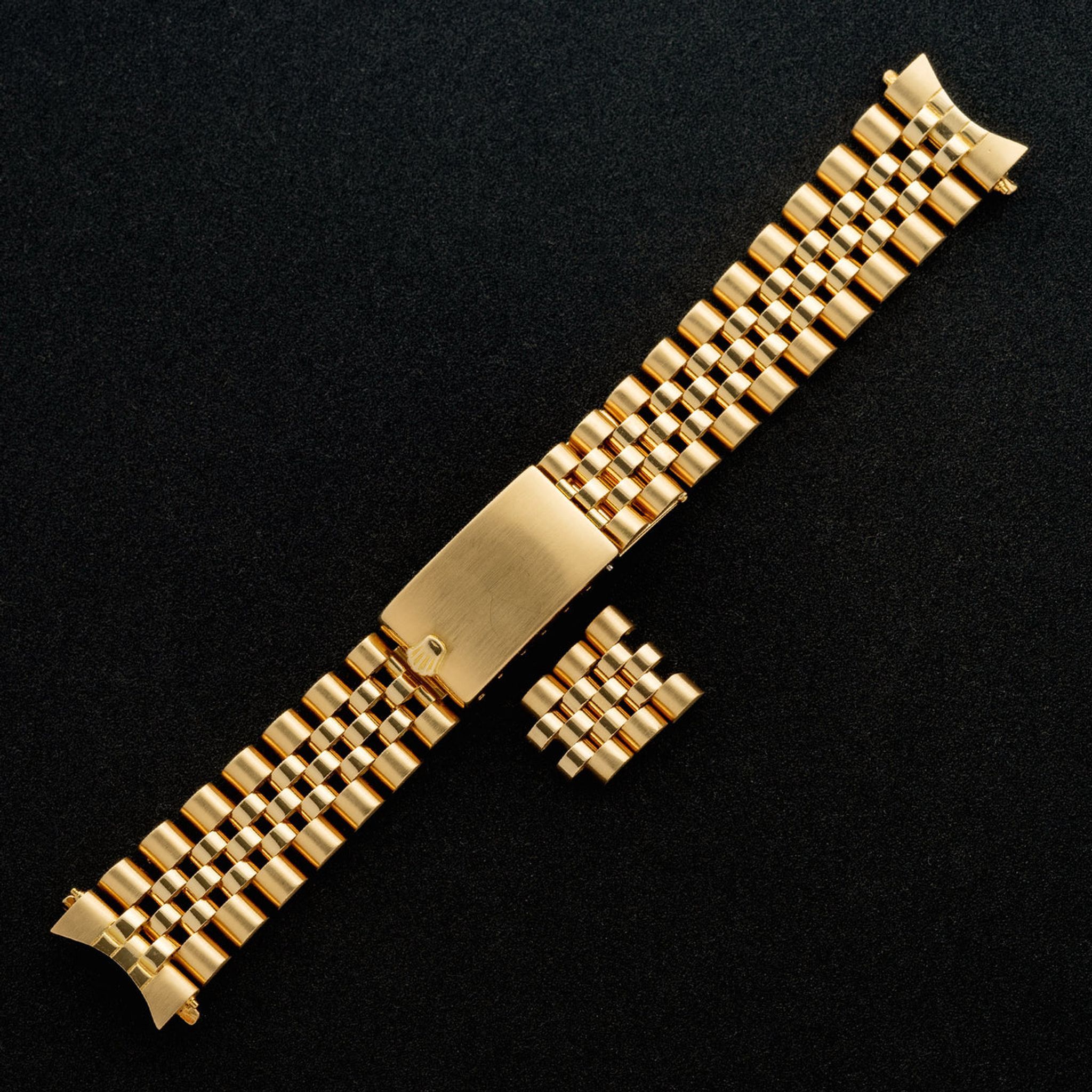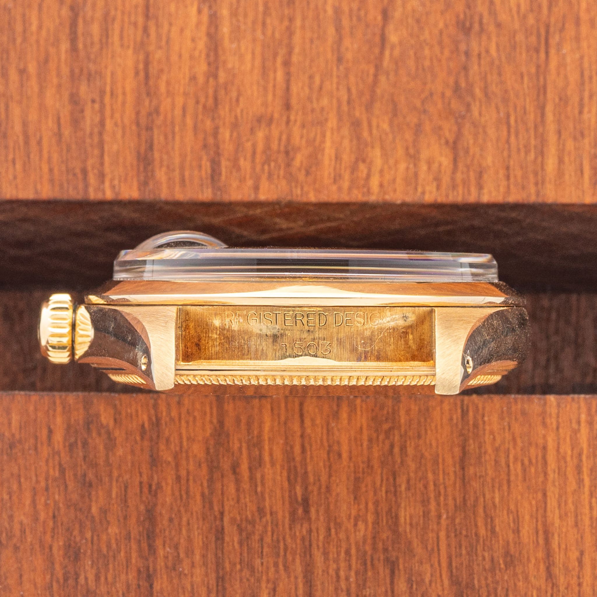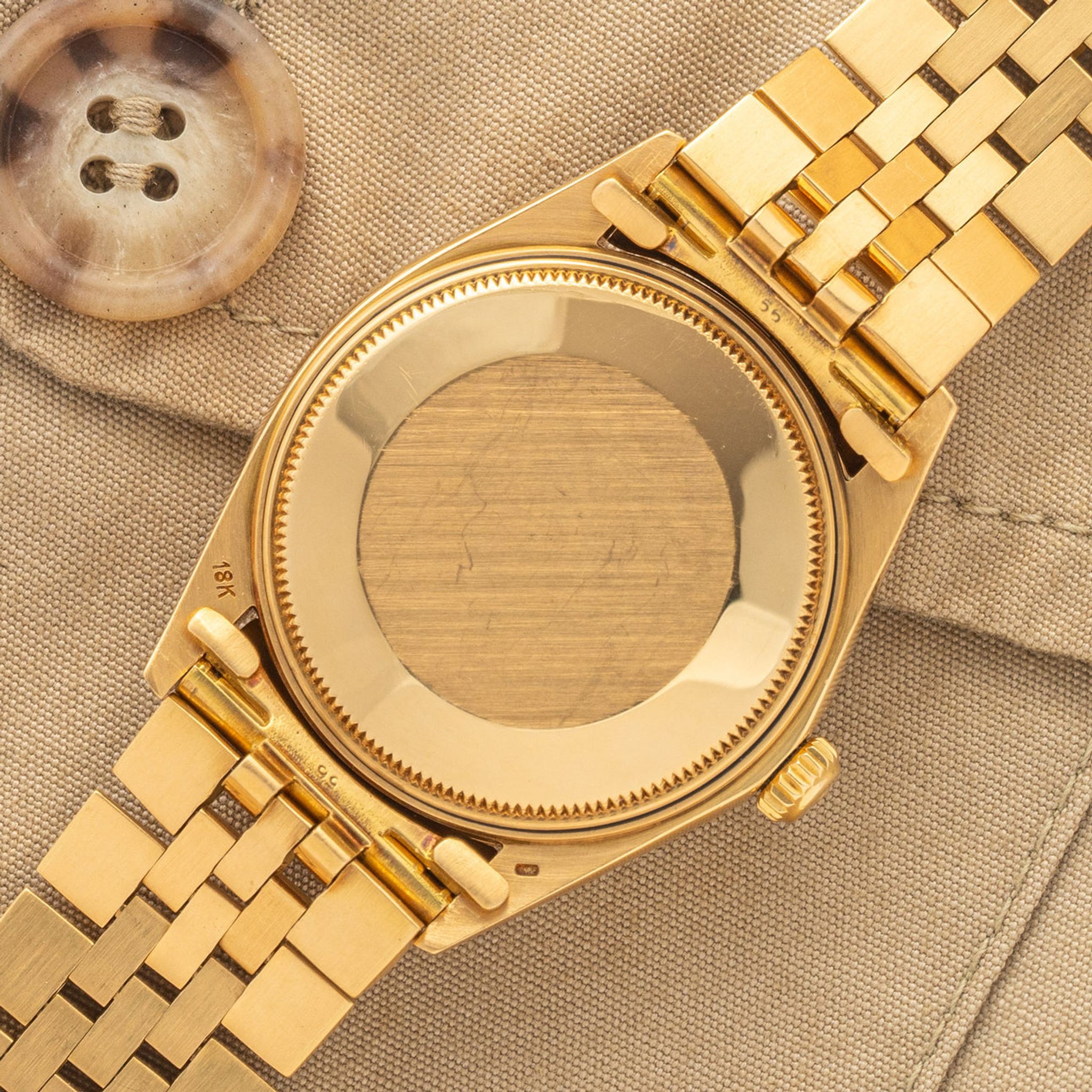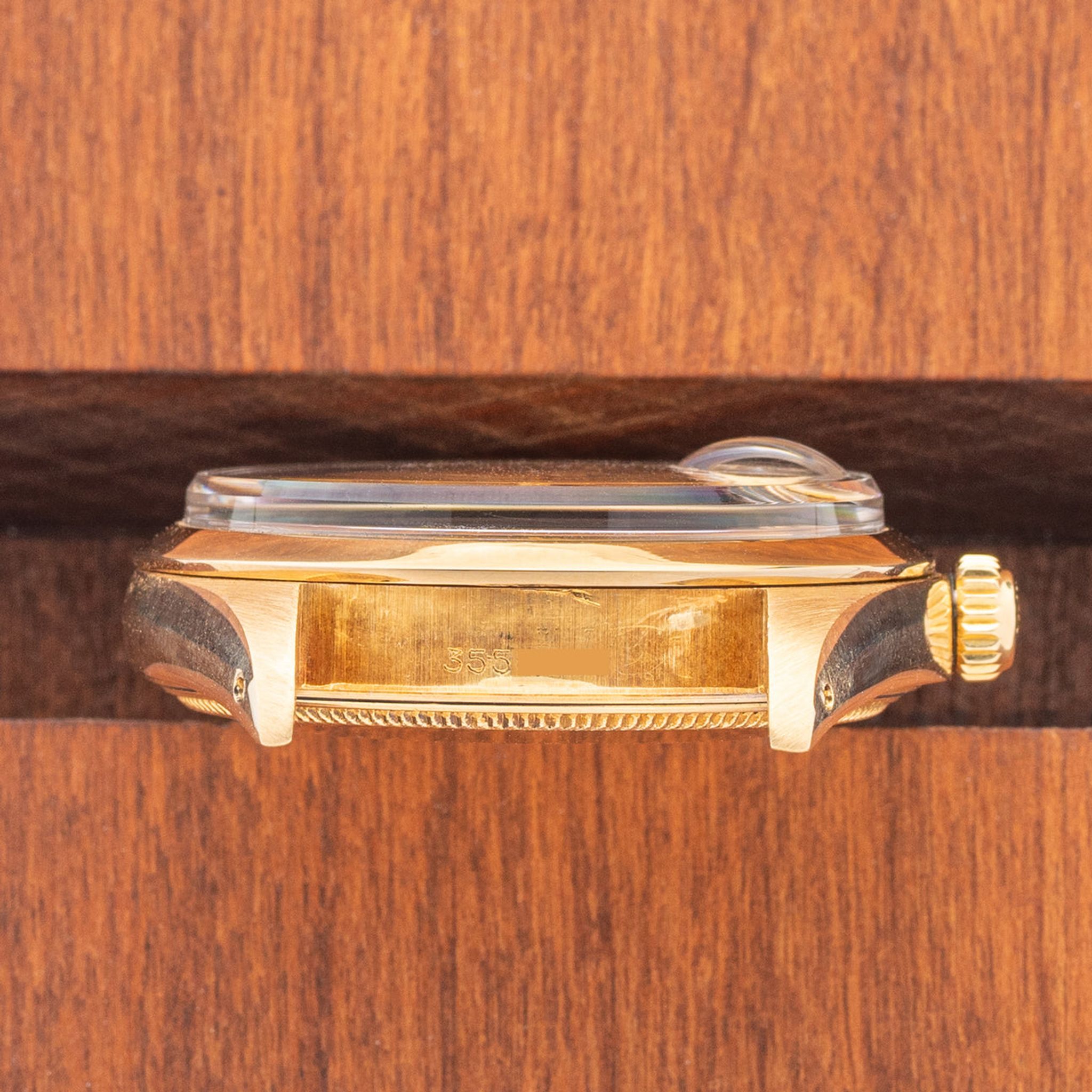 This particular 18k example, circa 1973 houses a rare "mosaic" gold dial which offers interesting character. This piece has remained in absolutely stunning vintage condition with a mint dial and unpolished case/bracelet. The ref. 1503 is a model we don't often see and this example is truly elevated by its rare dial variant. For anyone looking for a precious metal watch, this model does a good job of riding a line of opulence and being just toned down enough with its scale and age being vintage gold, which we prefer over the flashy polished and reflective surfaces of most modern pieces. It should also be noted that these vintage Rolex Date pieces are well suited for leather straps for more formal occasions. If you've been looking for a seldom seen Rolex in precious metal, don't overlook this stunning example.