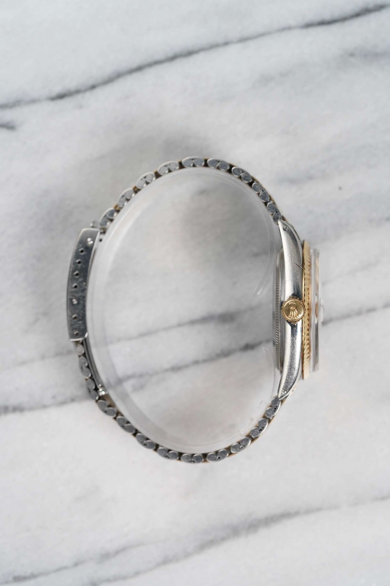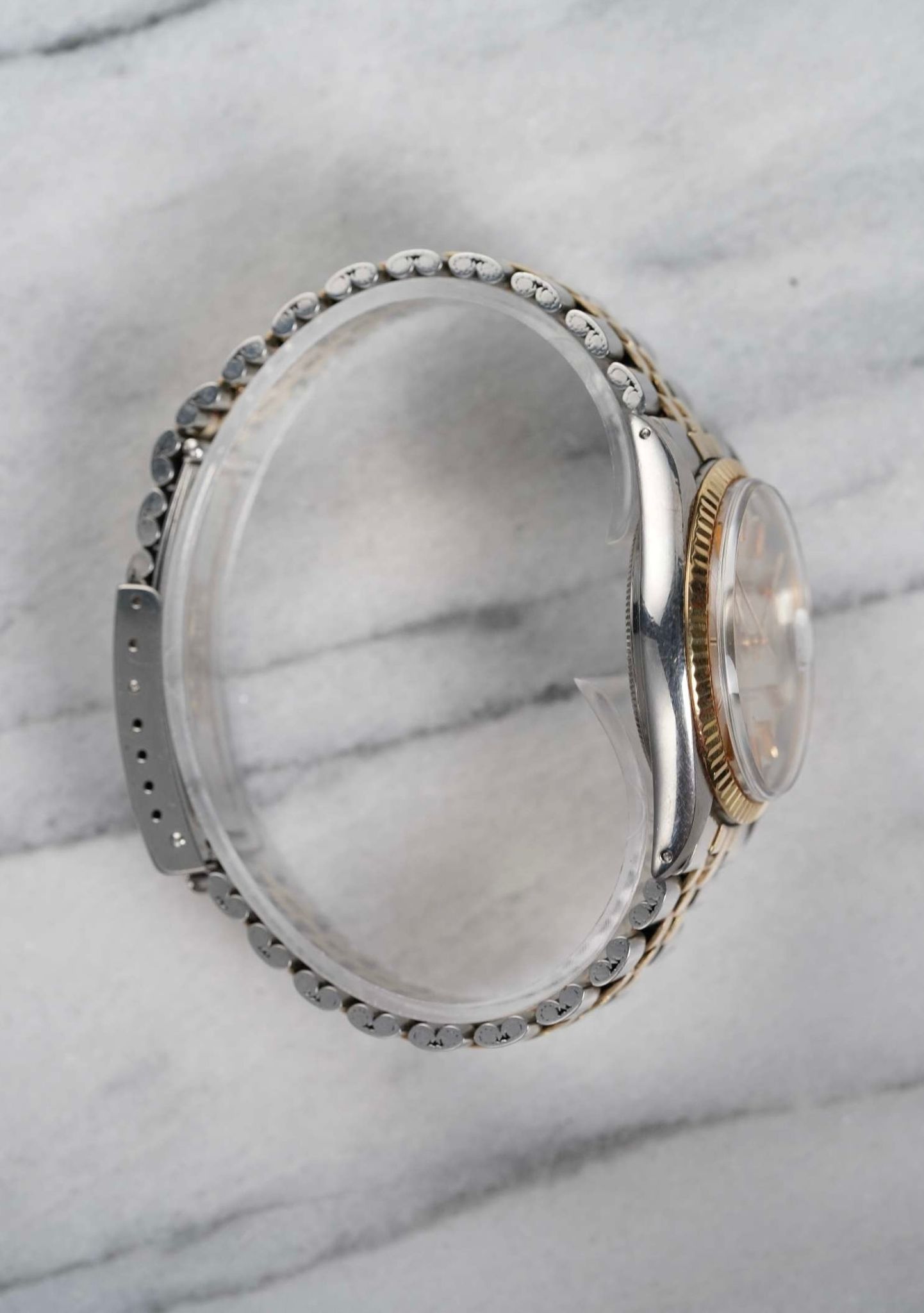 Here's a vintage Rolex Datejust reference two tone 1601 automatic with a clean champagne dial on a jubilee bracelet from the 70s. Keeps great time and is fully functional. Measurements include a 36mm oyster case and 20mm lug width. It's on a Rolex jubilee bracelet that fits up to a 7.25 inch wrist. Time and non-quick date function at 3 a clock. 18K yellow gold bezel. Steel case and caseback. Matching gold hands and hour markers. Drilled lug holes. Both the dial and crystal are free from any scratches or marks. All parts are original including the signed Rolex crown, dial, movement, and caseback. Both the dial and case are in great cosmetic, untouched condition.