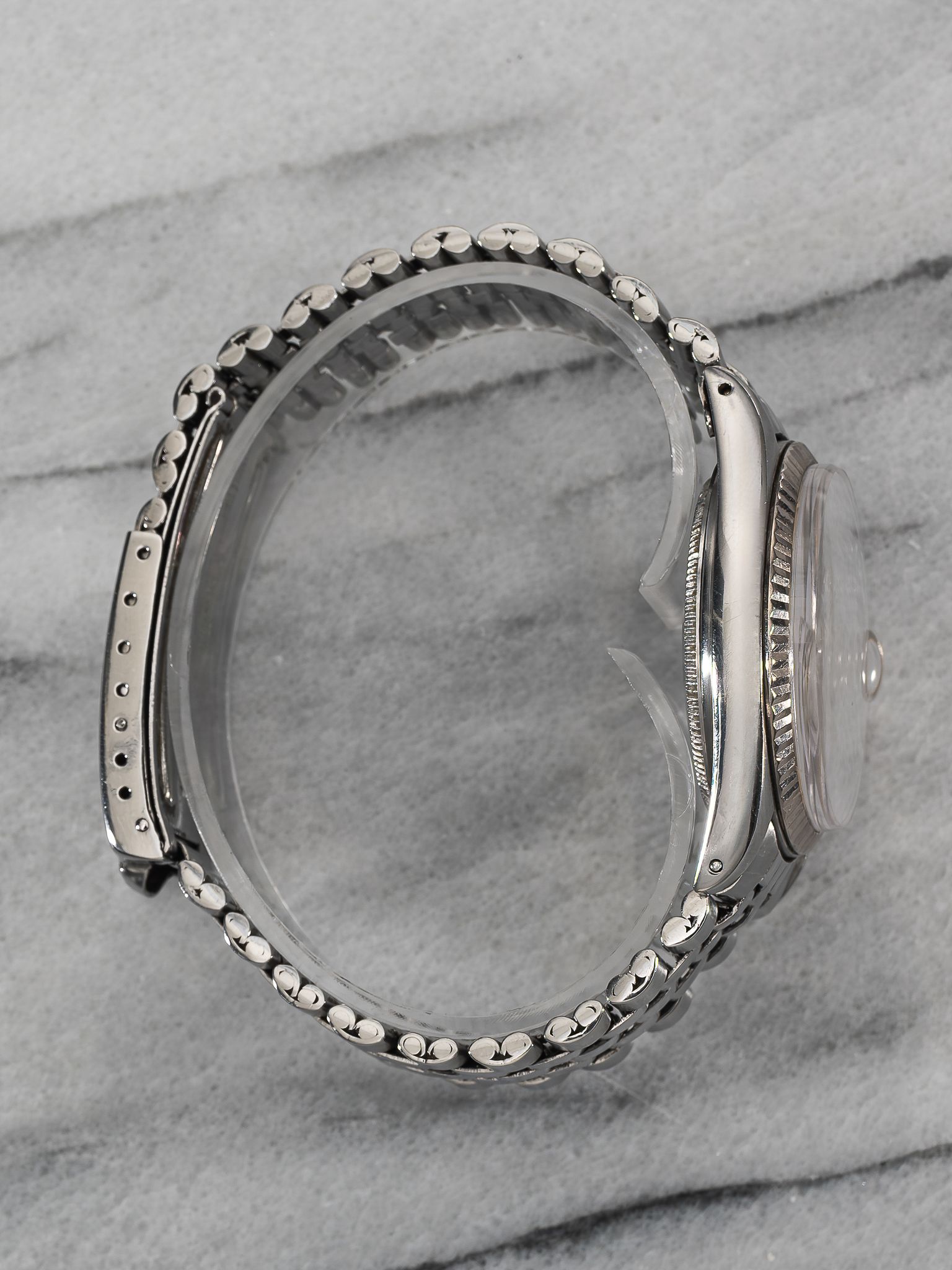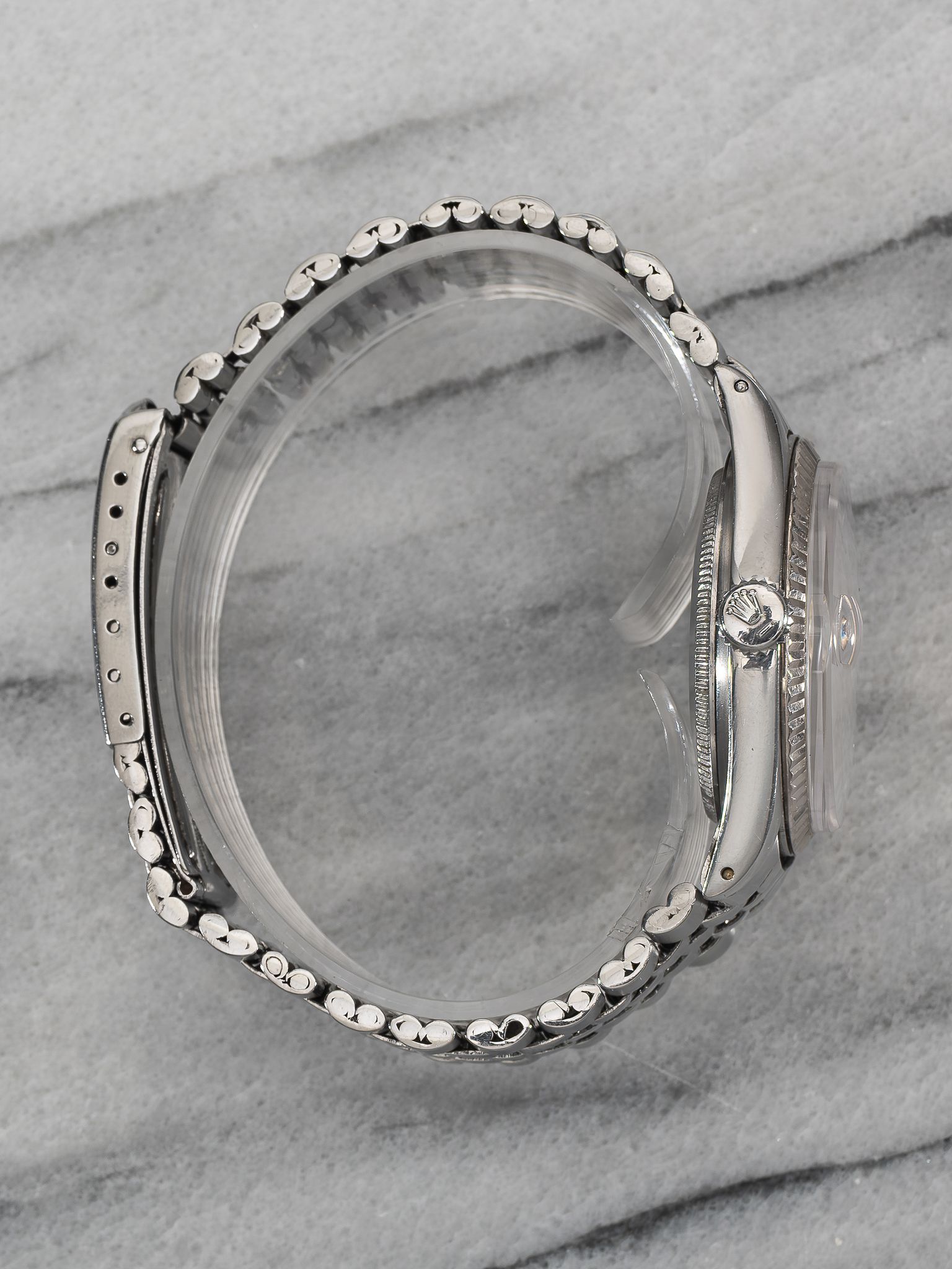 Here's a vintage Rolex Datejust reference 1601 (white gold bezel) automatic from the 1960s with a silver patina no lume dial (the dial discolored due to age). Non quickset date function at 3 a clock. Measurements include a 36mm case and 20mm lug width. Bracelet fits up to a 7.25 inch wrist. All parts including the crown, dial, movement, and caseback are original.