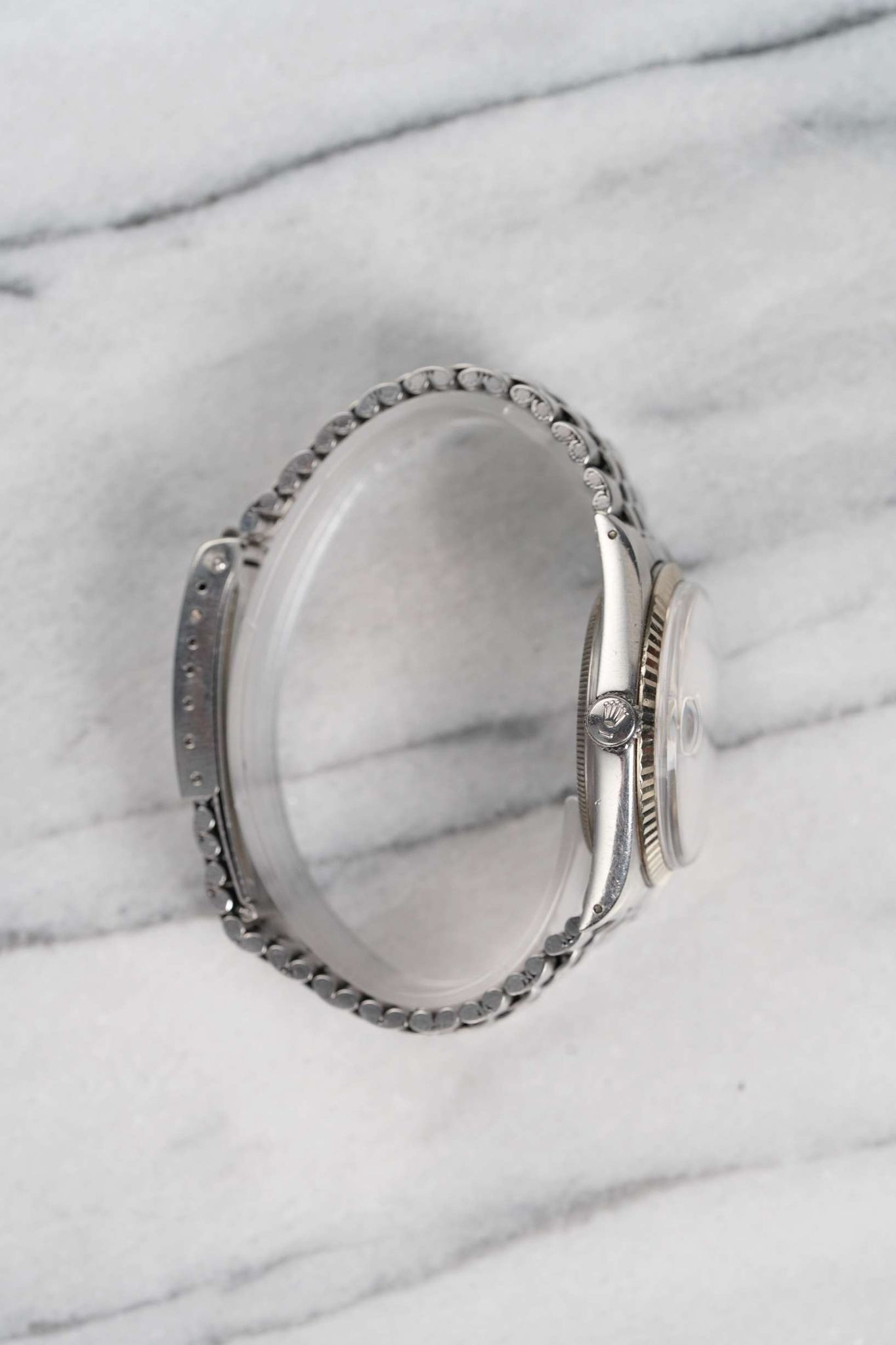 Here's a vintage Rolex Datejust reference number 1601 (white gold bezel) with a silver dial from the 70s. Keeps great time and is fully functional. Measurements include a 36mm oyster case and 20mm lug width. It's on a heavy jubilee bracelet that fits up to a 7.25 inch wrist (55 endlinks, 62510H code on clasp). The bracelet is rather tight for its age, in great shape. Features include the non quickset date function at 3 a clock. Drilled lug holes. The lume in both the hands and lume plots developed a nice matching yellow patina. A nice cream color hue as seen in the dial. Stainless steel case and caseback. All parts are original including the signed Rolex crown, case back, dial, and movement. The dial and case are in great cosmetic, untouched condition.