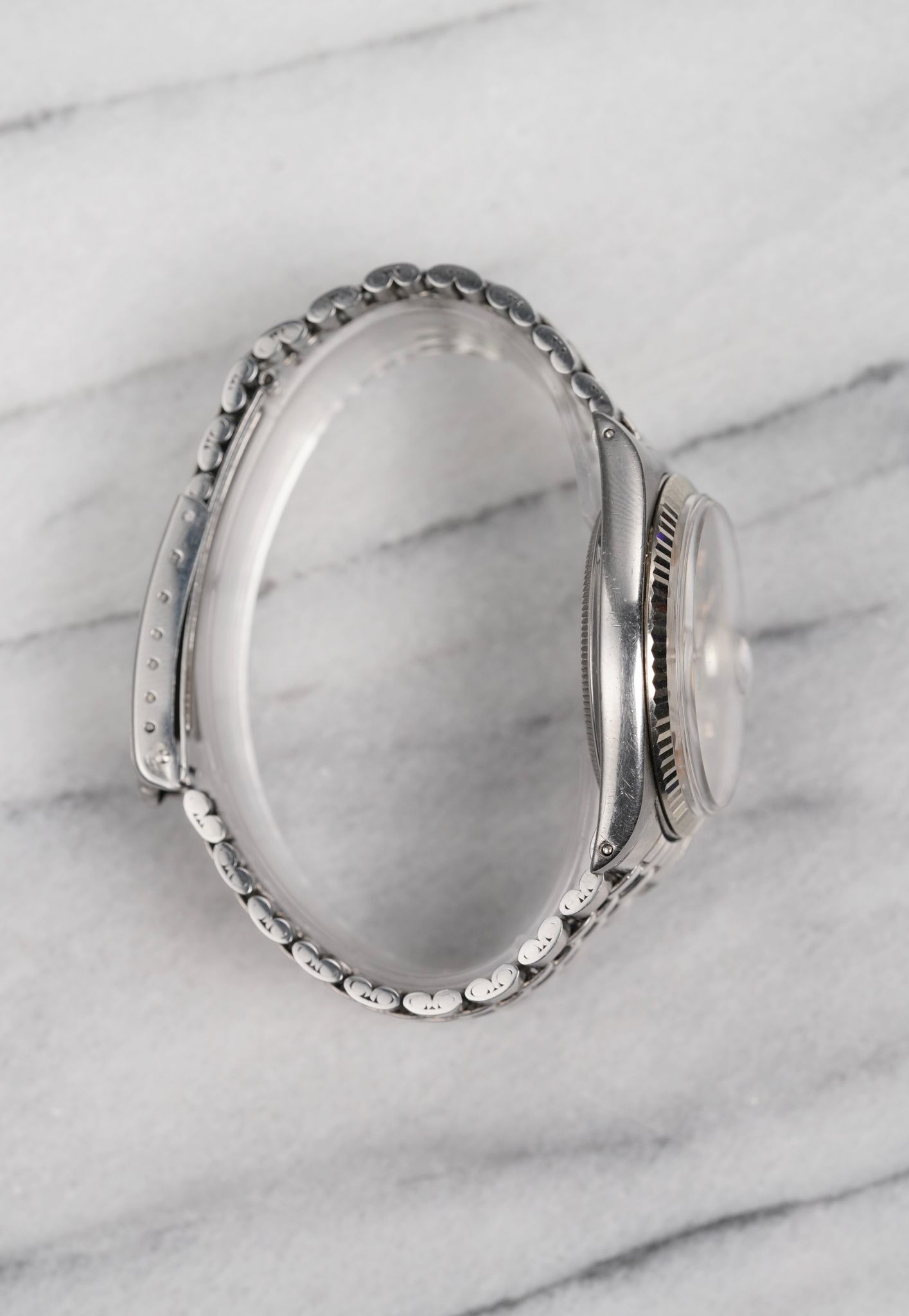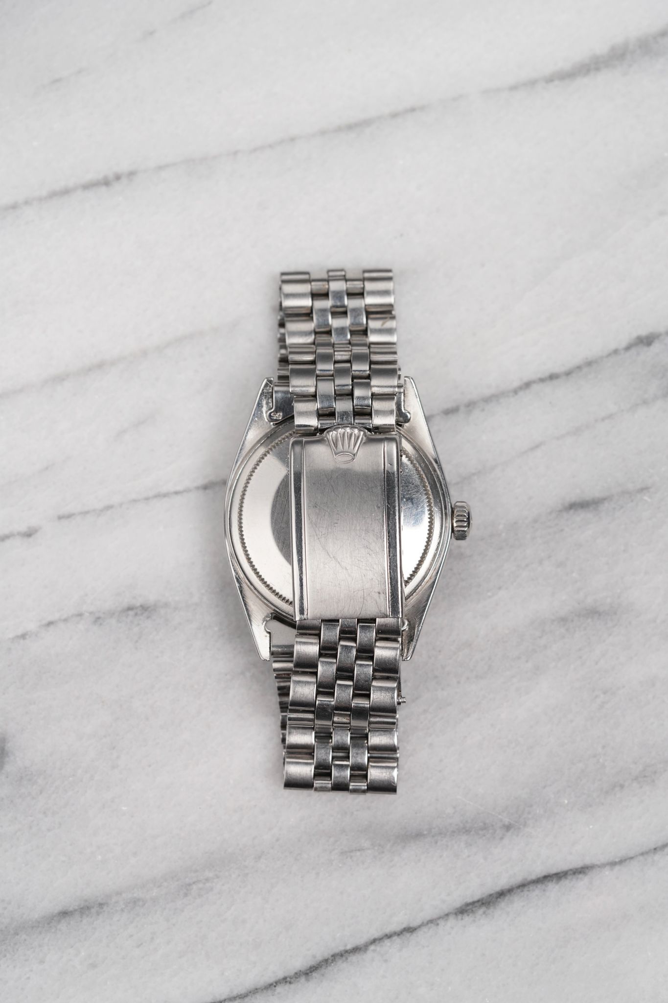 Here's a vintage Rolex Datejust reference 1601 automatic with a clean silver linen sigma dial on a jubilee bracelet from the 70s. Keeps great time and is fully functional. Measurements include a 36mm oyster case and 20mm lug width. It's on a Rolex jubilee bracelet (55 endlinks) that fits up to a 7 inch wrist. Time and non-quick date function at 3 a clock. Clean silver linen dial and white gold bezel bezel. Steel case and caseback. The lume in both the hands and lume plots developed a slight yellow patina. Drilled lug holes. Both the dial and crystal are free from any scratches or marks. All parts are original including the signed Rolex crown, dial, movement, and caseback. Both the dial and case are in great cosmetic, untouched condition.