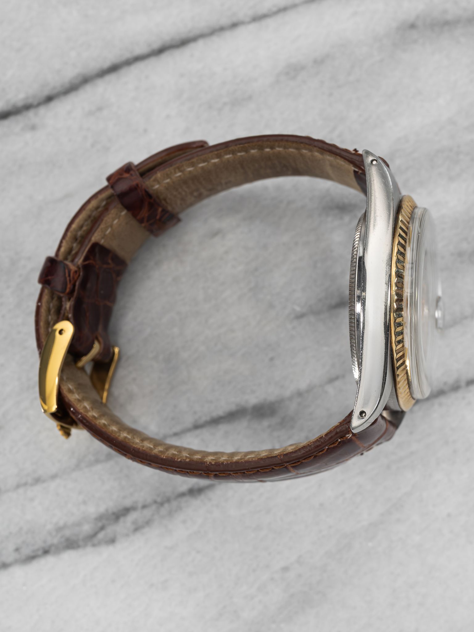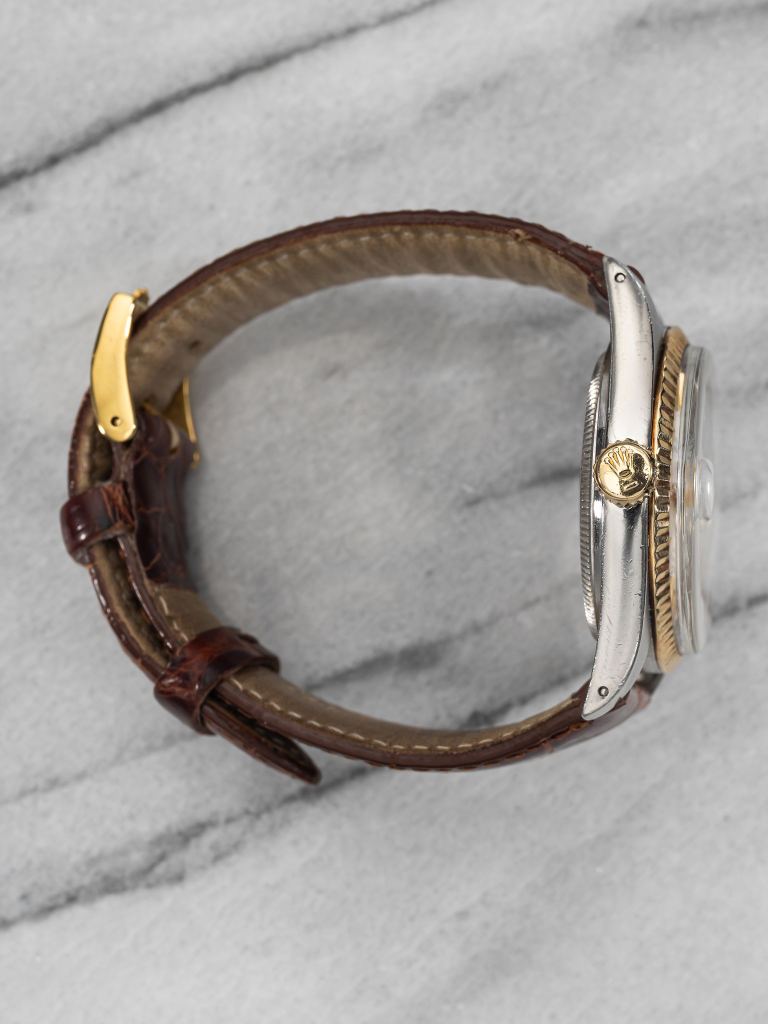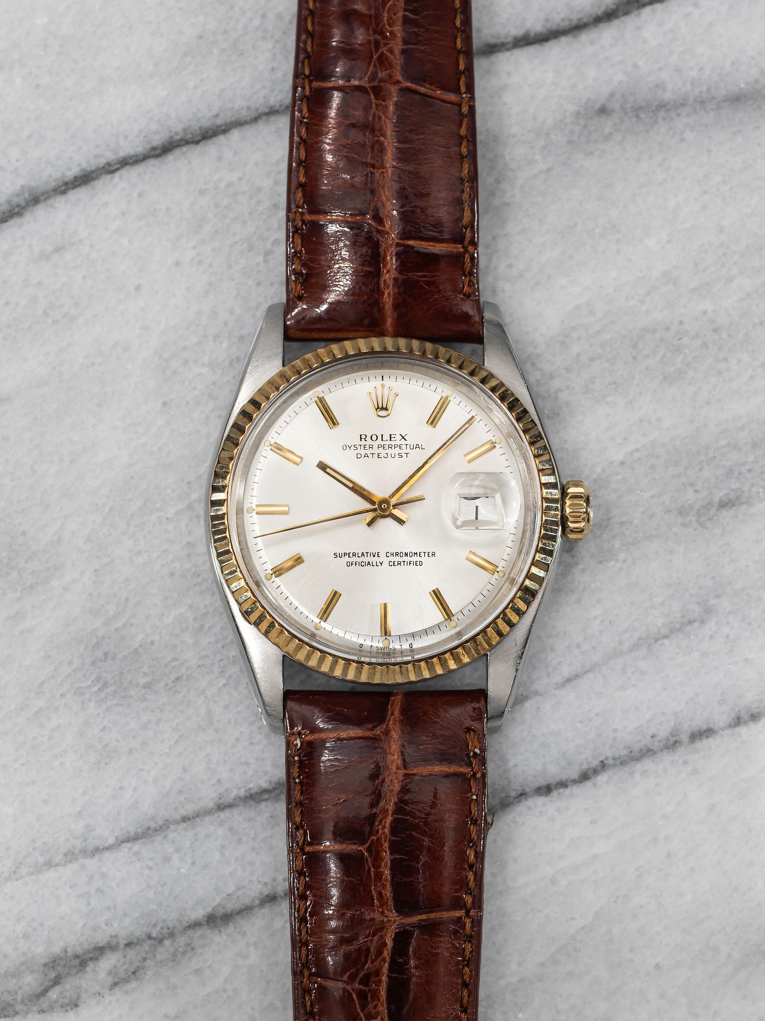 Here's a vintage Rolex Datejust reference 1601 two tone automatic (yellow gold bezel) with a silver sigma dial from the 1970s. Non quickset date function at 3 a clock. Measurements include a 36mm case and 20mm lug width. On an aftermarket brown leathrer strap and signed buckle. Sigma dial indicating that the hands and hour markers are made of gold. All parts including the crown, dial, movement, and caseback are original.