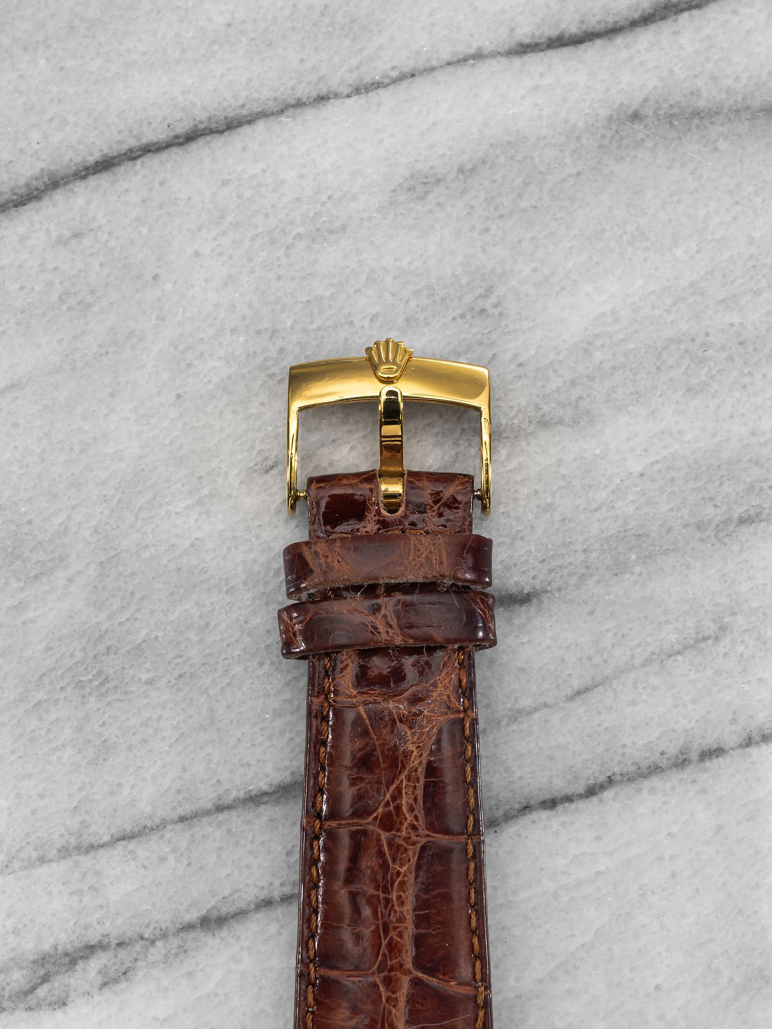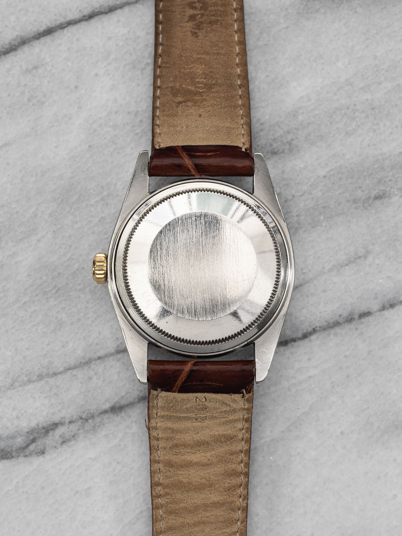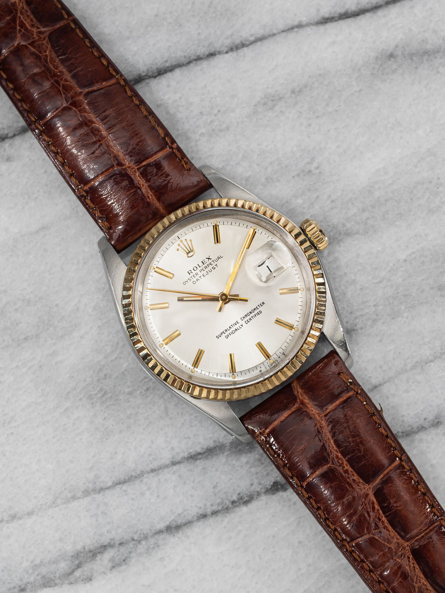Here's a vintage Rolex Datejust reference 1601 two tone automatic (yellow gold bezel) with a silver sigma dial from the 1970s. Non quickset date function at 3 a clock. Measurements include a 36mm case and 20mm lug width. On an aftermarket brown leathrer strap and signed buckle. Sigma dial indicating that the hands and hour markers are made of gold. All parts including the crown, dial, movement, and caseback are original.