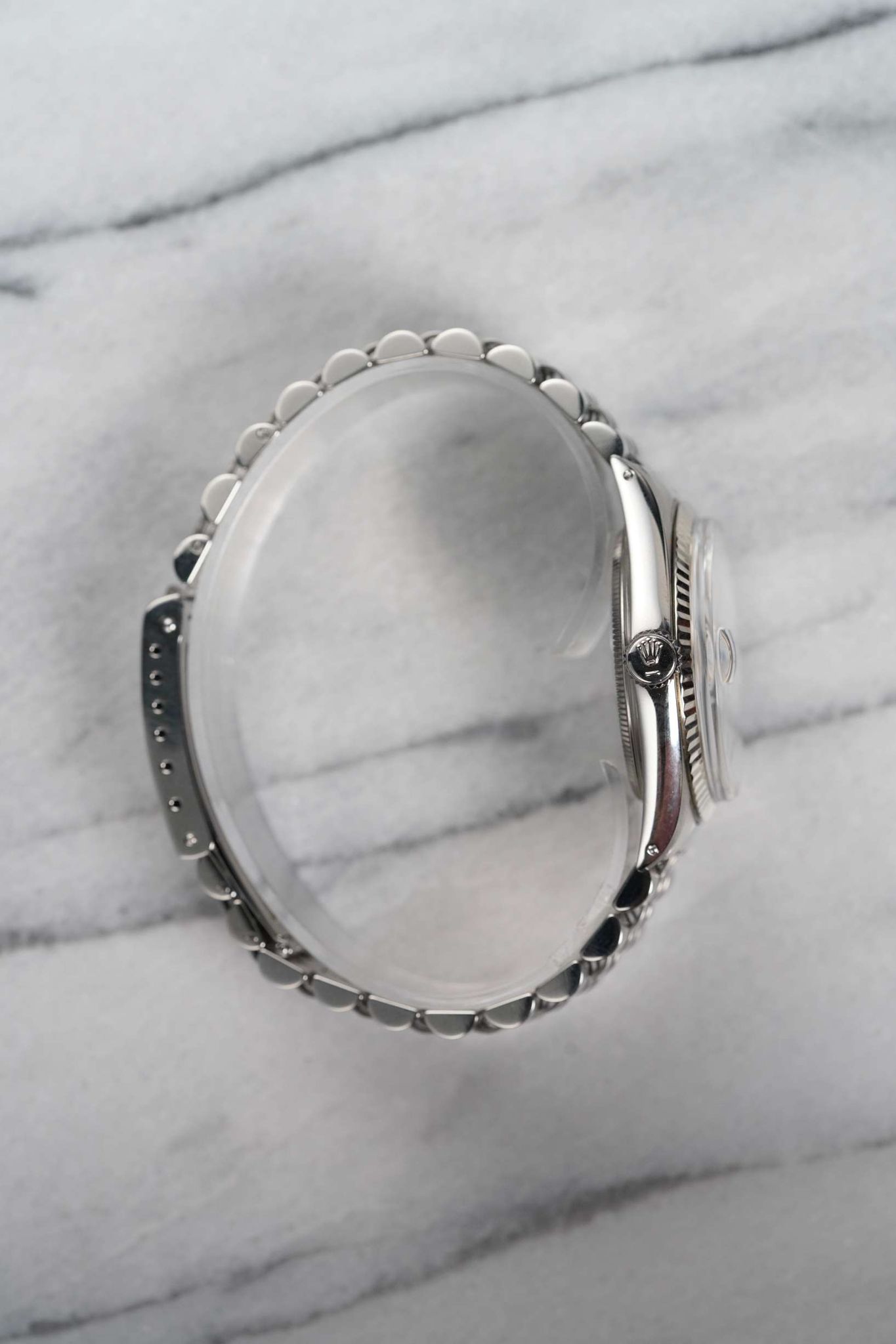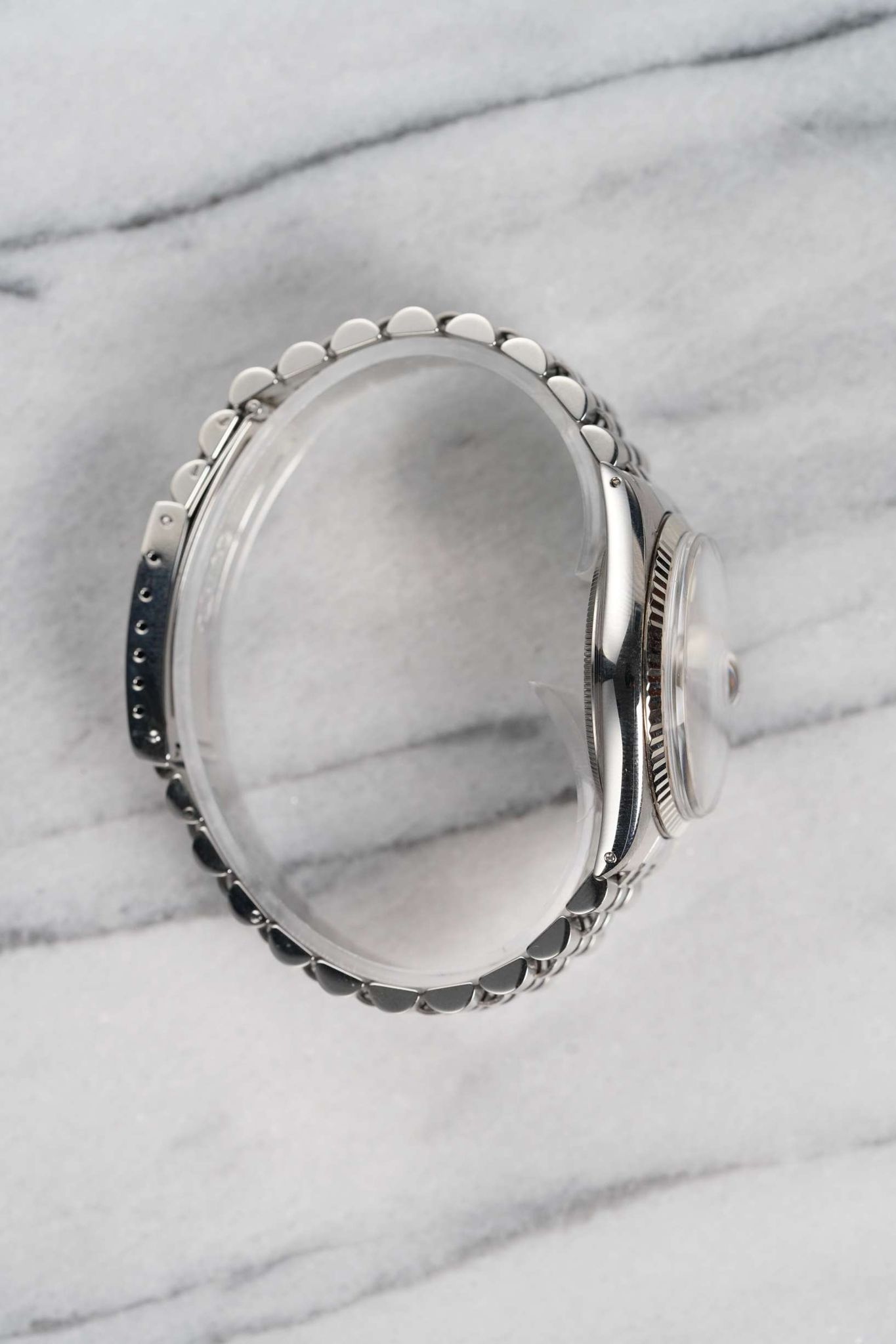 Here’s a vintage Rolex Datejust reference 1601 automatic with a white dial from the 1970s. 36mm stainless steel case with smooth bezel. Fitted on its heavy jubilee bracelet, sized to fit up to a 7.25 inch wrist. Time and non-quickset date function at 3 o’clock. Original dial, case, movement, and crown. Fully functional and keeping time.