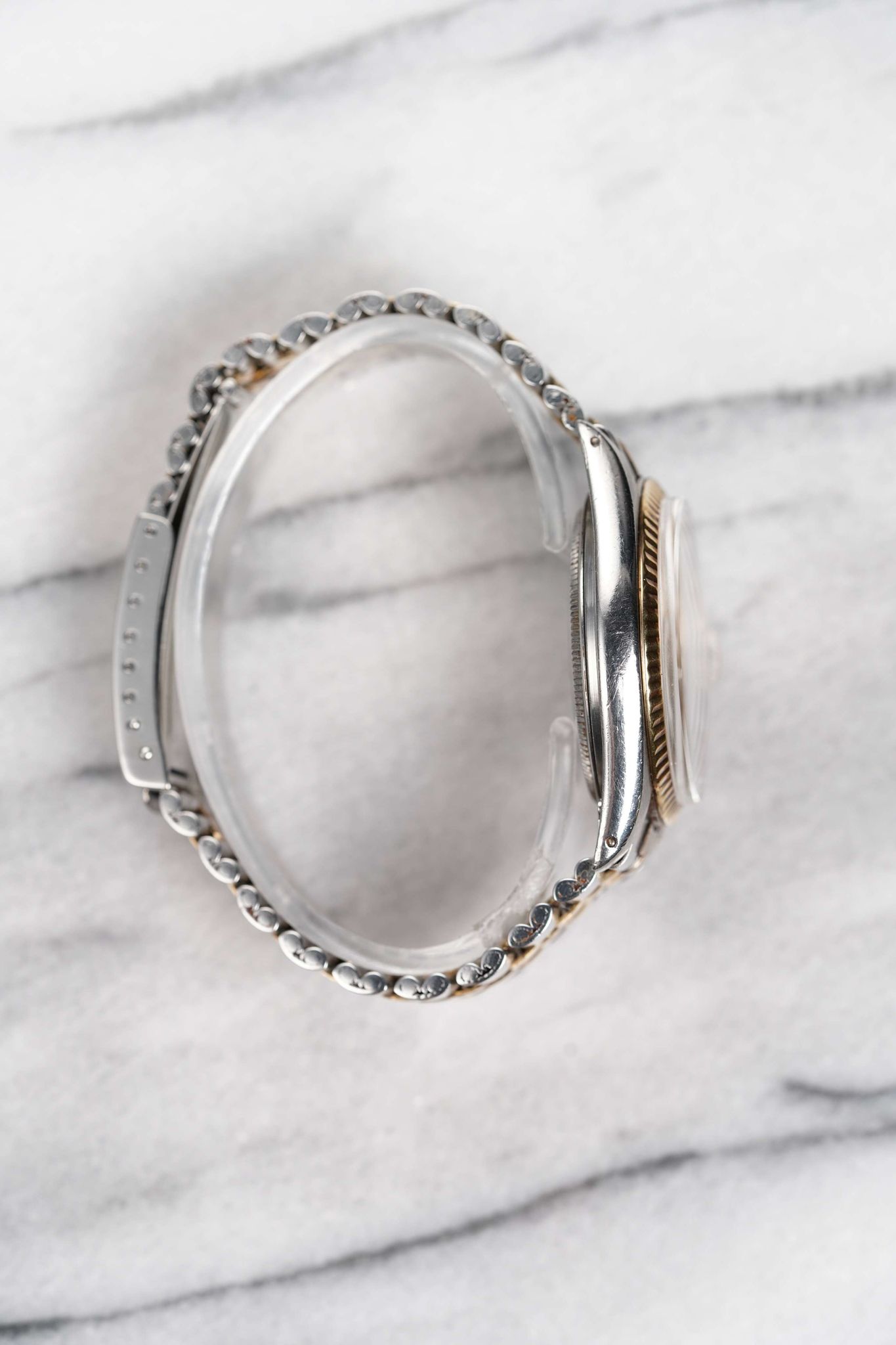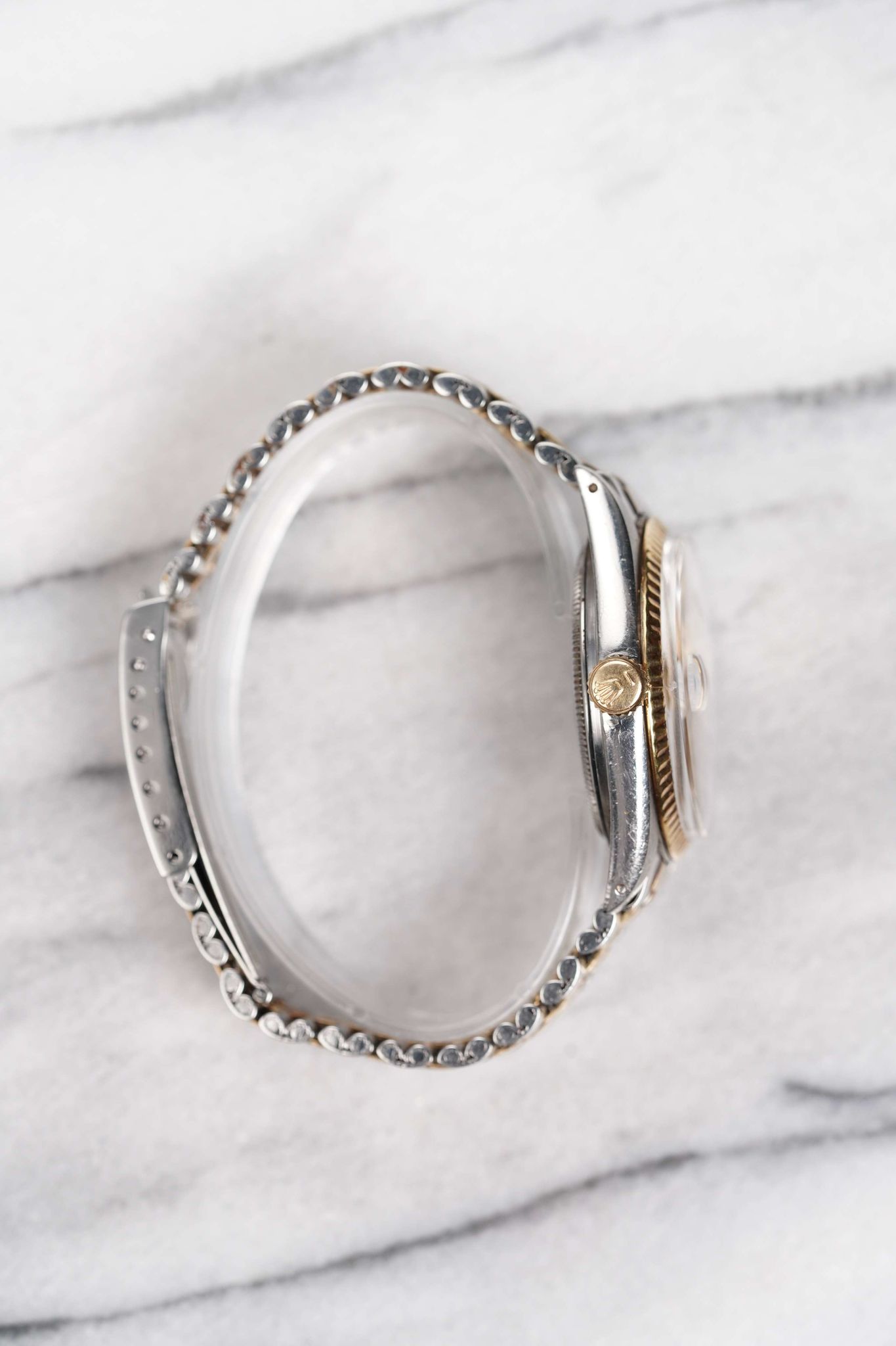 Here's a vintage Rolex Datejust reference two tone 1601 automatic with a clean champagne wideboy (thicker hands and hour markers) sigma dial on a jubilee bracelet from the 70s. Keeps great time and is fully functional. Measurements include a 36mm oyster case and 20mm lug width. It's on a Rolex jubilee bracelet that fits up to a 7 inch wrist. The bracelet is in great shape for its age. Time and non-quick date function at 3 a clock. Clean champagne dial and 18K yellow gold bezel. Steel case and caseback. The lume in both the hands and lume plots developed a nice matching patina. Drilled lug holes. Sigma marking at 6 a clock indicates that the hands and hour markers are made of gold. Both the dial and crystal are free from any scratches or marks. All parts are original including the signed Rolex crown, dial, movement, and caseback. Both the dial and case are in great cosmetic, untouched condition.