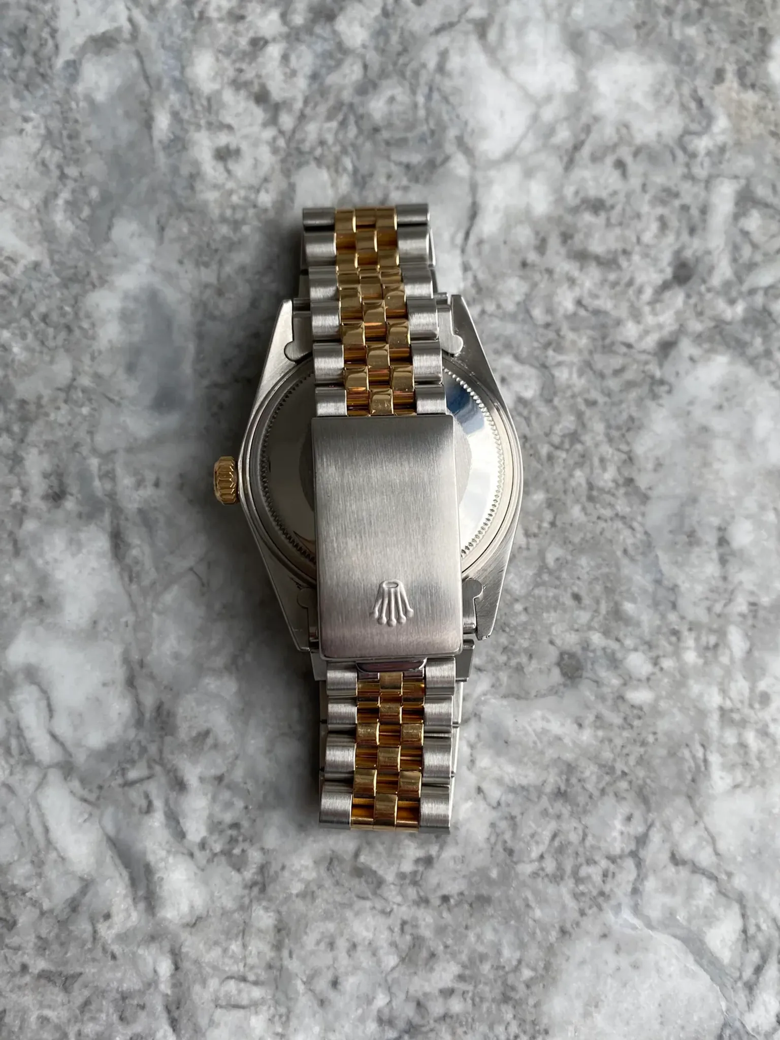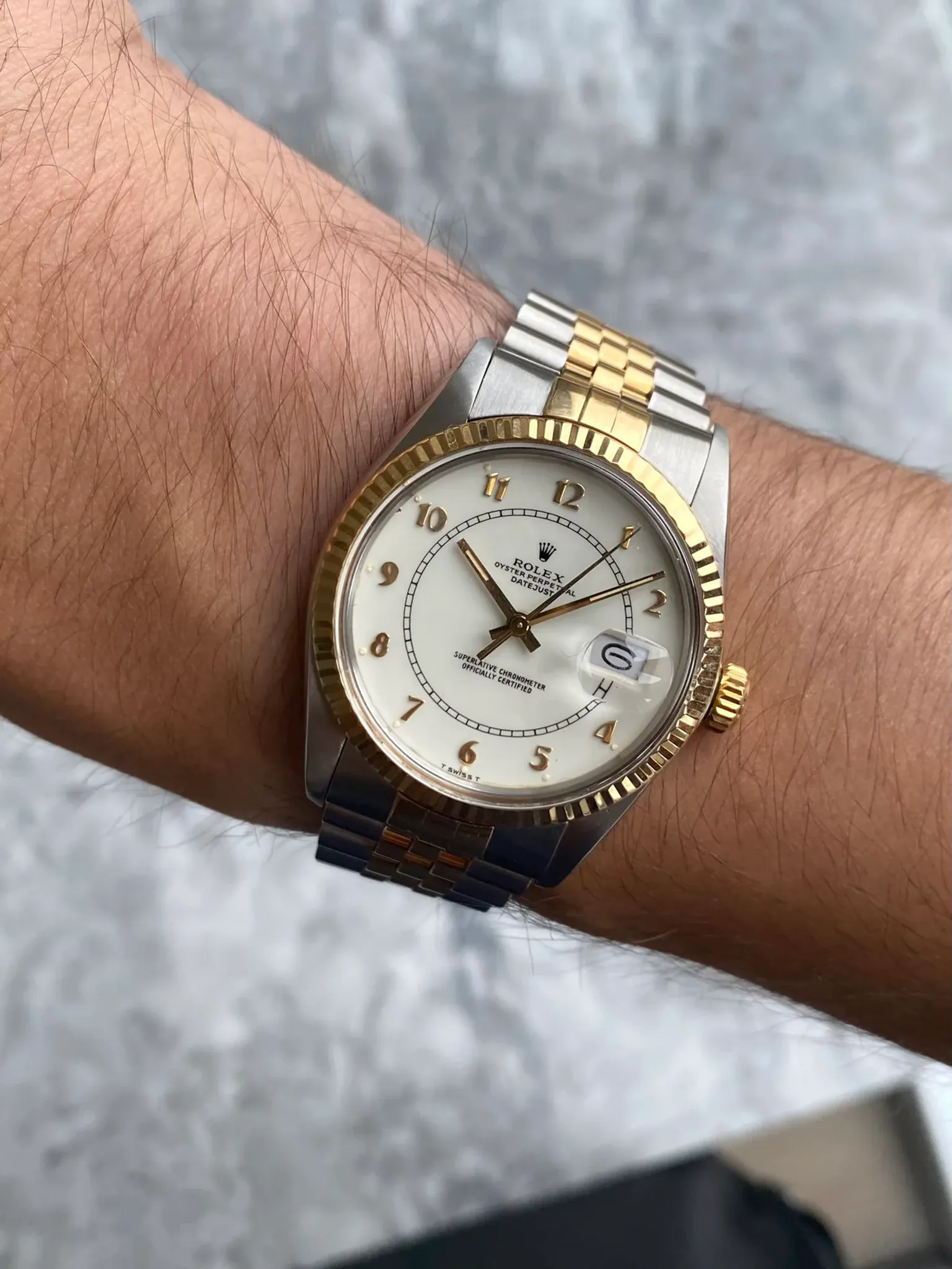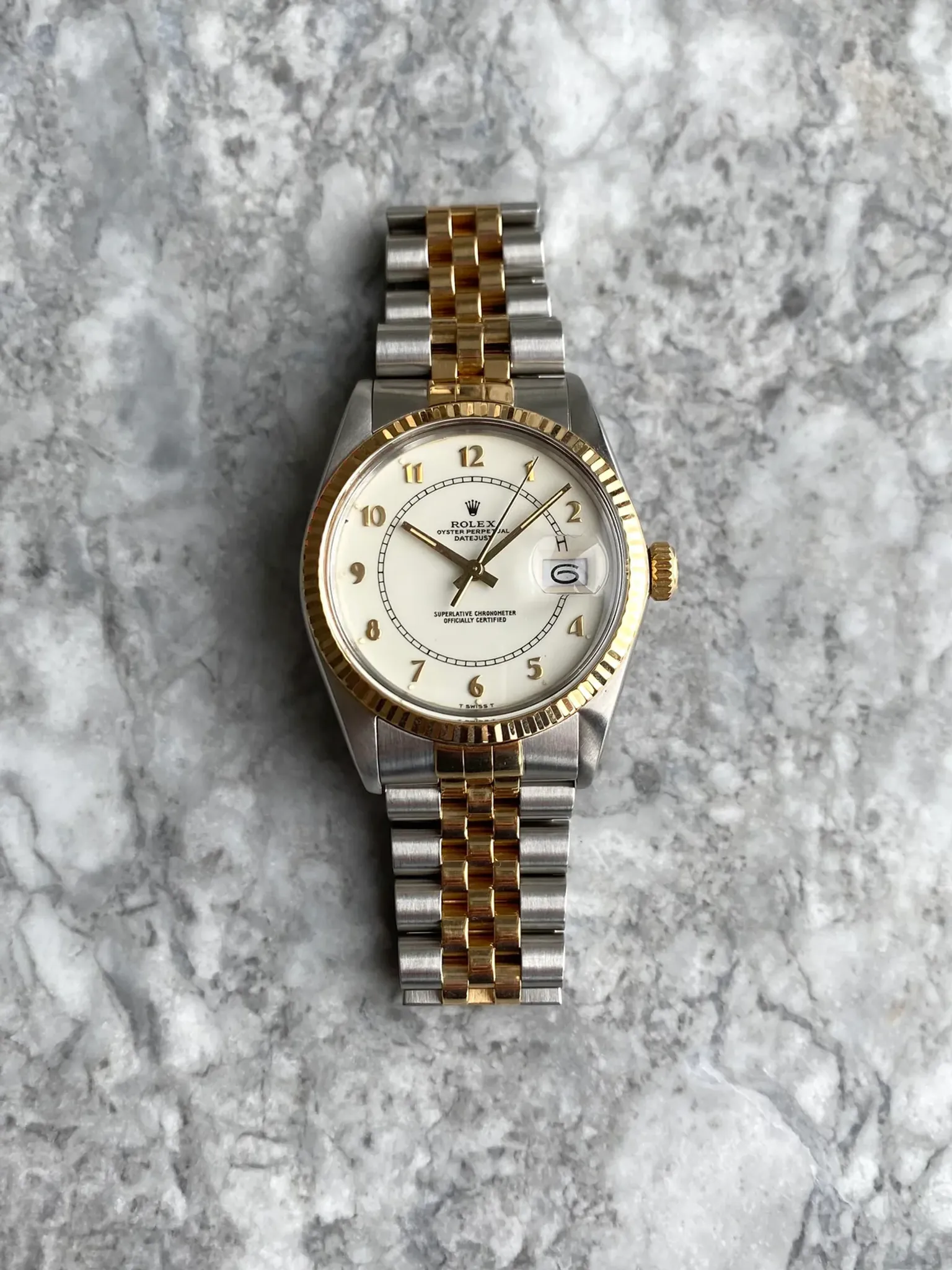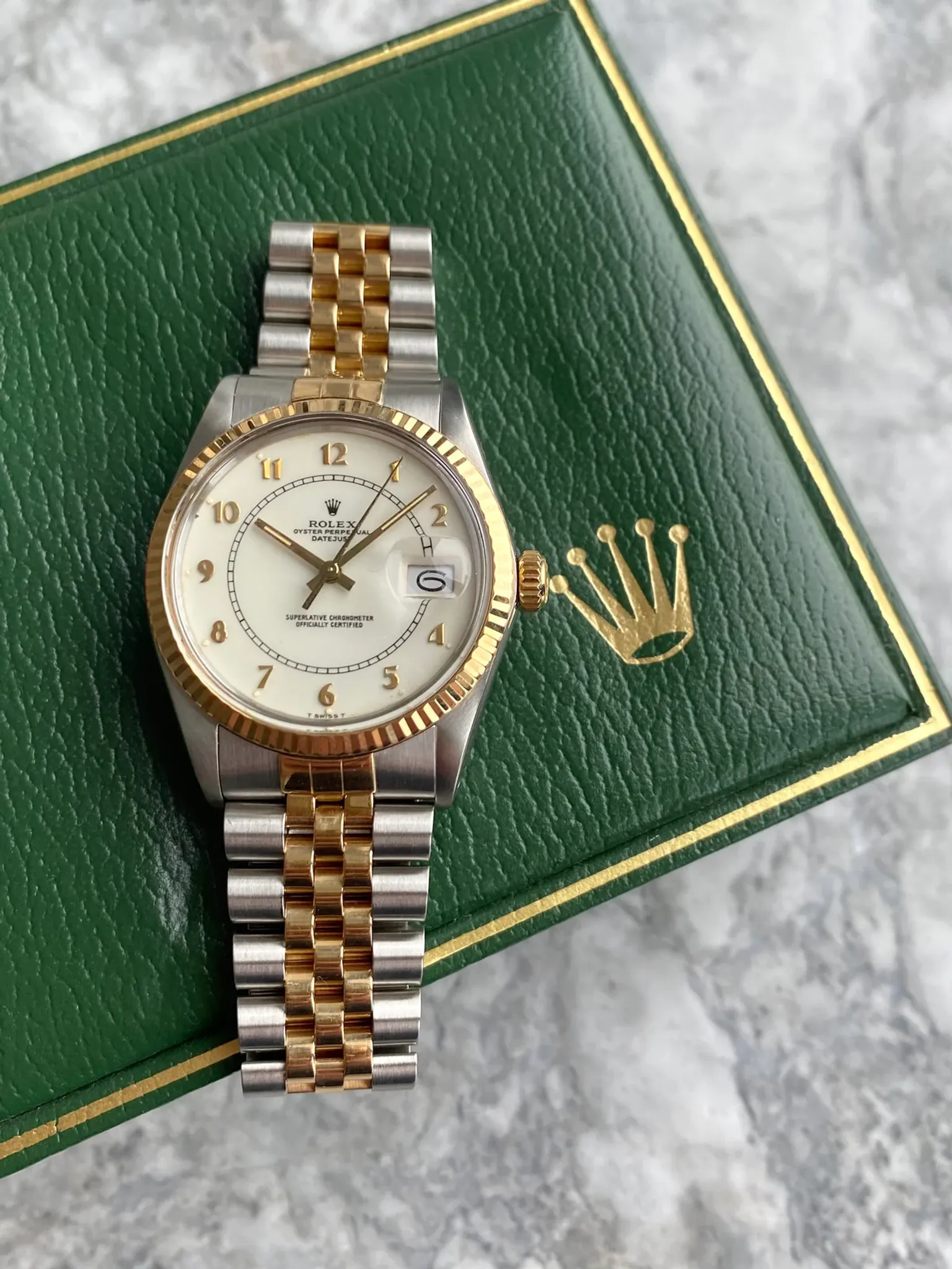 Here's a vintage Rolex Datejust reference 16013 automatic two tone with a white Boiler Gage roman numeral dial on a jubilee bracelet from the 80s. Keeps great time and is fully functional. Measurements include a 36mm oyster case and 20mm lug width. It's on a Rolex jubilee bracelet that fits up to an 7.5 inch wrist. The bracelet is in really great shape, it’s rather tight for its age. Time and quick date function at 3 a clock. Clean white arabic numeral dial and 18K yellow gold bezel. Matching gold hands and arabic numerals. Steel case and caseback. Both the hands and lume plots have a matching yellow patina. 18K gold fluted bezel. Matching black hands and Roman numerals. Drilled lug holes. Sharp case and lugs. The bezel and center links still maintained its rich yellow color. Both the dial and crystal are free from any scratches or marks. All parts are original including the signed Rolex crown, dial, movement, and caseback. Both the dial and case are in great cosmetic, untouched condition.