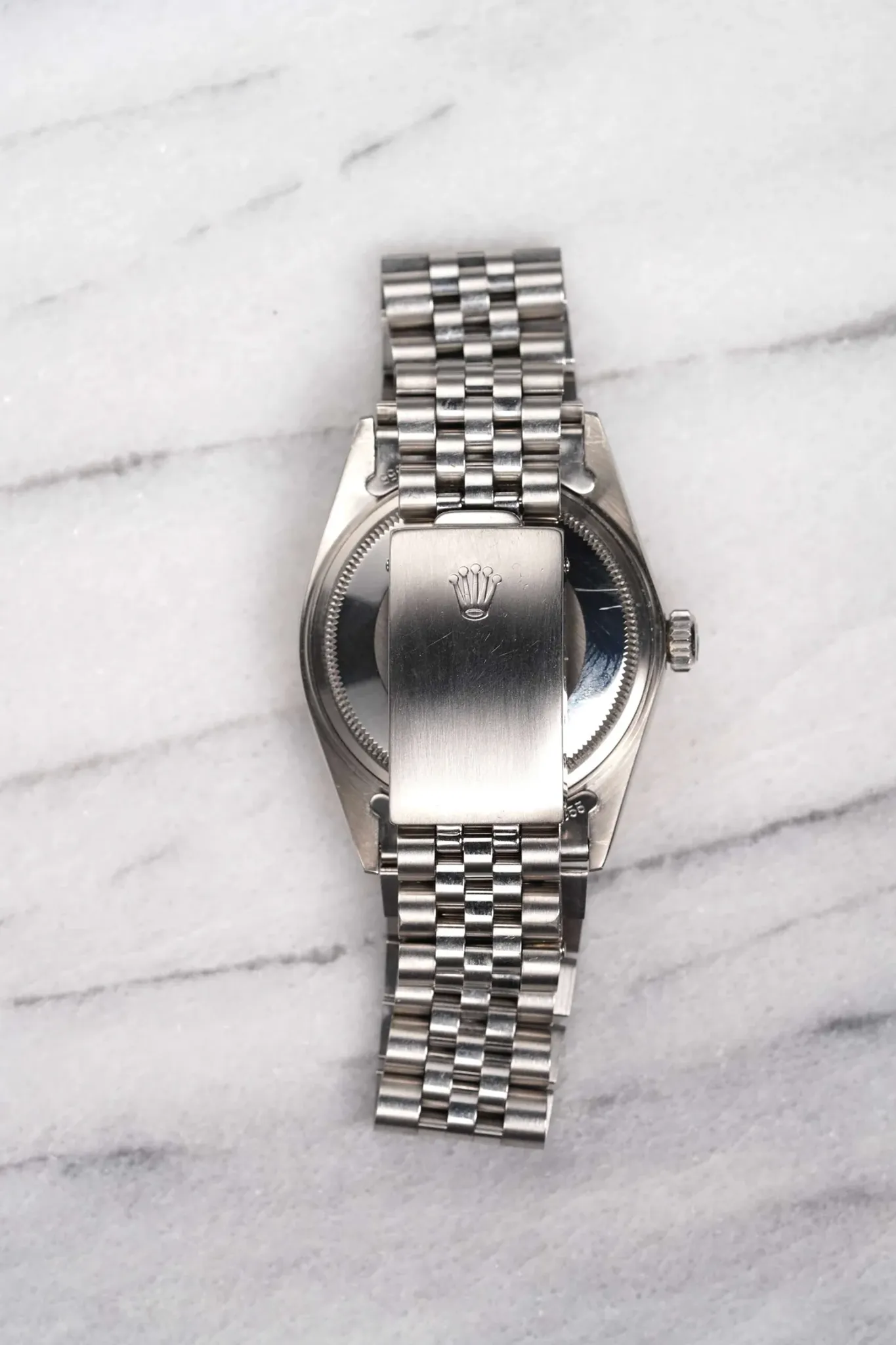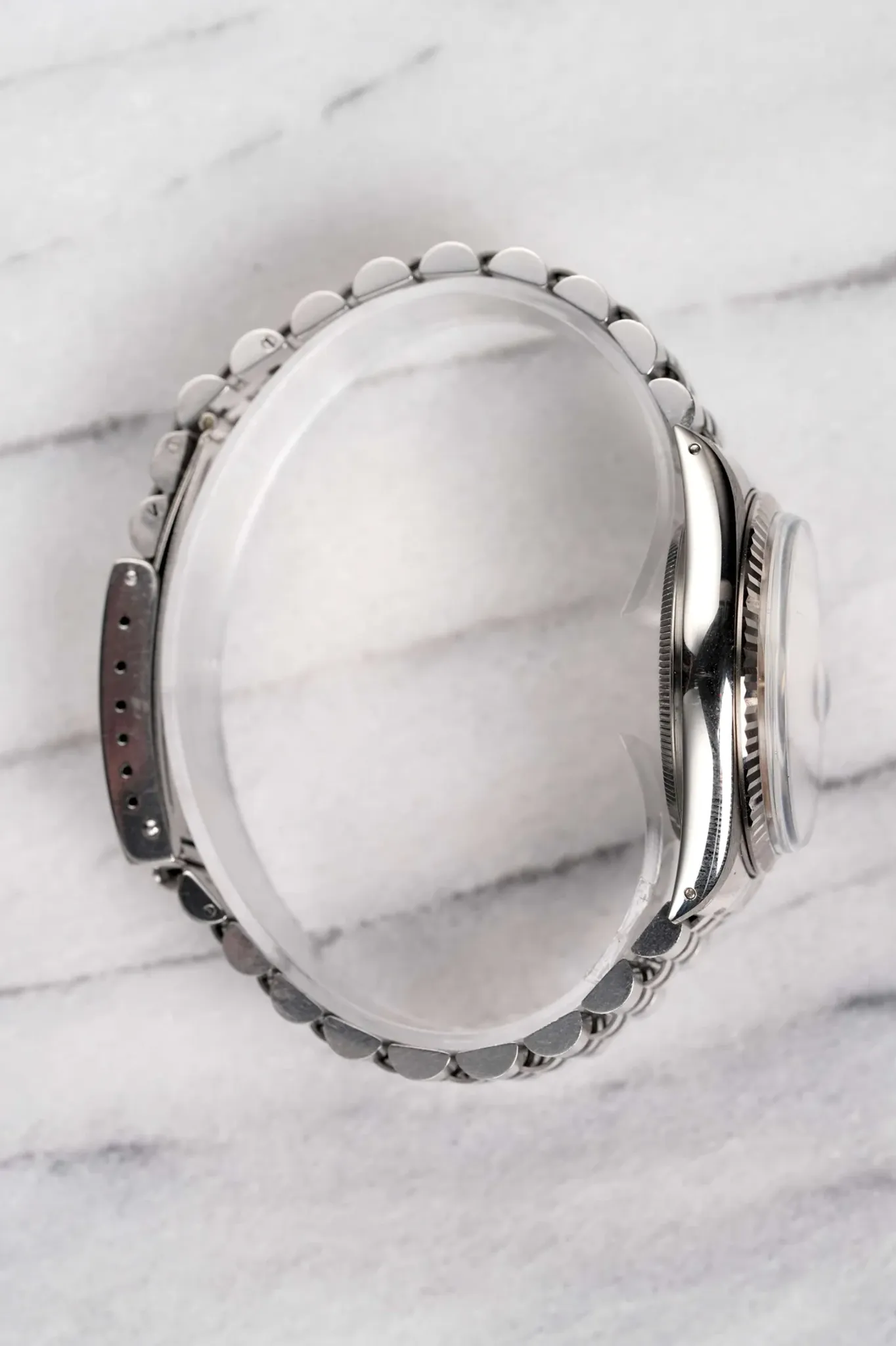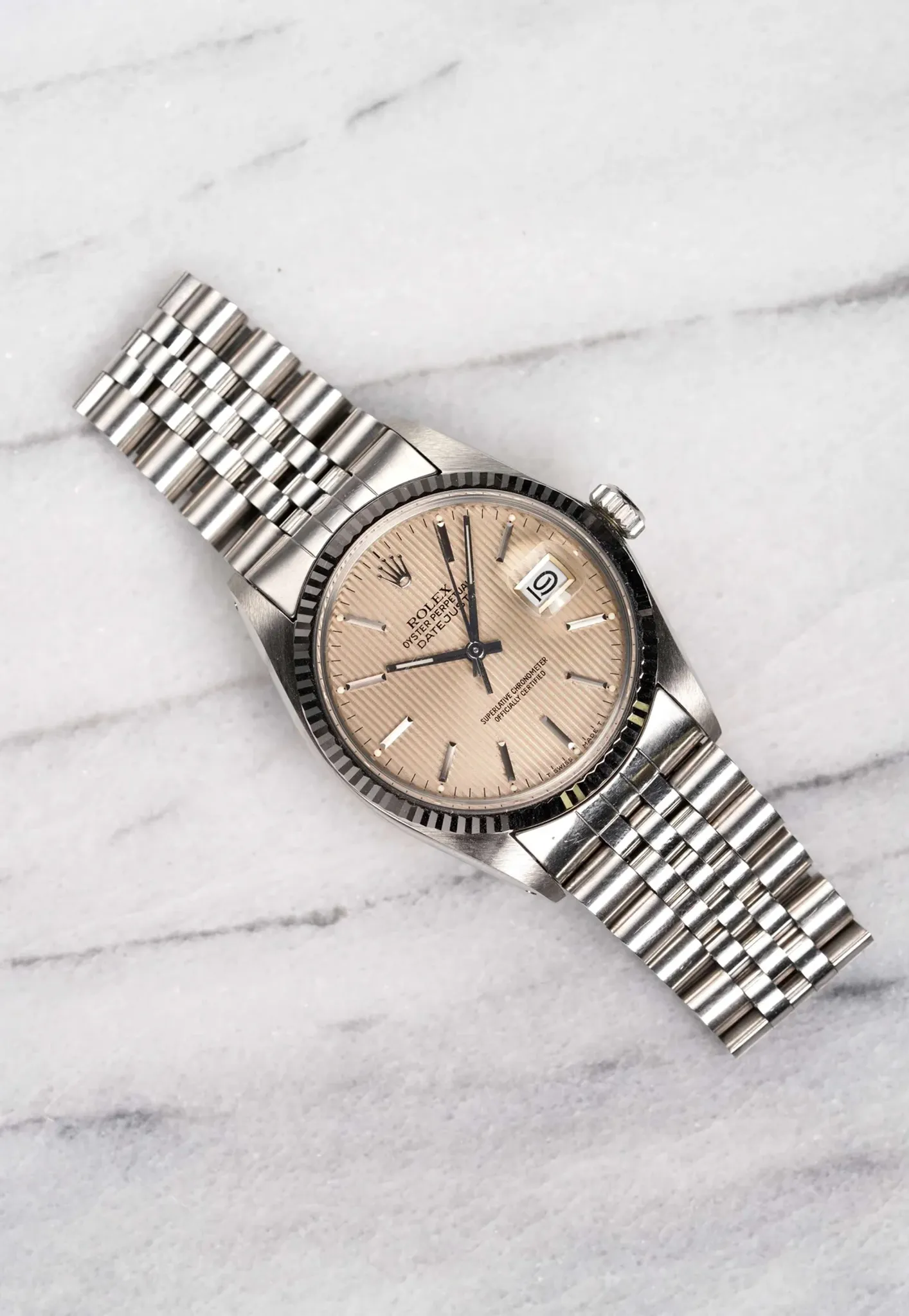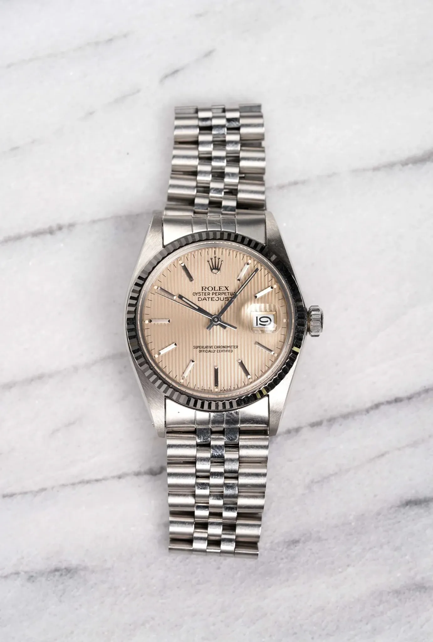 Here's a vintage Rolex Datejust reference 16014 (white gold bezel) automatic with a silver cream tapestry dial on a jubilee bracelet from the 80s. Keeps great time and is fully functional. Measurements include a 36mm oyster case and 20mm lug width. It's on a Rolex jubilee bracelet that fits up to a 7.25 inch wrist (555 endlinks). The bracelet is in decent shape, little stretch. Time and quick date function at 3 a clock. Clean grey tapestry dial and steel bezel. Steel case and caseback. The lume in both the hands and have matching patina. Drilled lug holes. Both the dial and crystal are free from any scratches or marks. All parts are original including the signed Rolex crown, dial, movement, and caseback. Both the dial and case are in great cosmetic, untouched condition.