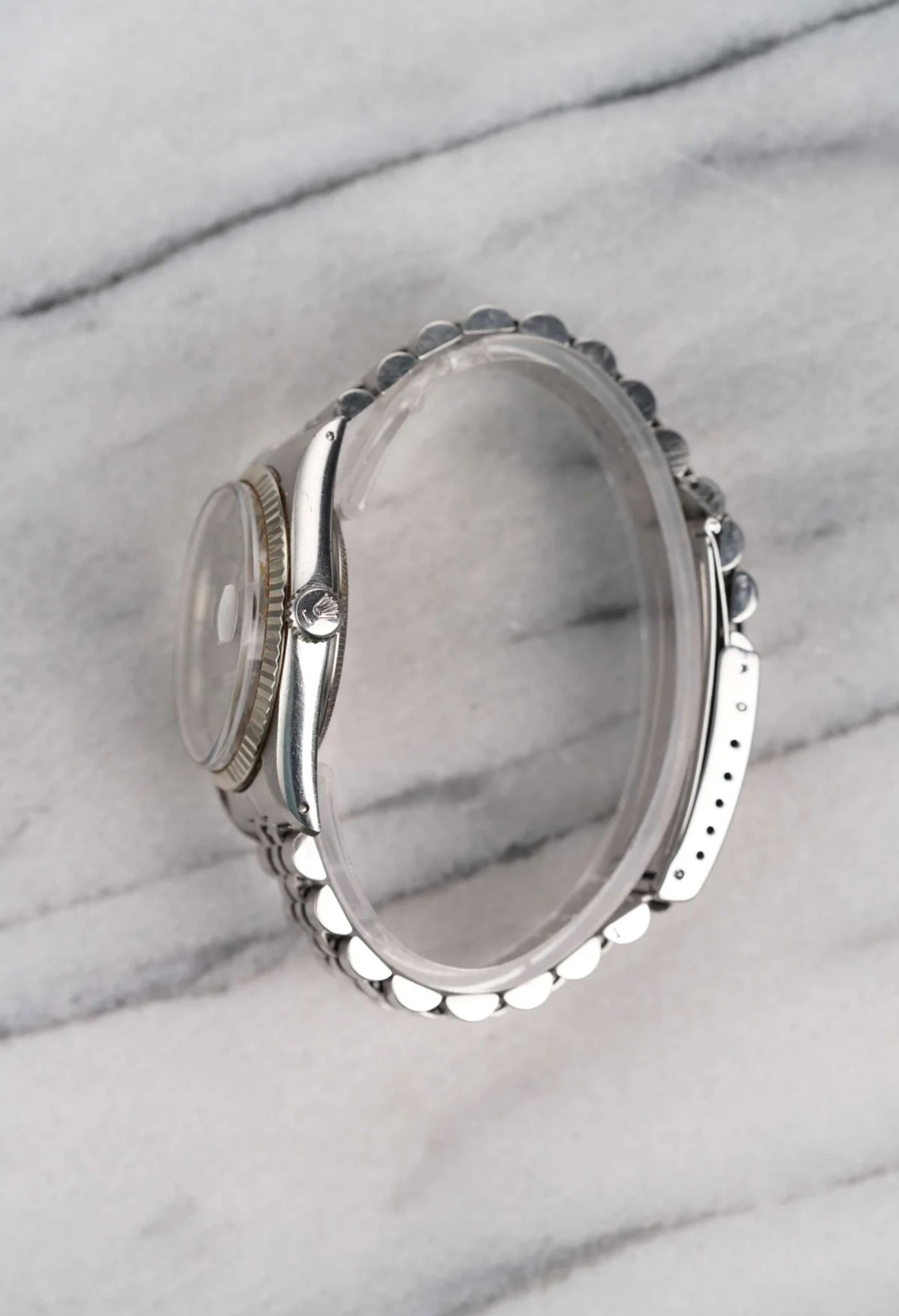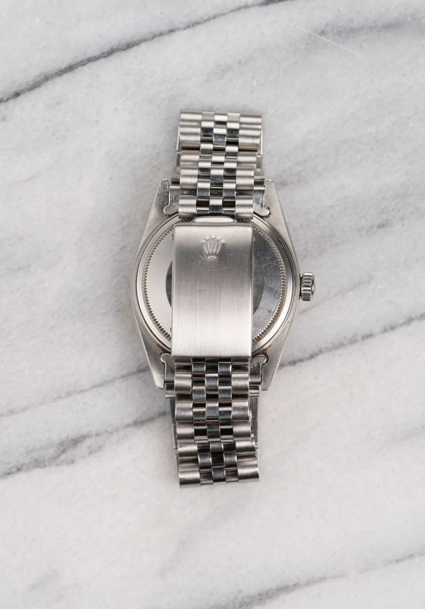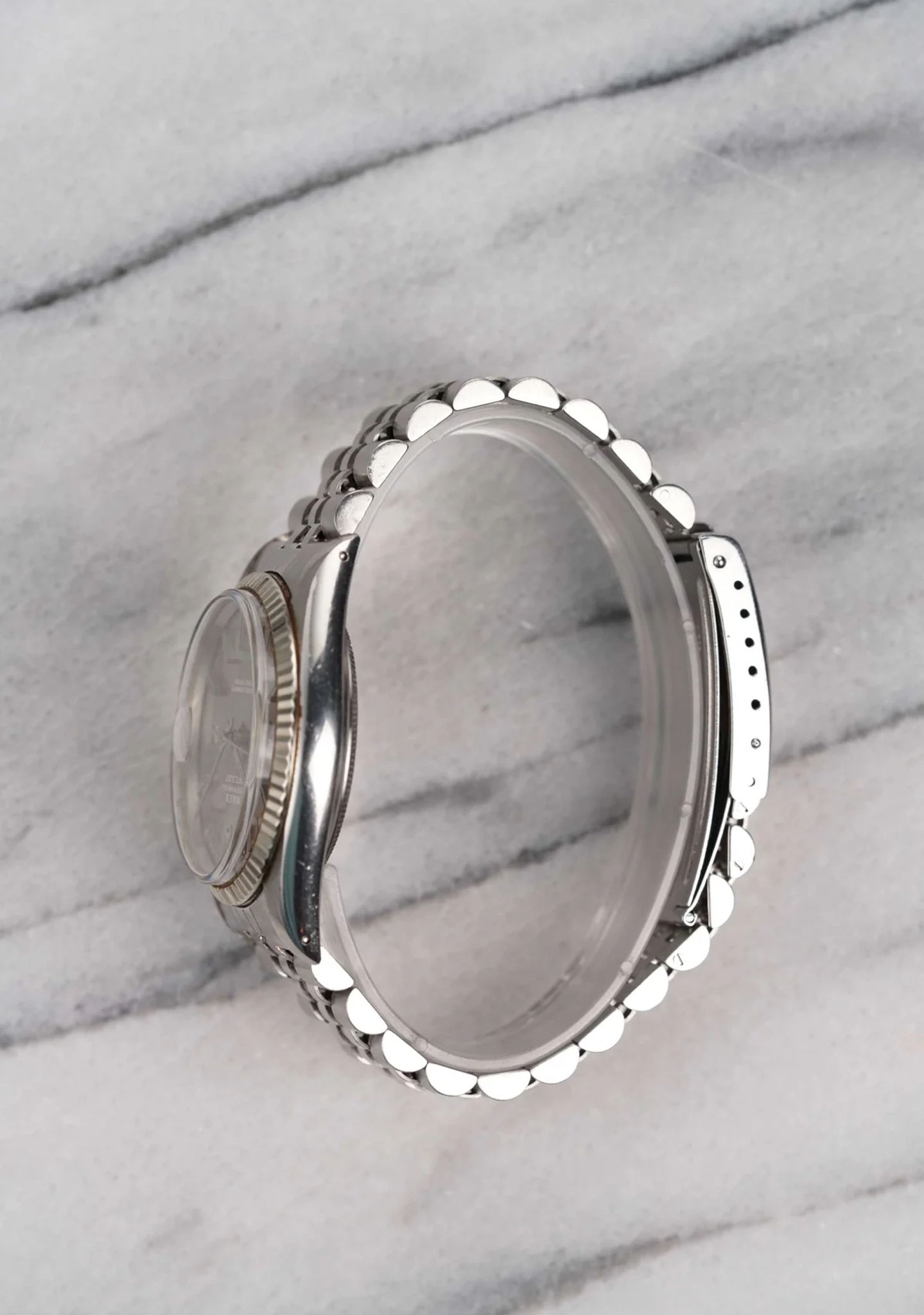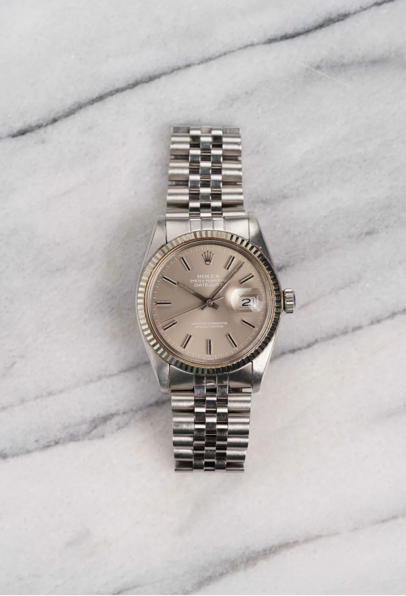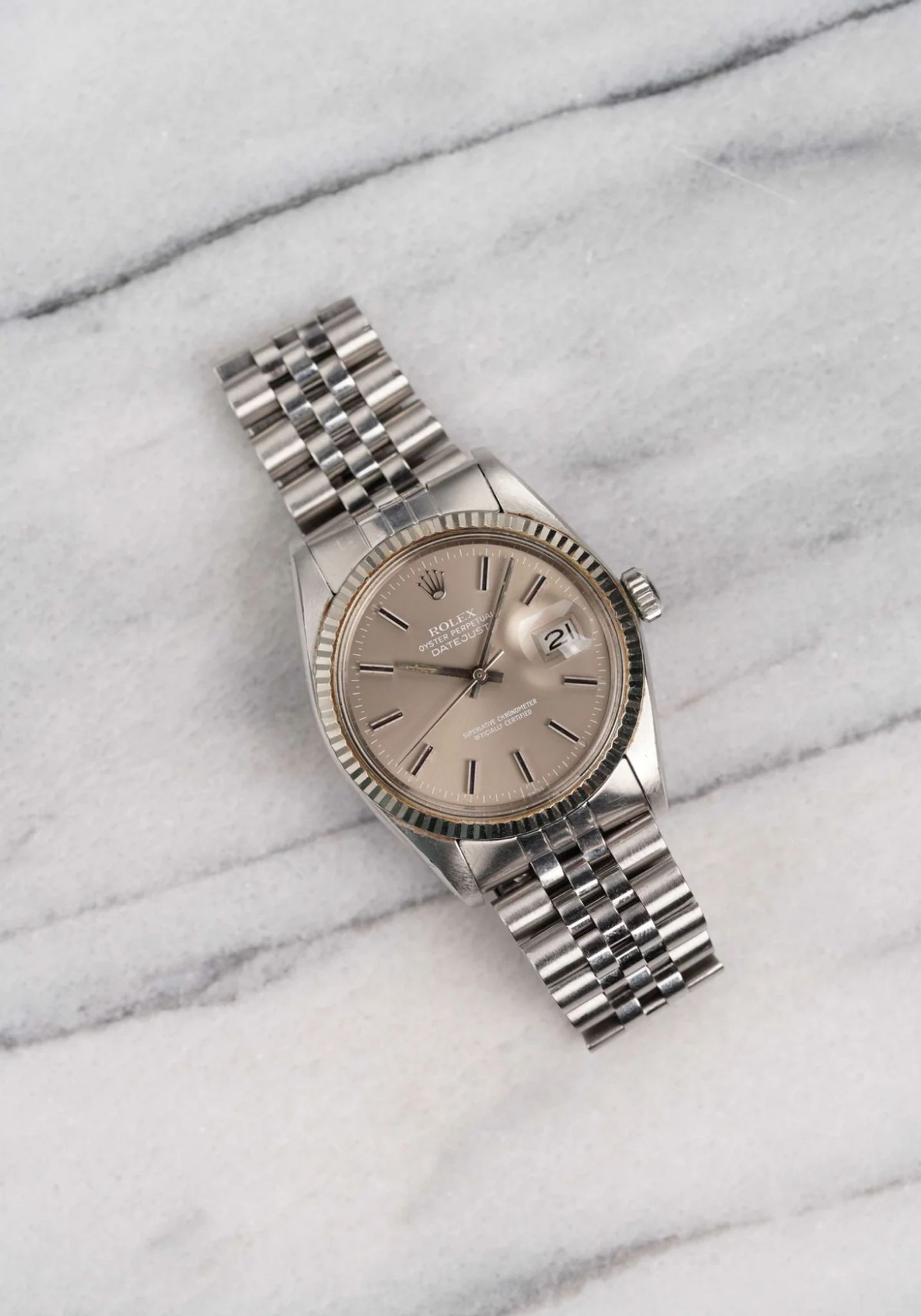 Here's a vintage Rolex Datejust reference 16014 automatic with a clean taupe grey dial on a jubilee bracelet from the 80s. Keeps great time and is fully functional. The bezel is 18k white gold. Measurements include a 36mm oyster case and 20mm lug width. It's on its original Rolex jubilee bracelet which is in great condition for its age and fits up to a 7.25 inch wrist (555 end links). Time and quickset date function at 3 O' clock. Steel case and case back. Matching silver hands and hour markers. Both the dial and crystal are free from any scratches or marks. All parts are original including the signed Rolex crown, dial, movement, and case back. Both the dial and case are in great cosmetic, untouched condition.