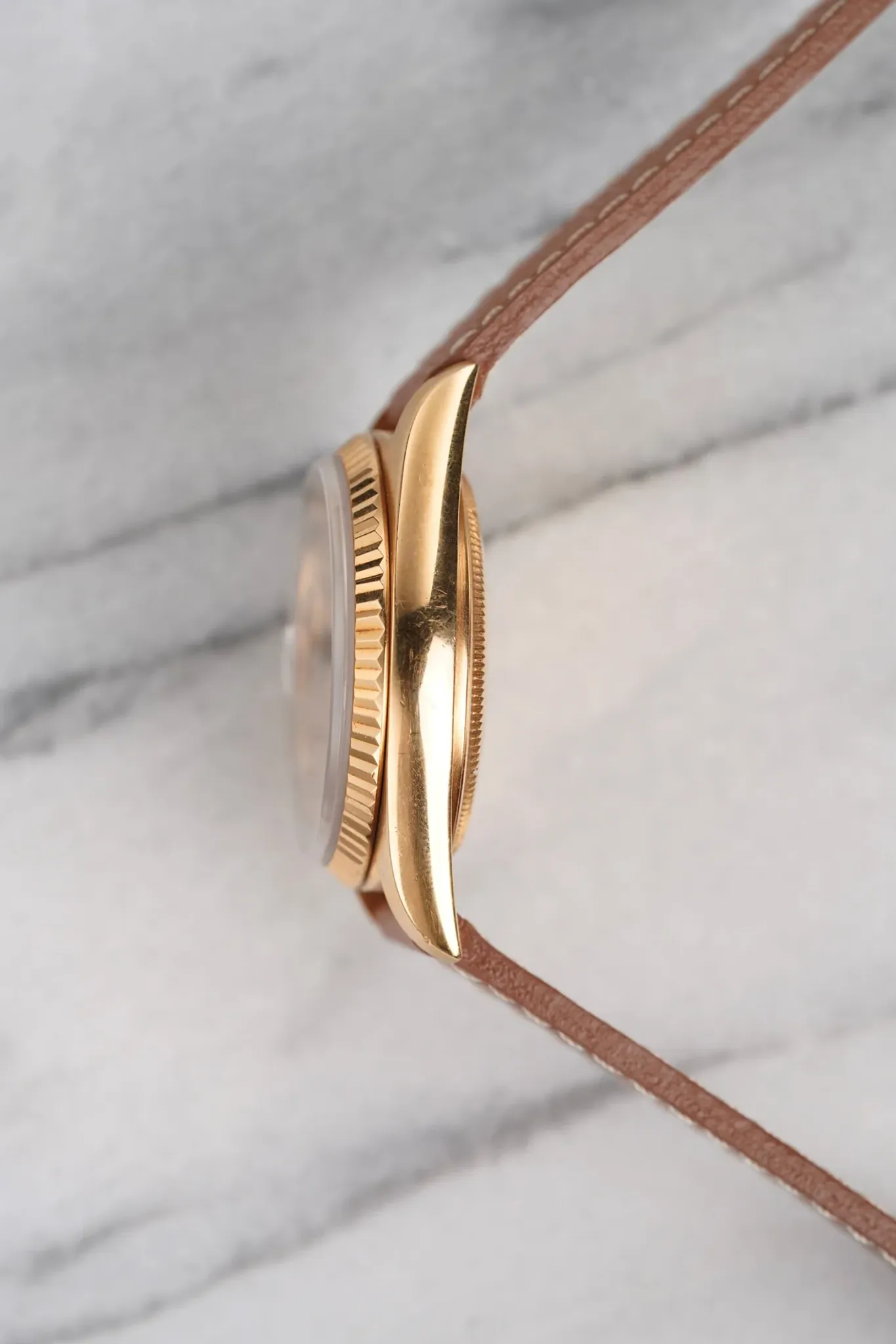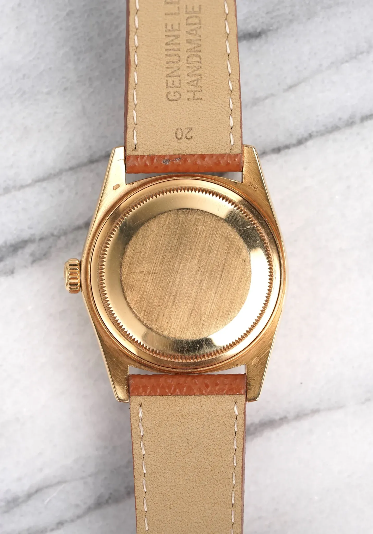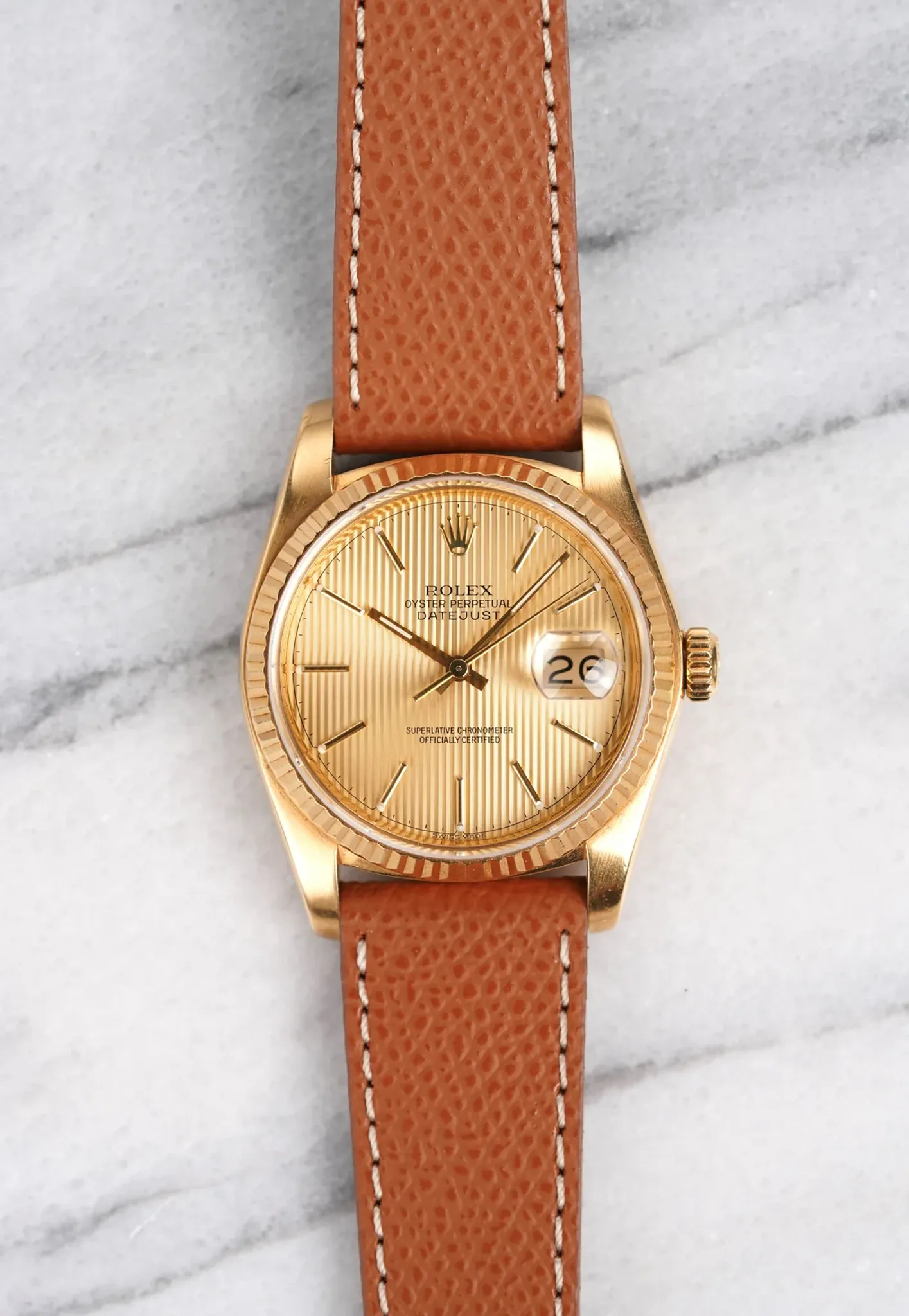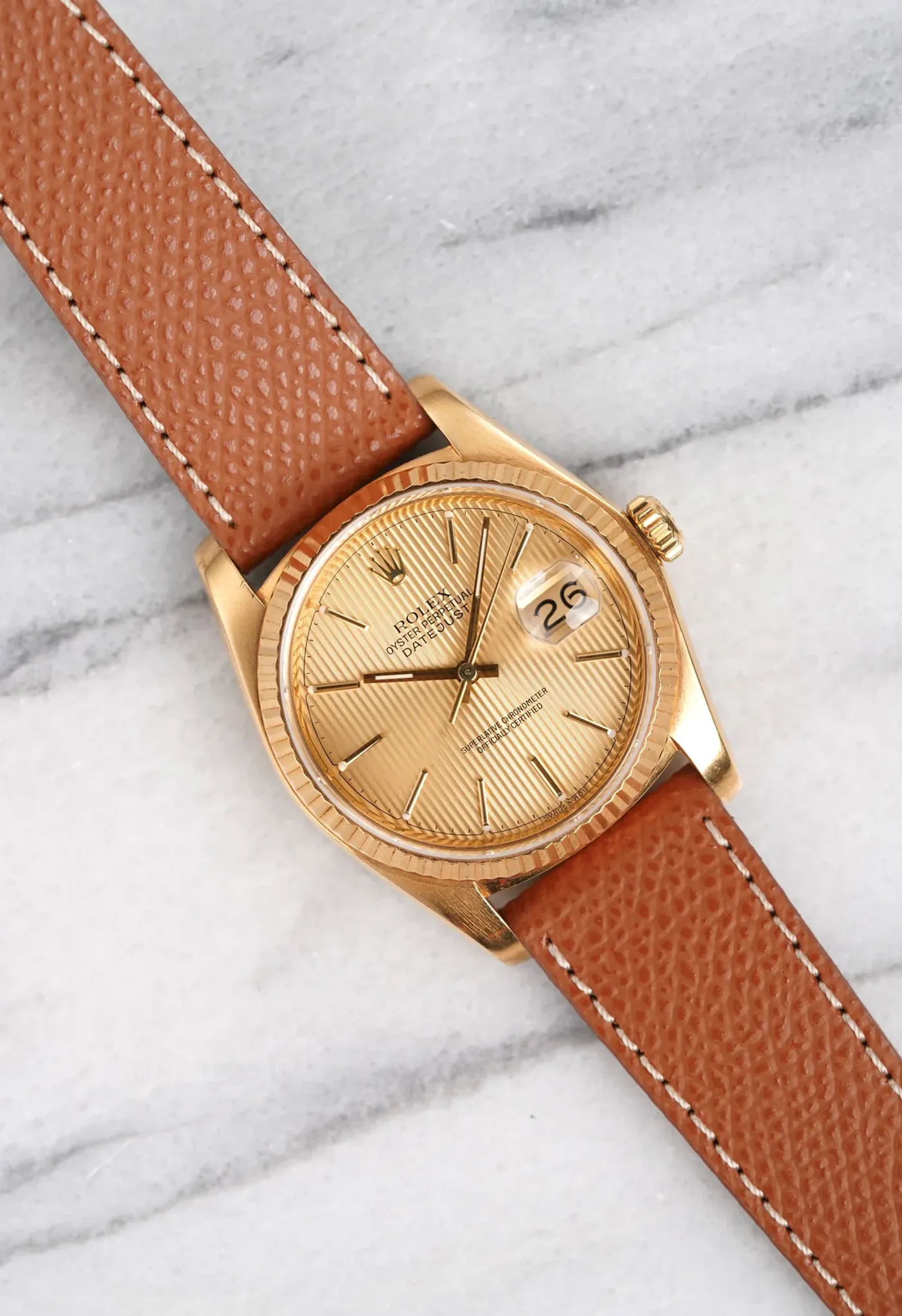 Here's a vintage Rolex Datejust reference 16018 automatic in 18K yellow gold with a champagne tapestry dial from the 1980s. Keeps great time and is fully functional. Measurements include a 36mm oyster case and 20mm lug width. It's on a brown pebble-textured leather strap (Made in Italy) Time and quickset date function at 3 a clock. 18K yellow gold case and fluted bezel. Gold case and caseback. Matching crisp lume in both the hands and lume plots. Both the dial and crystal are free from any scratches or marks. All parts are original including the signed Rolex crown, dial, movement, and case back. Both the dial and case are in great cosmetic, untouched condition.