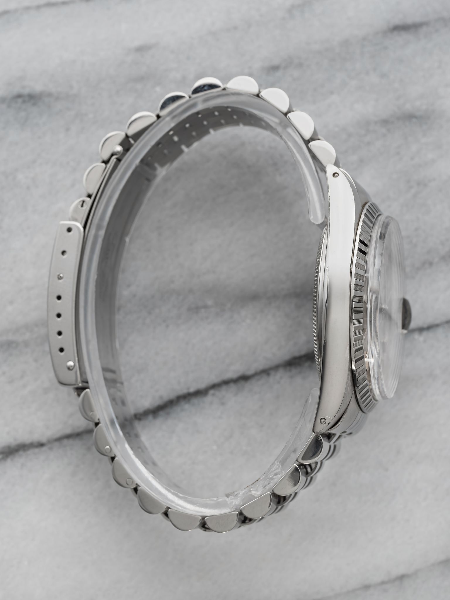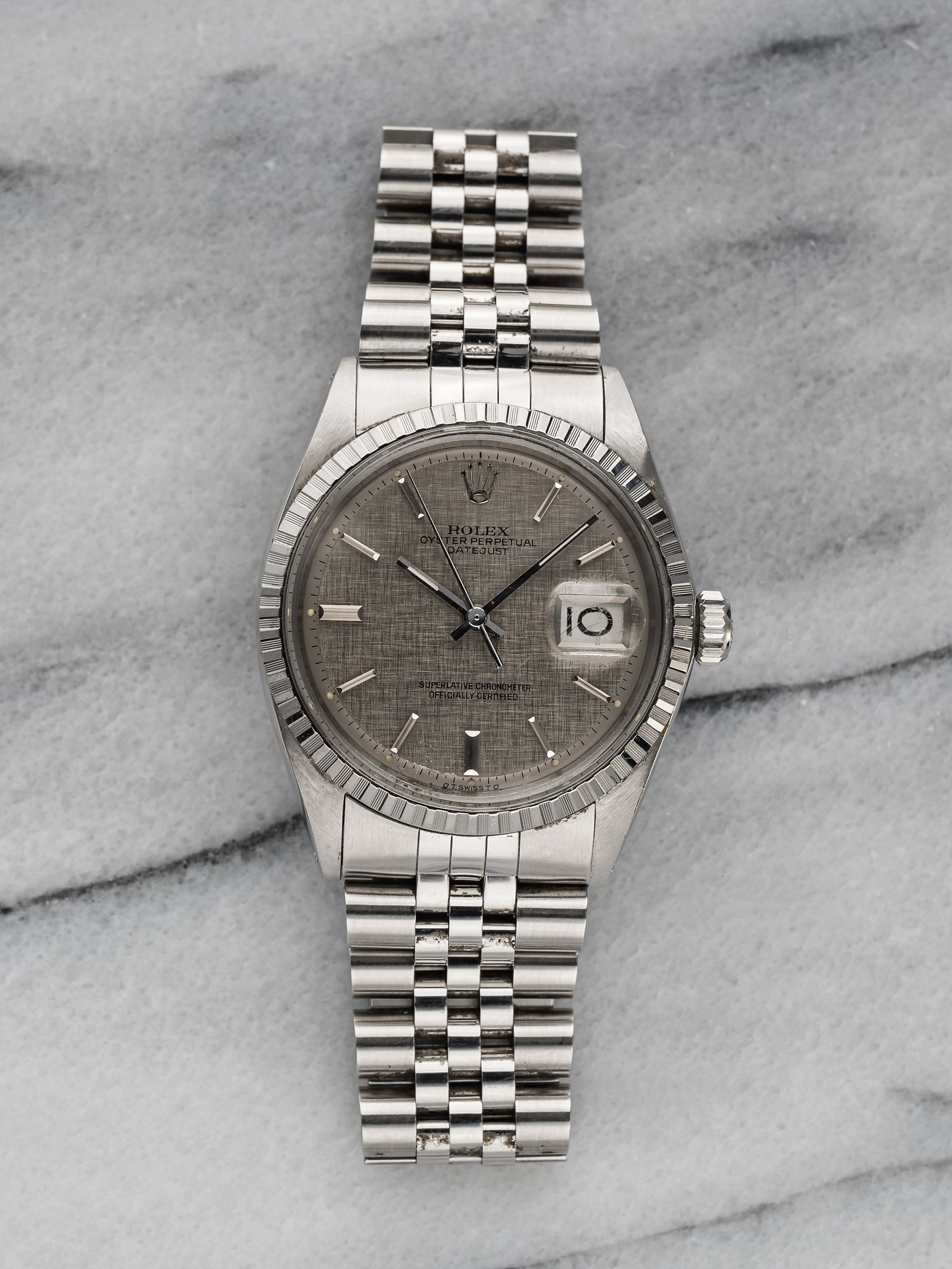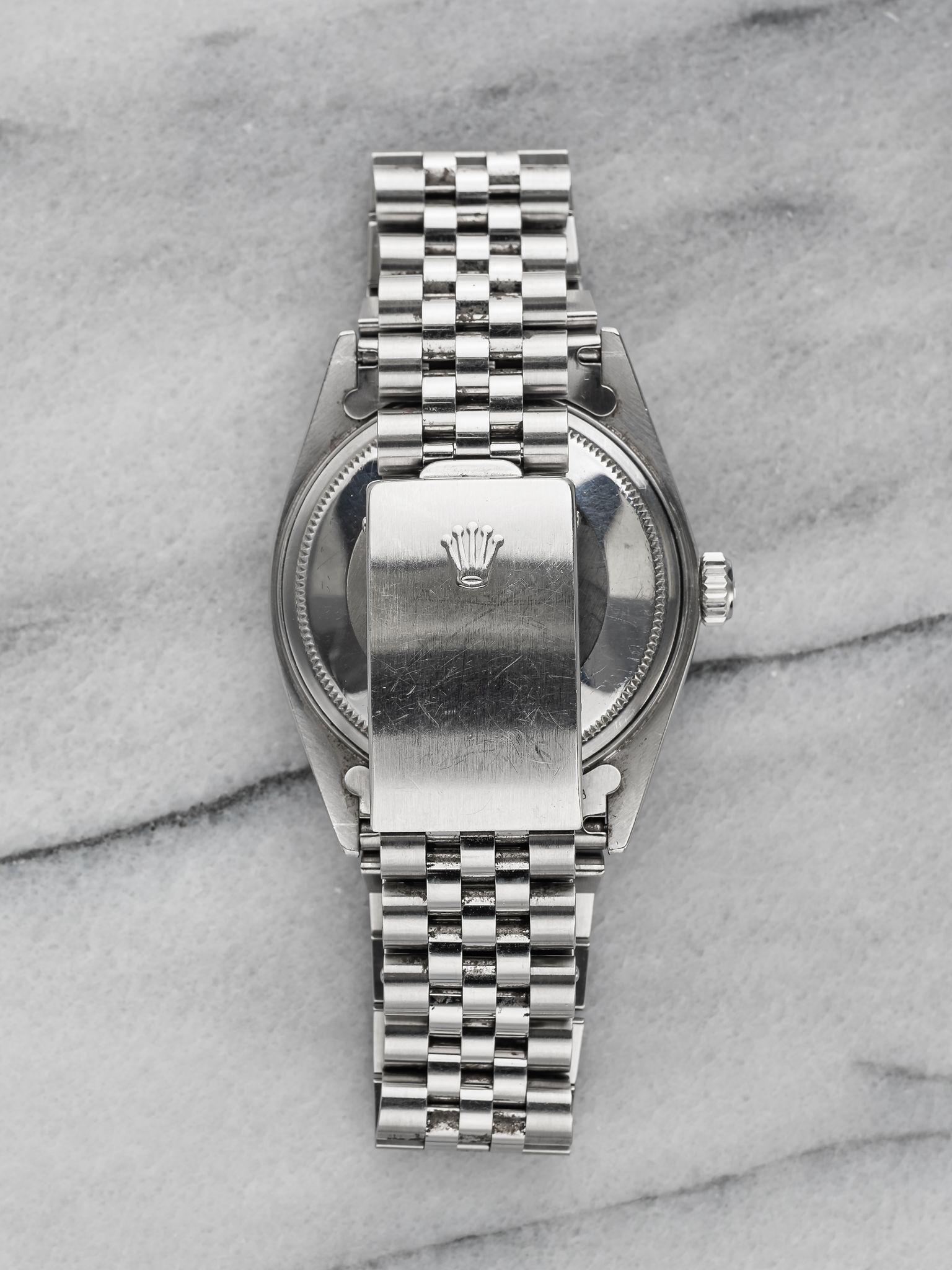 Here's a vintage Rolex Datejust reference 1603 automatic with a clean brown linen dial on a jubilee bracelet from the 70s. Keeps great time and is fully functional. Measurements include a 36mm oyster case and 20mm lug width. It's on a heavy Rolex jubilee bracelet (555 endlinks) that fits up to a 7 inch wrist. Time and non-quick date function at 3 o’clock. Clean brown linen dial and steel bezel. Harder to find these dials than the usual silver. Steel case and caseback. The lume in both the hands and lume plots developed a slight yellow patina. Drilled lug holes. Both the dial and crystal are free from any scratches or marks. All parts are original, including the signed Rolex crown, dial, movement, and caseback. Both the dial and case are in great cosmetic, untouched condition.