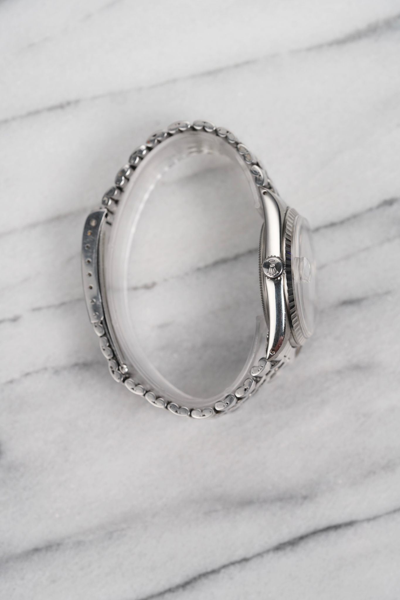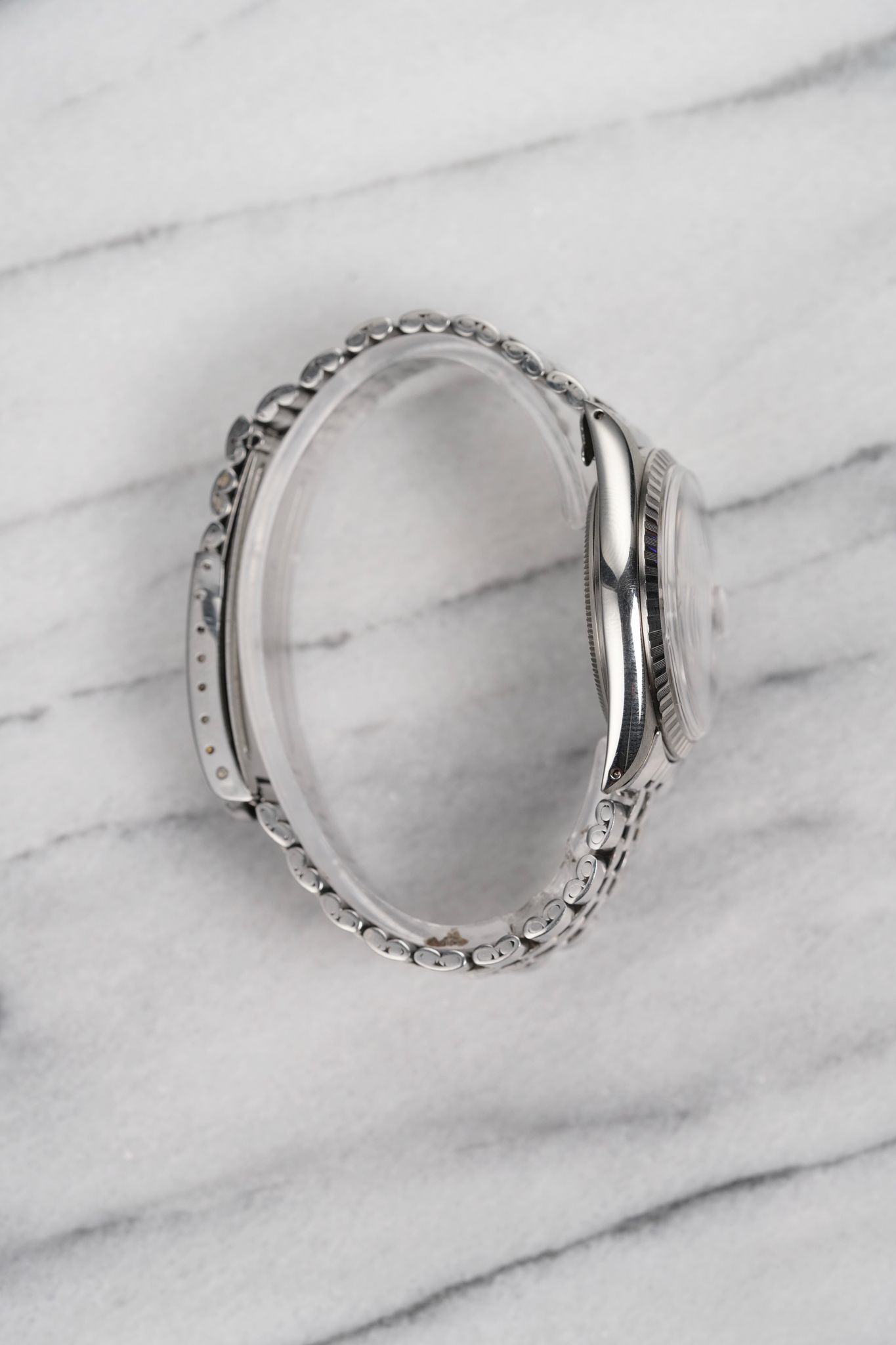Here's a vintage Rolex Datejust reference 1603 automatic with a lavender/ taupe sunburst dial (dial developed a purplish hue from its original silver dial) on a jubilee bracelet from the 70s. Keeps great time and is fully functional. Comes with asian papers. Measurements include a 36mm oyster case and 20mm lug width. It's on a Rolex jubilee bracelet that fits up to a 7 inch wrist (55 end links, big logo clasp) Time and non-quick date function at 3 a clock. Clean taupe sunburst dial and 18K white gold bezel. Steel case and caseback. The dial has some speckling throughout. The lume plots and hands aged to a nice yellow patina. Both the dial and crystal are free from any scratches or marks. All parts are original including the signed Rolex crown, dial, movement, and caseback. Both the dial and case are in great cosmetic, untouched condition.